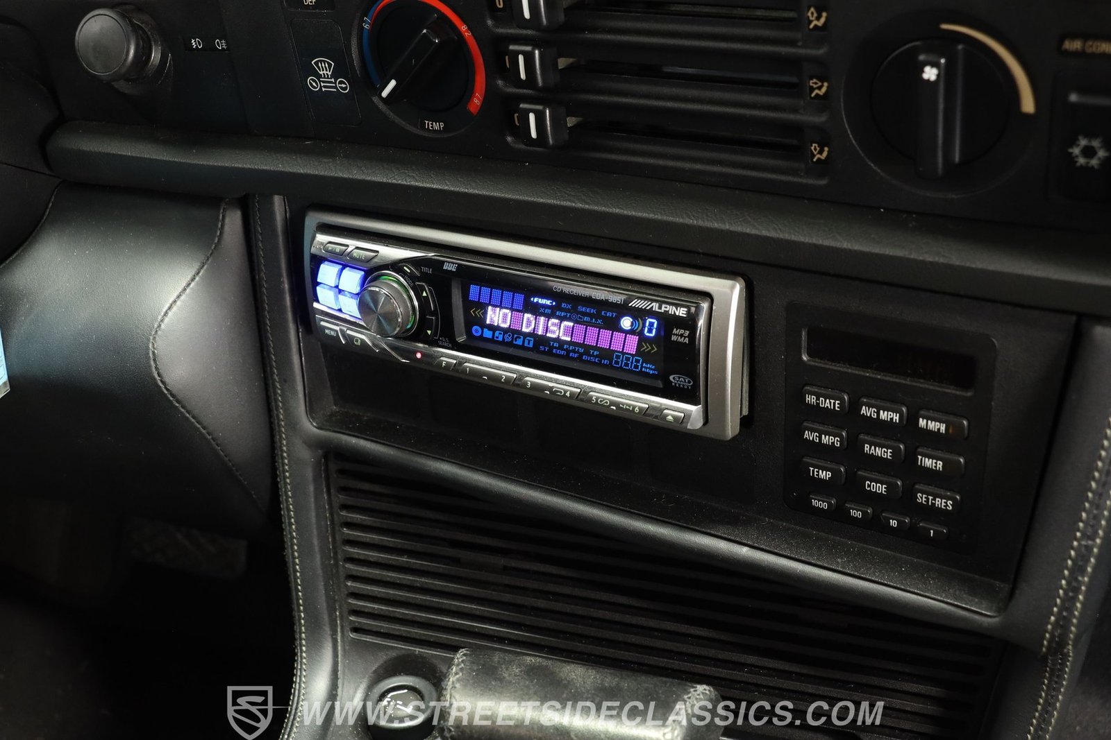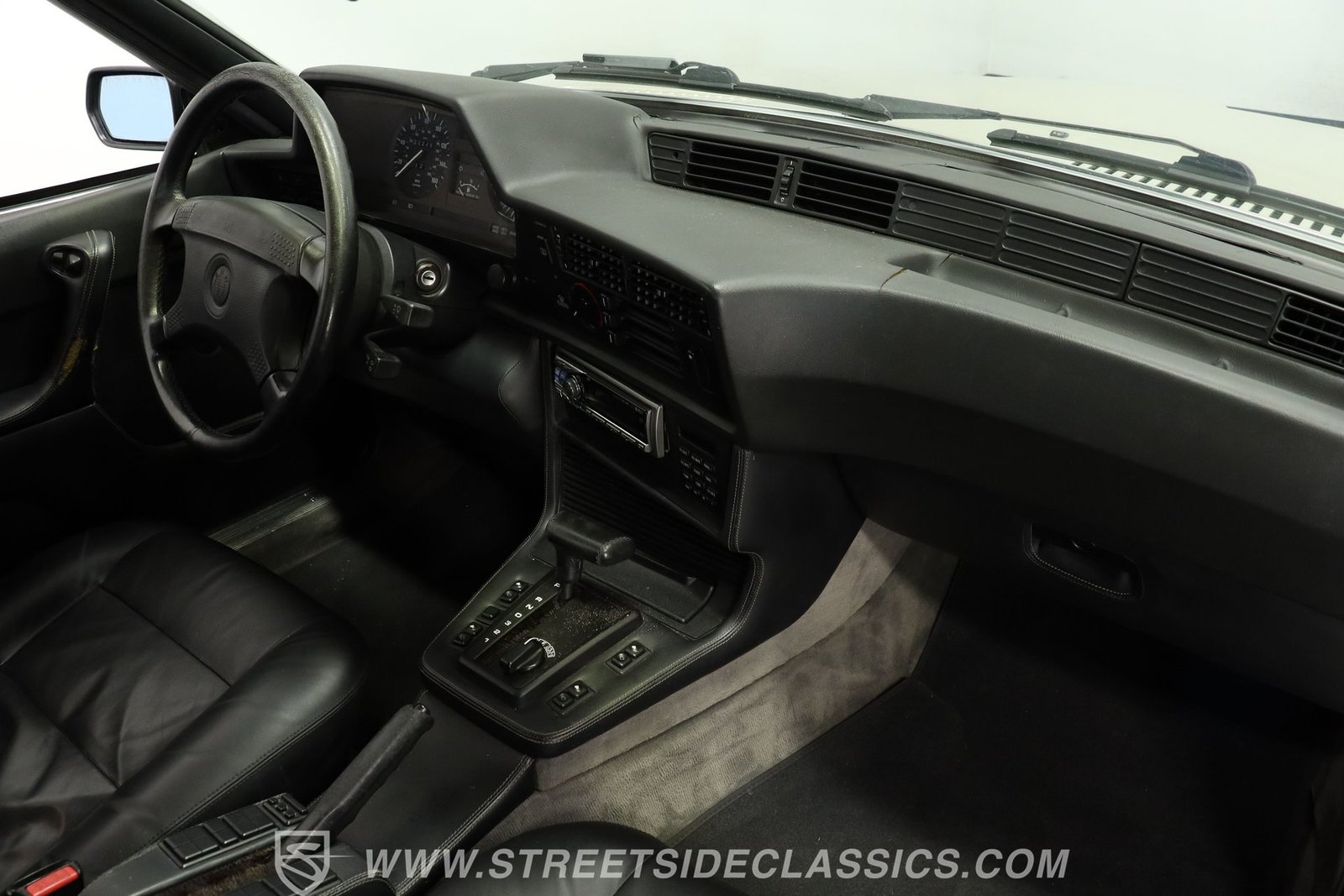 Entre e experimente uma cabine que equilibra o charme vintage com o conforto prático. Os bancos de couro, embora apresentem pequenos sinais de desgaste, mantêm um visual refinado e oferecem um aconchego tanto para o motorista quanto para o passageiro. O interior conta com uma disposição elegante de controles e interruptores centrados no motorista, complementada por um rádio Alpine instalado posteriormente para uma experiência sonora moderna. Embora o painel apresente algumas rachaduras típicas da sua idade, o estado geral do interior reflete uma conservação cuidadosa e pouco uso.