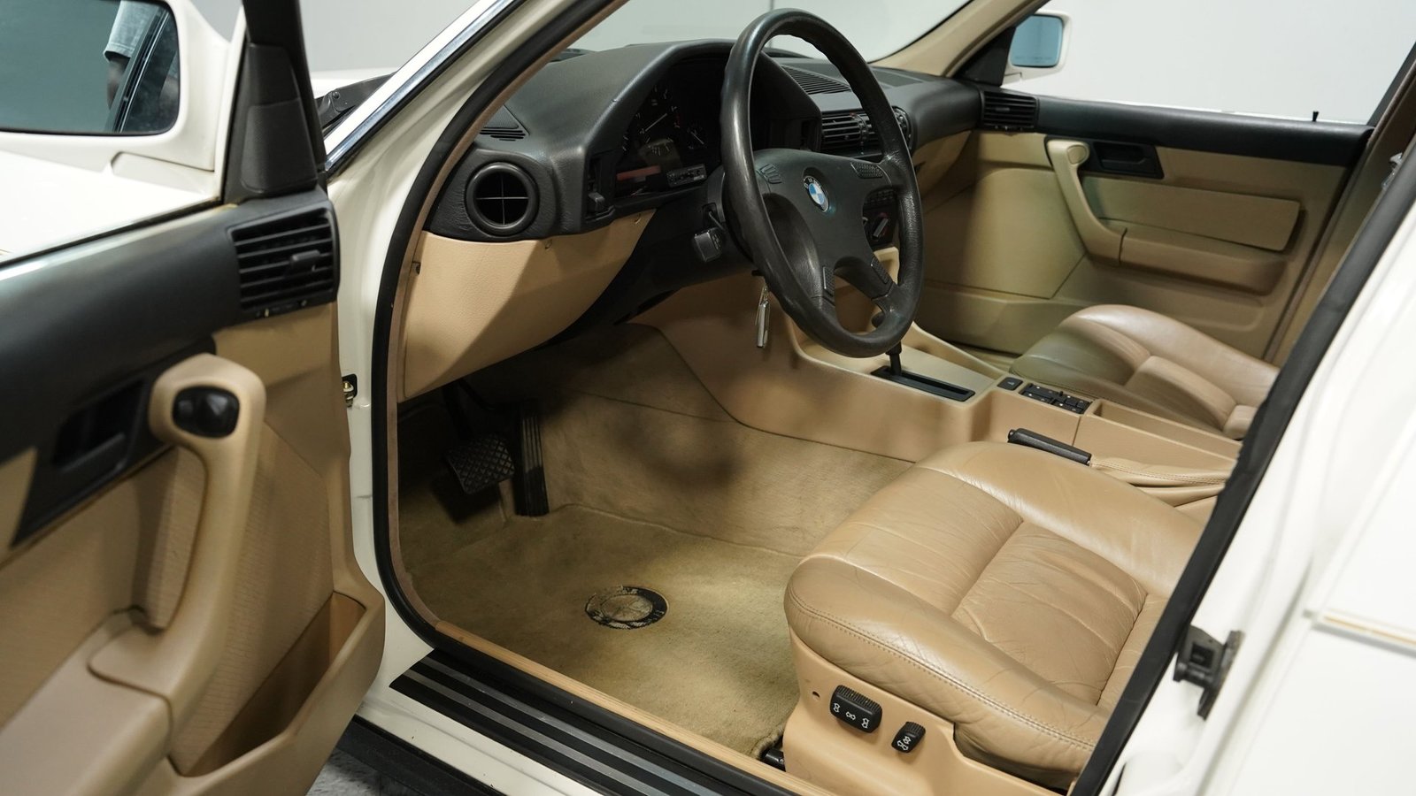 No interior, encontramos um interior BMW vintage em couro bege. Um console central separa um par de bancos confortáveis e elétricos. Um volante de quatro raios com assistência hidráulica, com o logotipo da BMW, fica logo à frente de um painel de instrumentos analógico tradicional. Vidros, travas e retrovisores elétricos, juntamente com um teto solar elétrico, oferecem inúmeras comodidades modernas. Um tocador de AM/FM/cassete original e controles de climatização fáceis de usar complementam este interior luxuoso.