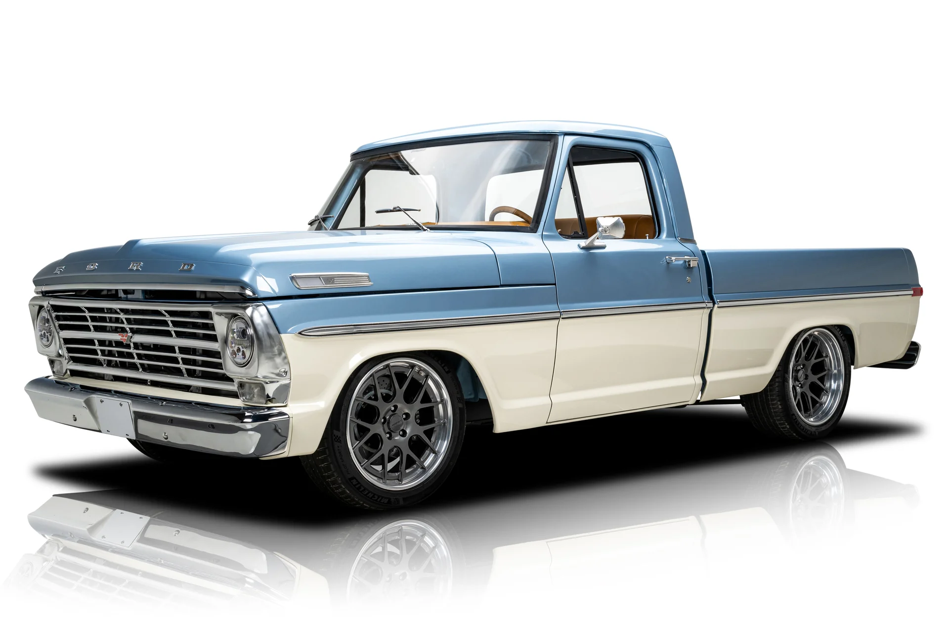 Revestida com a brilhante pintura Brittany Blue BASF Glasurit, esta F-100 irradia um charme vintage inconfundivelmente Ford, beneficiando-se de técnicas de aplicação contemporâneas que garantem uma beleza duradoura. Faróis de LED, vidros totalmente novos e vedações contra intempéries completam o exterior meticulosamente trabalhado, enquanto pneus Michelin Pilot Sport em rodas Forgeline personalizadas conferem-lhe uma postura agressiva e pronta para qualquer desafio. Os retrovisores, maçanetas e emblemas da Velocity adicionam um toque sutil e sofisticado, e o acabamento clássico da linha de cintura foi mantido para preservar a herança da picape.