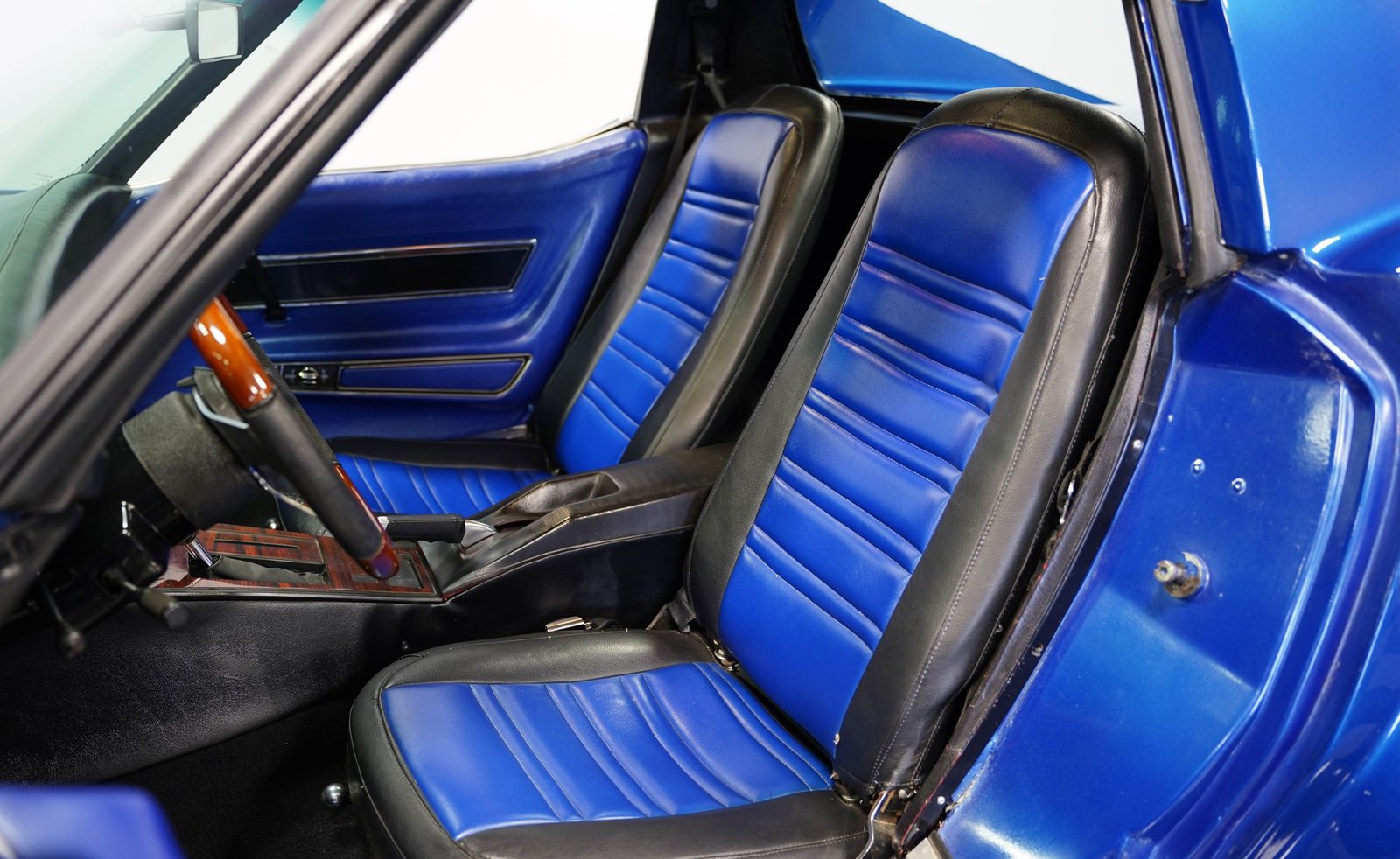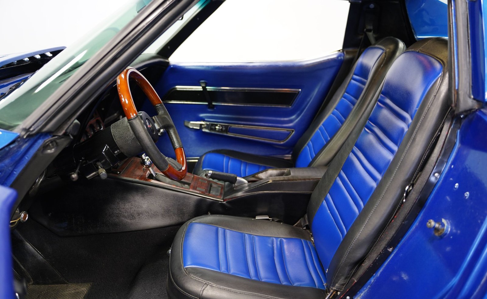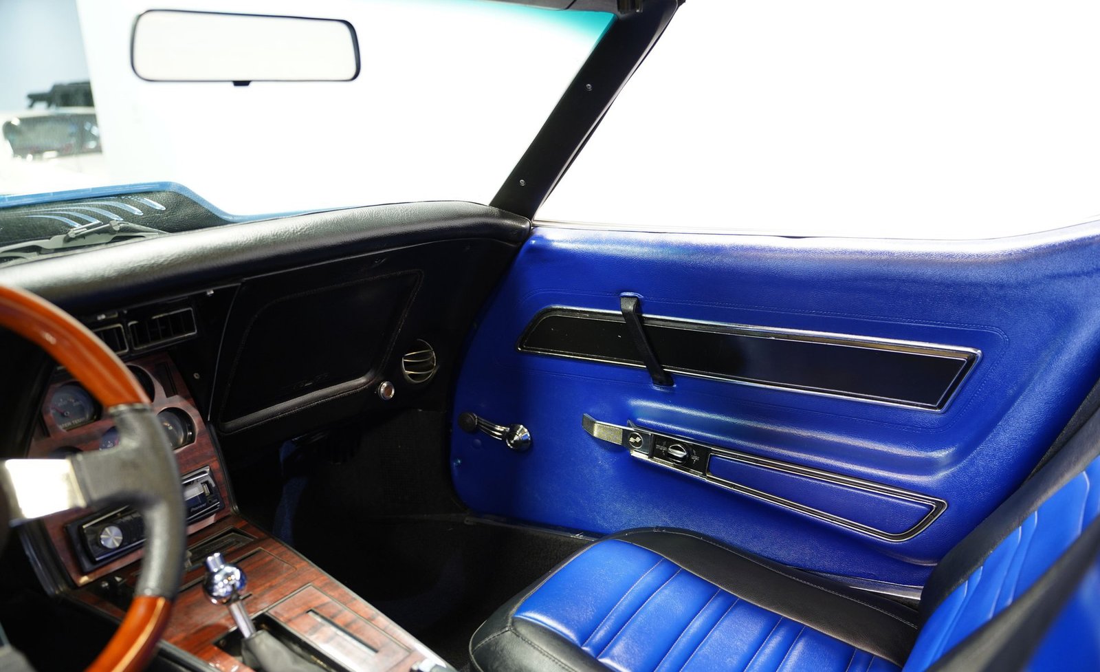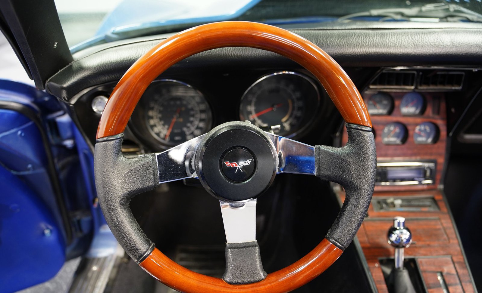 Por dentro, a cabine envolve você em uma combinação personalizada de conforto e estilo clássico. Os bancos de vinil preto e azul, com painéis de porta combinando, oferecem suporte e estilo, enquanto o console central com acabamento em imitação de madeira adiciona um toque de elegância. Um volante de madeira de três raios com o emblema da Chevrolet se encaixa perfeitamente nas mãos, complementado por um painel de instrumentos no estilo original que mantém você conectado às raízes vintage do carro. O sistema de som Pioneer e os alto-falantes Sony 6×9 garantem que sua trilha sonora seja tão memorável quanto a direção.
