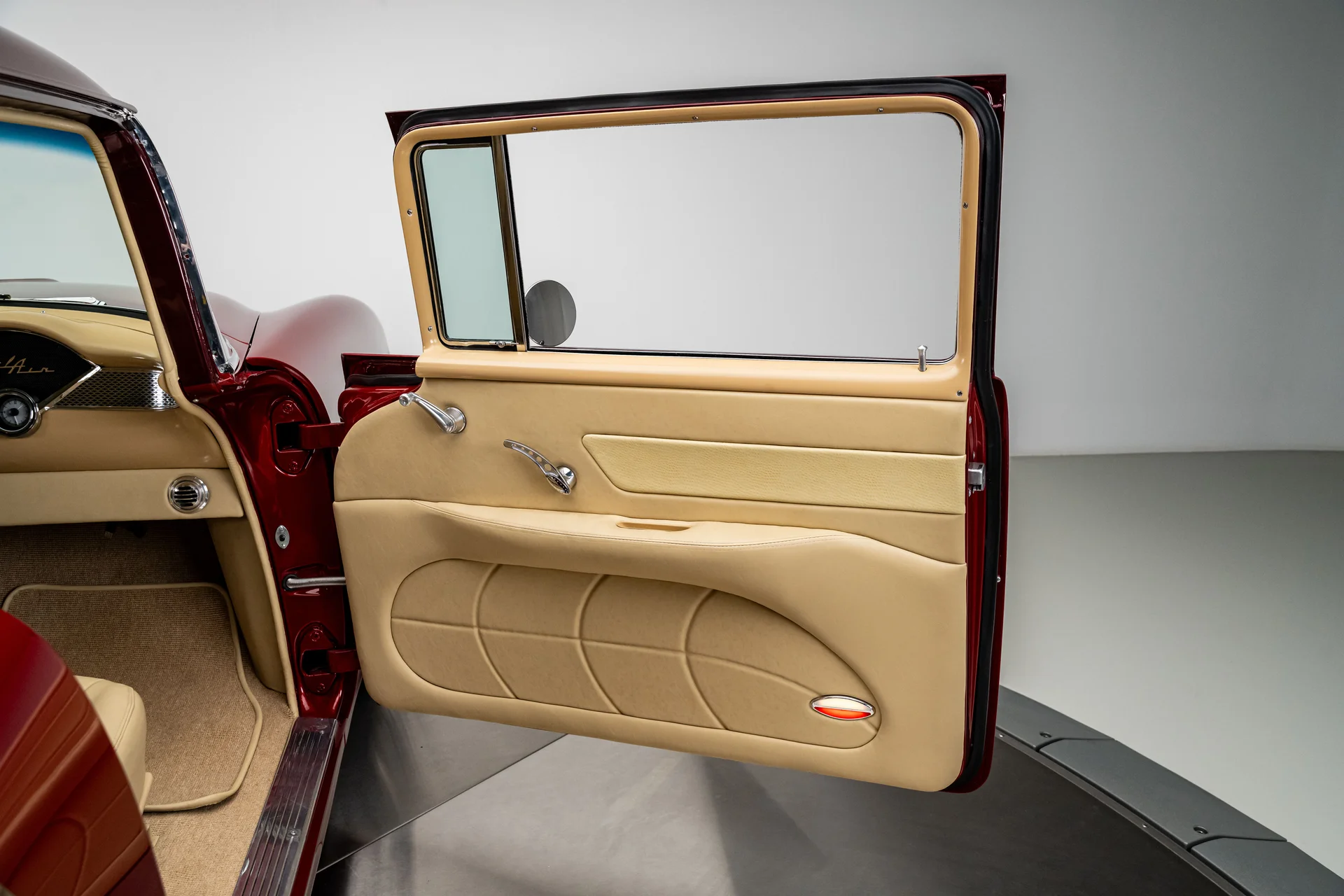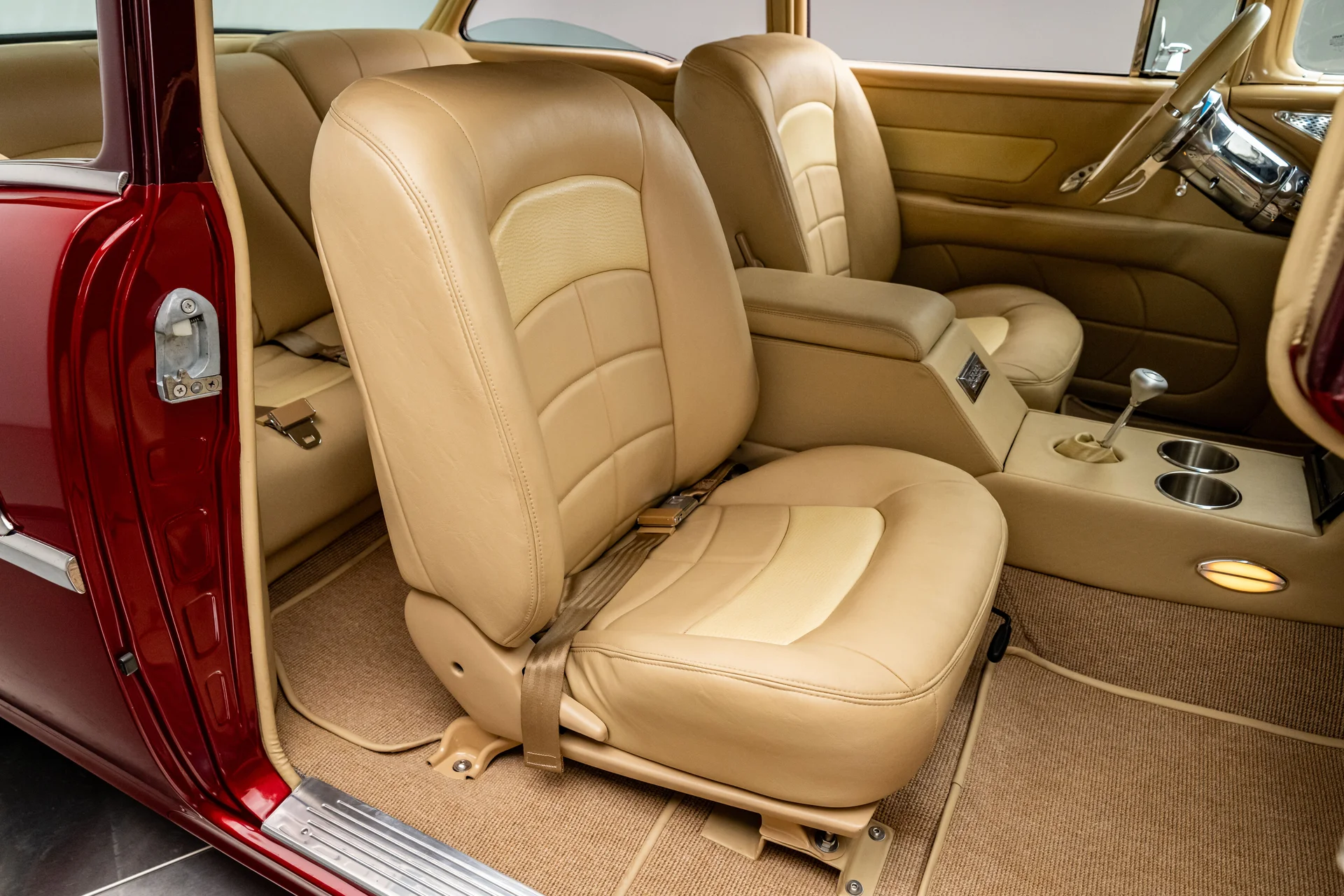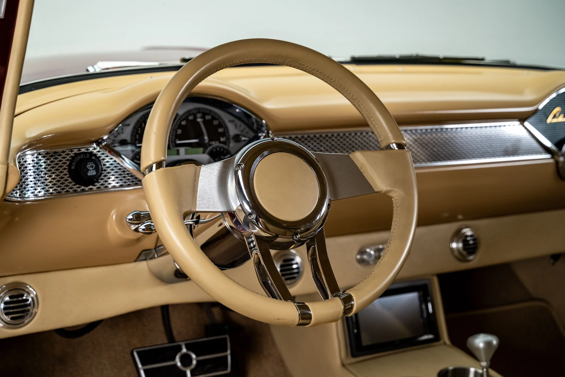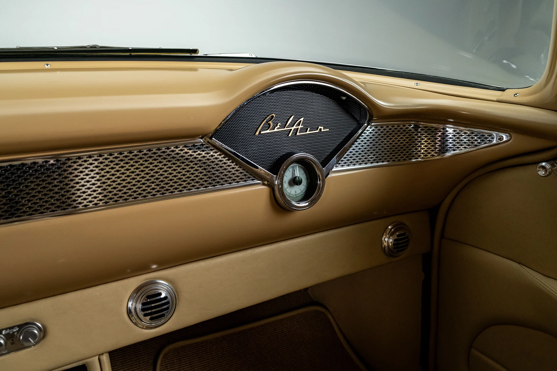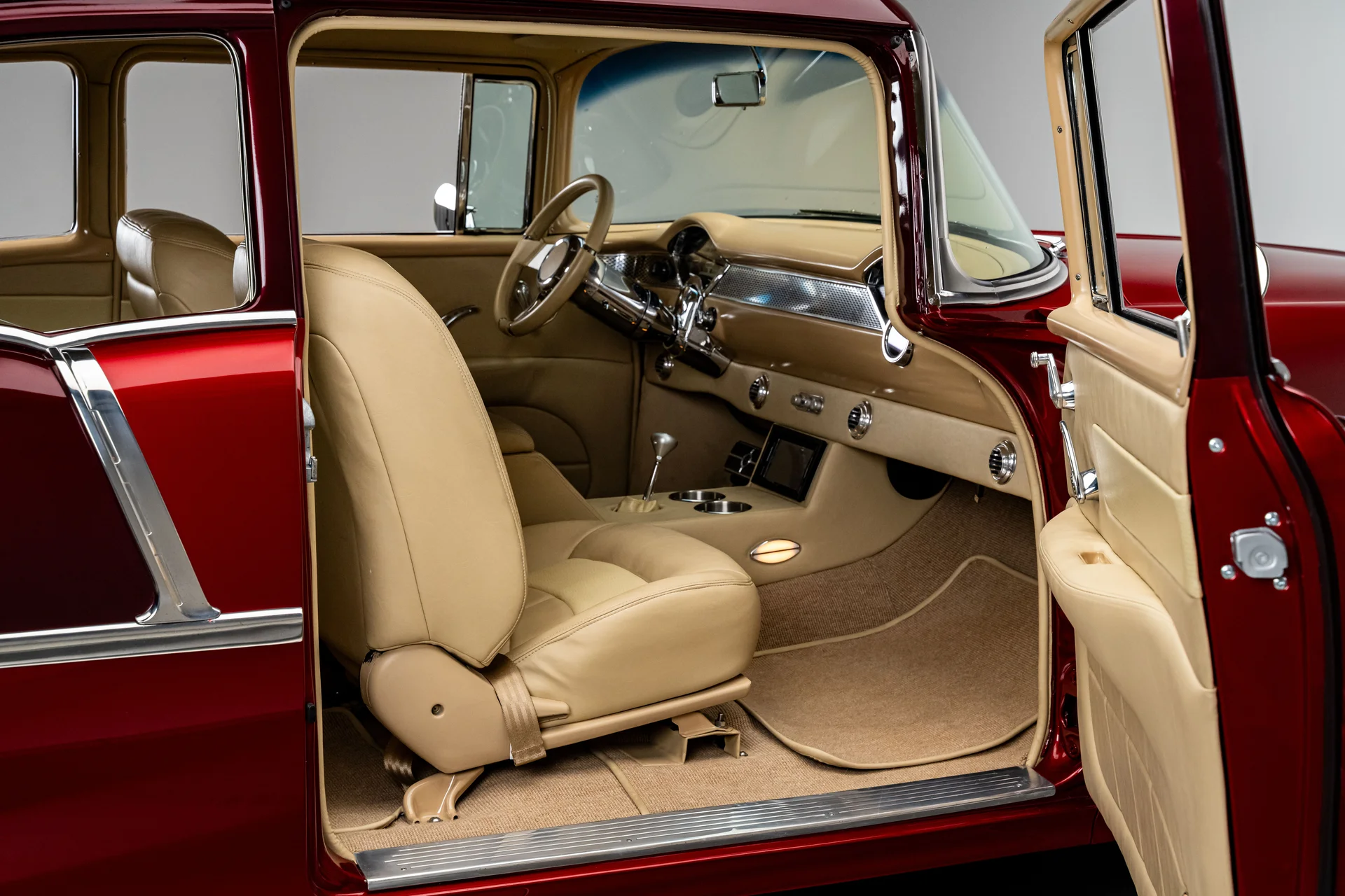 Ao abrir a porta, você se depara com algo muito mais sofisticado do que a Chevrolet poderia ter imaginado em 1955. Couro bege personalizado, bancos concha macios e um console central que se estende por todo o comprimento do carro dão o tom, abrigando os interruptores dos vidros elétricos, porta-copos integrados e um prático compartimento de armazenamento. Os instrumentos Dakota Digital VHX ancoram o painel, e o ar-condicionado moderno mantém a cabine confortável sem comprometer o visual personalizado. Notavelmente, o acabamento do painel do lado do passageiro incorpora a inscrição “Bel Air”, uma sutil referência ao acabamento de luxo da Chevrolet e aos temas de estilo comuns da época. Uma moderna tela sensível ao toque JVC controla o áudio e o Bluetooth, oferece recursos completos de streaming e está preparada para o SiriusXM para viagens mais longas. Um volante Flaming River Waterfall repousa sobre uma coluna de direção com ajuste de inclinação polida, combinada com uma alavanca de câmbio Lokar que se encaixa perfeitamente na proposta de um carro moderno para o motorista. O porta-malas também não foi esquecido, com um acabamento impecável que garante a coesão de todo o interior, da frente à traseira.