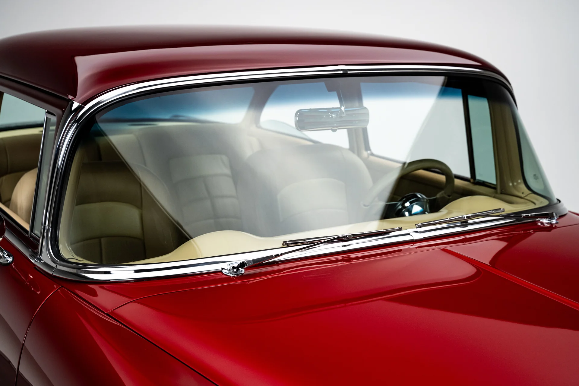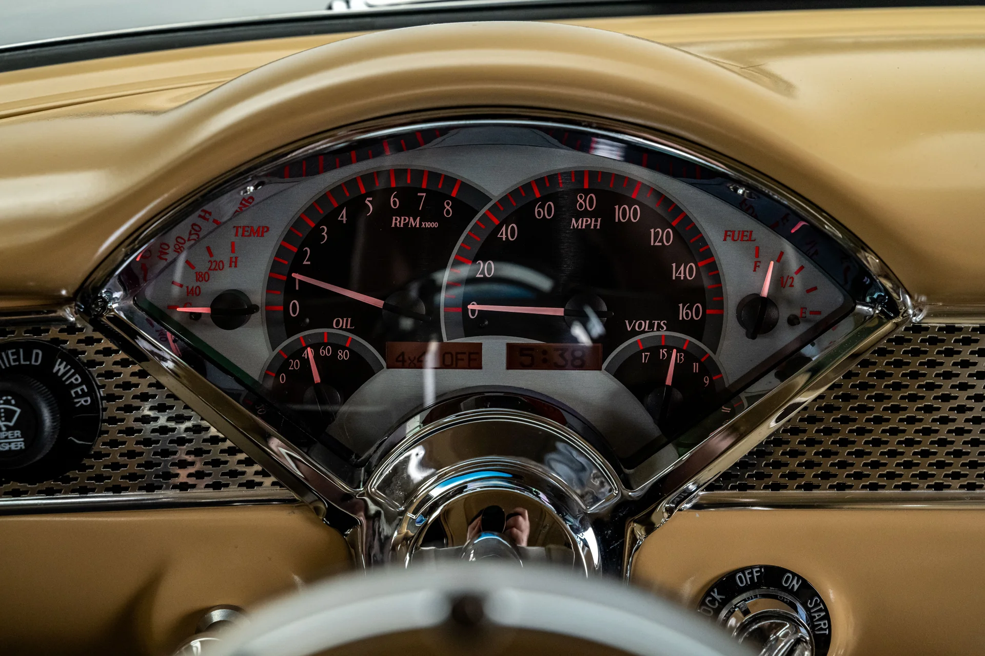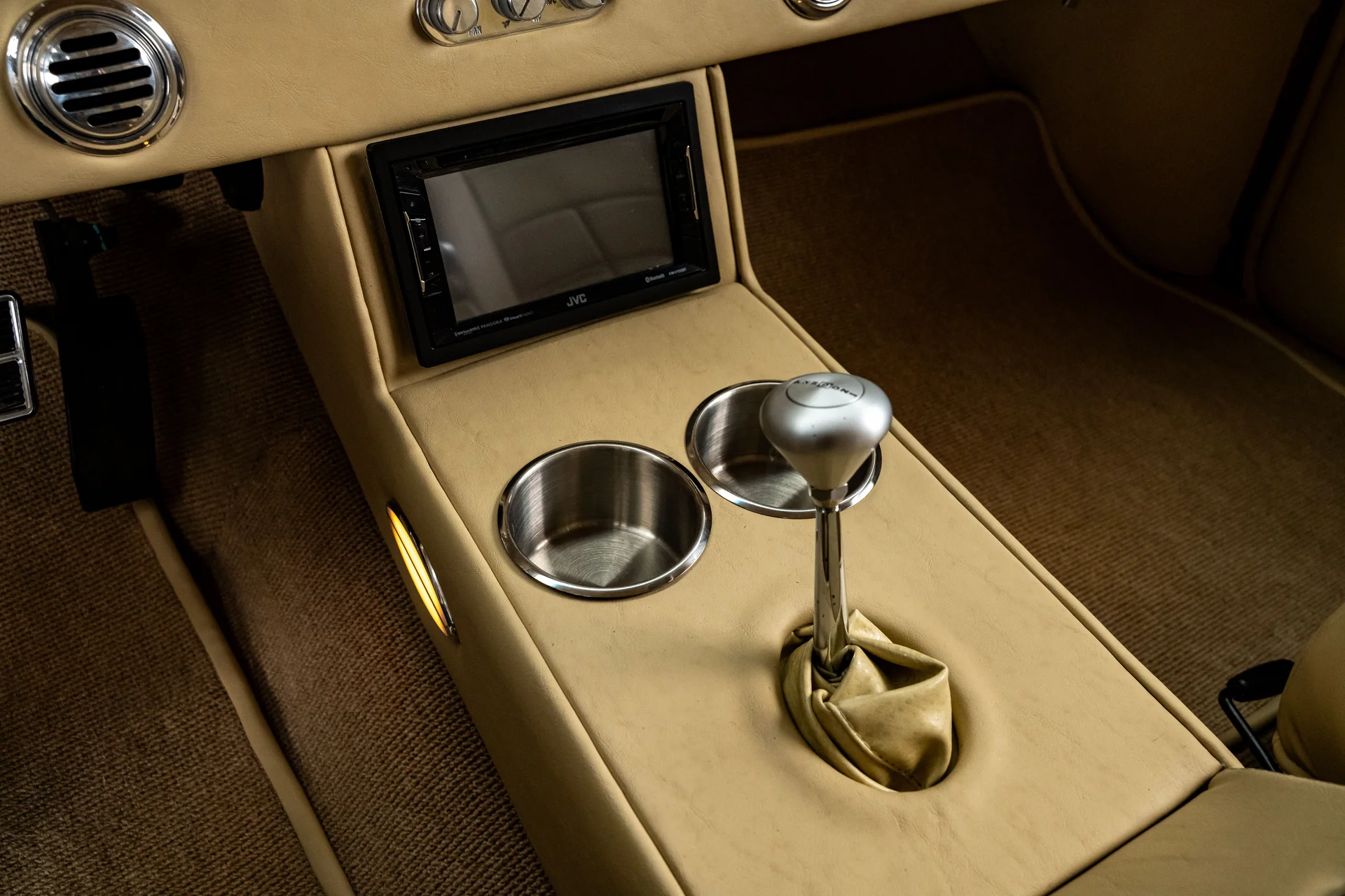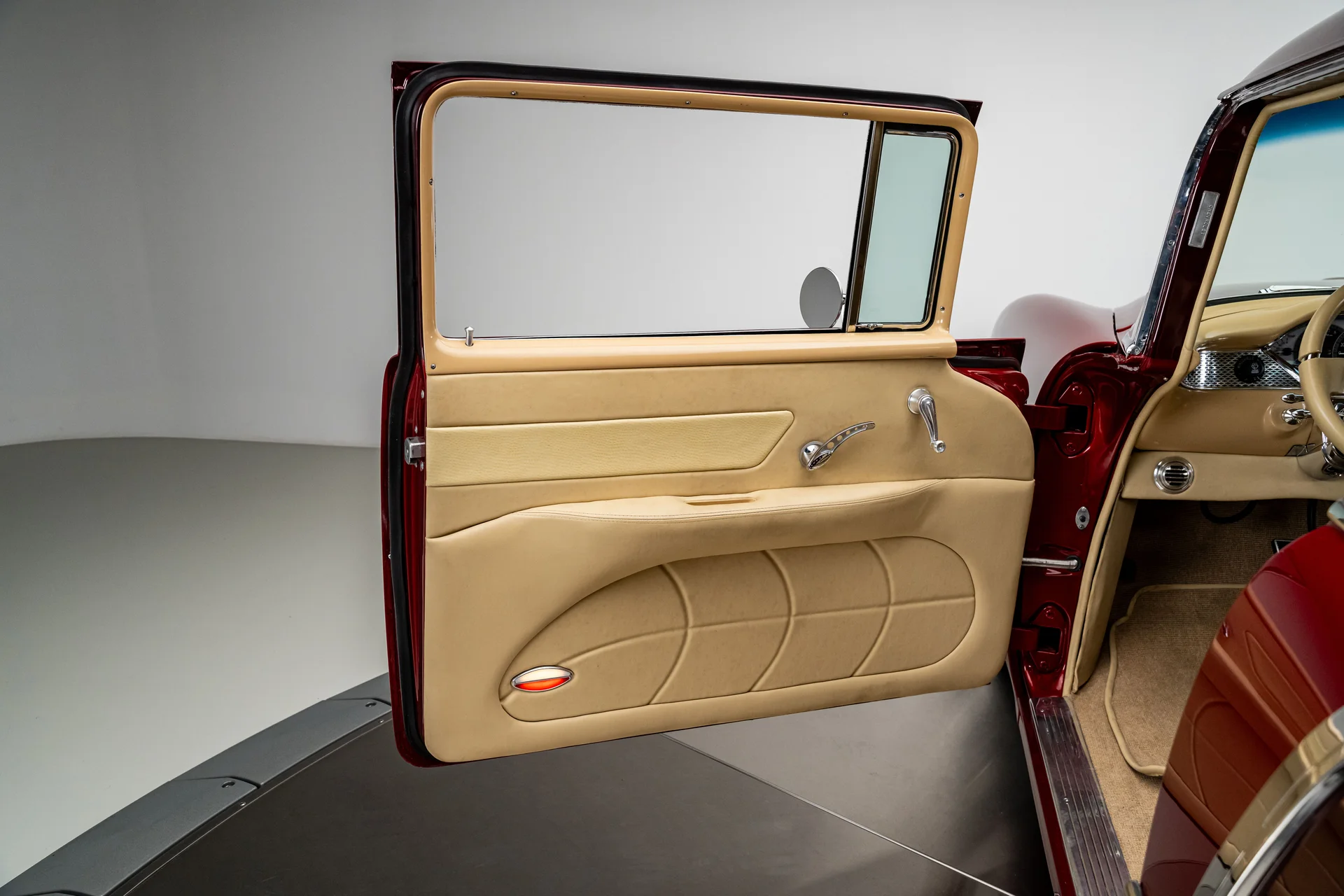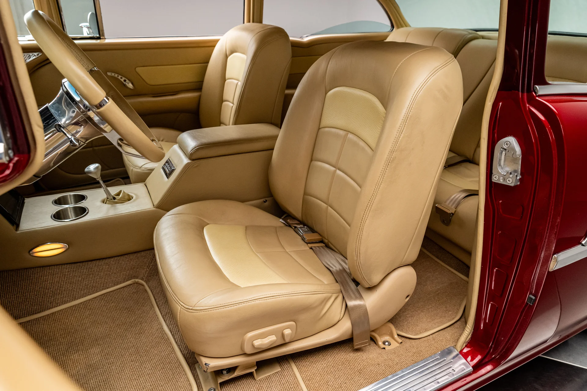 Ao abrir a porta, você se depara com algo muito mais sofisticado do que a Chevrolet poderia ter imaginado em 1955. Couro bege personalizado, bancos concha macios e um console central que se estende por todo o comprimento do carro dão o tom, abrigando os interruptores dos vidros elétricos, porta-copos integrados e um prático compartimento de armazenamento. Os instrumentos Dakota Digital VHX ancoram o painel, e o ar-condicionado moderno mantém a cabine confortável sem comprometer o visual personalizado. Notavelmente, o acabamento do painel do lado do passageiro incorpora a inscrição “Bel Air”, uma sutil referência ao acabamento de luxo da Chevrolet e aos temas de estilo comuns da época. Uma moderna tela sensível ao toque JVC controla o áudio e o Bluetooth, oferece recursos completos de streaming e está preparada para o SiriusXM para viagens mais longas. Um volante Flaming River Waterfall repousa sobre uma coluna de direção com ajuste de inclinação polida, combinada com uma alavanca de câmbio Lokar que se encaixa perfeitamente na proposta de um carro moderno para o motorista. O porta-malas também não foi esquecido, com um acabamento impecável que garante a coesão de todo o interior, da frente à traseira.