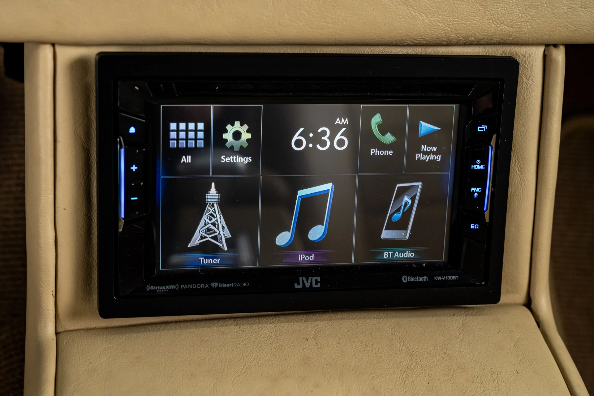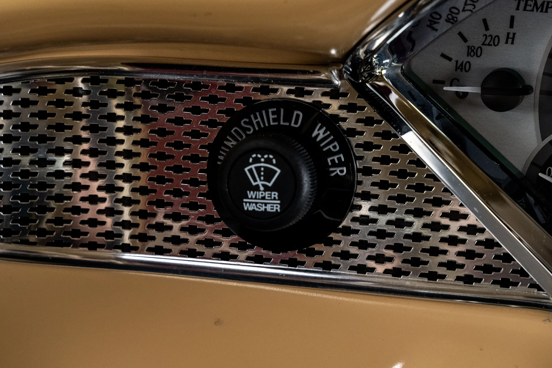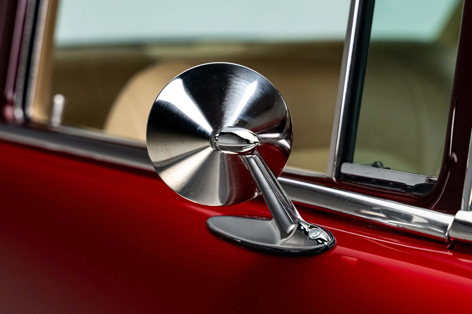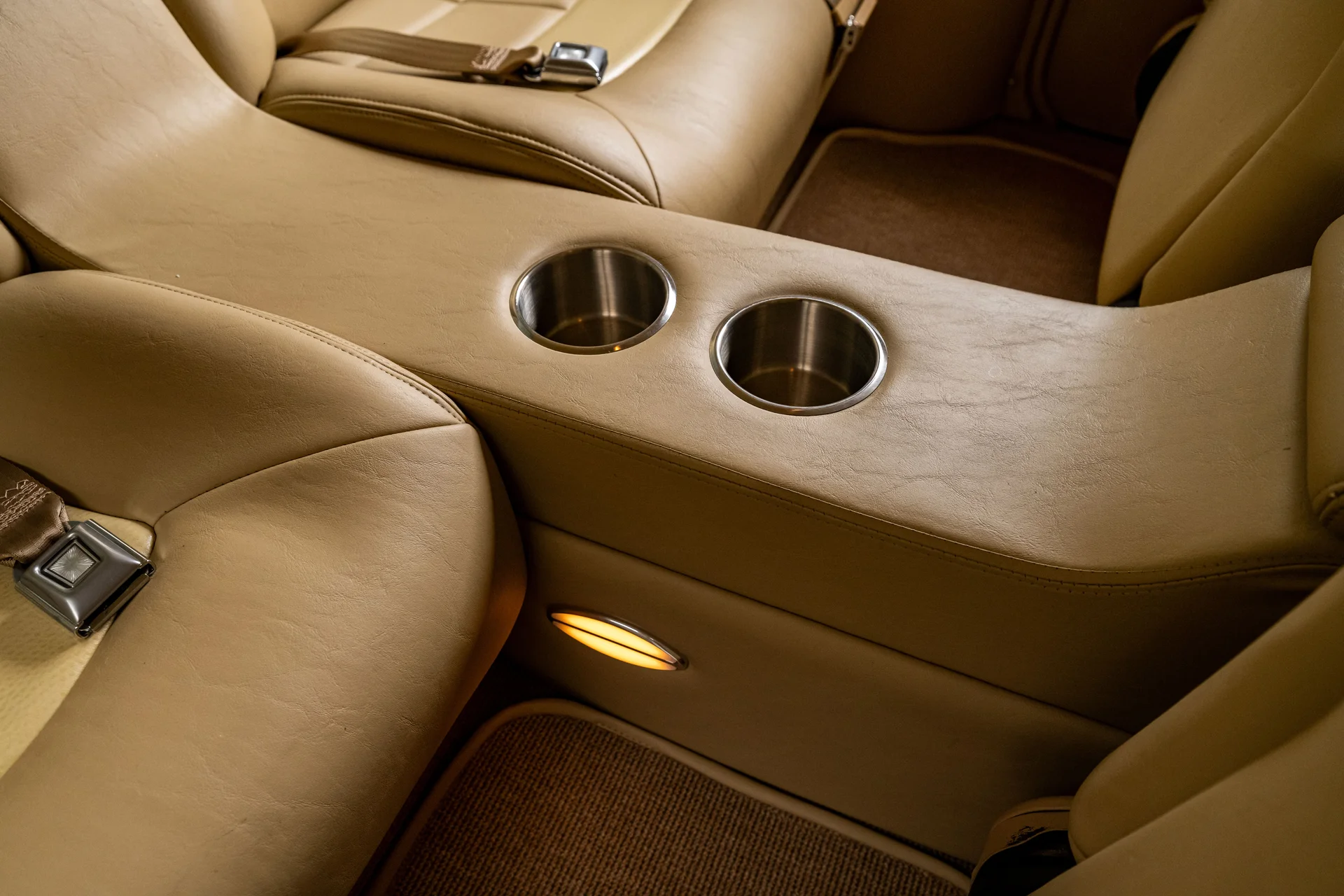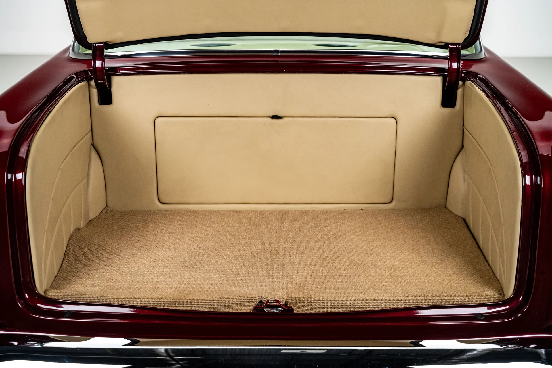 Ao abrir a porta, você se depara com algo muito mais sofisticado do que a Chevrolet poderia ter imaginado em 1955. Couro bege personalizado, bancos concha macios e um console central que se estende por todo o comprimento do carro dão o tom, abrigando os interruptores dos vidros elétricos, porta-copos integrados e um prático compartimento de armazenamento. Os instrumentos Dakota Digital VHX ancoram o painel, e o ar-condicionado moderno mantém a cabine confortável sem comprometer o visual personalizado. Notavelmente, o acabamento do painel do lado do passageiro incorpora a inscrição “Bel Air”, uma sutil referência ao acabamento de luxo da Chevrolet e aos temas de estilo comuns da época. Uma moderna tela sensível ao toque JVC controla o áudio e o Bluetooth, oferece recursos completos de streaming e está preparada para o SiriusXM para viagens mais longas. Um volante Flaming River Waterfall repousa sobre uma coluna de direção com ajuste de inclinação polida, combinada com uma alavanca de câmbio Lokar que se encaixa perfeitamente na proposta de um carro moderno para o motorista. O porta-malas também não foi esquecido, com um acabamento impecável que garante a coesão de todo o interior, da frente à traseira.