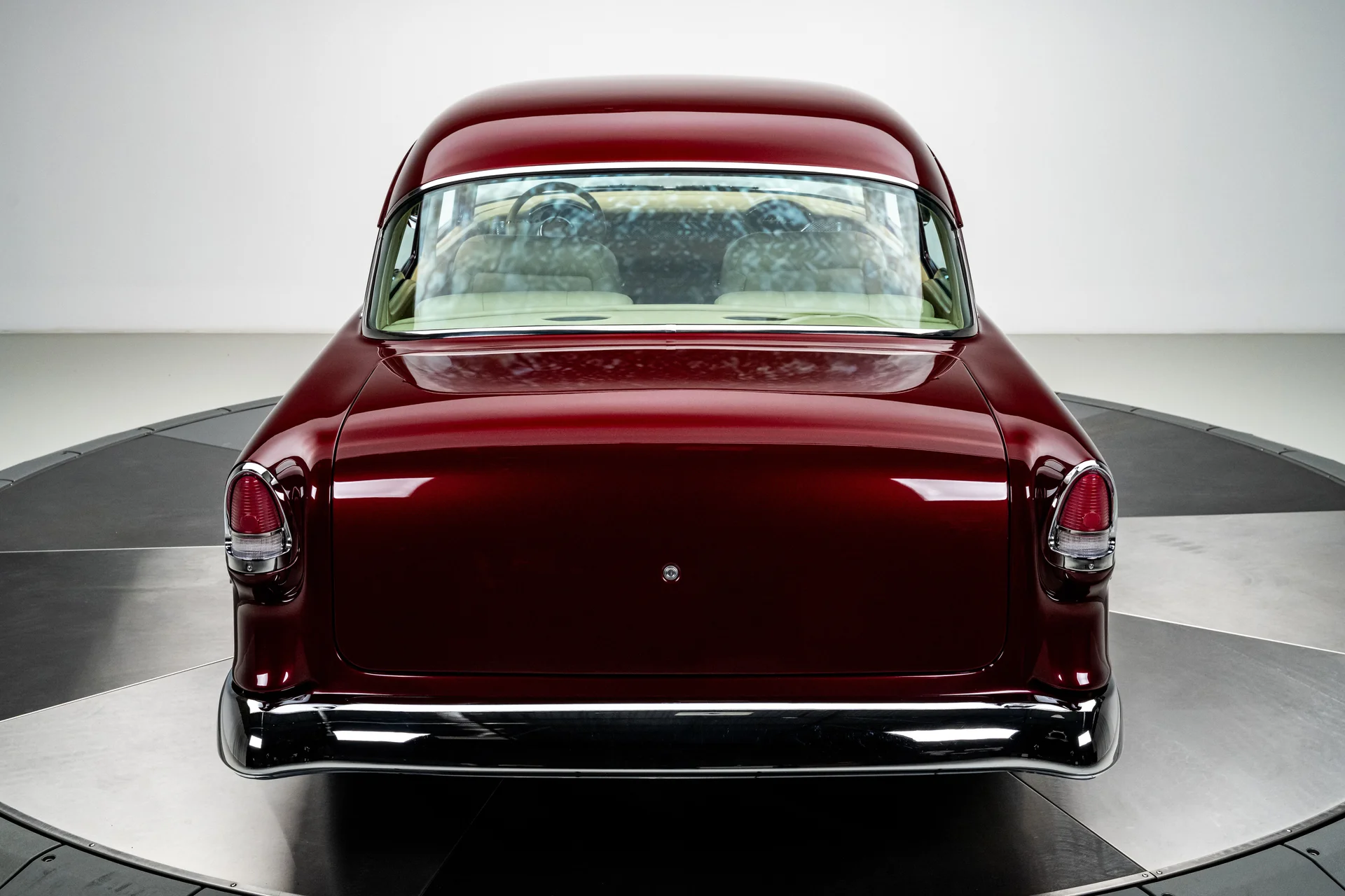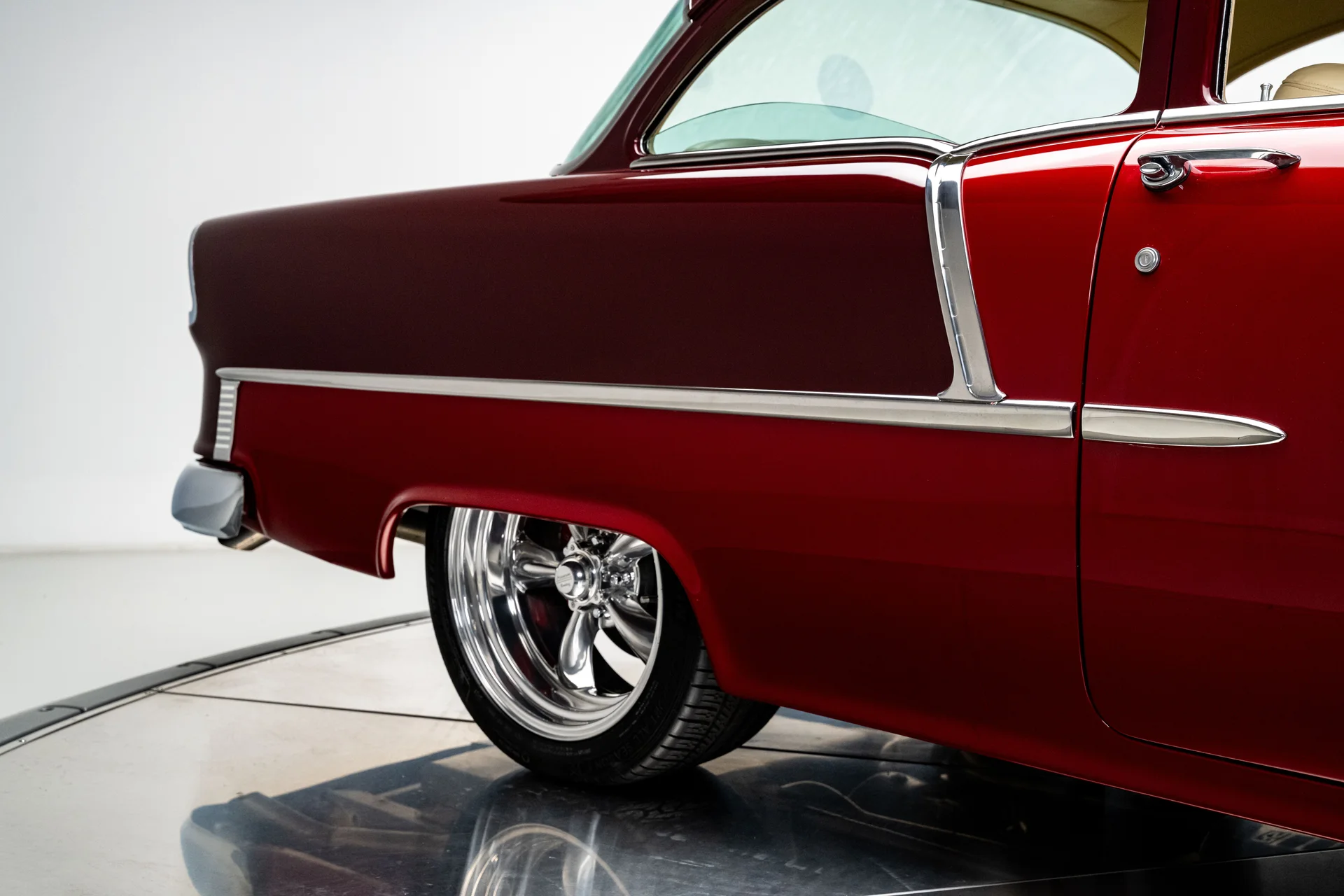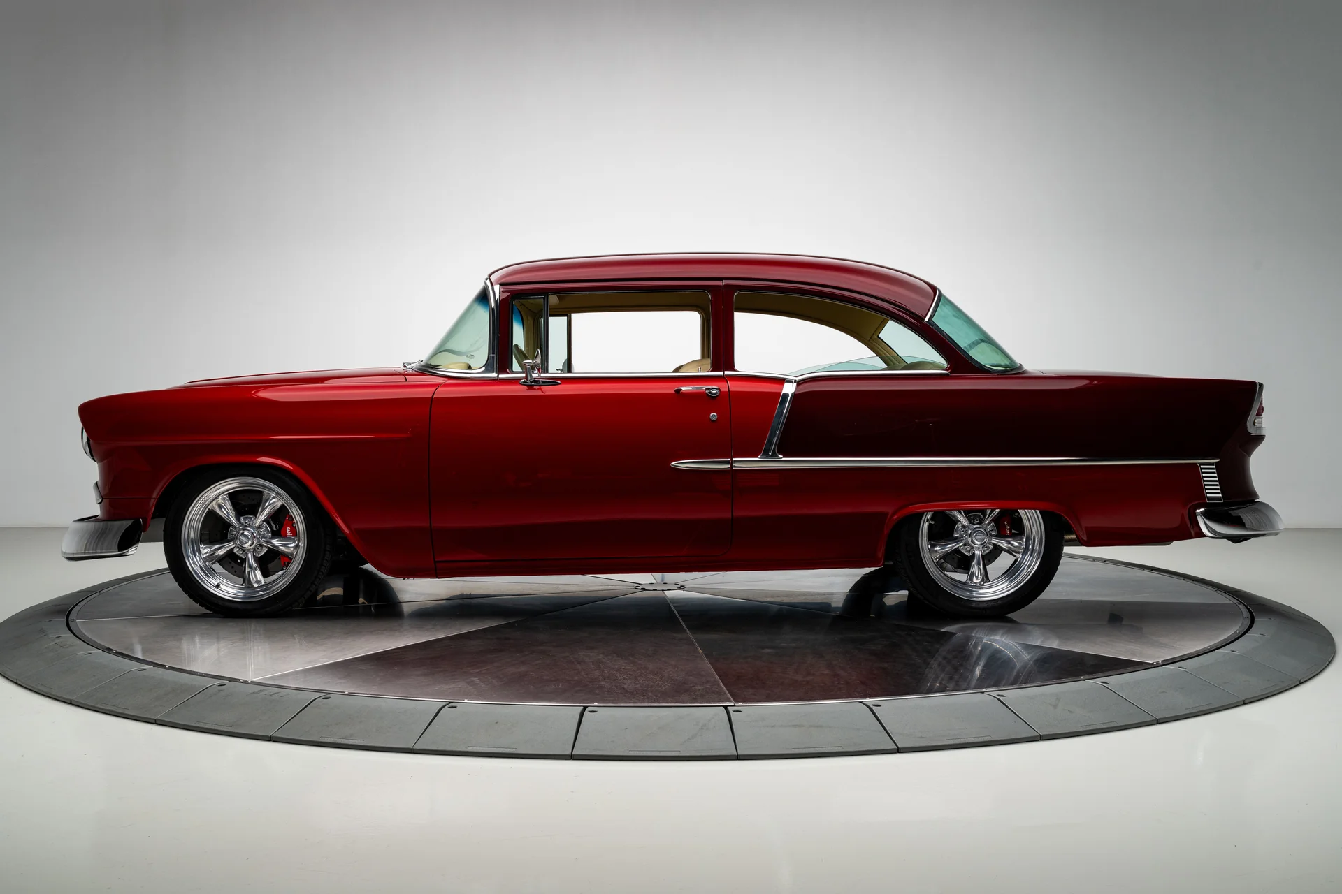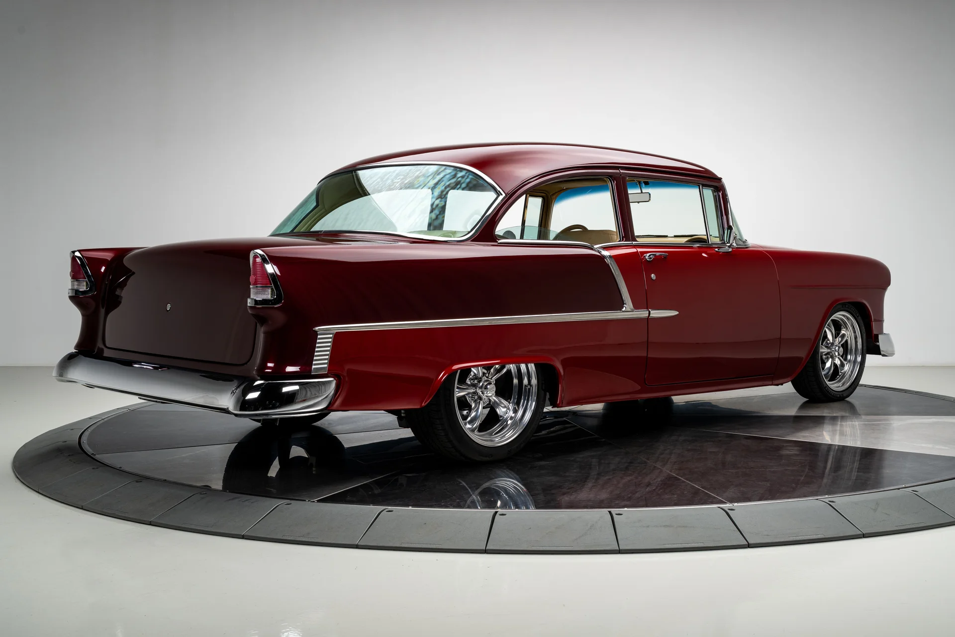 Um Chevrolet 210 de 1955 totalmente personalizado se define pela sua execução, e este acerta em cheio em todos os aspectos. O carro foi desmontado e reconstruído com metal novo, um chassi Roadster Shop Fast Track e um motor Chevrolet Performance LS376/480 que lhe confere potência de verdade sem torná-lo difícil de controlar. A carroceria exibe uma pintura metálica bicolor em tom bordô que combina perfeitamente com o formato, e o interior personalizado em couro bege eleva a cabine ao padrão que se espera de um projeto de alta qualidade. É um Tri-Five com acabamento impecável, desempenho moderno, conforto moderno e um nível de detalhamento que faz com que todo o carro pareça harmonioso.