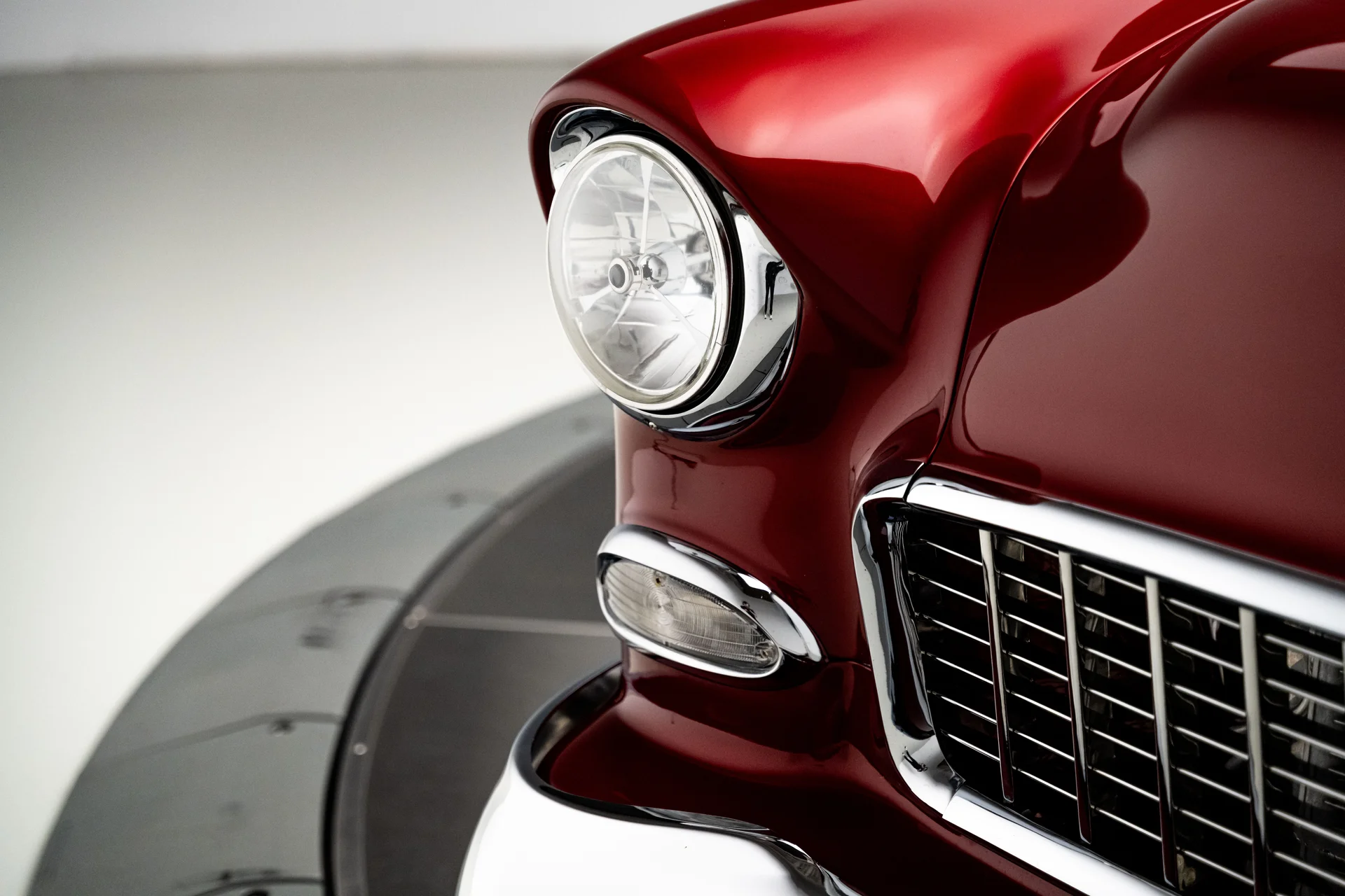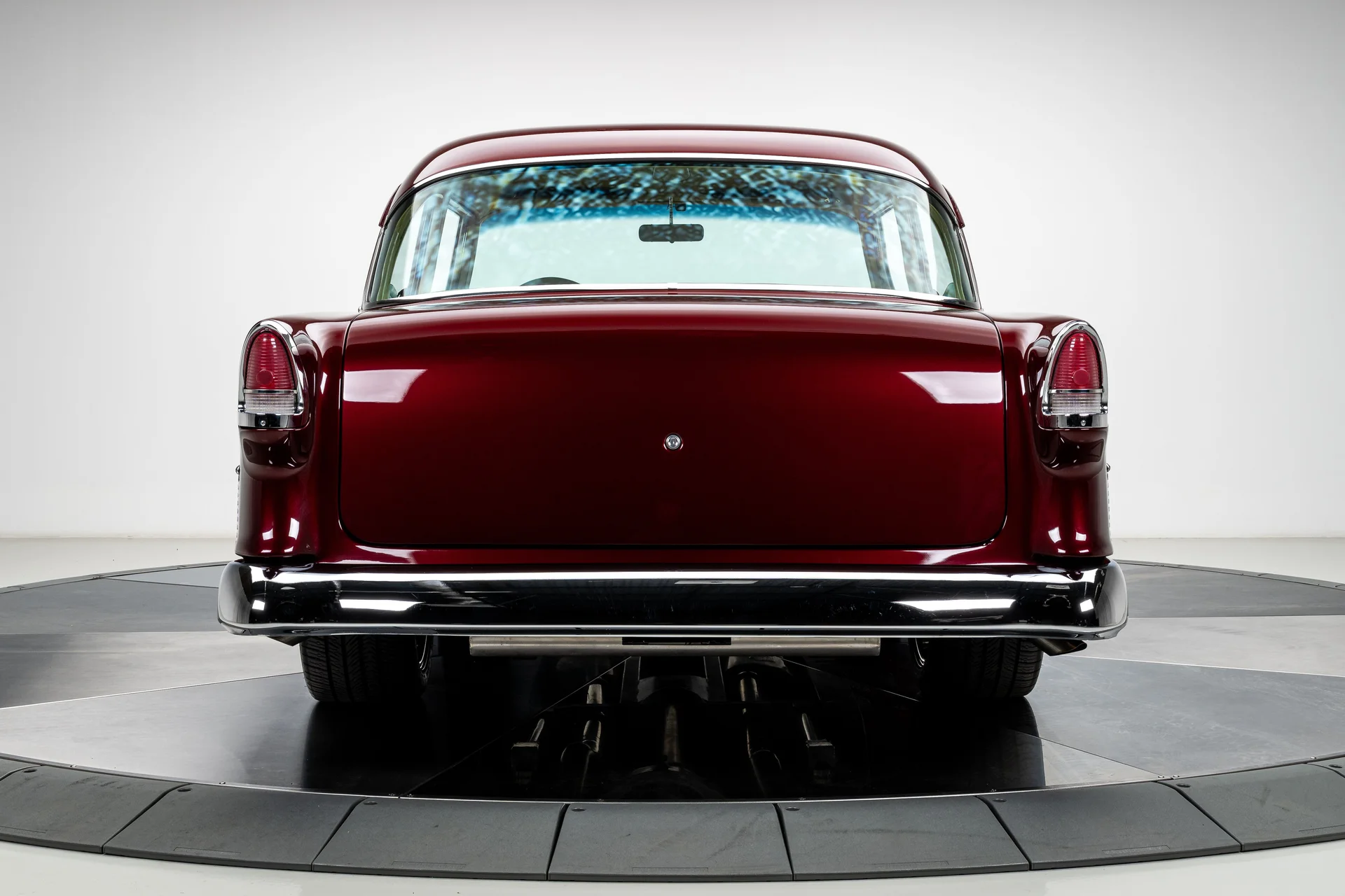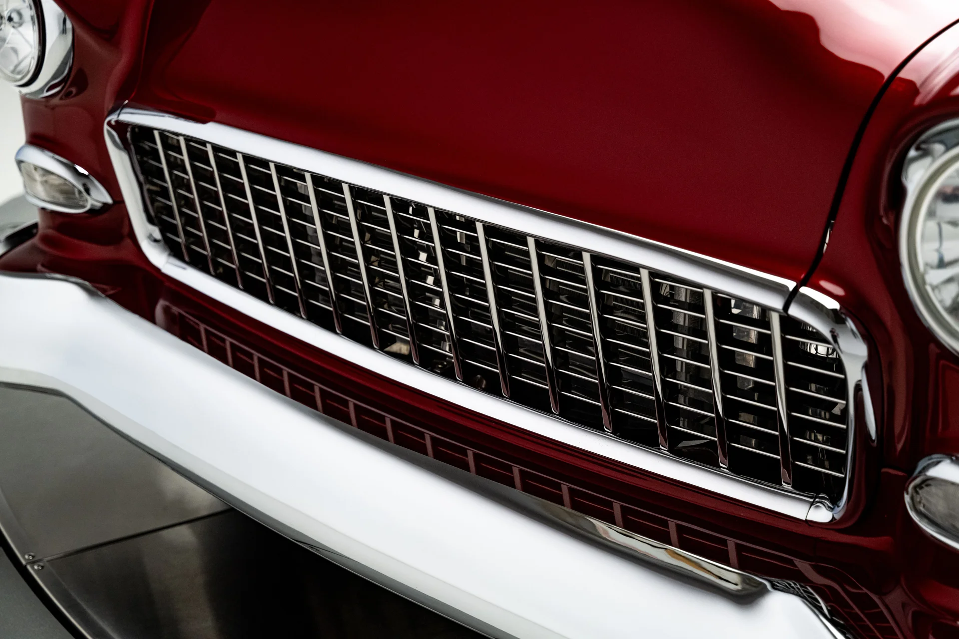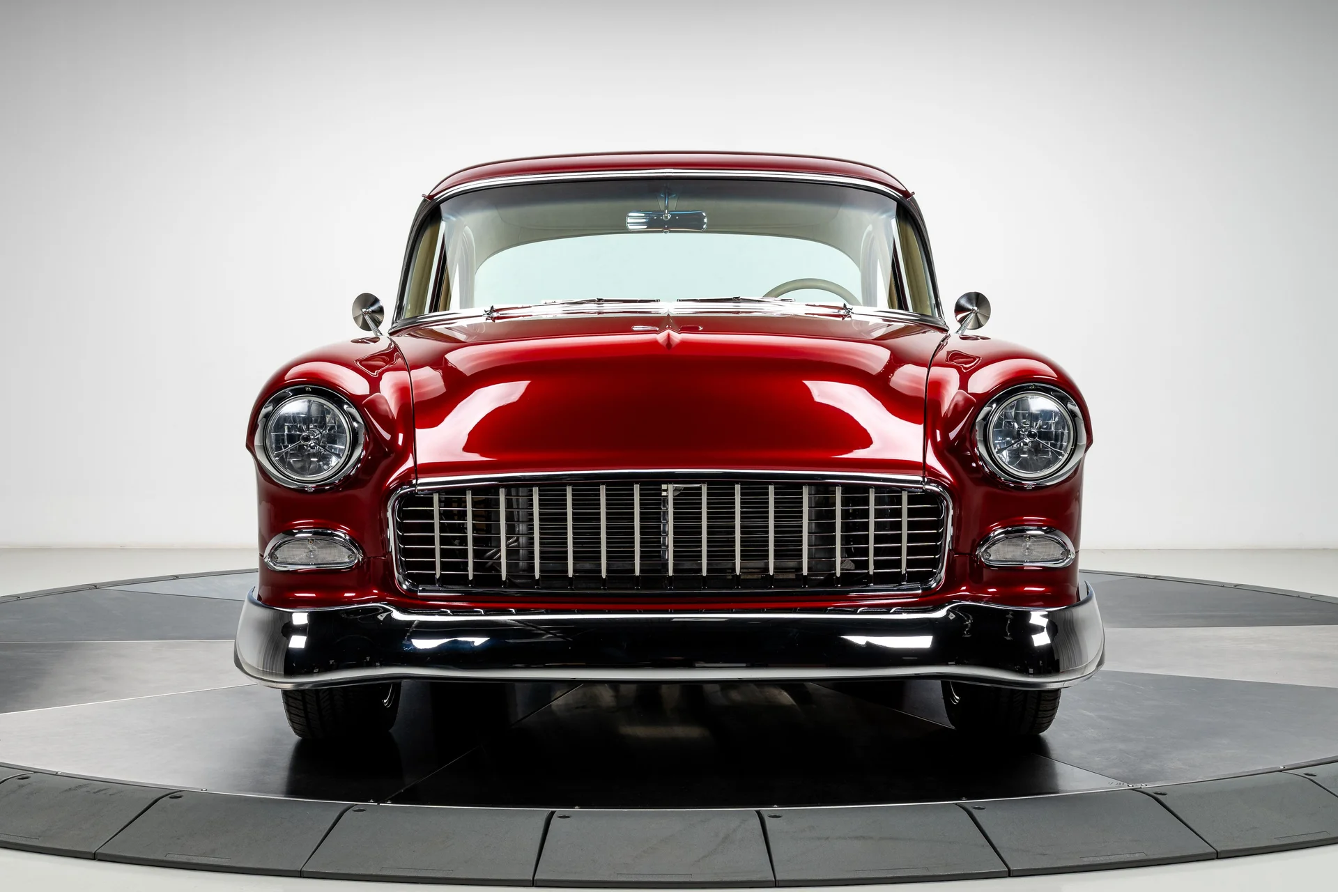 Um Chevrolet 210 de 1955 totalmente personalizado se define pela sua execução, e este acerta em cheio em todos os aspectos. O carro foi desmontado e reconstruído com metal novo, um chassi Roadster Shop Fast Track e um motor Chevrolet Performance LS376/480 que lhe confere potência de verdade sem torná-lo difícil de controlar. A carroceria exibe uma pintura metálica bicolor em tom bordô que combina perfeitamente com o formato, e o interior personalizado em couro bege eleva a cabine ao padrão que se espera de um projeto de alta qualidade. É um Tri-Five com acabamento impecável, desempenho moderno, conforto moderno e um nível de detalhamento que faz com que todo o carro pareça harmonioso.