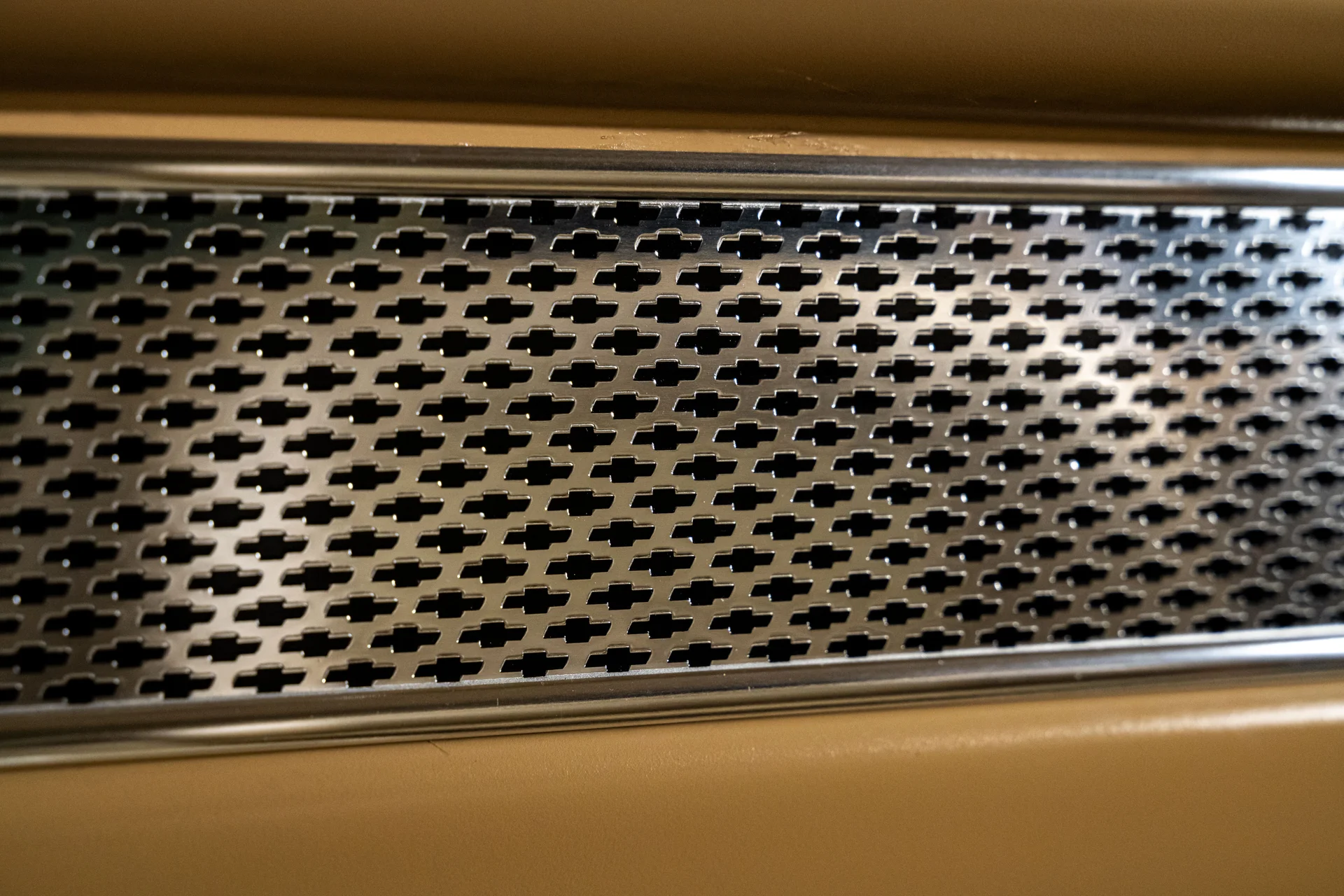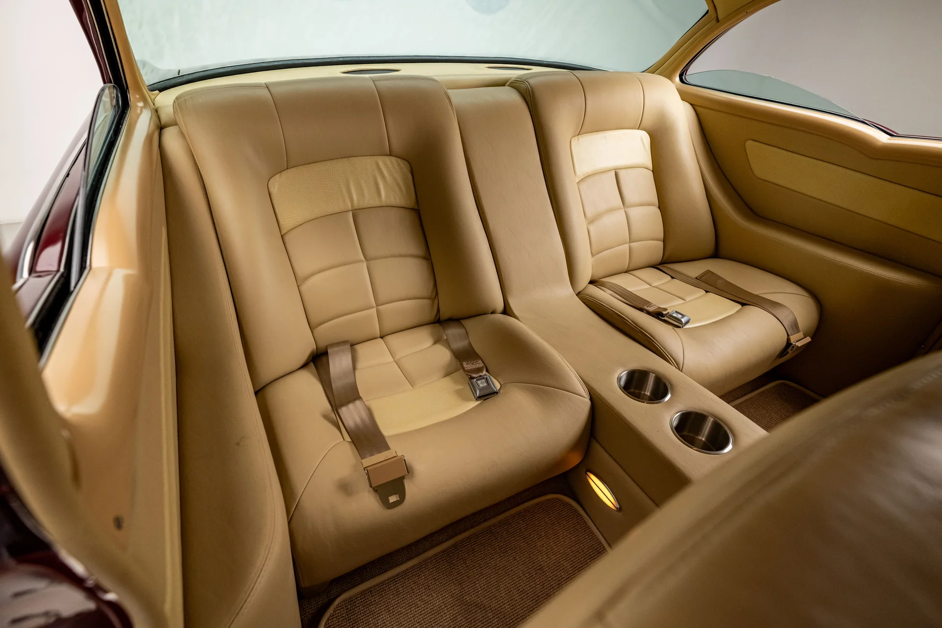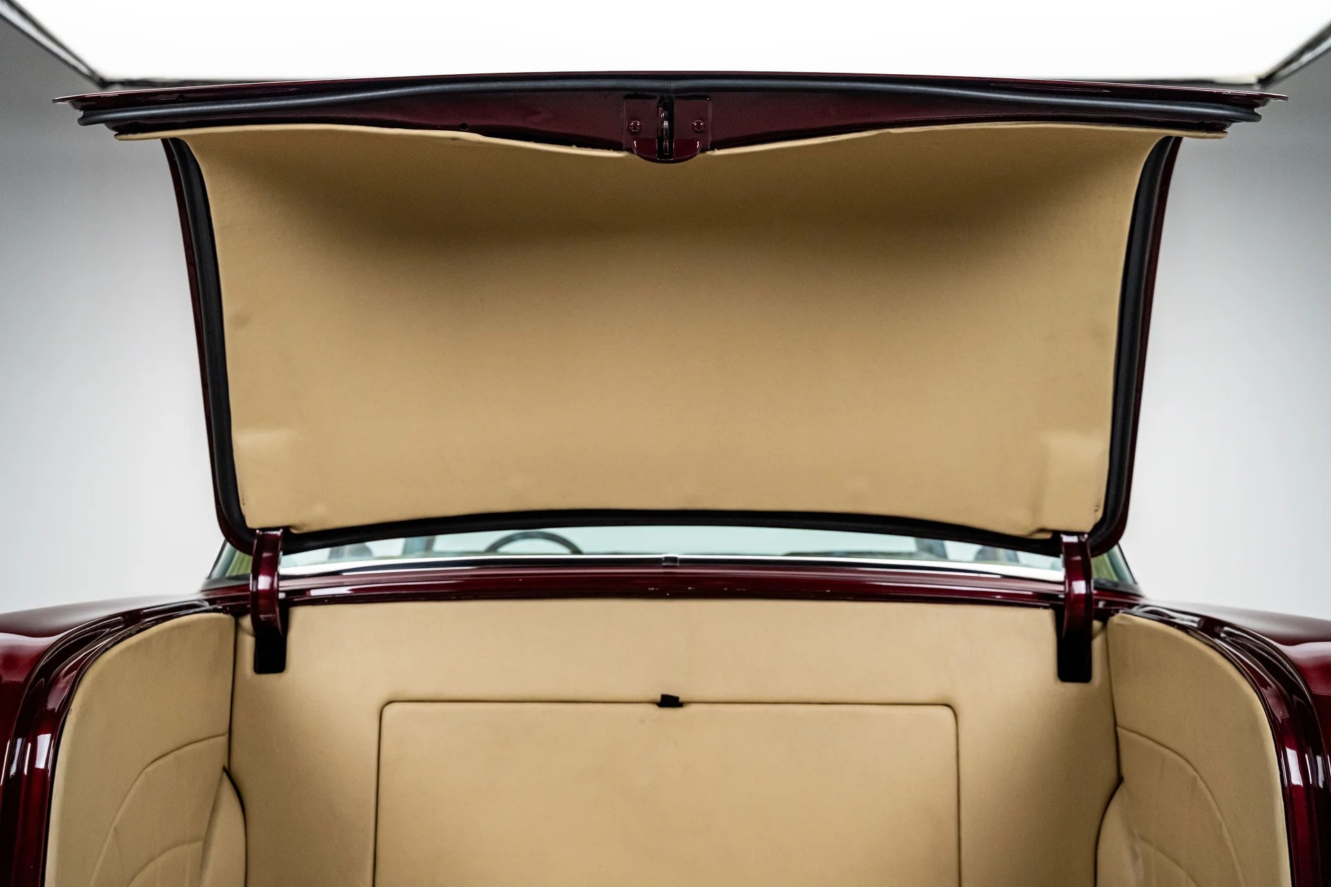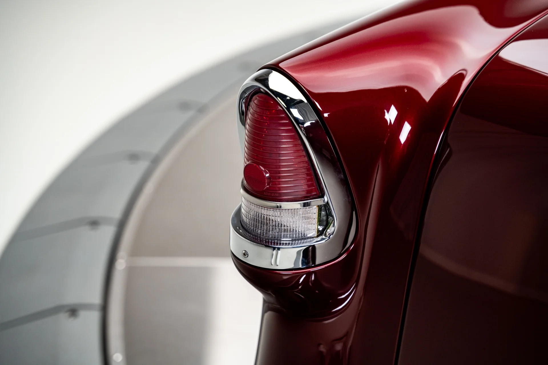A restauração foi completa, desde a desmontagem até a chapa de aço nua, e a remontagem resultou em encaixes precisos, detalhes refinados e uma pintura bicamada impecável com aspecto líquido. A dianteira mantém o visual clássico, mas troca os elementos originais por um para-choque alisado, grade polida, faróis limpos e um capô com design aerodinâmico. Frisos de aço inoxidável contornam a cabine e acompanham as linhas da carroceria sem destoar da pintura, enquanto as rodas American Racing de 18 polegadas polidas preenchem os para-lamas com a dose certa de presença moderna. Na traseira, outro para-choque alisado emoldura um porta-malas com cobertura e lanternas traseiras de LED, uma das quais se abre para dar acesso ao bocal de abastecimento. Nada aqui parece exagerado. É simples, preciso e transmite confiança.