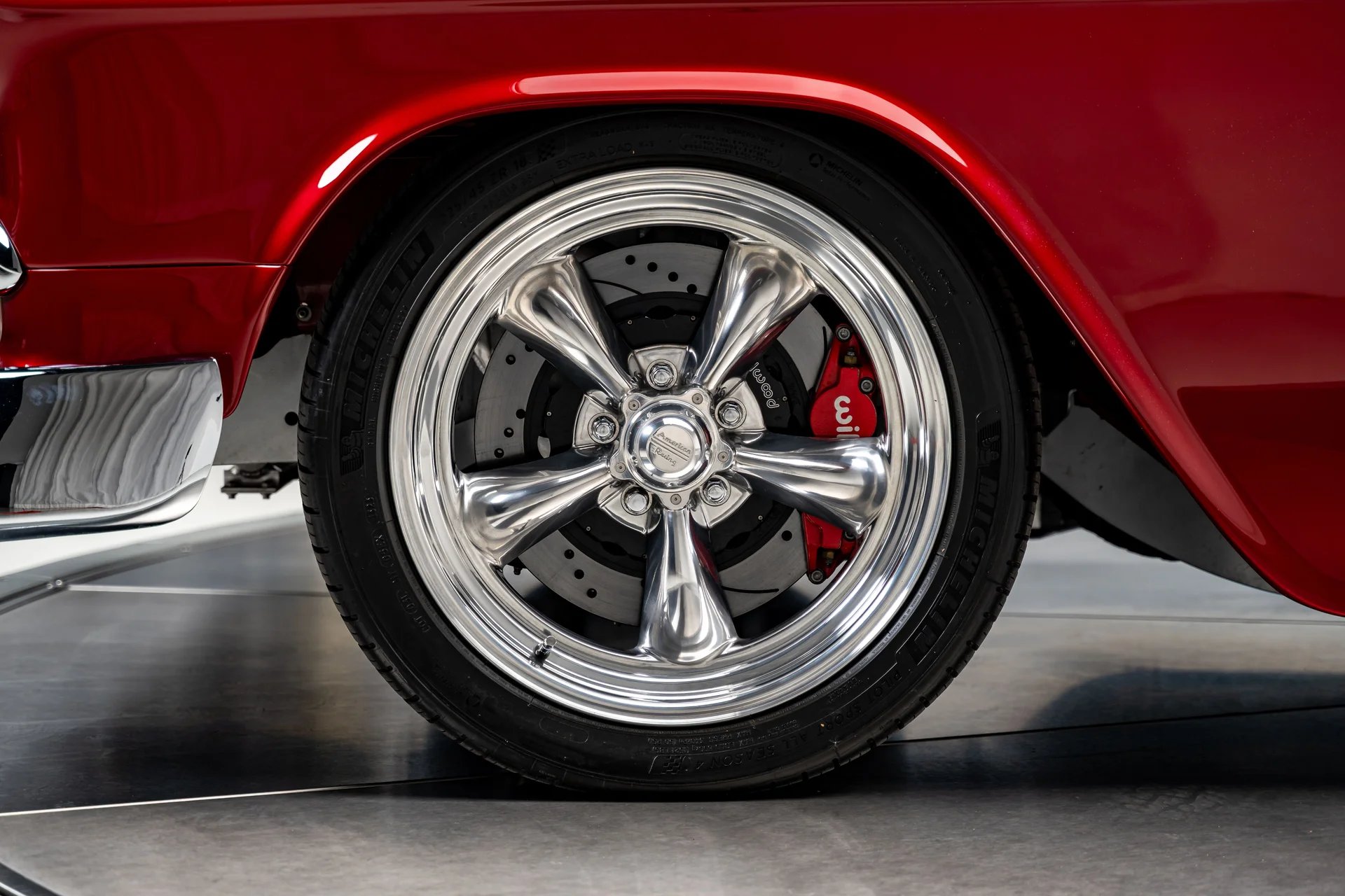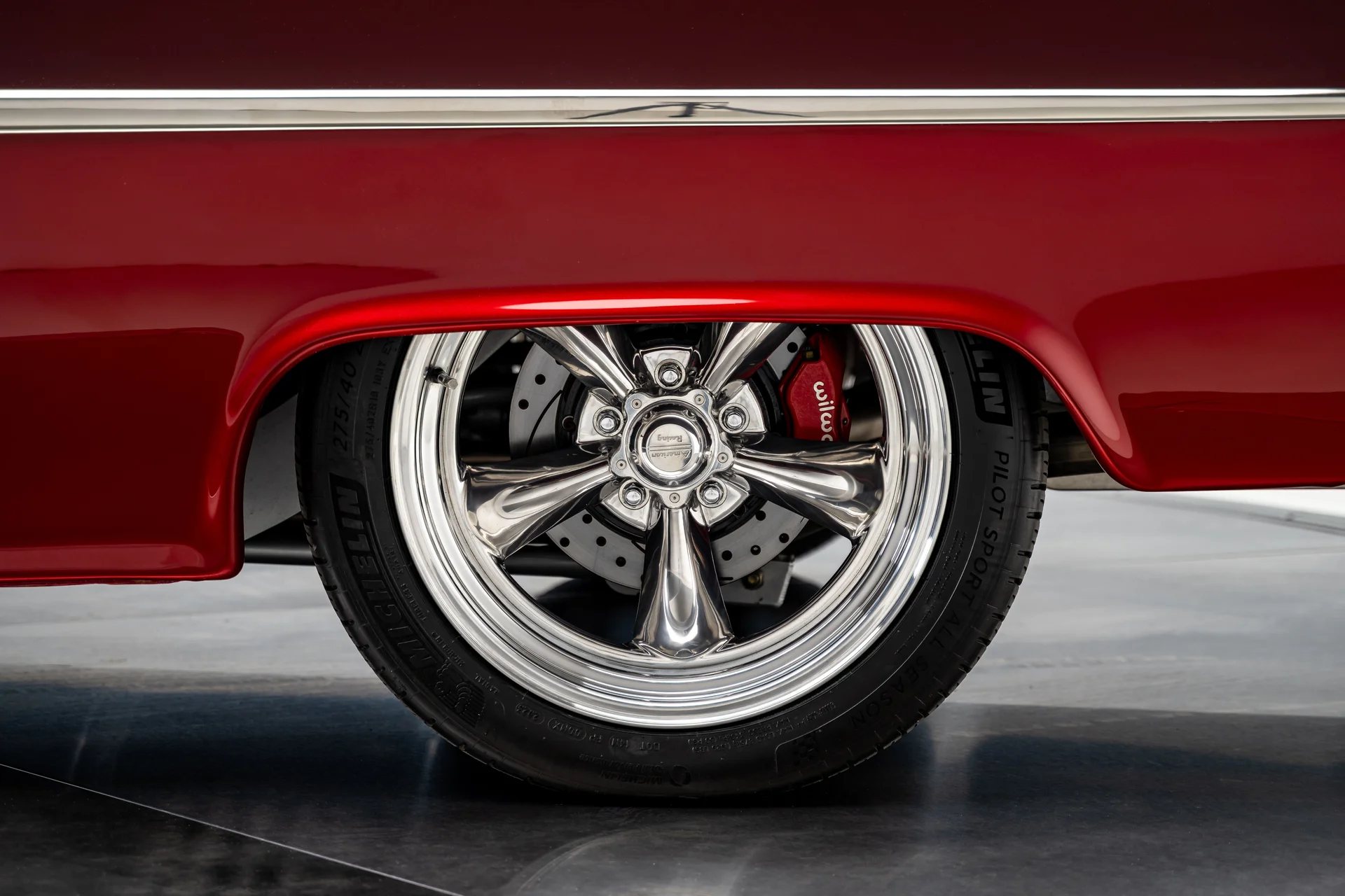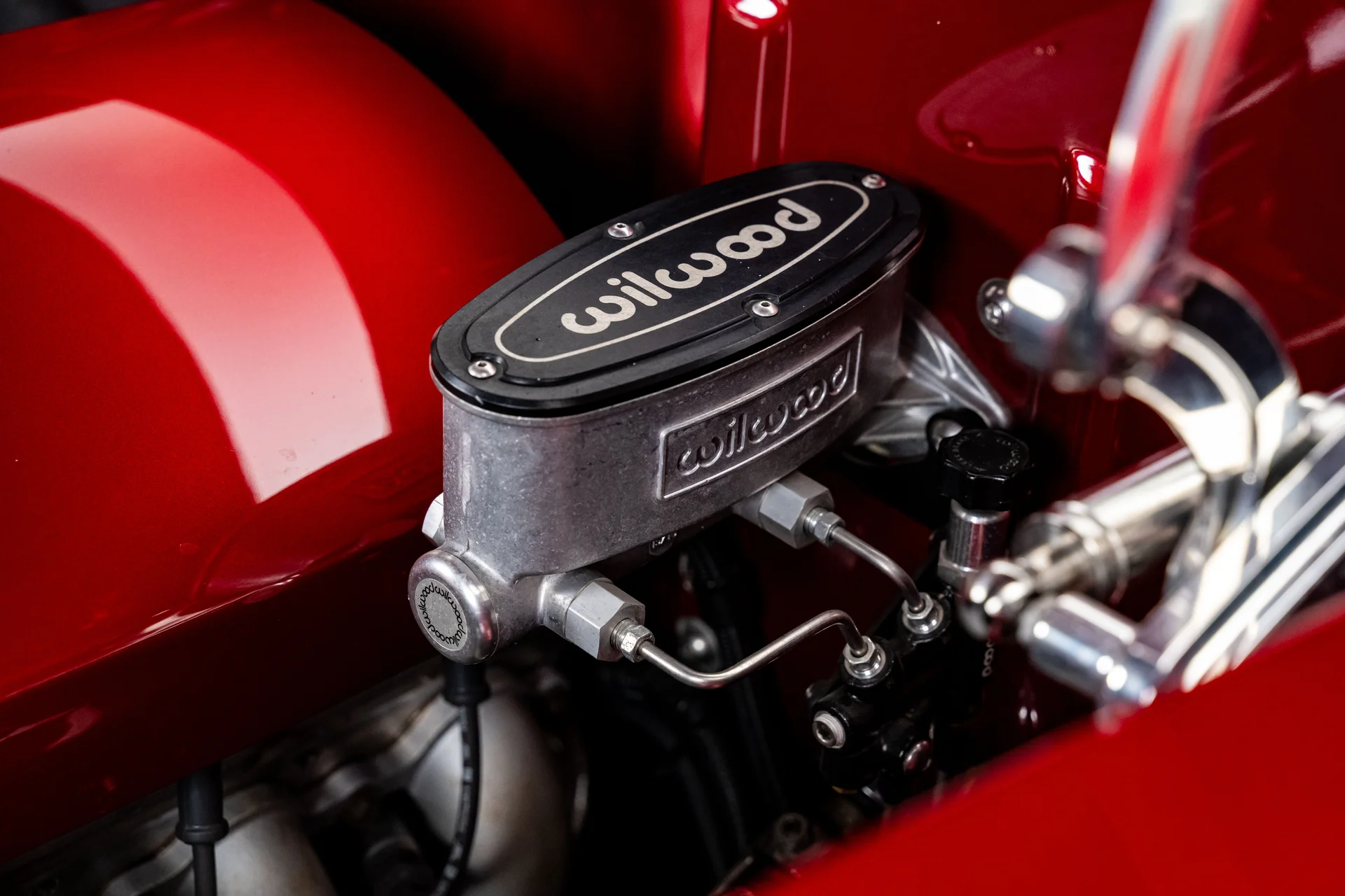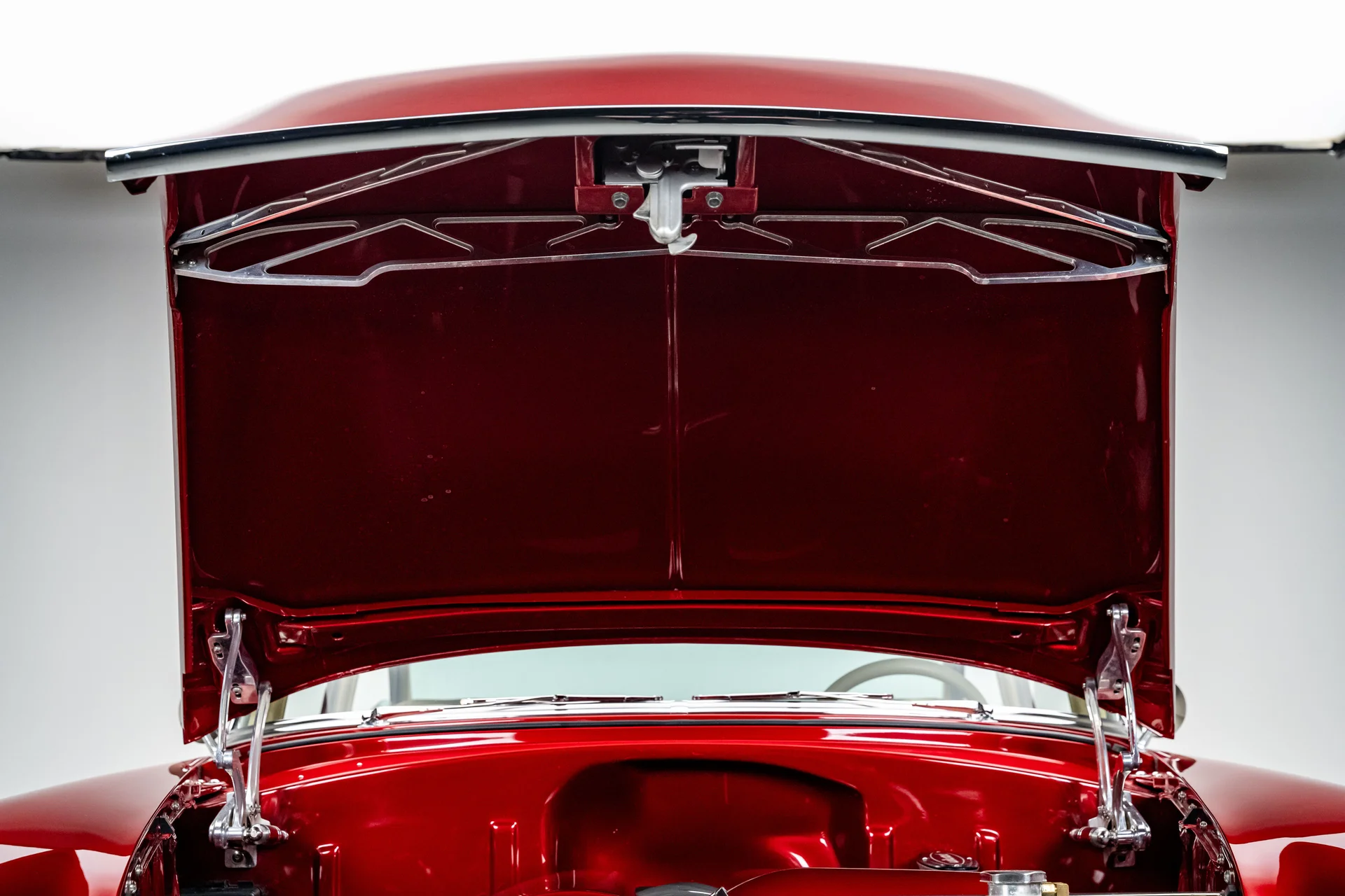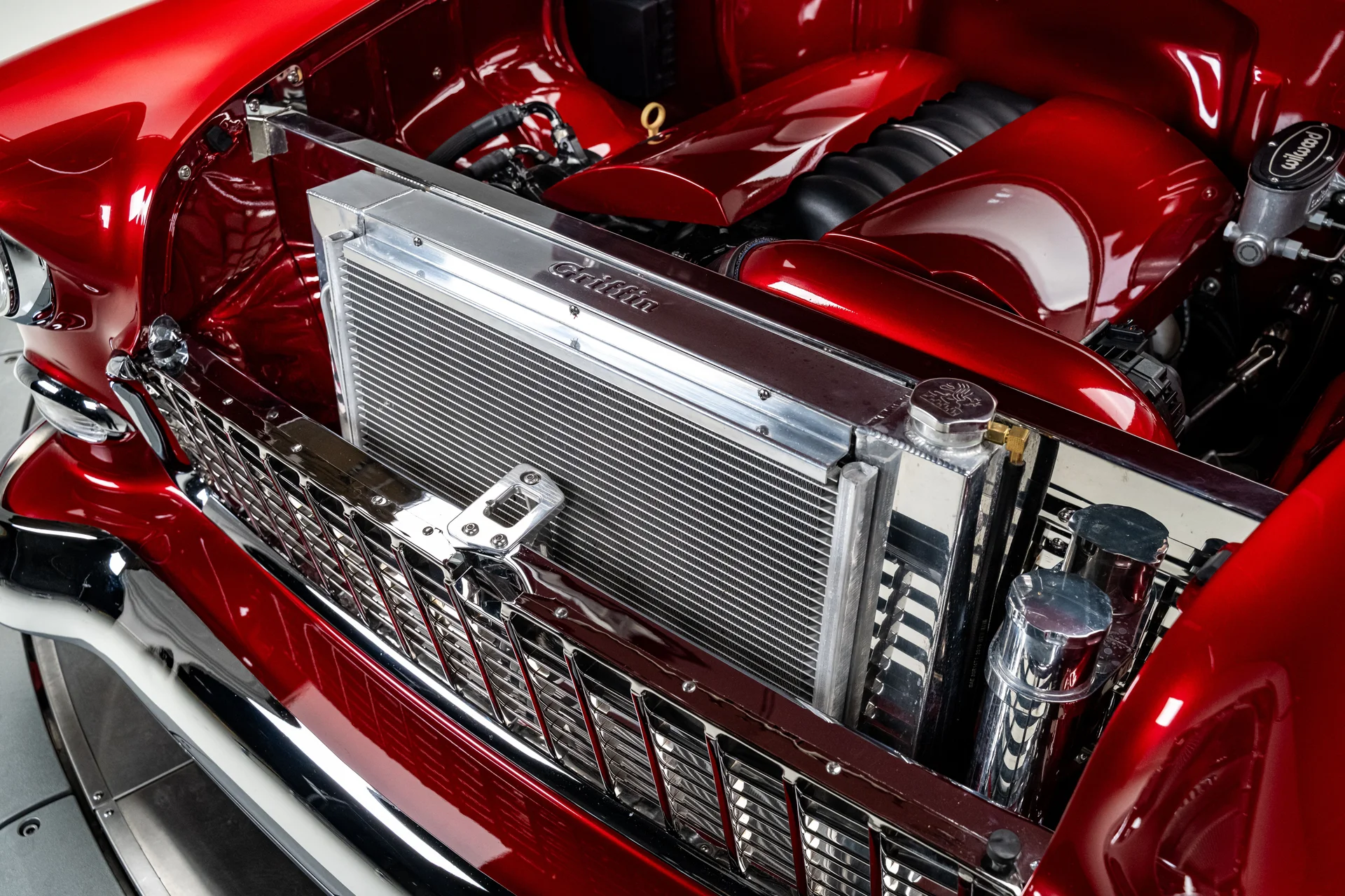 O compartimento do motor revela a verdadeira história. Um Chevrolet Performance LS376/480 ocupa o centro das atenções, um motor novo em folha com um comando de válvulas Hot Cam que o eleva a 495 cavalos de potência sem sacrificar o comportamento dinâmico. As carenagens pintadas integram o conjunto ao exterior, e o sistema de correia serpentina mantém a parte frontal do motor limpa e organizada. Um radiador Griffin polido com grandes ventoinhas SPAL cuida do arrefecimento, e o sistema de freios Wilwood se destaca no painel corta-fogo. Todo o conjunto reside em um compartimento alisado, na cor da carroceria, com suportes do capô em alumínio billet e detalhes polidos que integram o motor de forma harmoniosa.