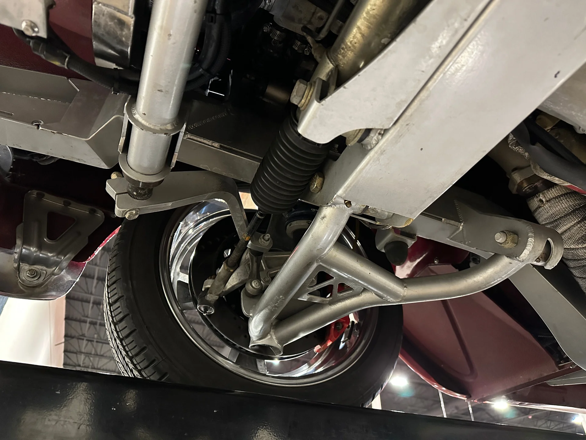 Por baixo, a estrutura original foi substituída por um chassi completo Roadster Shop Fast Track, construído com longarinas reforçadas, cubos e fusos de roda de Corvette, suspensão coilover e um eixo traseiro de quatro barras com diferencial Strange 9″ e bloqueio Positraction. A transmissão automática 4L70E garante a dirigibilidade amigável do carro nas ruas, enquanto a direção hidráulica com pinhão e cremalheira e a barra estabilizadora de 1,25″ proporcionam respostas precisas e previsíveis. A frenagem é feita por discos Wilwood nas quatro rodas com 20 pistões atuando em rotores perfurados e ranhurados, e o escapamento Borla utiliza tubos de aço inoxidável de grande diâmetro para dar ao LS um ronco limpo e agressivo. Tudo isso assenta sobre rodas Coys polidas de 18 polegadas calçadas com pneus Michelin e Nankang, conferindo ao carro uma postura firme que combina com o restante do projeto.