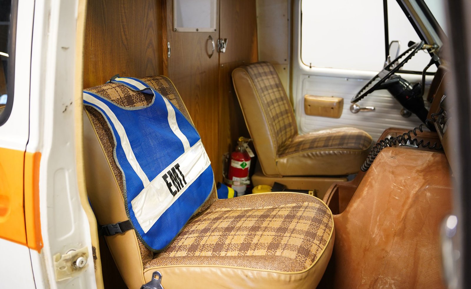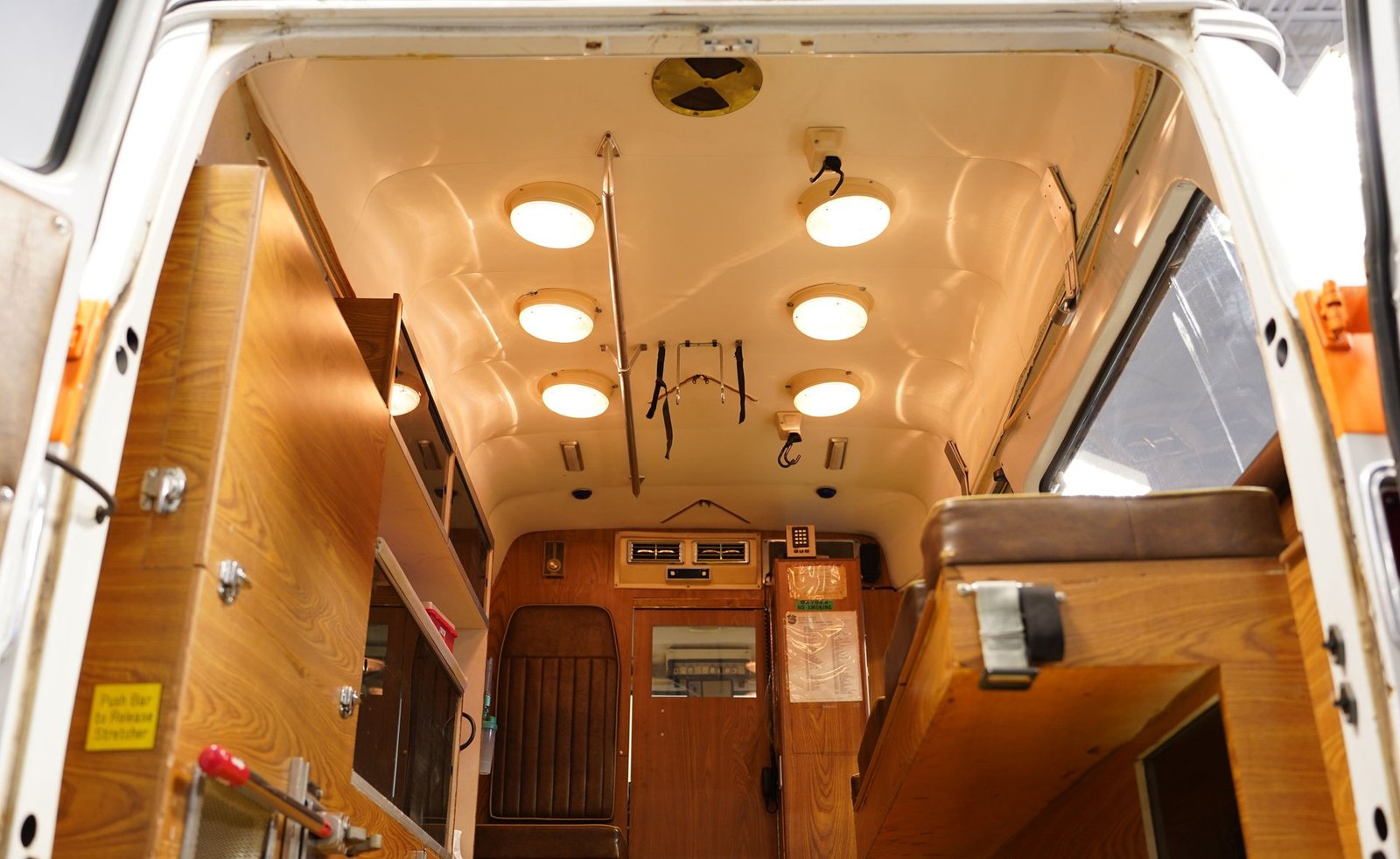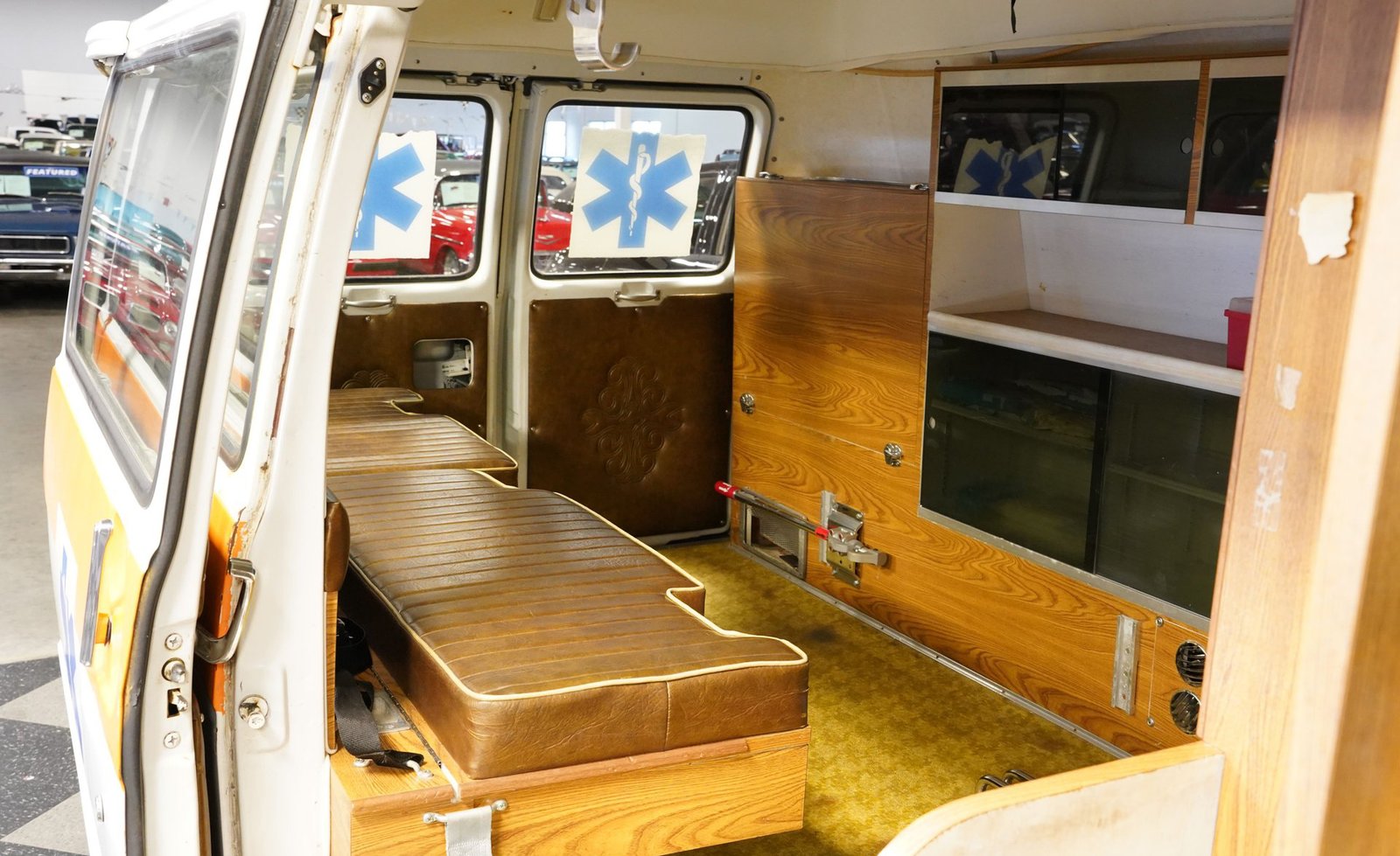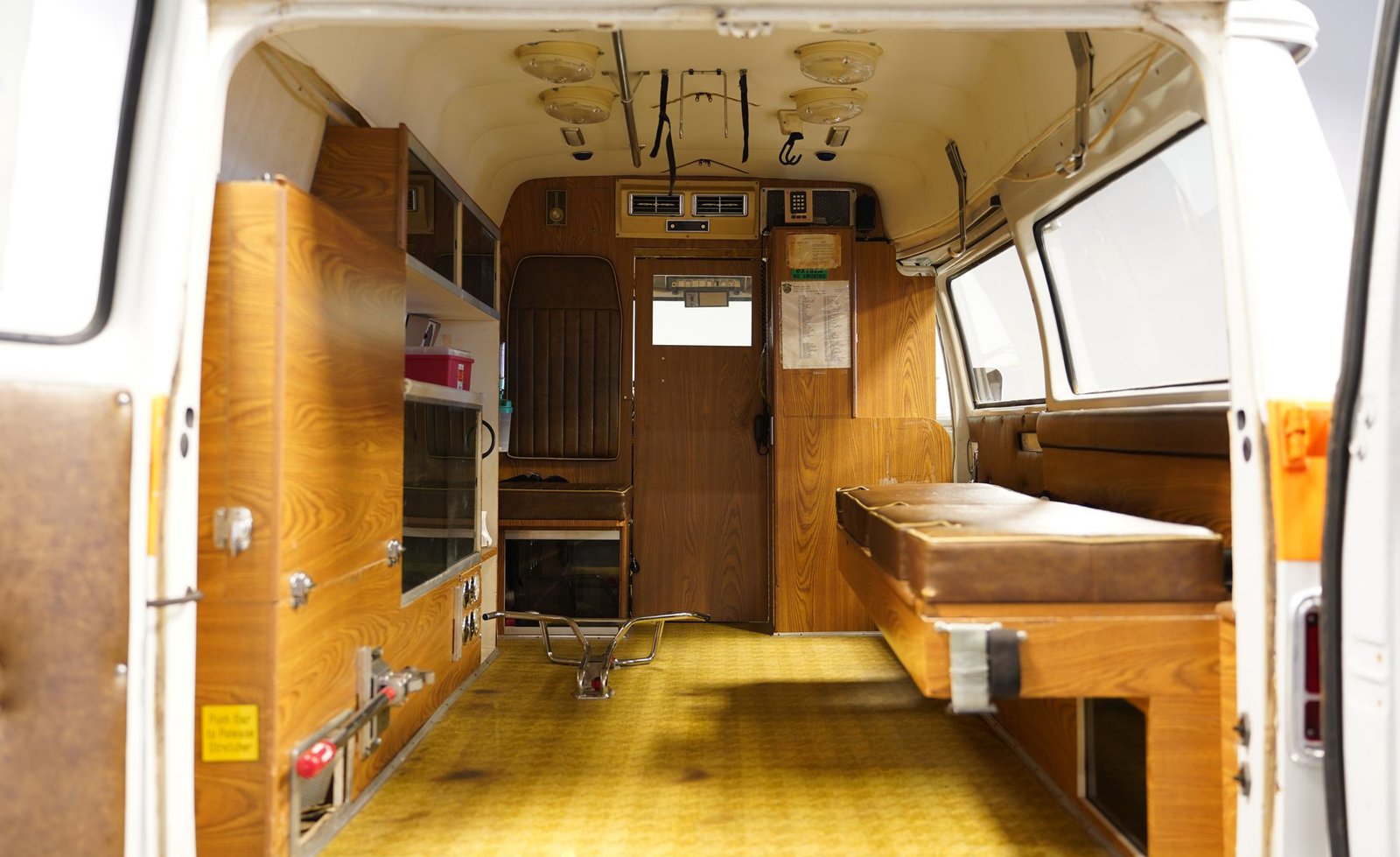 Ao entrar, você descobrirá um interior que o transportará diretamente para o coração da década de 1970. A cabine foi preservada em sua configuração original de ambulância, apresentando autênticos bancos dianteiros, assentos clássicos de vinil para paramédicos na parte traseira e armários para suprimentos de emergência. Iluminação interna, sistemas de oxigênio e cintas de segurança para macas contribuem para a atmosfera fiel à época. O painel ostenta um conjunto de instrumentos de madeira e medidores bem conservados, enquanto o layout e os recursos da cabine a tornam fascinante e funcional.