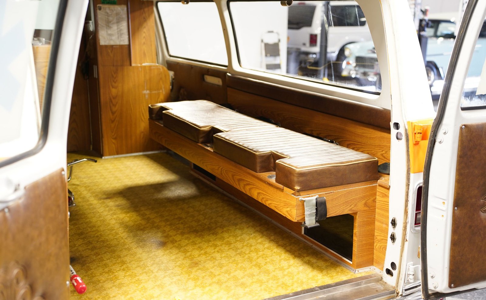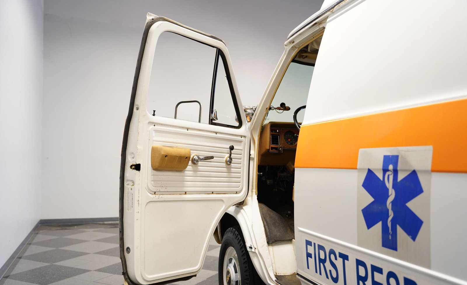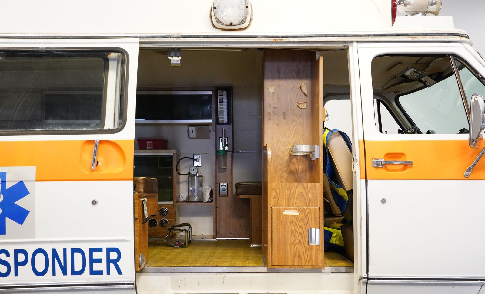 Ao entrar, você descobrirá um interior que o transportará diretamente para o coração da década de 1970. A cabine foi preservada em sua configuração original de ambulância, apresentando autênticos bancos dianteiros, assentos clássicos de vinil para paramédicos na parte traseira e armários para suprimentos de emergência. Iluminação interna, sistemas de oxigênio e cintas de segurança para macas contribuem para a atmosfera fiel à época. O painel ostenta um conjunto de instrumentos de madeira e medidores bem conservados, enquanto o layout e os recursos da cabine a tornam fascinante e funcional.