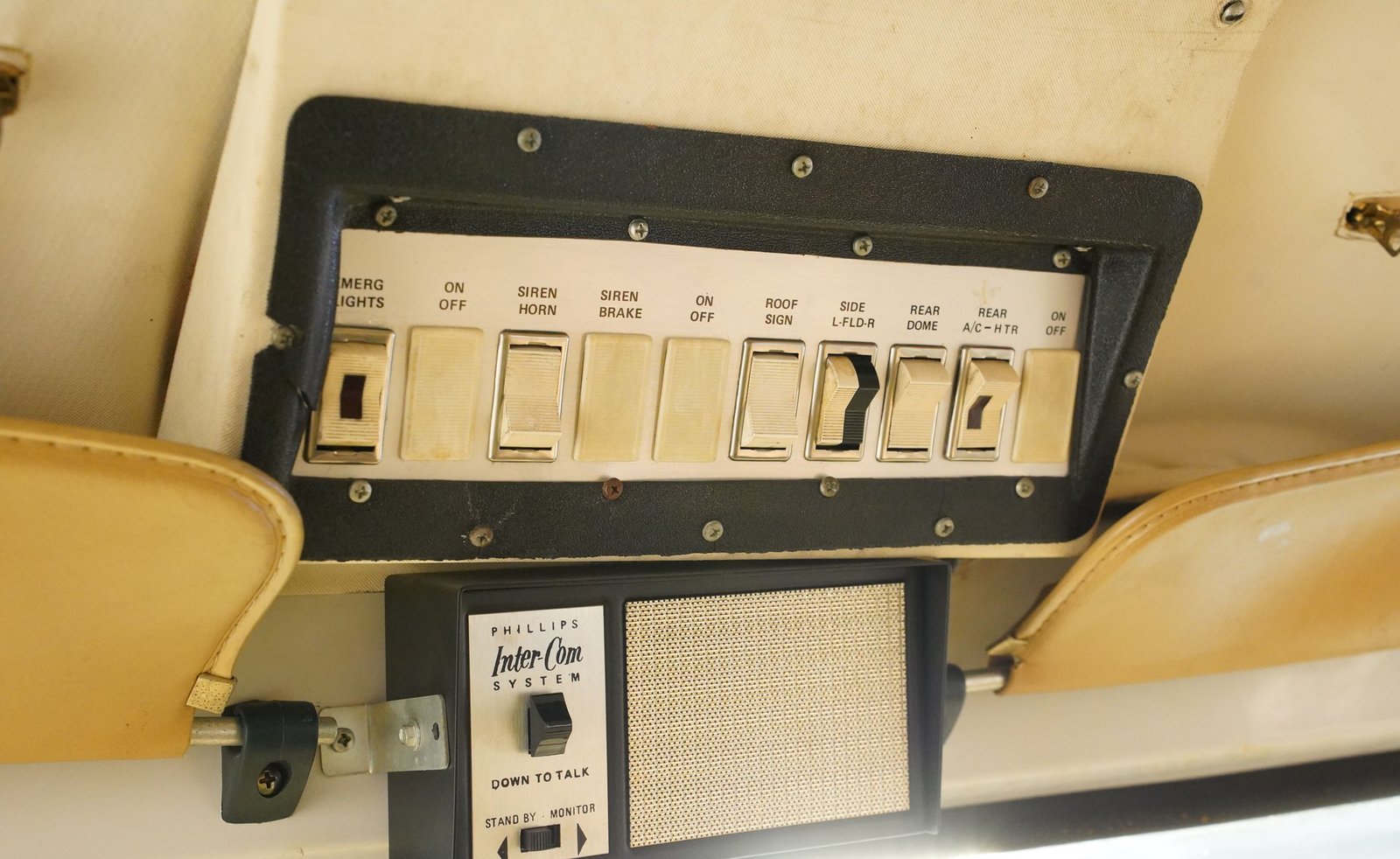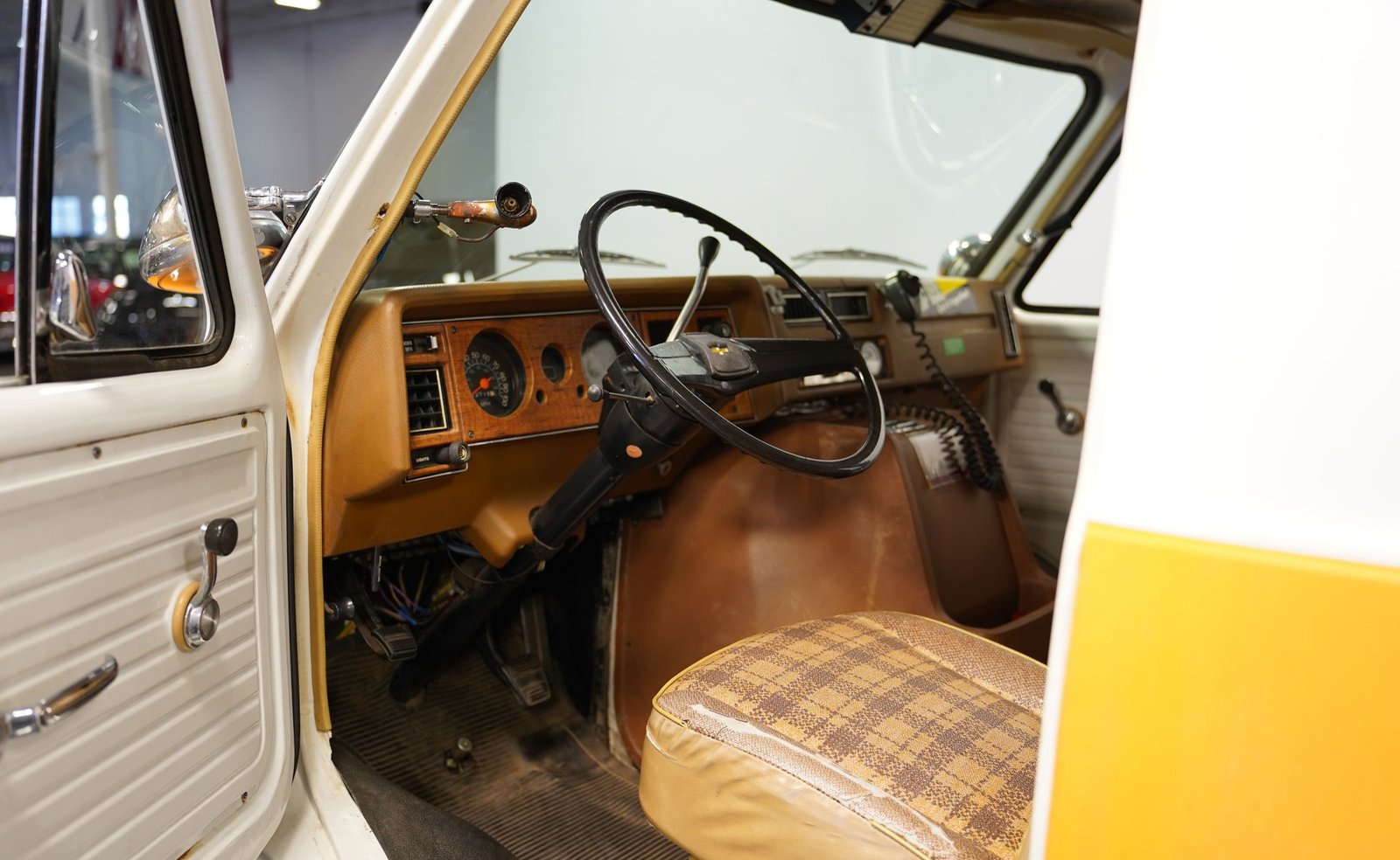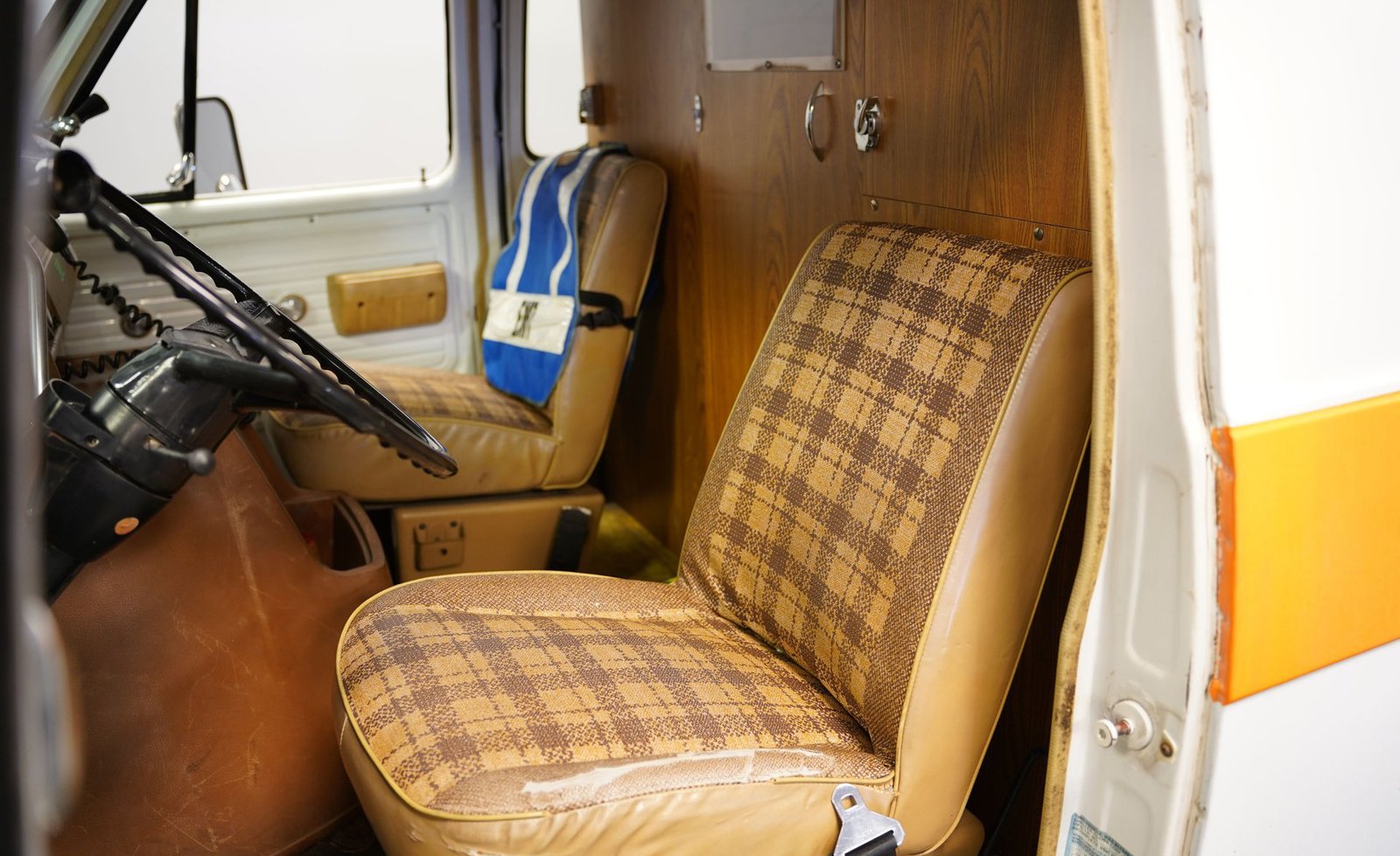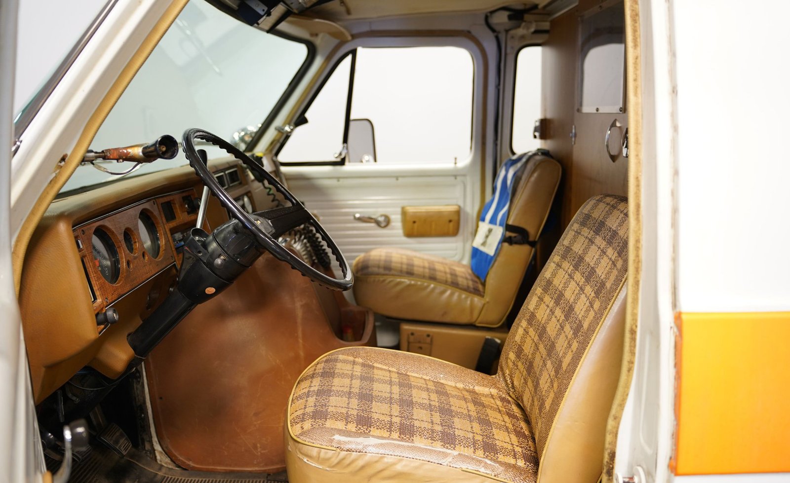 Ao entrar, você descobrirá um interior que o transportará diretamente para o coração da década de 1970. A cabine foi preservada em sua configuração original de ambulância, apresentando autênticos bancos dianteiros, assentos clássicos de vinil para paramédicos na parte traseira e armários para suprimentos de emergência. Iluminação interna, sistemas de oxigênio e cintas de segurança para macas contribuem para a atmosfera fiel à época. O painel ostenta um conjunto de instrumentos de madeira e medidores bem conservados, enquanto o layout e os recursos da cabine a tornam fascinante e funcional.