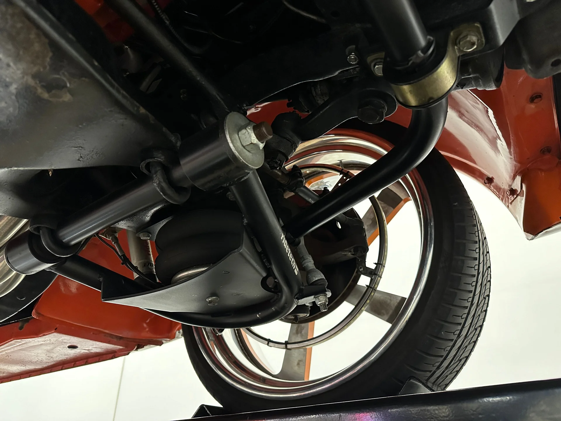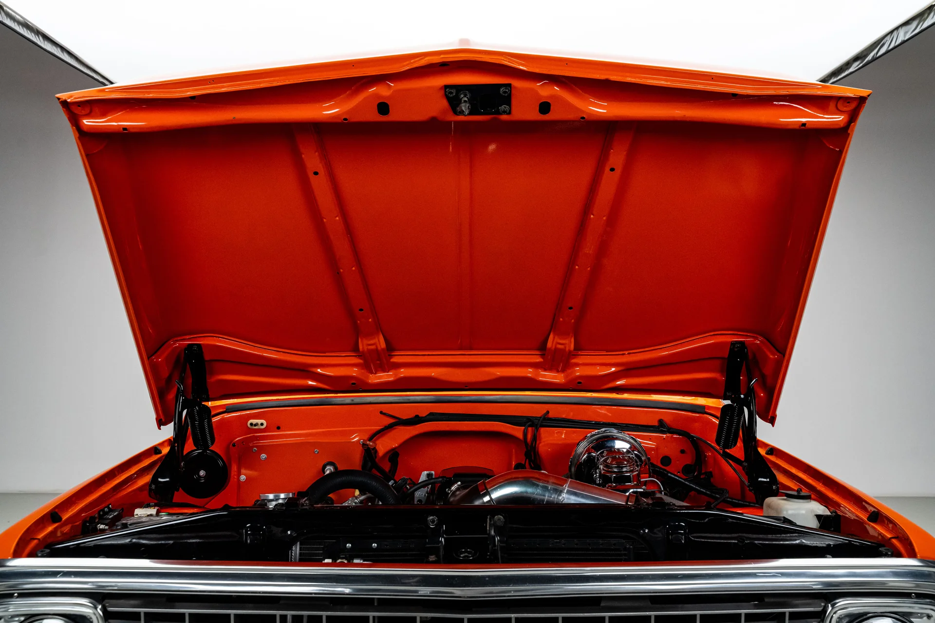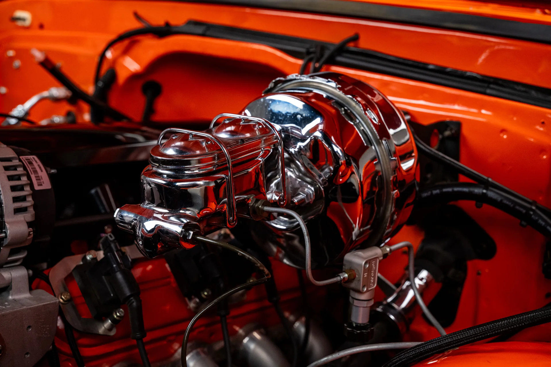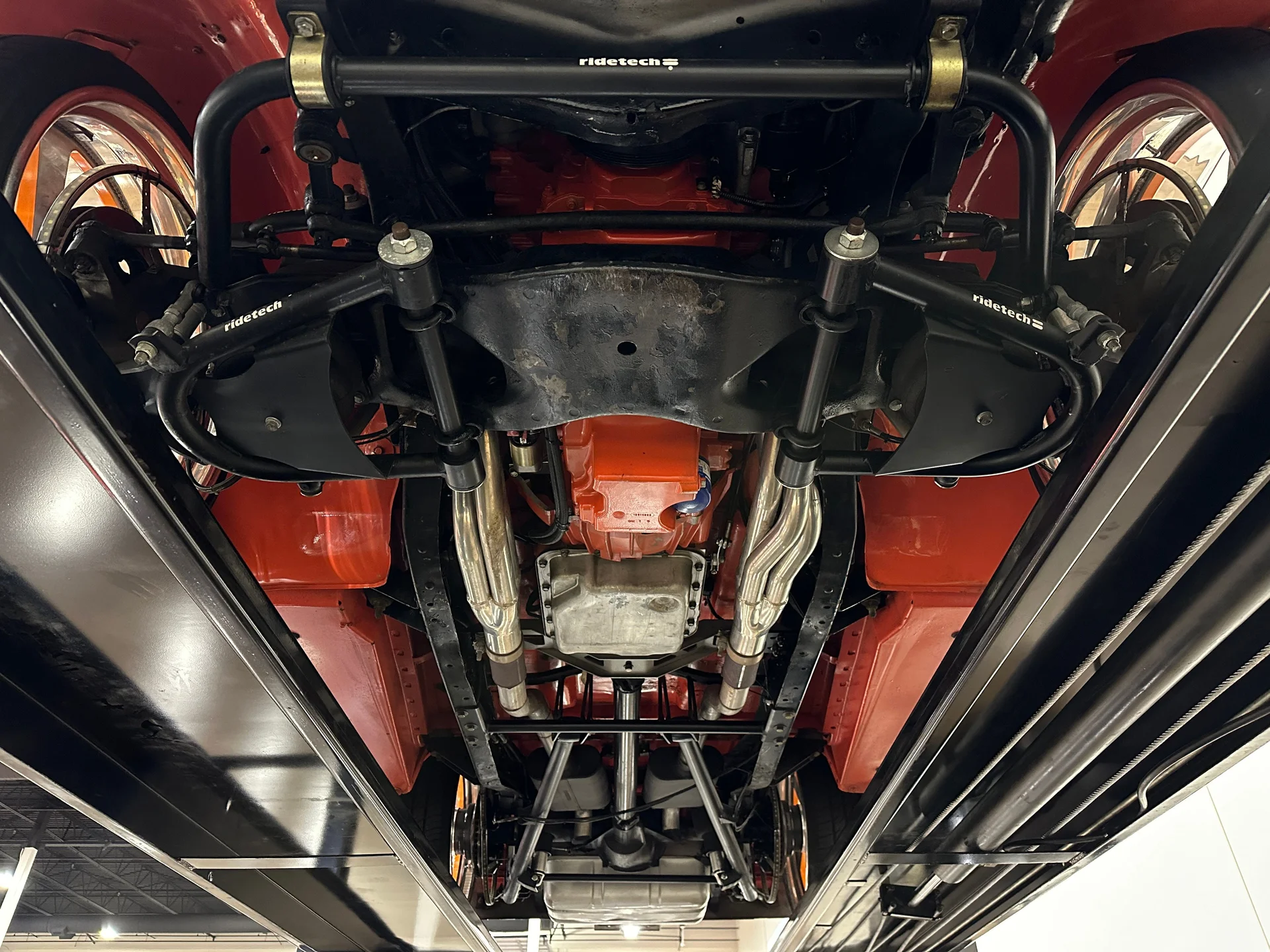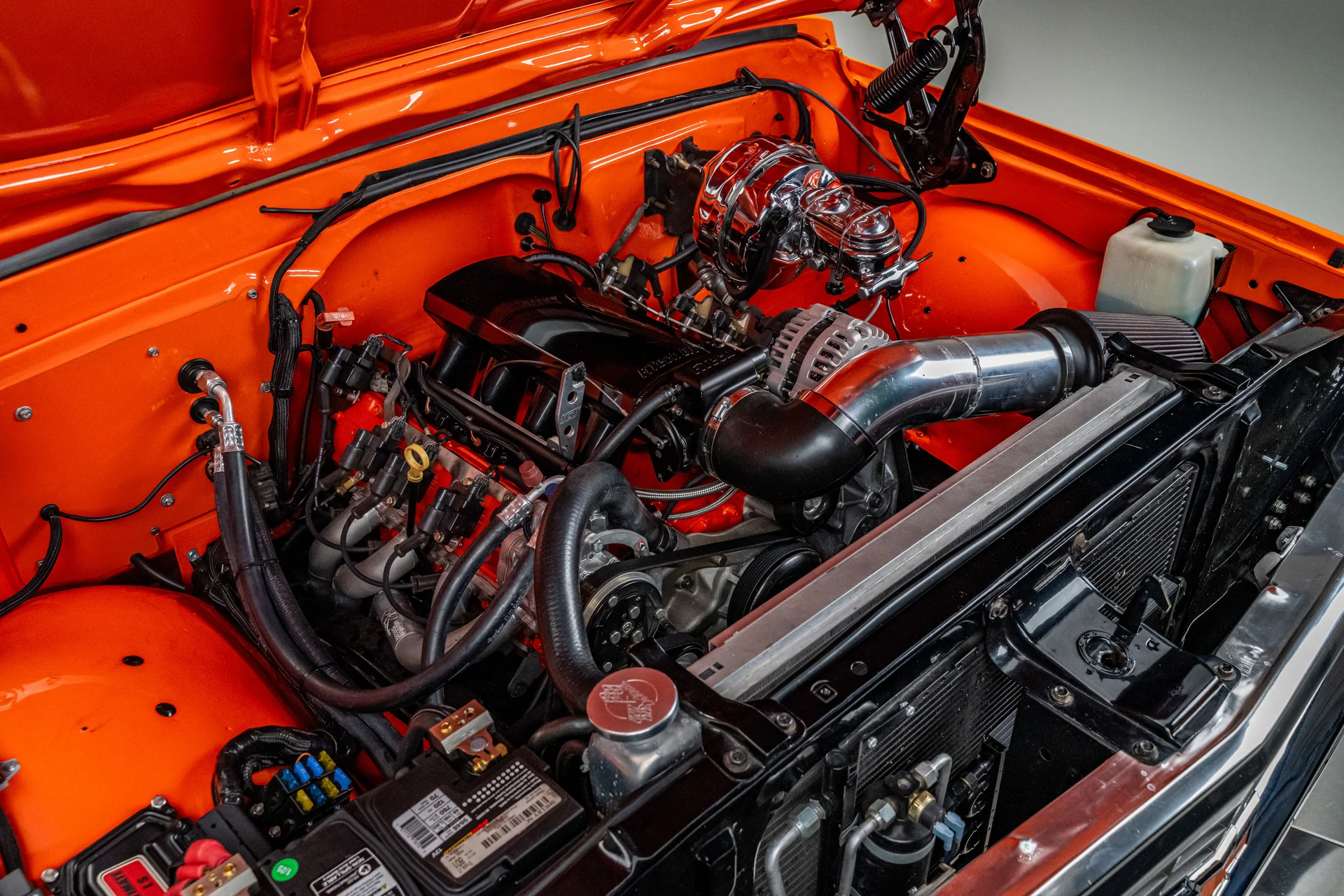 Sob o capô, um motor LS V8 de alumínio de 6,0 litros oferece confiabilidade moderna e um desempenho impressionante. Usinado e construído em 2025, o motor foi totalmente refeito com novos componentes internos e um comando de válvulas de alto desempenho Cam Motion Titan II, e pintado na cor Laranja Chevrolet para combinar com a apresentação impecável da picape. Ele é equipado com cabeçotes de alumínio GM 706 e um sistema de injeção eletrônica FiTech com coletor de admissão e corpo de borboleta de 102 mm, proporcionando resposta instantânea do acelerador e uma faixa de potência forte e rica em torque. Coletores de escape de longo curso alimentam um sistema de escapamento duplo Flowmaster, dando ao LS um ronco grave e encorpado que chama a atenção antes mesmo da picape aparecer. A potência é transmitida por uma transmissão automática 4L60E para um eixo traseiro de 10 parafusos com relação de 3,42. Na parte inferior, braços de controle dianteiros e barra estabilizadora Ridetech aprimoram a dirigibilidade, mantendo o conforto ao dirigir. A direção hidráulica e os freios a disco Wilwood nas quatro rodas com rotores ranhurados mantêm o veículo estável, e um radiador de alumínio com duas ventoinhas elétricas cuida do resfriamento com facilidade.