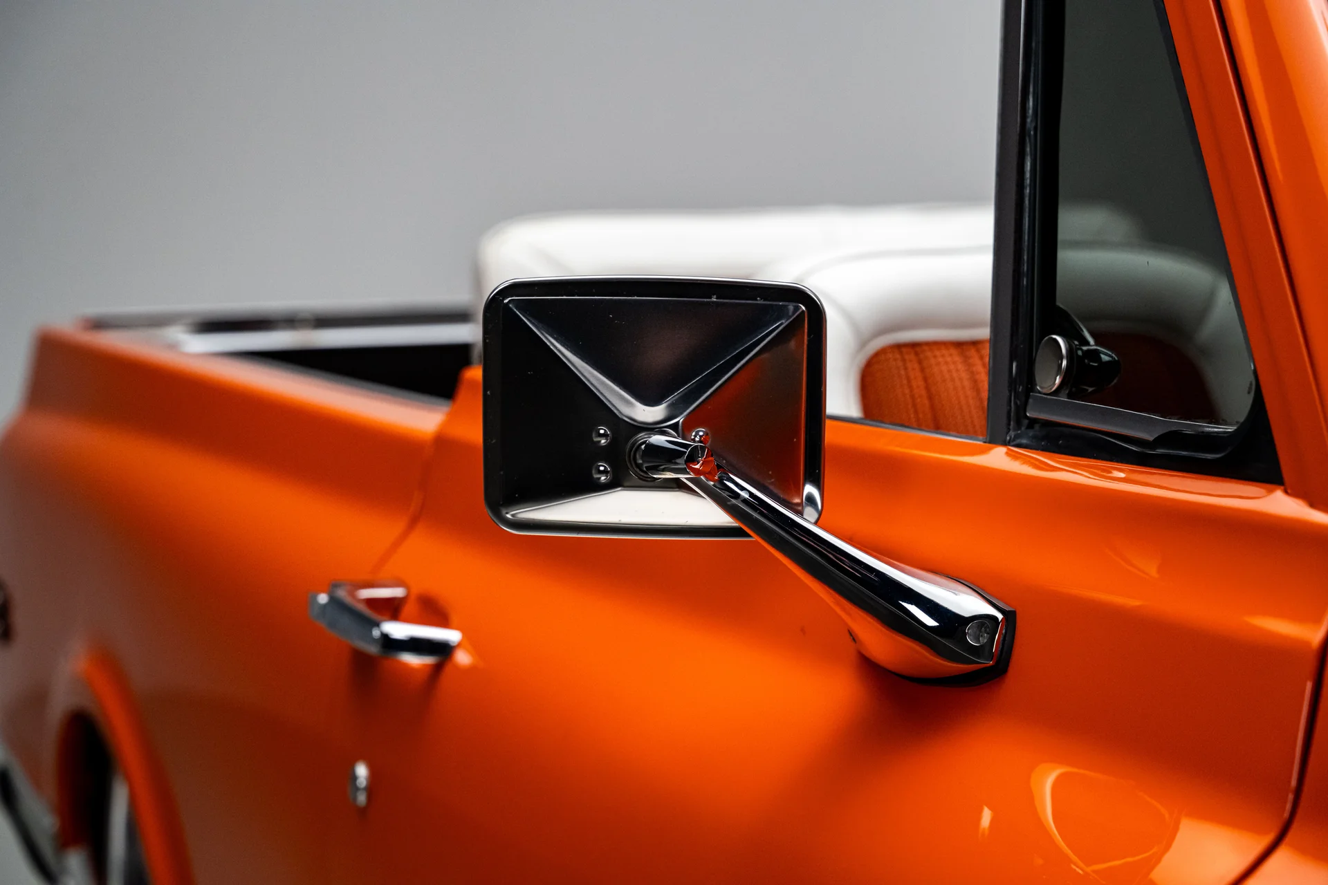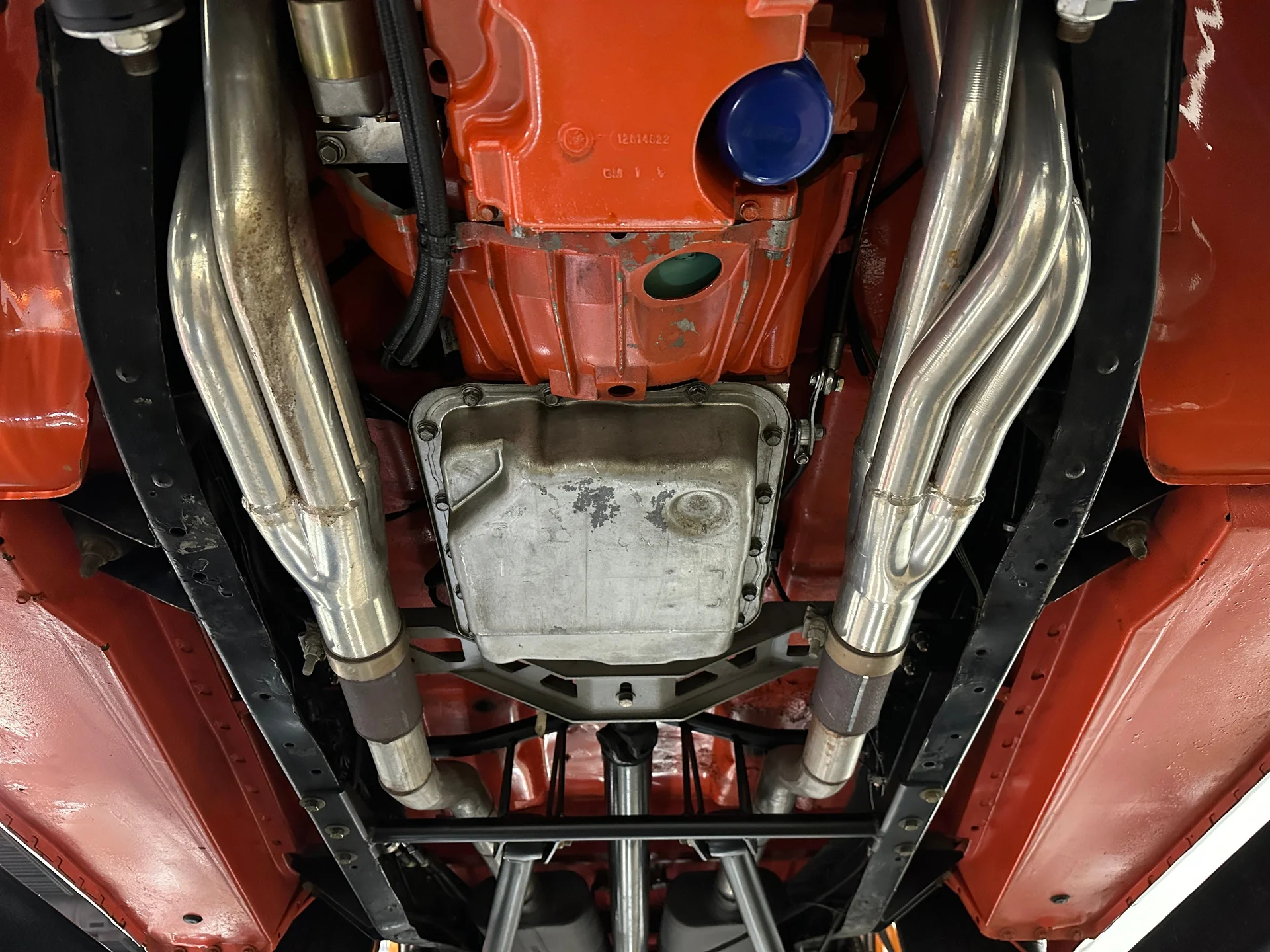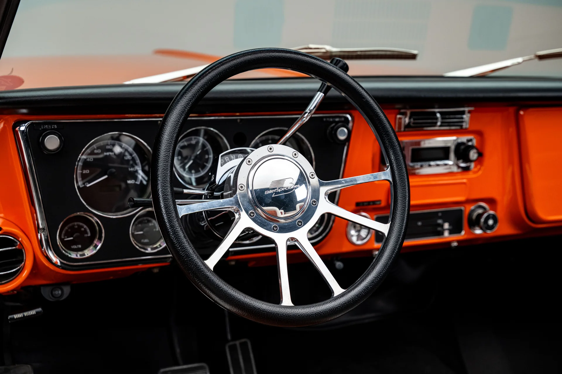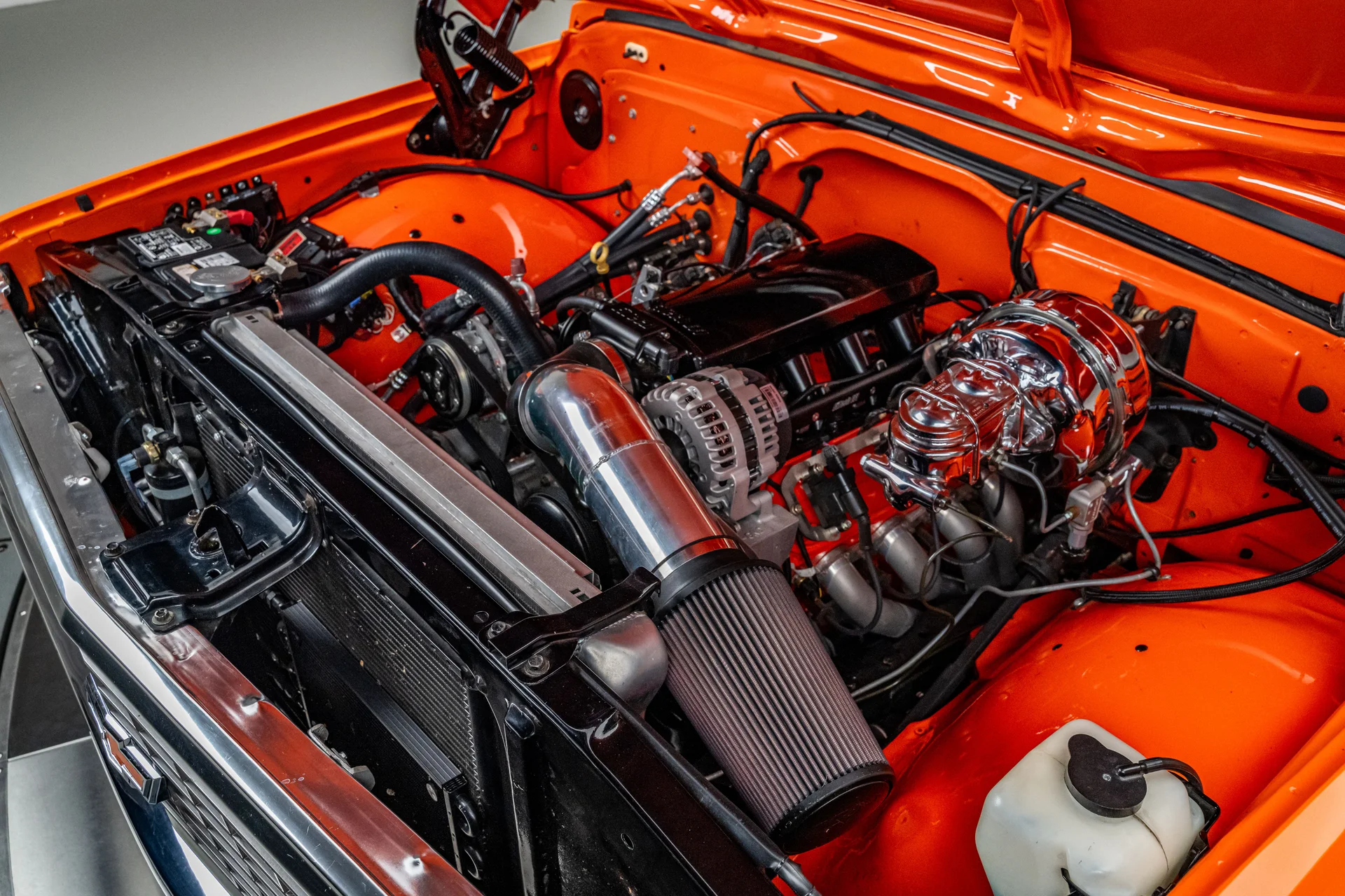 Sob o capô, um motor LS V8 de alumínio de 6,0 litros oferece confiabilidade moderna e um desempenho impressionante. Usinado e construído em 2025, o motor foi totalmente refeito com novos componentes internos e um comando de válvulas de alto desempenho Cam Motion Titan II, e pintado na cor Laranja Chevrolet para combinar com a apresentação impecável da picape. Ele é equipado com cabeçotes de alumínio GM 706 e um sistema de injeção eletrônica FiTech com coletor de admissão e corpo de borboleta de 102 mm, proporcionando resposta instantânea do acelerador e uma faixa de potência forte e rica em torque. Coletores de escape de longo curso alimentam um sistema de escapamento duplo Flowmaster, dando ao LS um ronco grave e encorpado que chama a atenção antes mesmo da picape aparecer. A potência é transmitida por uma transmissão automática 4L60E para um eixo traseiro de 10 parafusos com relação de 3,42. Na parte inferior, braços de controle dianteiros e barra estabilizadora Ridetech aprimoram a dirigibilidade, mantendo o conforto ao dirigir. A direção hidráulica e os freios a disco Wilwood nas quatro rodas com rotores ranhurados mantêm o veículo estável, e um radiador de alumínio com duas ventoinhas elétricas cuida do resfriamento com facilidade.