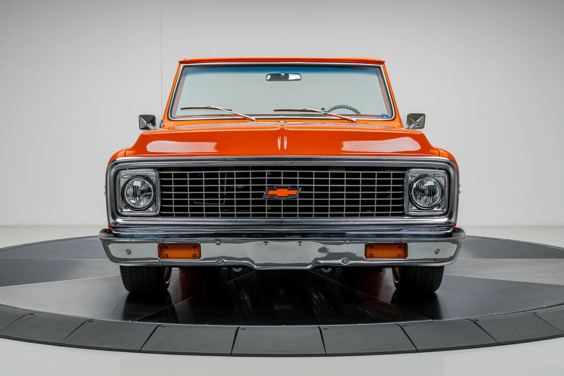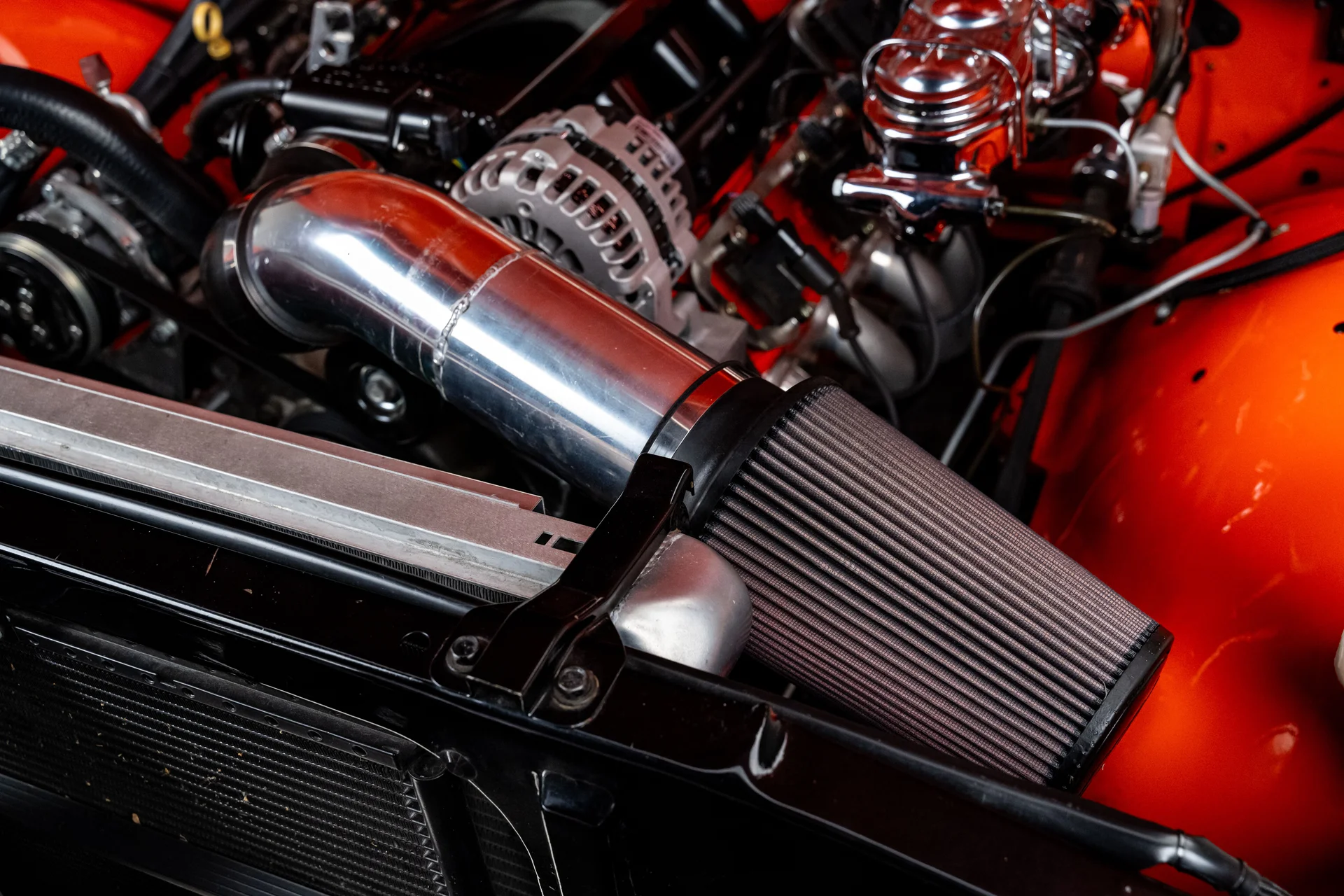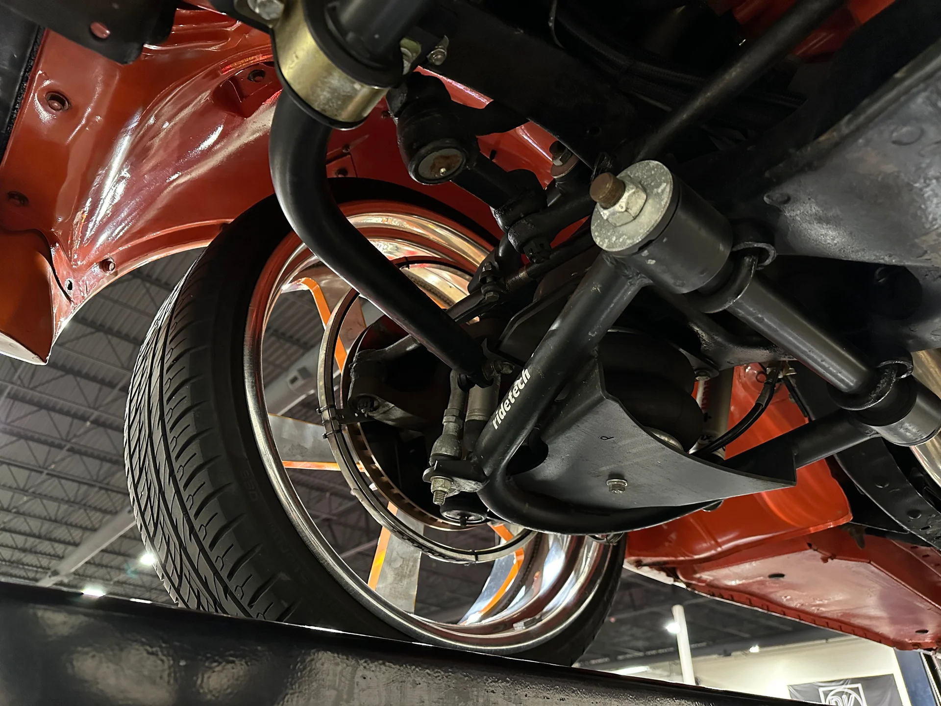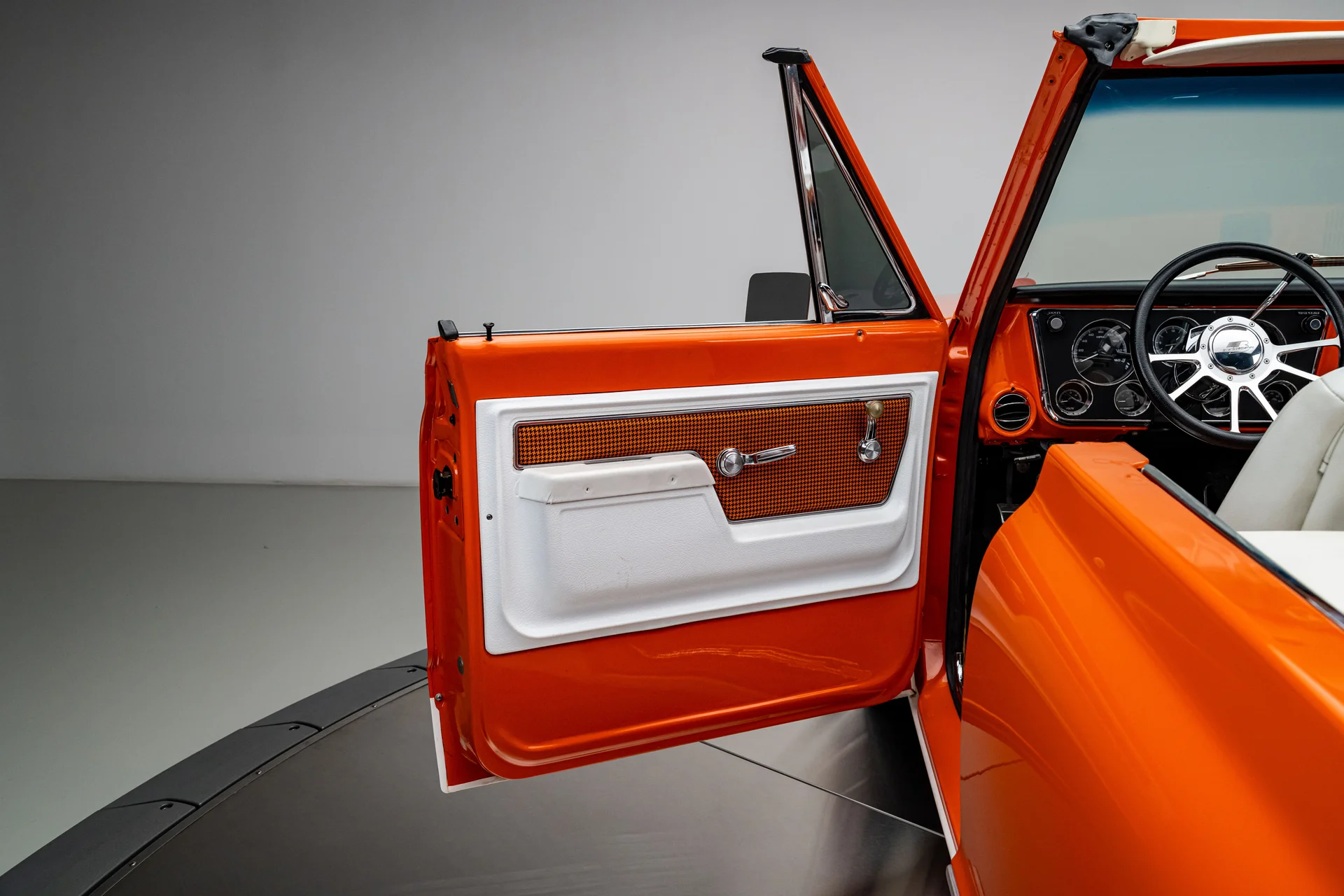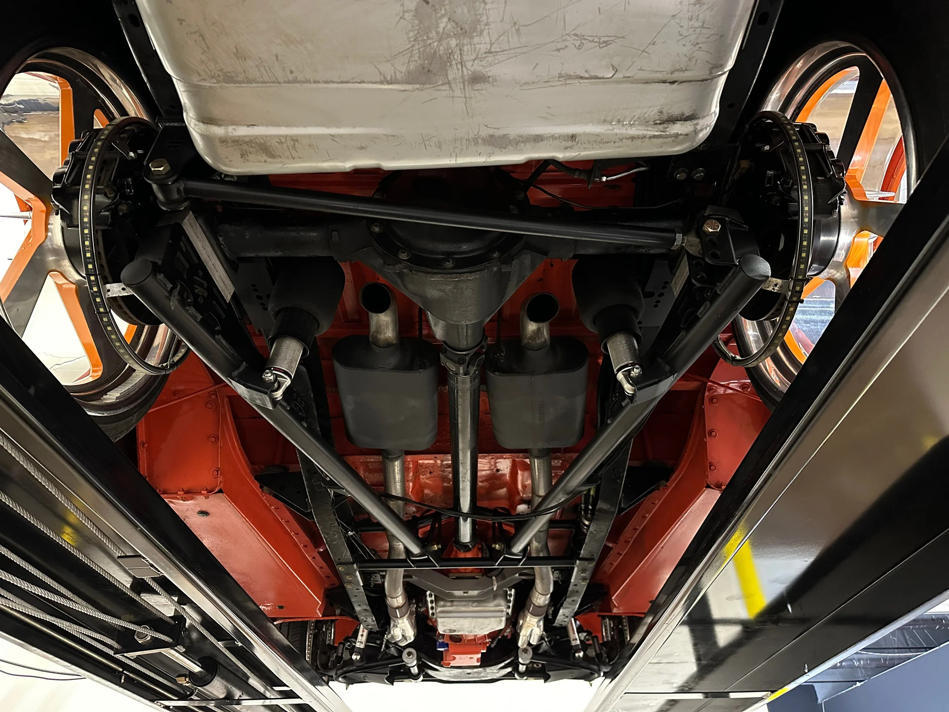 Sob o capô, um motor LS V8 de alumínio de 6,0 litros oferece confiabilidade moderna e um desempenho impressionante. Usinado e construído em 2025, o motor foi totalmente refeito com novos componentes internos e um comando de válvulas de alto desempenho Cam Motion Titan II, e pintado na cor Laranja Chevrolet para combinar com a apresentação impecável da picape. Ele é equipado com cabeçotes de alumínio GM 706 e um sistema de injeção eletrônica FiTech com coletor de admissão e corpo de borboleta de 102 mm, proporcionando resposta instantânea do acelerador e uma faixa de potência forte e rica em torque. Coletores de escape de longo curso alimentam um sistema de escapamento duplo Flowmaster, dando ao LS um ronco grave e encorpado que chama a atenção antes mesmo da picape aparecer. A potência é transmitida por uma transmissão automática 4L60E para um eixo traseiro de 10 parafusos com relação de 3,42. Na parte inferior, braços de controle dianteiros e barra estabilizadora Ridetech aprimoram a dirigibilidade, mantendo o conforto ao dirigir. A direção hidráulica e os freios a disco Wilwood nas quatro rodas com rotores ranhurados mantêm o veículo estável, e um radiador de alumínio com duas ventoinhas elétricas cuida do resfriamento com facilidade.