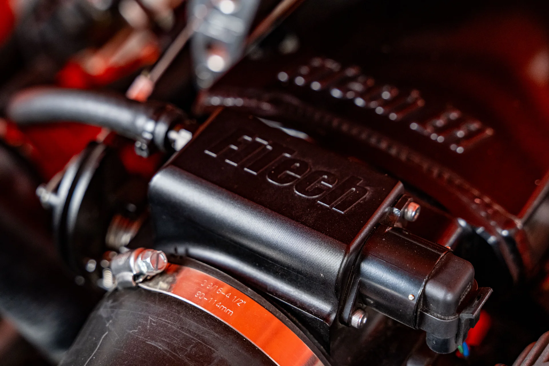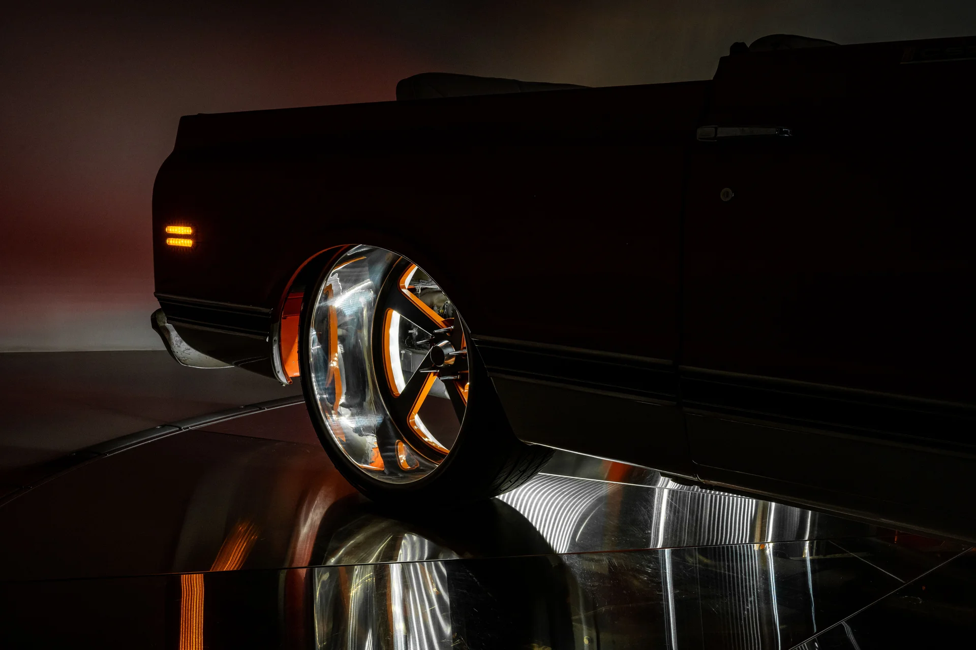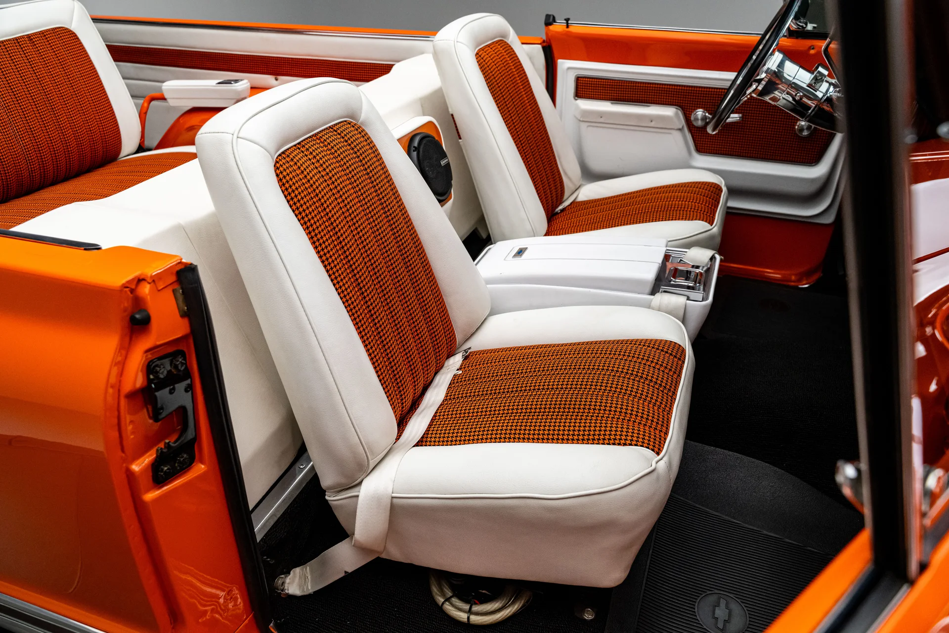 A carroceria mantém todas as linhas familiares do SUV de primeira geração da Chevrolet, mas a apresentação é de uma verdadeira obra de arte personalizada. O acabamento bicolor brilha com reflexos profundos e apresenta detalhes modernos, como faróis, lanternas traseiras e indicadores de direção em LED, que realçam seu perfil clássico. O emblema laranja da Chevrolet na grade frontal completa o conjunto, cercado por acabamentos polidos, encaixes precisos dos painéis e bordas suavizadas que destacam o design limpo. Cada painel foi alinhado e finalizado com um padrão excepcional, conferindo à picape uma aparência impecável, como se tivesse acabado de sair da fábrica, mas ainda assim transmitindo uma sensação totalmente exclusiva. Remova o teto rígido incluso, acione os comandos e a suspensão a ar Ridetech RidePRO X-HP acomoda o Blazer sobre suas rodas Intro de 24 polegadas com detalhes pintados de laranja e borda polida. O sistema pode ser gerenciado pelo módulo Power Port na cabine ou diretamente por um aplicativo de smartphone, oferecendo controle preciso da direção e configurações predefinidas programáveis que permitem que a picape deslize pelo trânsito ou se acomode para uma exibição de estilo.