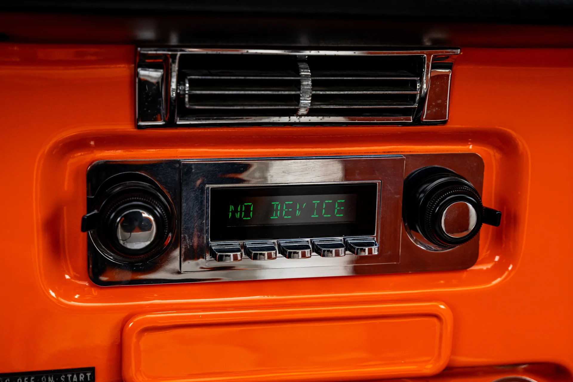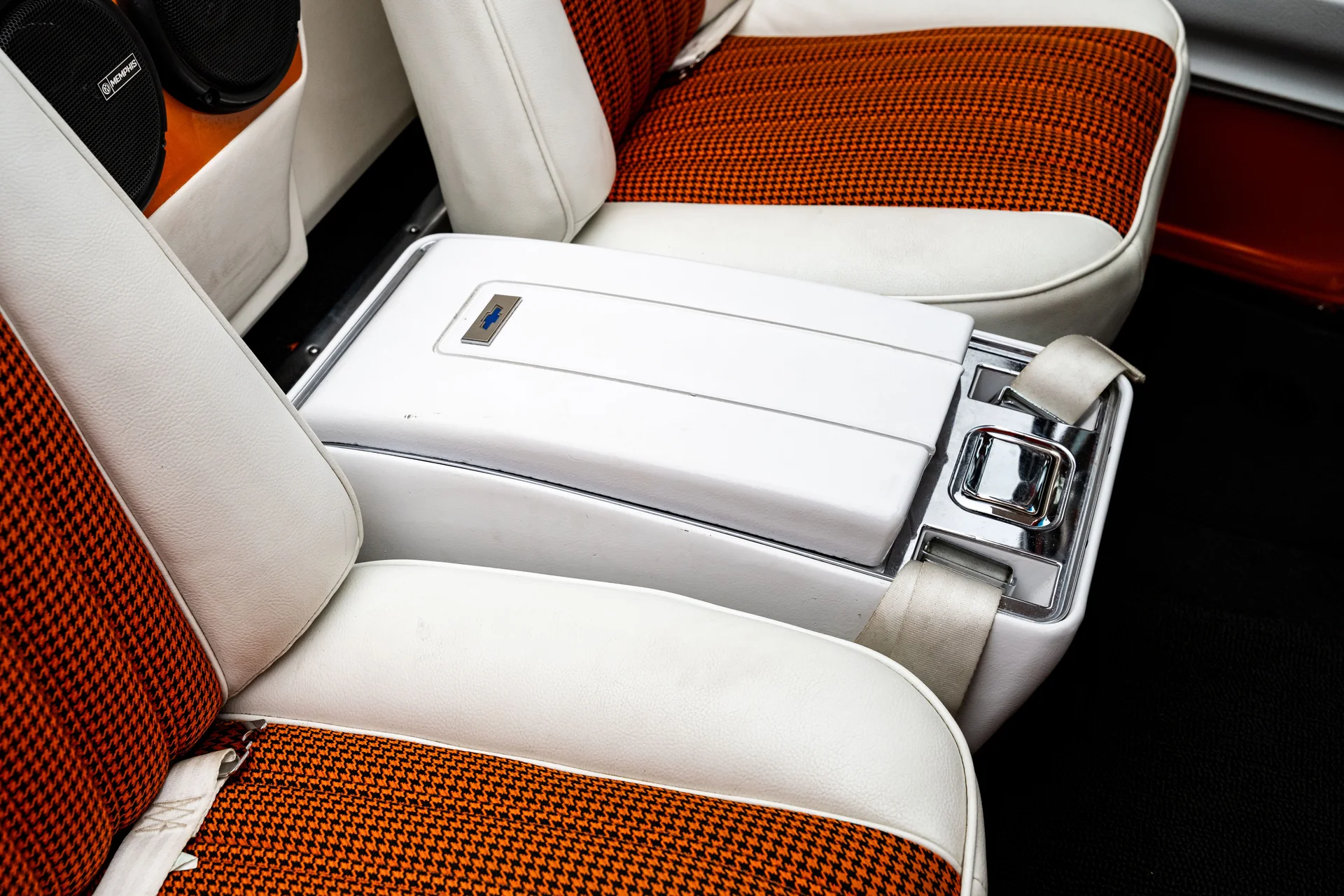 Por dentro, o Blazer acerta em cheio na mistura de estilo vintage com personalização moderna. O estofamento em vinil branco com detalhes em pied-de-poule laranja e preto se estende dos bancos dianteiros até o banco traseiro combinando, criando um visual coeso que remete ao clássico acabamento CST da Chevrolet. Atrás do banco traseiro, encontra-se um compartimento personalizado para o sistema de ar comprimido e compressor da Ridetech, com o mesmo cuidado nos detalhes do restante do interior. O ar-condicionado moderno com controles da Vintage Air mantém a cabine fresca e confortável, tornando o Blazer tão prazeroso de dirigir quanto de admirar. O sistema de áudio, por si só, poderia ser a atração principal de um show. Uma unidade principal RetroSound com Bluetooth alimenta oito alto-falantes Memphis Audio para médios e agudos, enquanto um amplificador DS18 de 6000 watts alimenta um par de subwoofers DS18 de 15 polegadas montados em uma caixa dutada personalizada. O resultado são agudos nítidos e claros e graves profundos e potentes que preenchem a cabine aberta com clareza e impacto. Detalhes cromados, carpete preto impecável e instrumentos digitais Dakota completam o espaço, conferindo-lhe um ambiente moderno e vibrante que combina com a postura e o som da caminhonete.