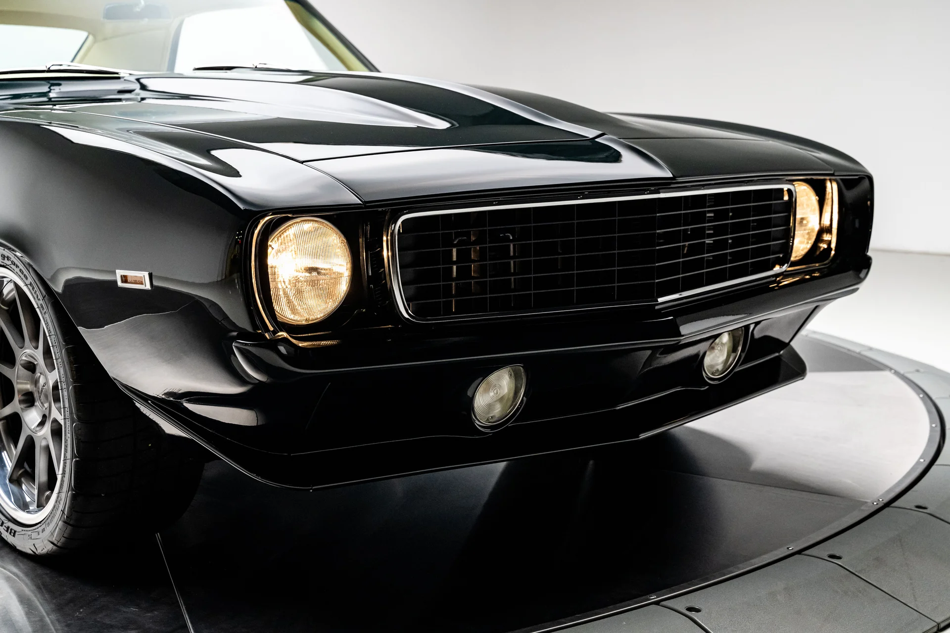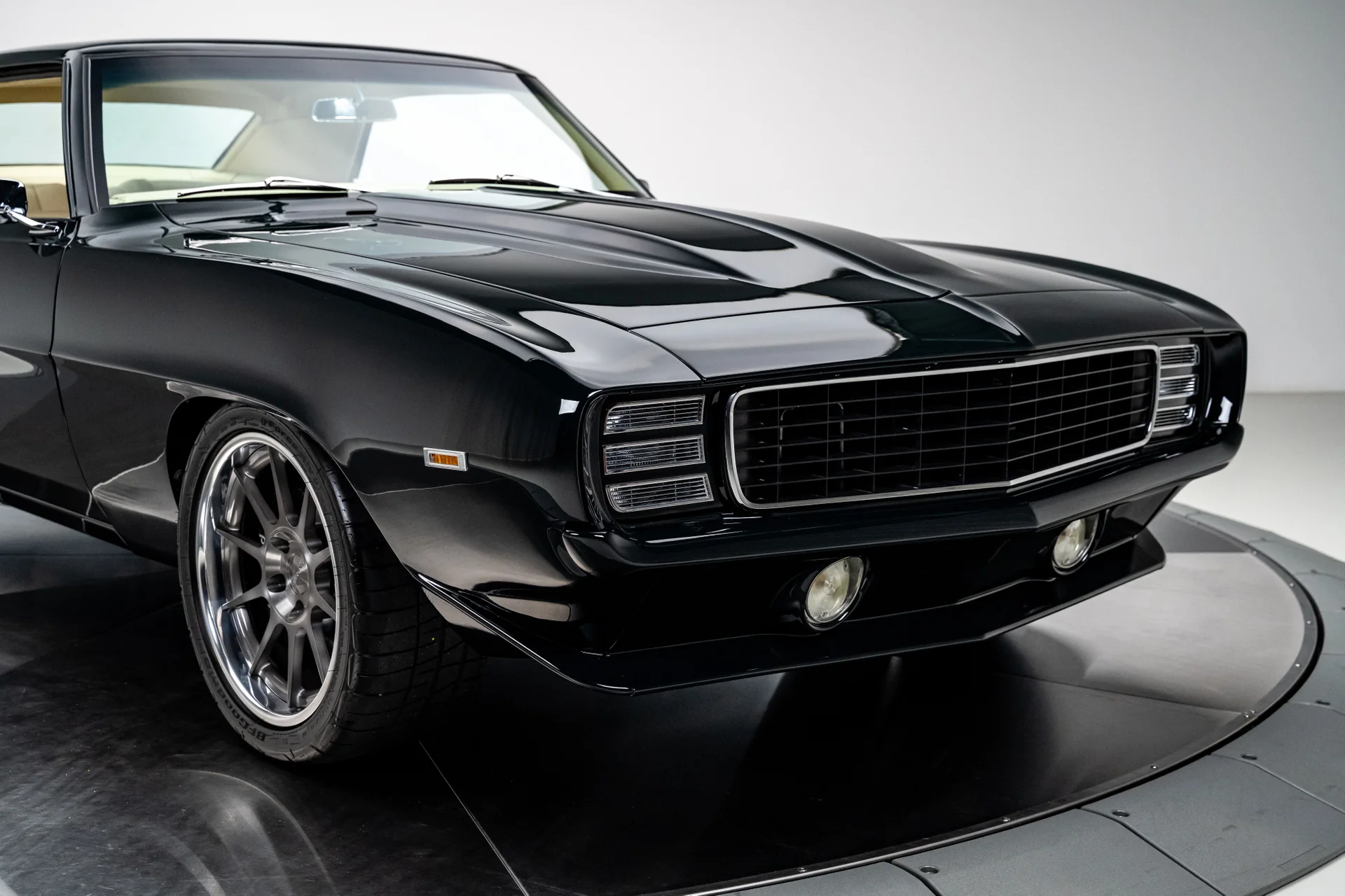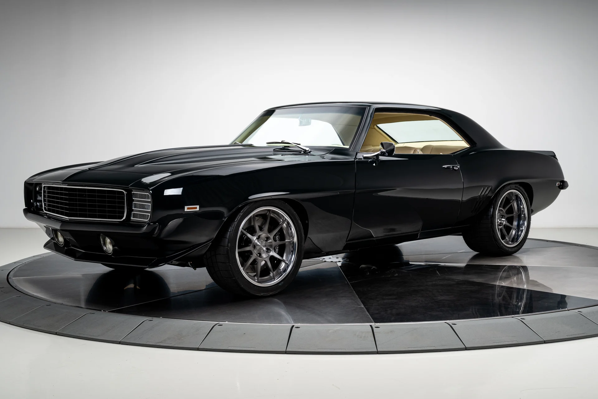 Este Chevrolet Camaro de 1969 é o resultado de um projeto de vários anos, sem poupar despesas, que transformou um dos muscle cars mais icônicos da época em uma refinada máquina pro-touring. Com acabamento em um verde escuro profundo que pode parecer quase preto sob certas luzes, ele combina as linhas inconfundíveis de um Camaro de 1969 com o desempenho e o conforto de um carro esportivo moderno. O resultado é um carro que parece ameaçador parado e transmite uma sensação de compostura na estrada.