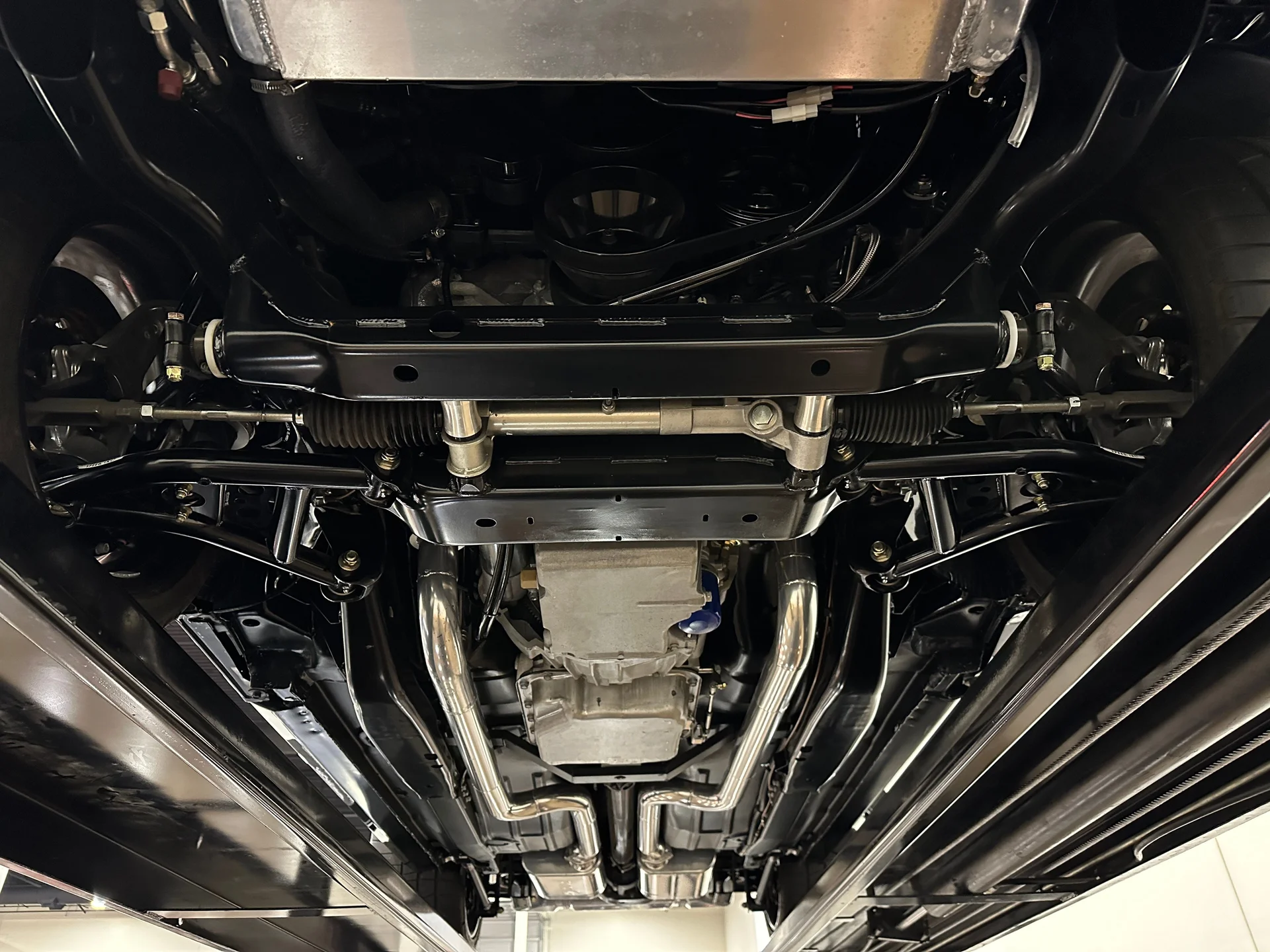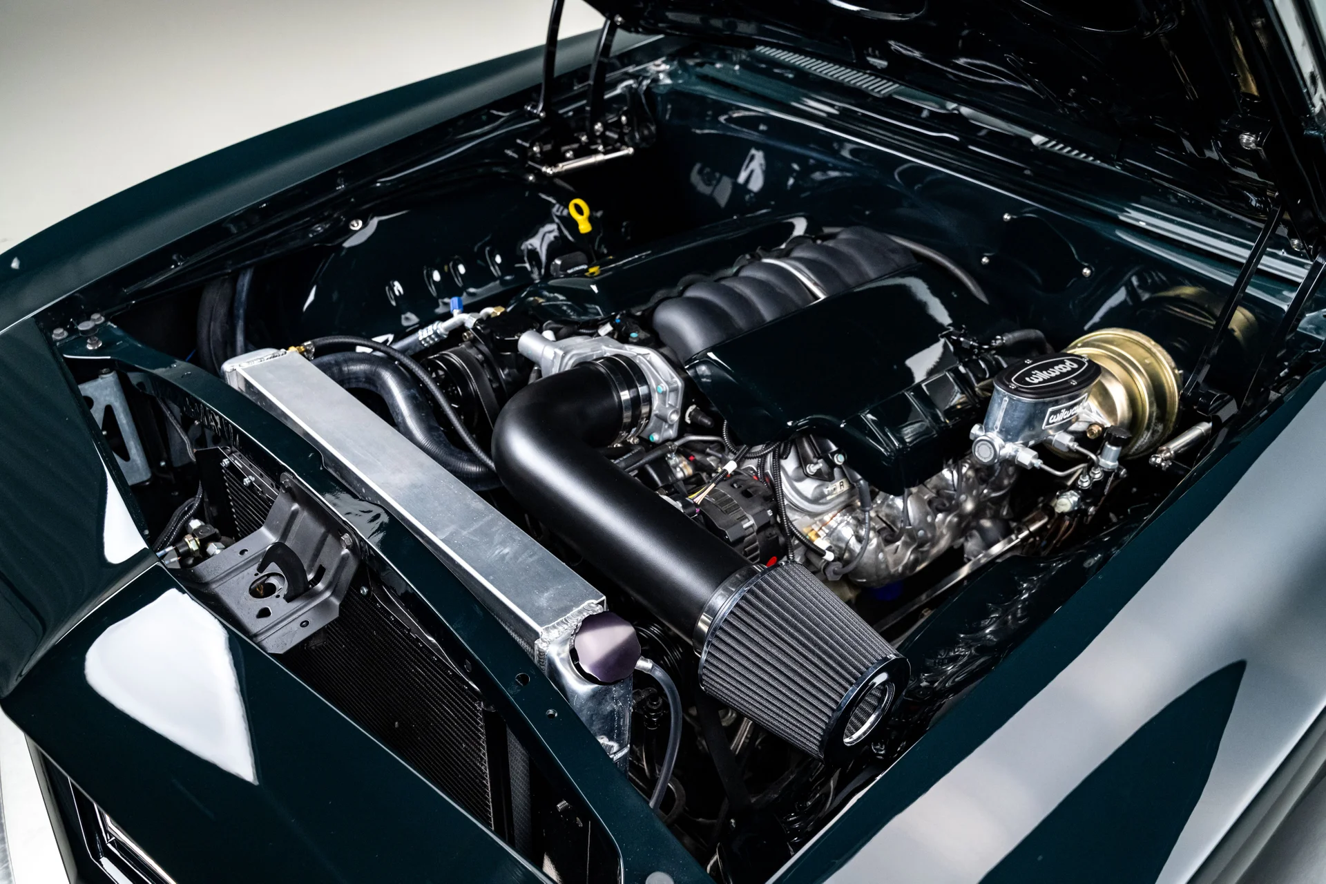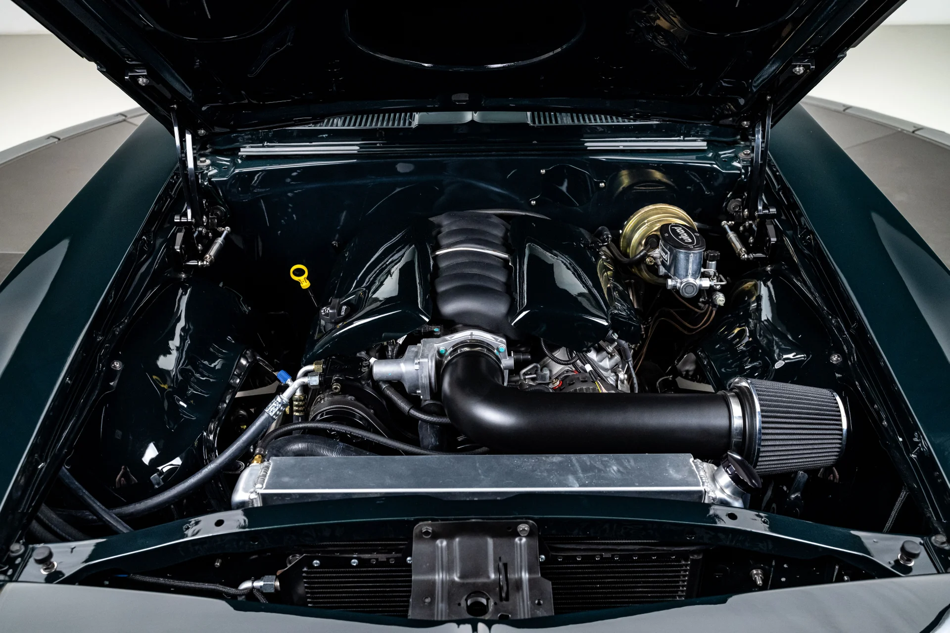 A potência vem de um motor V8 LS3 de 6,2 litros da GM Performance, acoplado a uma transmissão automática de 4 velocidades 4L60E. O compartimento do motor tem acabamento profissional e conta com um radiador de alumínio com ventoinhas elétricas. O LS3 recebeu um comando de válvulas de alto desempenho, proporcionando um ronco característico na marcha lenta e uma resposta mais forte em toda a faixa de rotações. Com injeção eletrônica moderna e escapamento duplo Dynomax personalizado, ele entrega o som e a potência esperados de um restomod de alta qualidade. Um eixo traseiro de 9 polegadas com relação 3,55 e diferencial autoblocante completa o conjunto mecânico, oferecendo a robustez necessária para lidar com o desempenho moderno com facilidade.