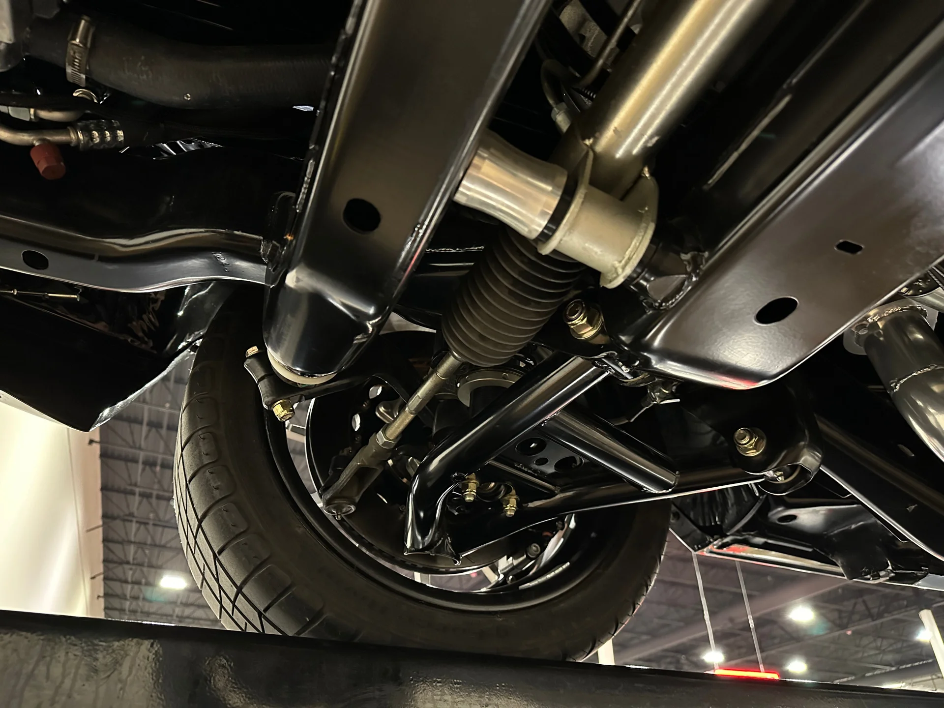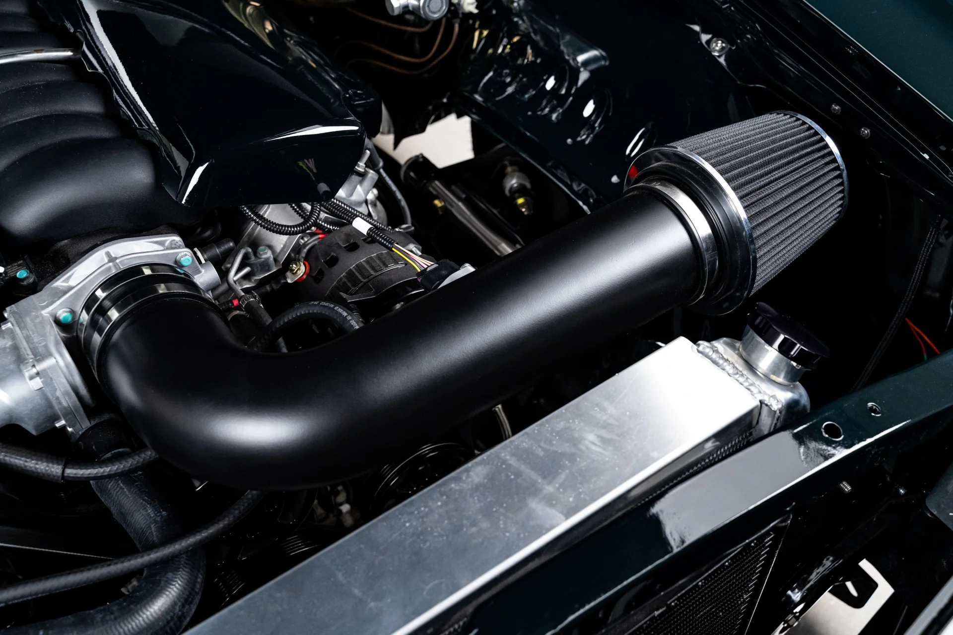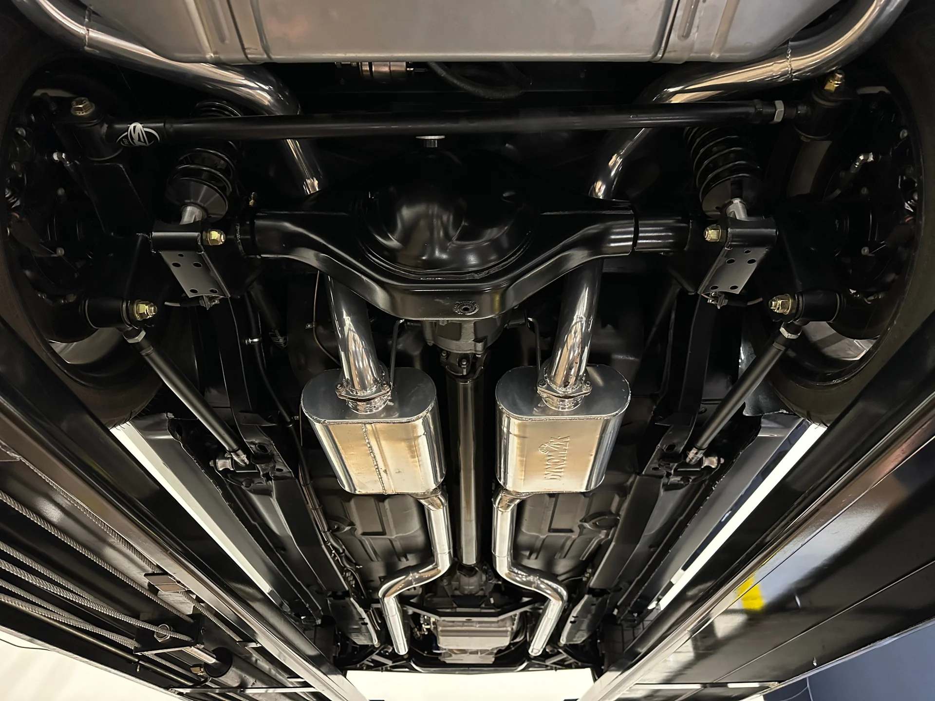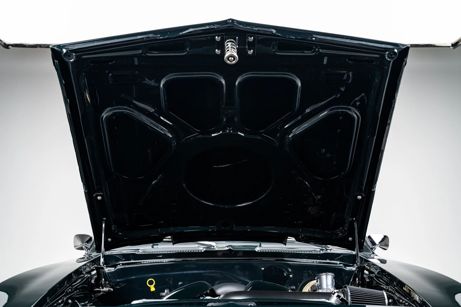 A potência vem de um motor V8 LS3 de 6,2 litros da GM Performance, acoplado a uma transmissão automática de 4 velocidades 4L60E. O compartimento do motor tem acabamento profissional e conta com um radiador de alumínio com ventoinhas elétricas. O LS3 recebeu um comando de válvulas de alto desempenho, proporcionando um ronco característico na marcha lenta e uma resposta mais forte em toda a faixa de rotações. Com injeção eletrônica moderna e escapamento duplo Dynomax personalizado, ele entrega o som e a potência esperados de um restomod de alta qualidade. Um eixo traseiro de 9 polegadas com relação 3,55 e diferencial autoblocante completa o conjunto mecânico, oferecendo a robustez necessária para lidar com o desempenho moderno com facilidade.