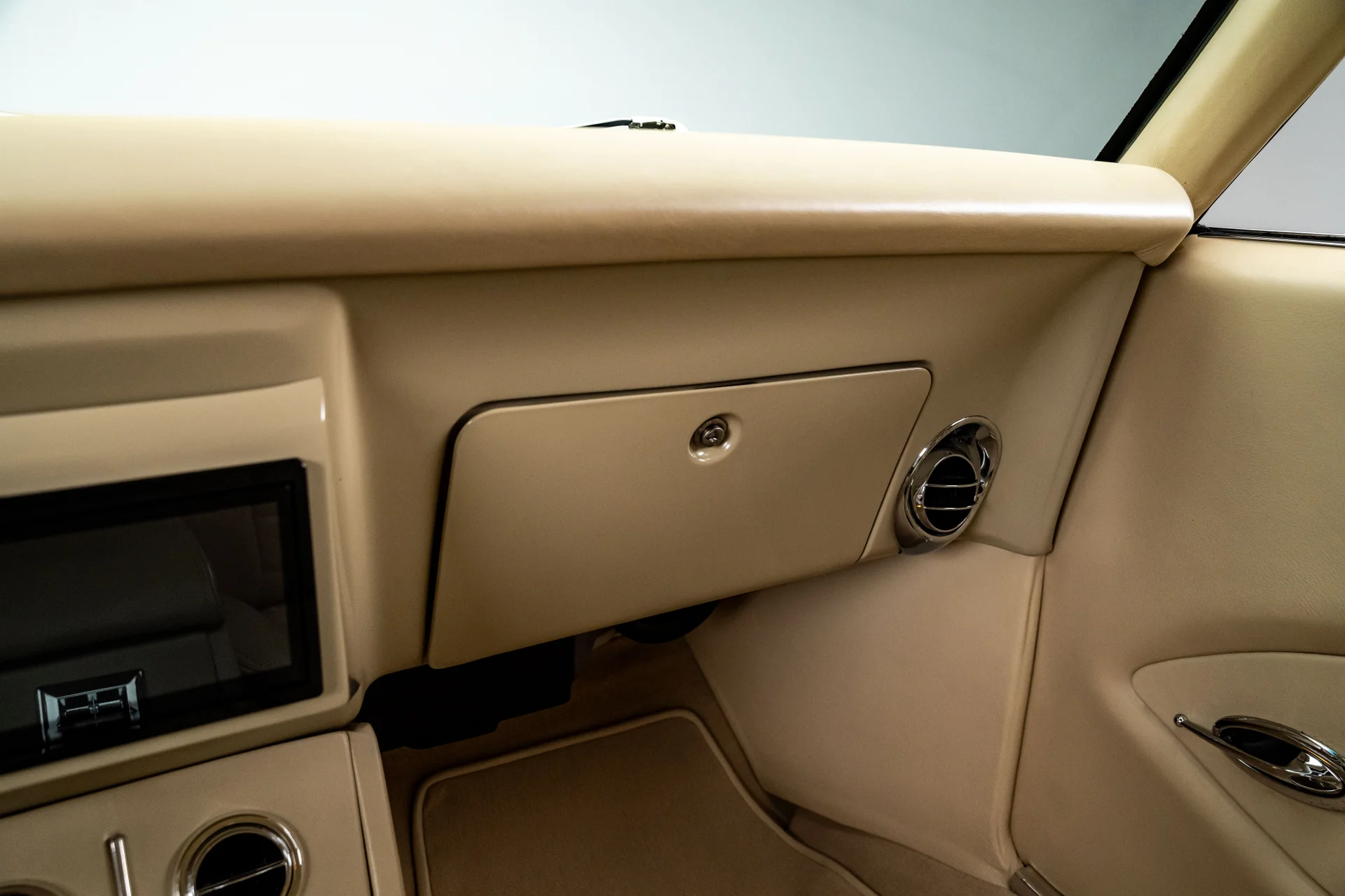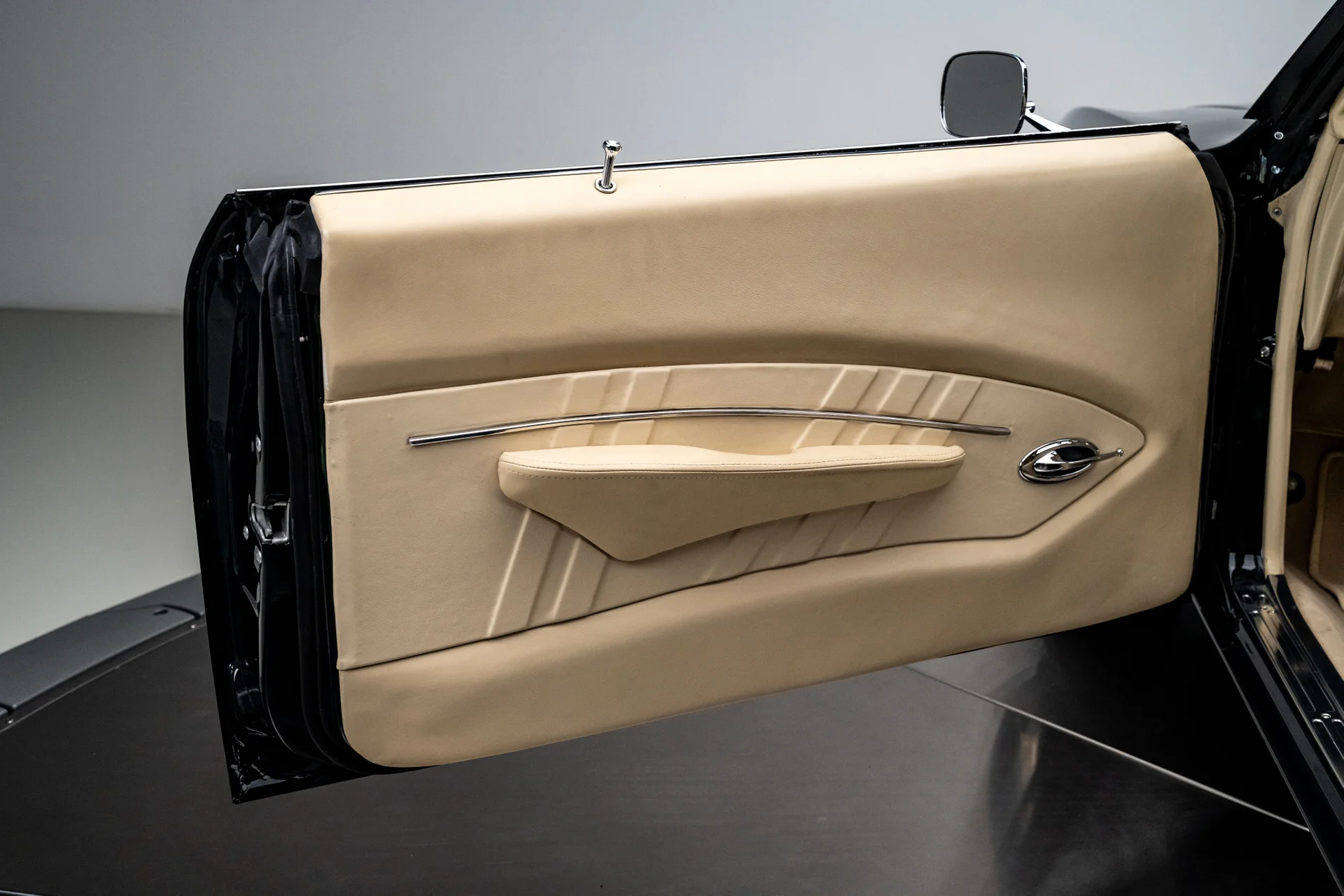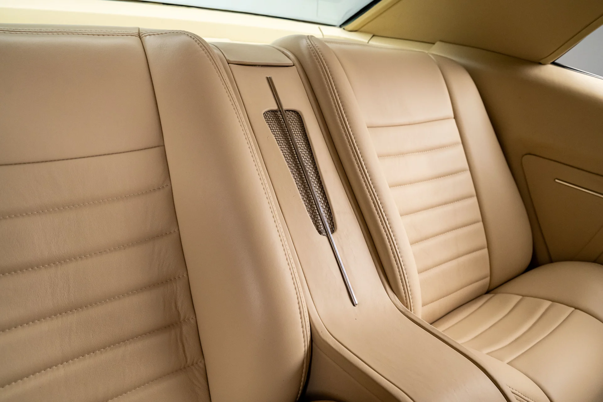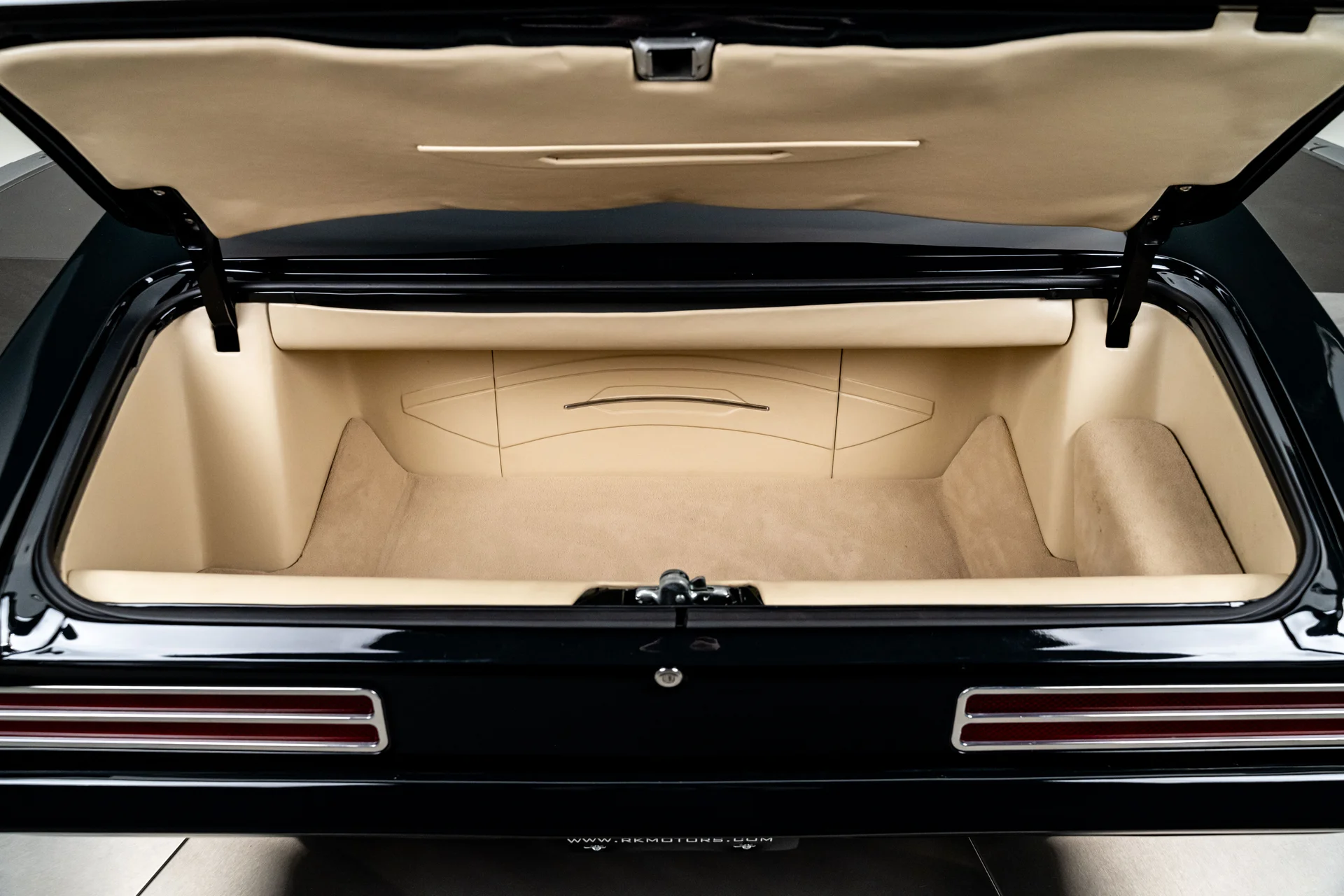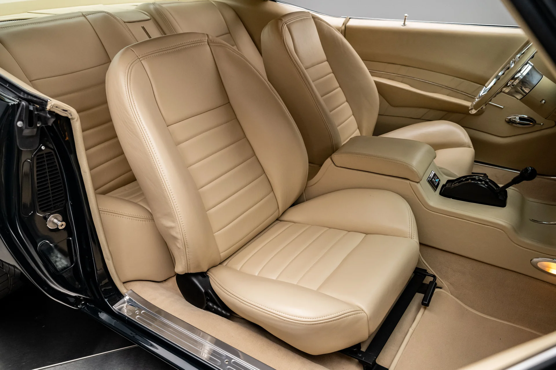Por baixo, as credenciais pro-touring do carro ficam bem evidentes. Um subchassi dianteiro da Detroit Speed suporta uma suspensão independente de braços duplos em A com amortecedores coilover e direção hidráulica com pinhão e cremalheira, enquanto uma suspensão traseira Quadralink com amortecedores coilover complementa o eixo reforçado. Freios a disco hidráulicos Wilwood nas quatro rodas proporcionam uma frenagem moderna e eficiente, com grandes discos ventilados preenchendo as rodas Forgeline. O acabamento da parte inferior da carroceria é o mesmo da parte superior, com componentes da suspensão com pintura eletrostática a pó, escapamento de aço inoxidável revestido e uma atenção meticulosa aos detalhes evidente em toda a carroceria.