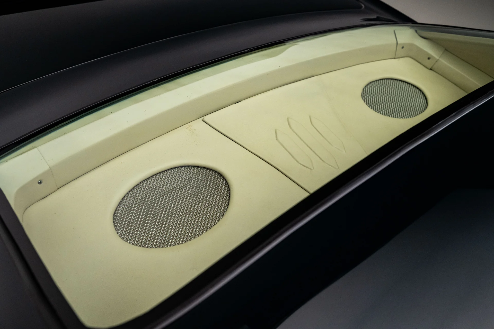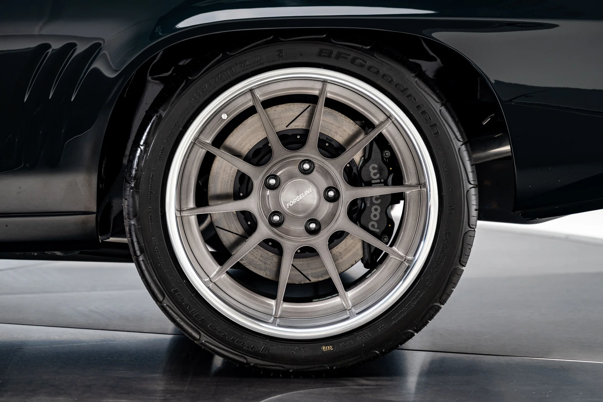 O exterior apresenta um visual limpo e agressivo, com uma carroceria impecável realçada pelo pacote de faróis escamoteáveis Rally Sport na dianteira e lanternas traseiras atualizadas. A sutil pintura verde-escura é acentuada por detalhes cromados brilhantes e uma postura rebaixada que sugere a potência do motor. As rodas Forgeline de 18 polegadas, calçadas com pneus BF Goodrich G-Force Rival (275/35R18 na dianteira e 335/30R18 na traseira), dão o tom, com seu encaixe escalonado possibilitado por mini-caixas de roda cuidadosamente projetadas. A qualidade do acabamento e a postura elevam este Camaro muito além da apresentação original, conferindo-lhe um visual digno de exposição sem se afastar de sua herança.