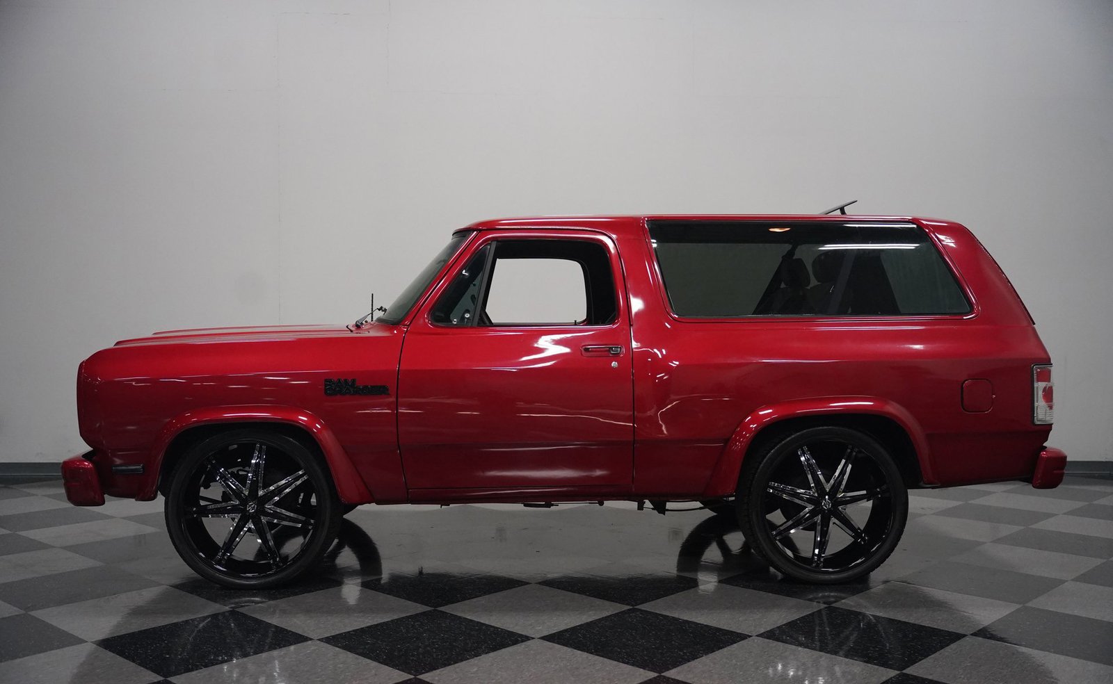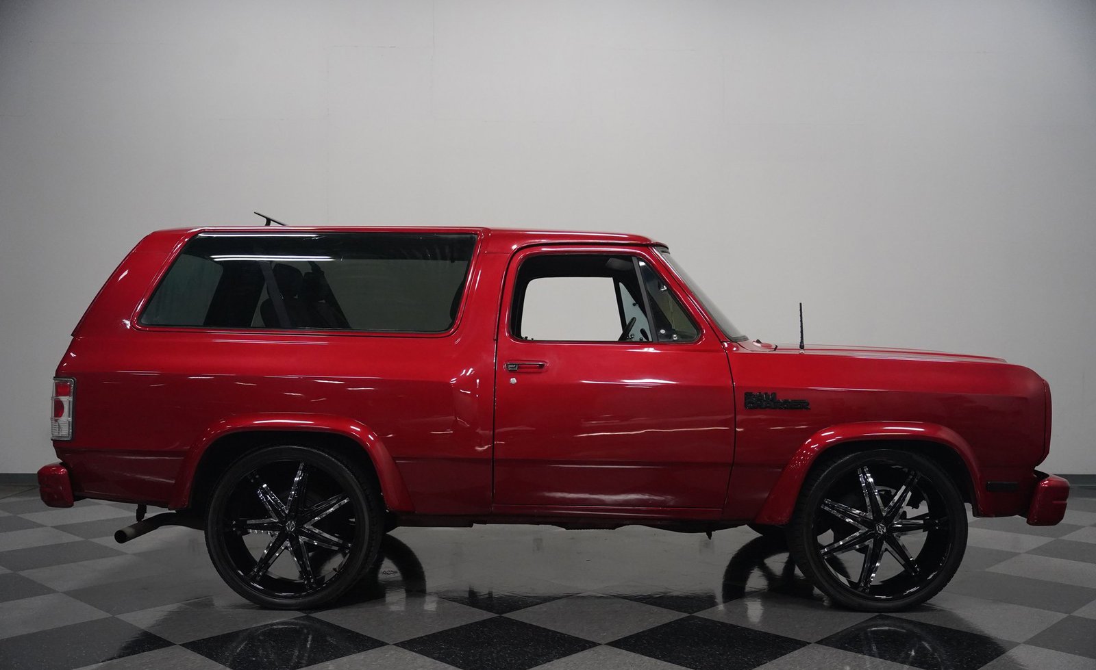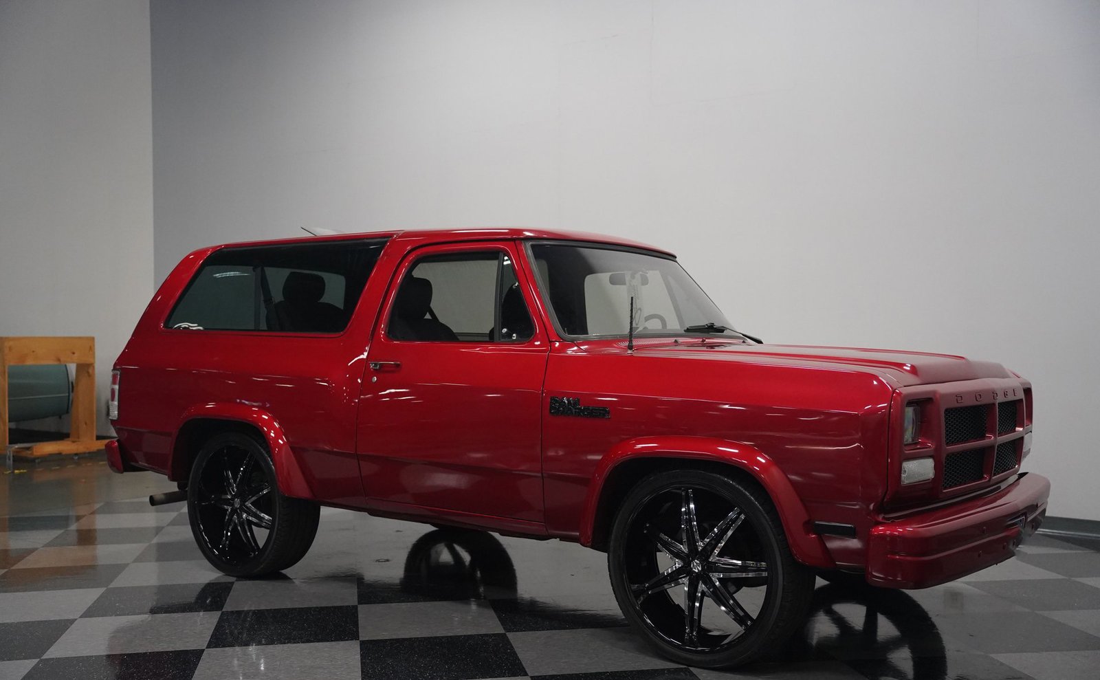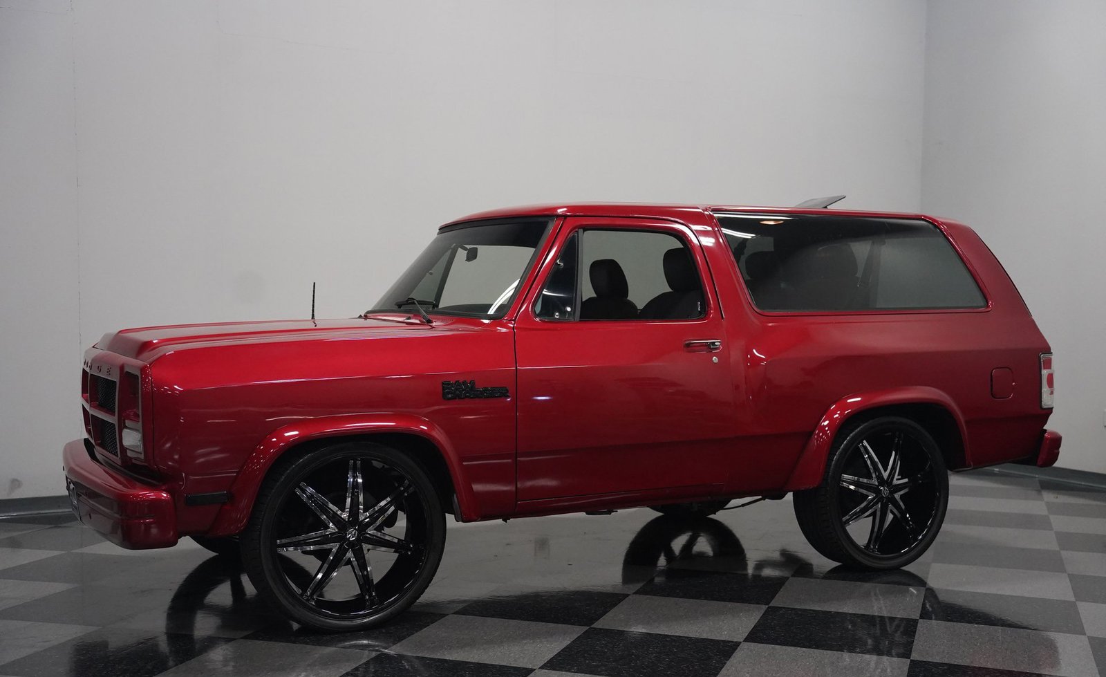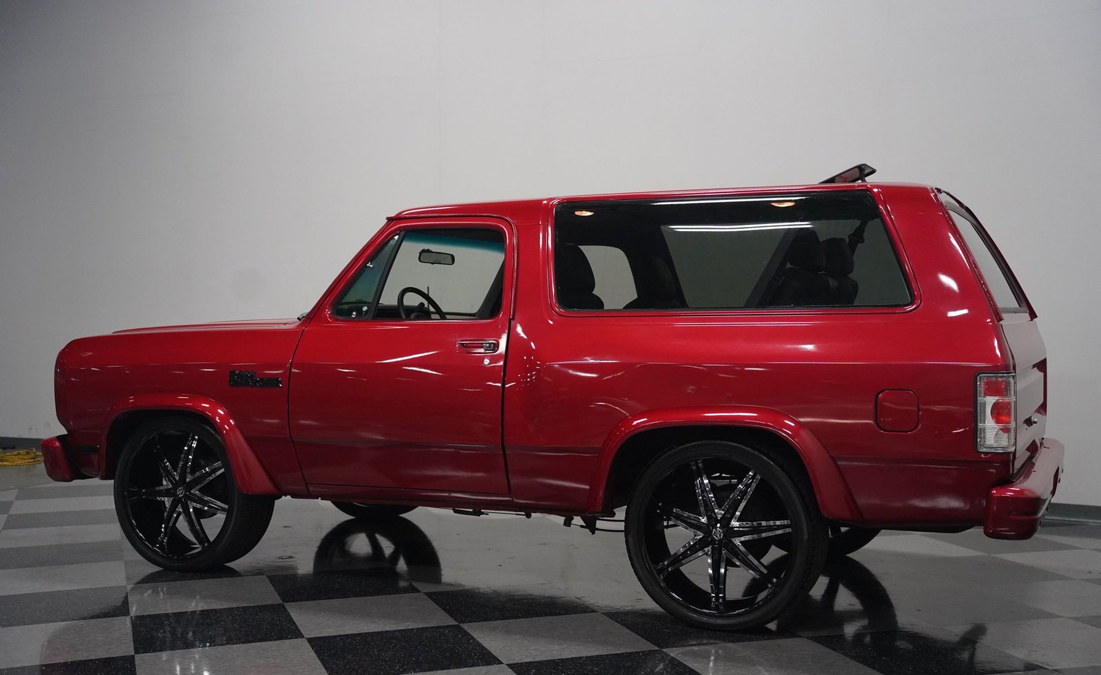 Equipada com enormes rodas de 24 polegadas, esta Dodge Ramcharger de 1992, na cor vermelha, agarra-se ao asfalto com pneus 295/30ZR24. Os vidros escurecidos emolduram o SUV de duas portas, enquanto os alargadores de para-lamas aumentam a largura para acomodar as rodas de grandes dimensões. Para-choques e grade na mesma cor da carroceria criam um visual harmonioso, enquanto faróis e lanternas traseiras personalizados modernizam a iluminação dianteira e traseira. Os emblemas pintados se integram perfeitamente ao acabamento vermelho desta Ramcharger totalmente repintada.