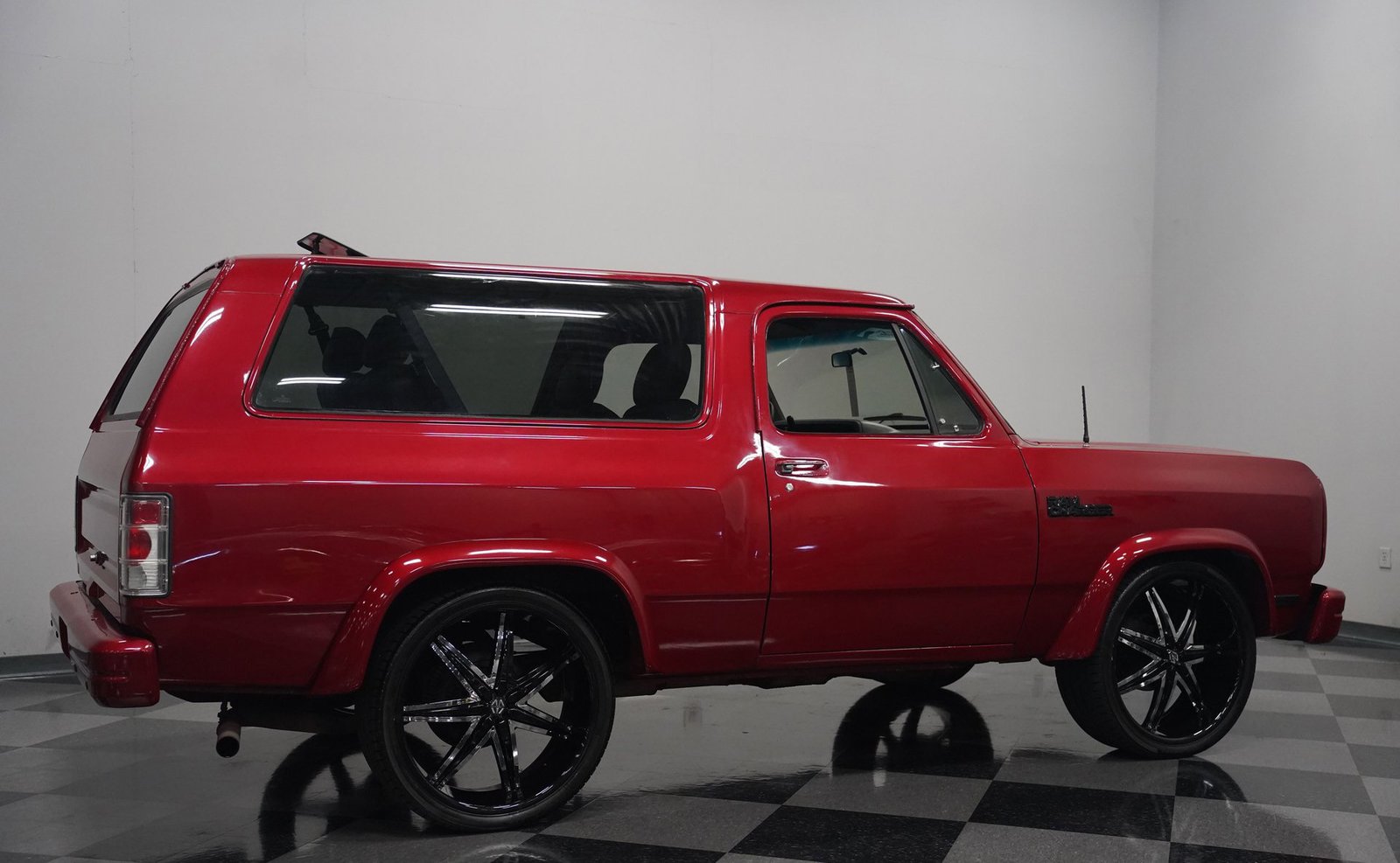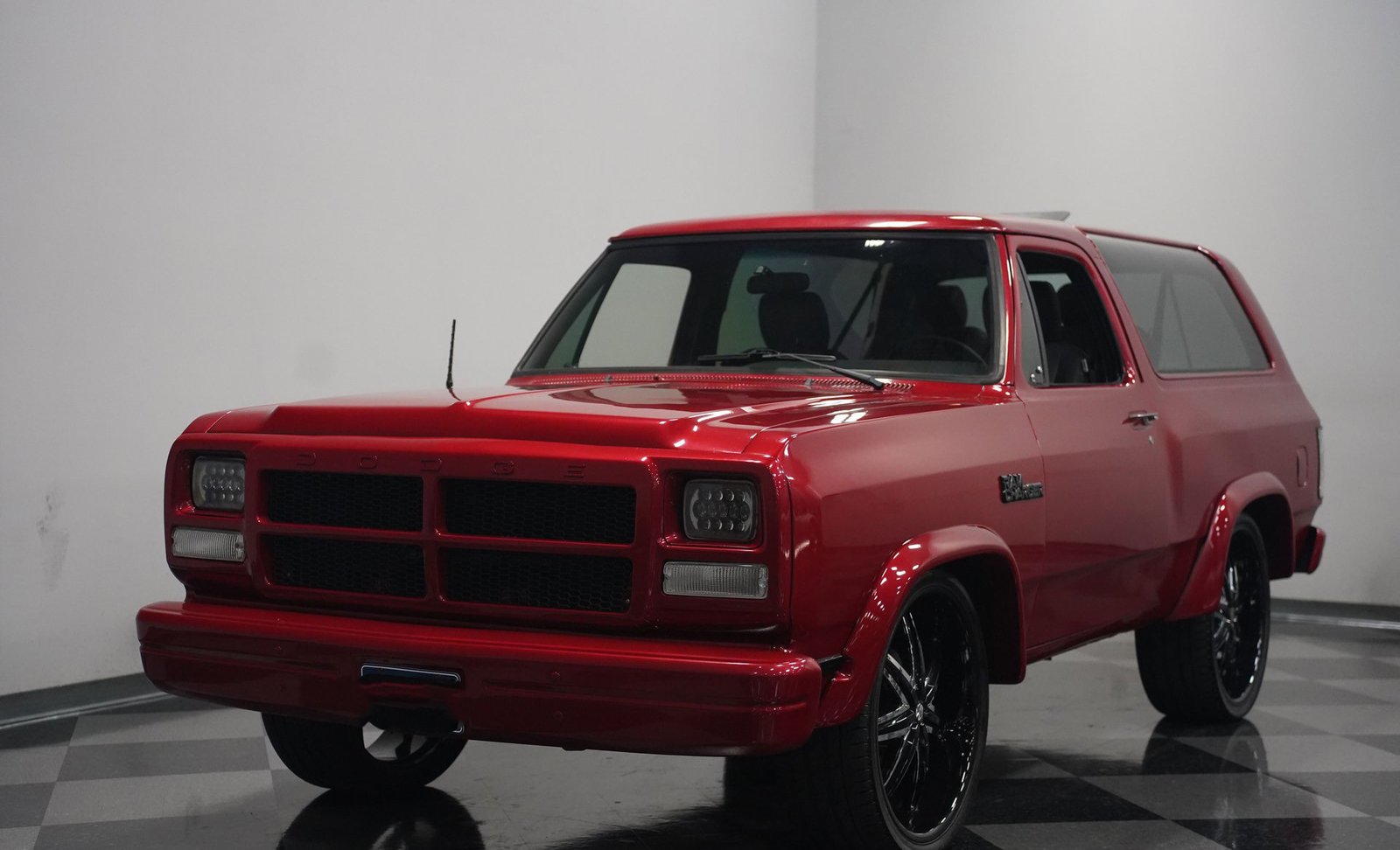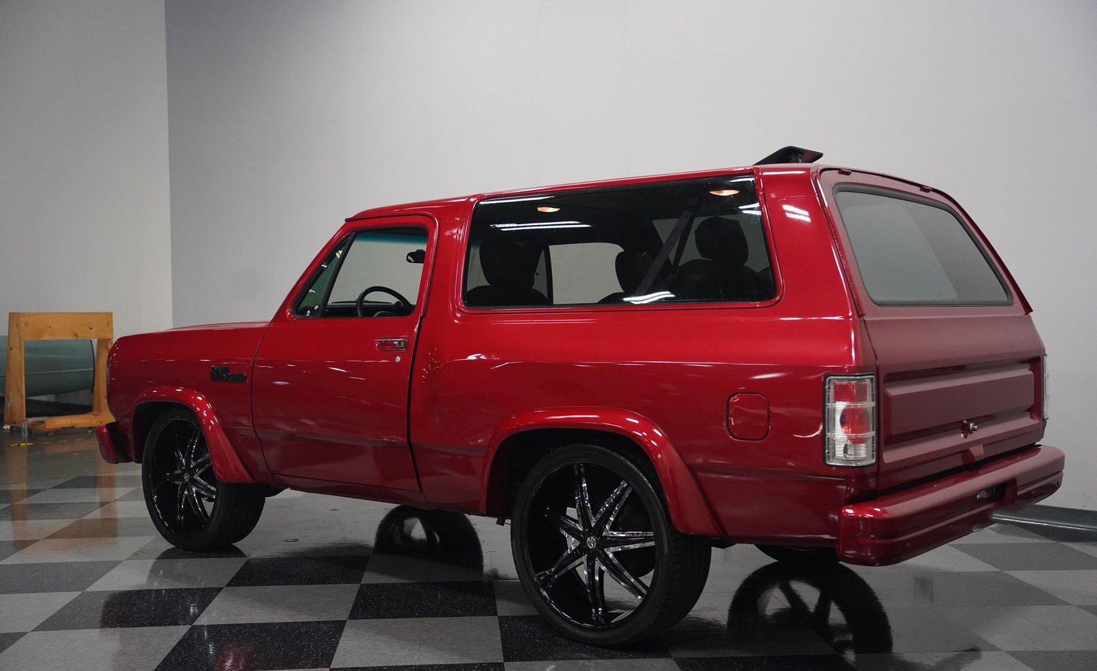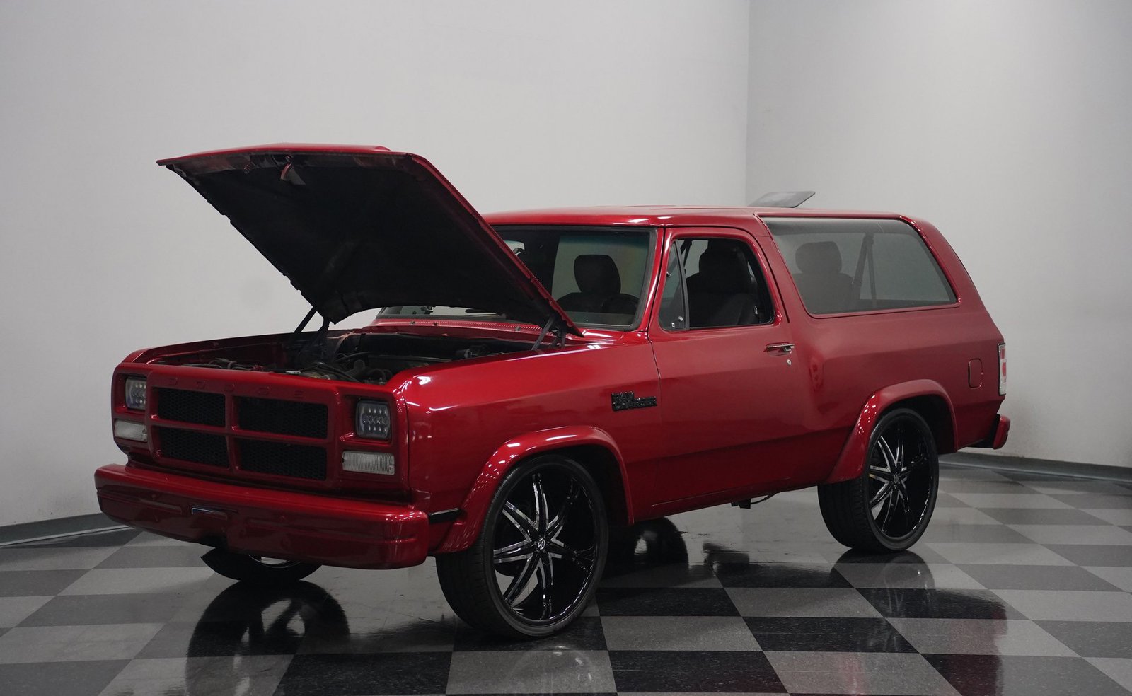 Equipada com enormes rodas de 24 polegadas, esta Dodge Ramcharger de 1992, na cor vermelha, agarra-se ao asfalto com pneus 295/30ZR24. Os vidros escurecidos emolduram o SUV de duas portas, enquanto os alargadores de para-lamas aumentam a largura para acomodar as rodas de grandes dimensões. Para-choques e grade na mesma cor da carroceria criam um visual harmonioso, enquanto faróis e lanternas traseiras personalizados modernizam a iluminação dianteira e traseira. Os emblemas pintados se integram perfeitamente ao acabamento vermelho desta Ramcharger totalmente repintada.