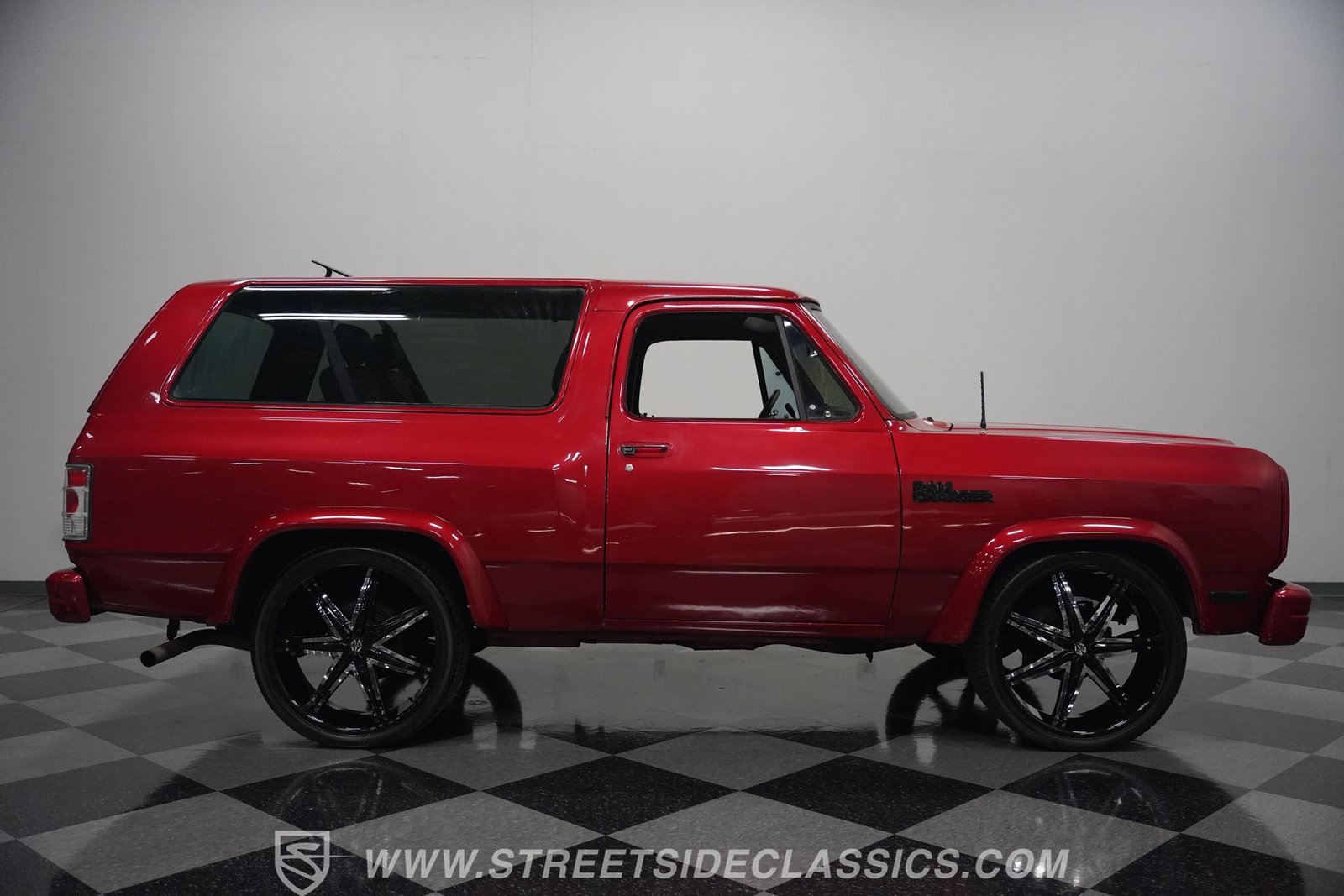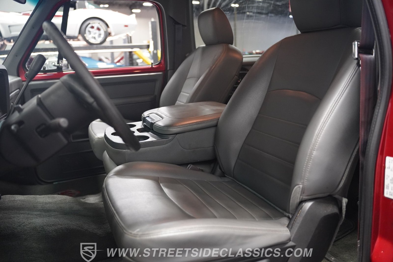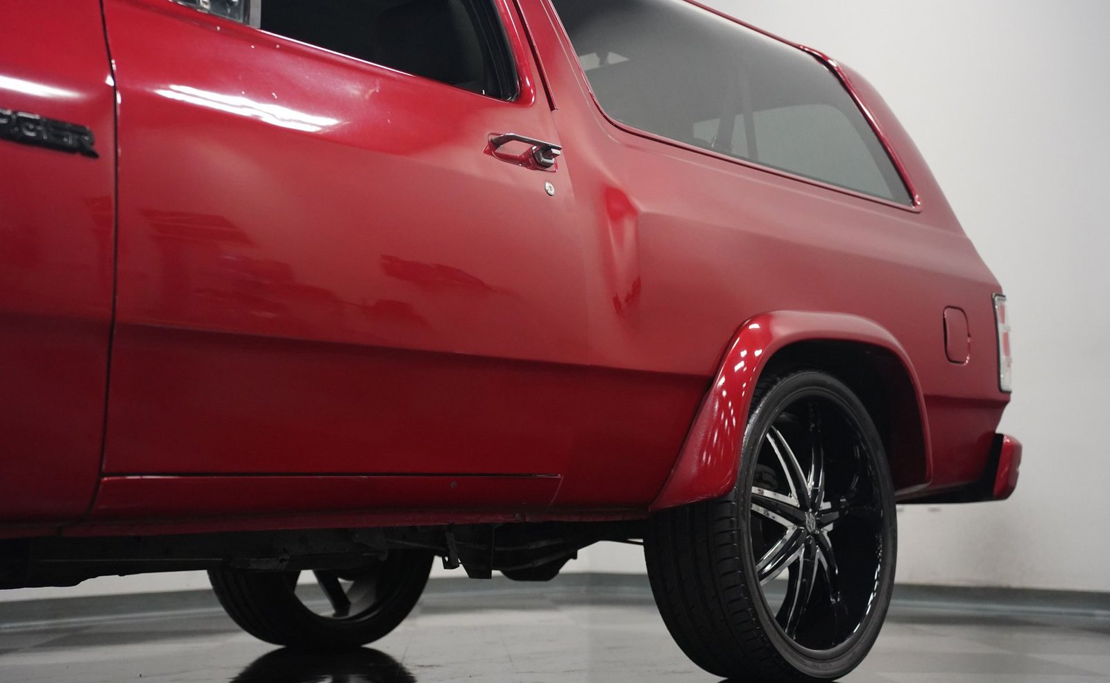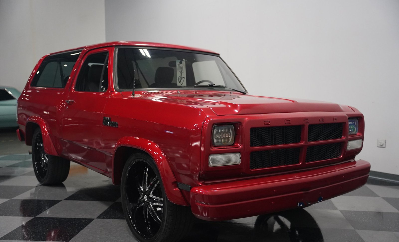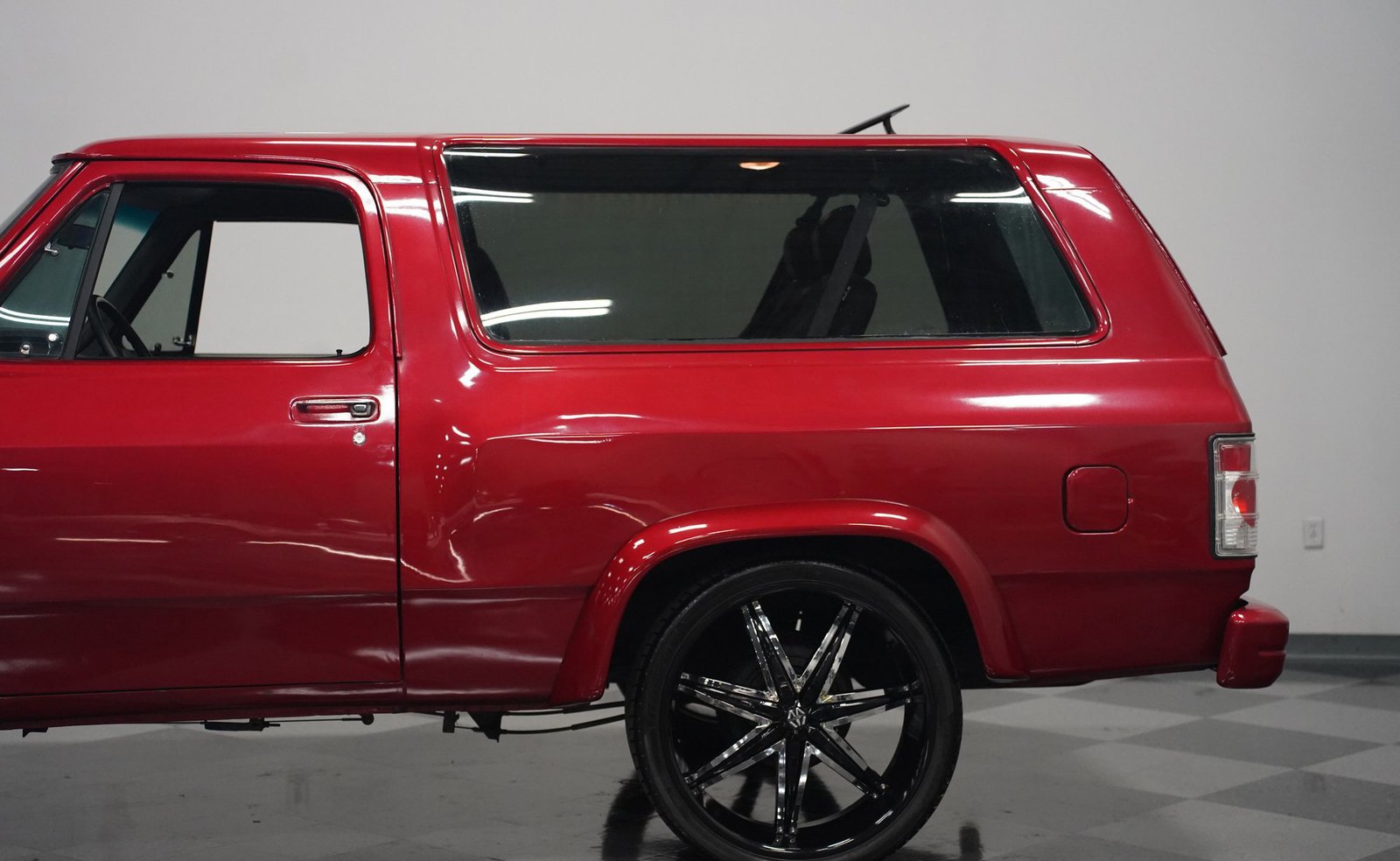 Equipada com enormes rodas de 24 polegadas, esta Dodge Ramcharger de 1992, na cor vermelha, agarra-se ao asfalto com pneus 295/30ZR24. Os vidros escurecidos emolduram o SUV de duas portas, enquanto os alargadores de para-lamas aumentam a largura para acomodar as rodas de grandes dimensões. Para-choques e grade na mesma cor da carroceria criam um visual harmonioso, enquanto faróis e lanternas traseiras personalizados modernizam a iluminação dianteira e traseira. Os emblemas pintados se integram perfeitamente ao acabamento vermelho desta Ramcharger totalmente repintada.