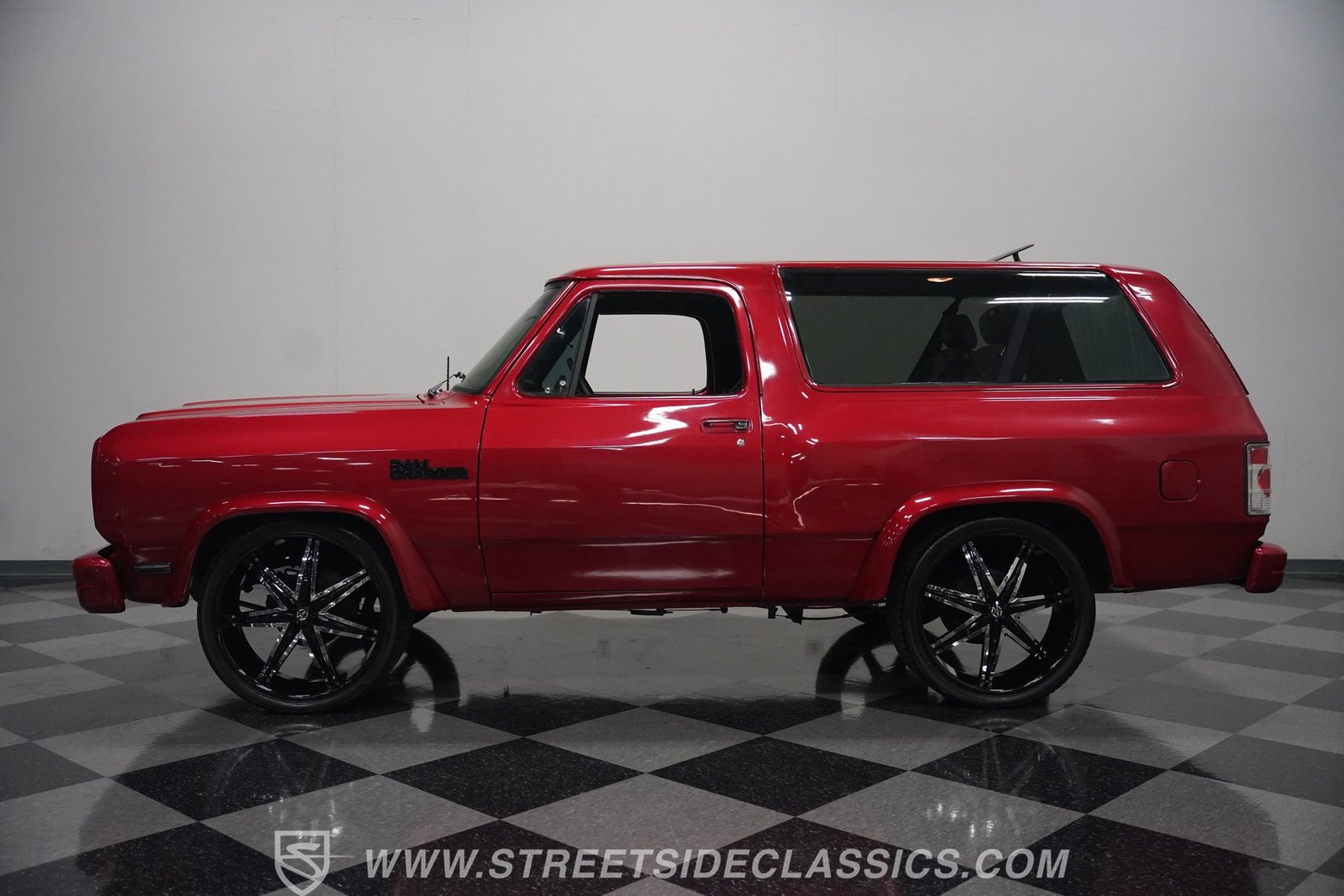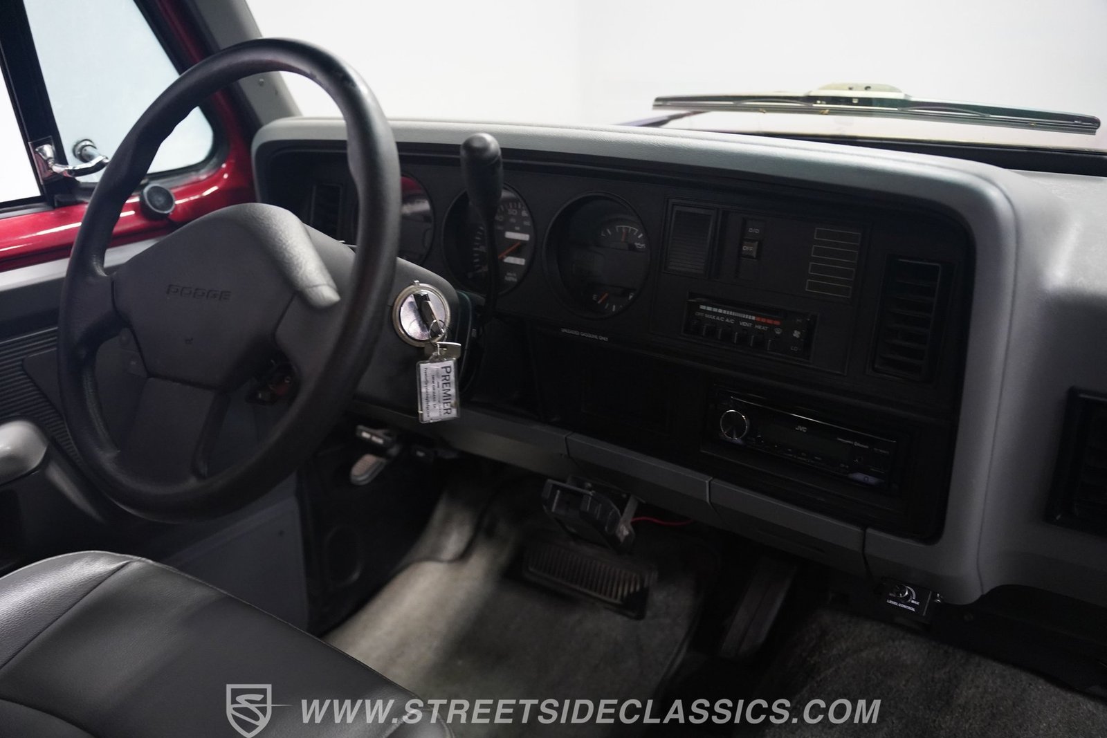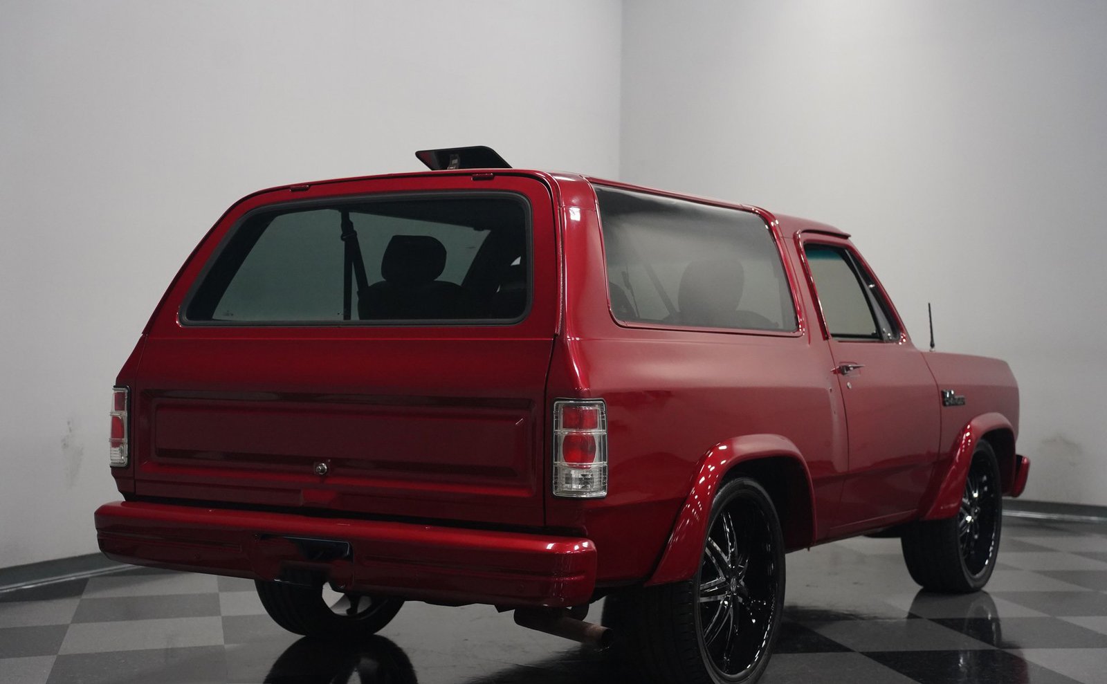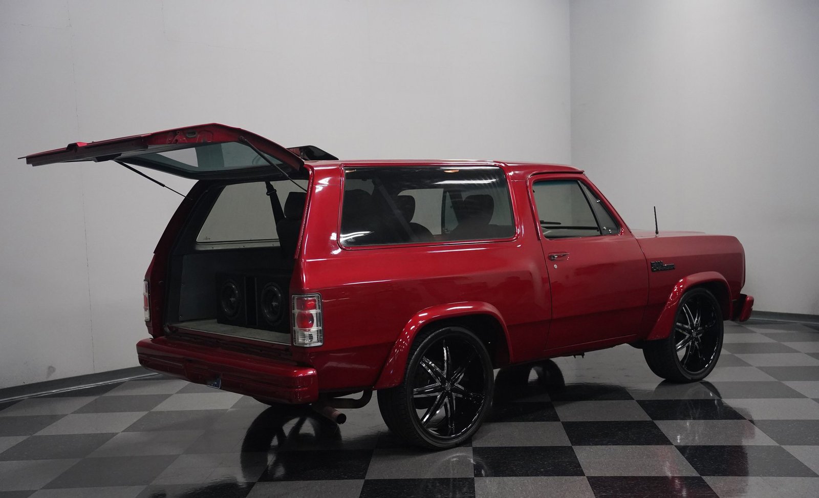 Equipada com enormes rodas de 24 polegadas, esta Dodge Ramcharger de 1992, na cor vermelha, agarra-se ao asfalto com pneus 295/30ZR24. Os vidros escurecidos emolduram o SUV de duas portas, enquanto os alargadores de para-lamas aumentam a largura para acomodar as rodas de grandes dimensões. Para-choques e grade na mesma cor da carroceria criam um visual harmonioso, enquanto faróis e lanternas traseiras personalizados modernizam a iluminação dianteira e traseira. Os emblemas pintados se integram perfeitamente ao acabamento vermelho desta Ramcharger totalmente repintada.