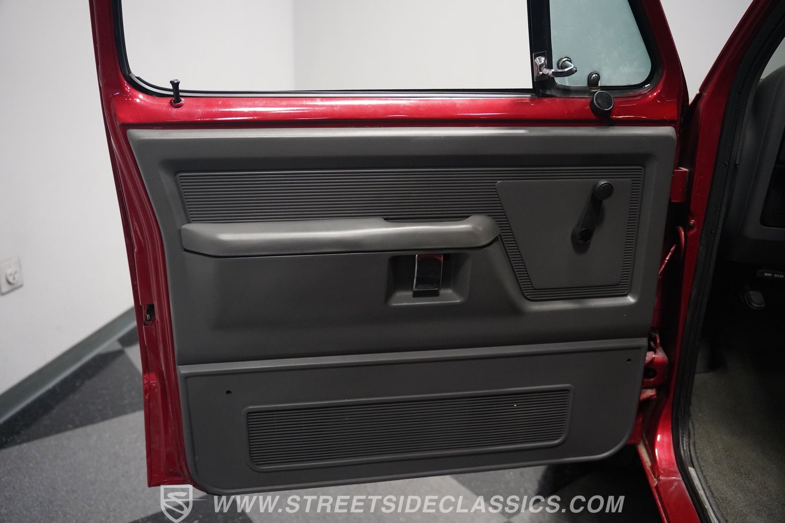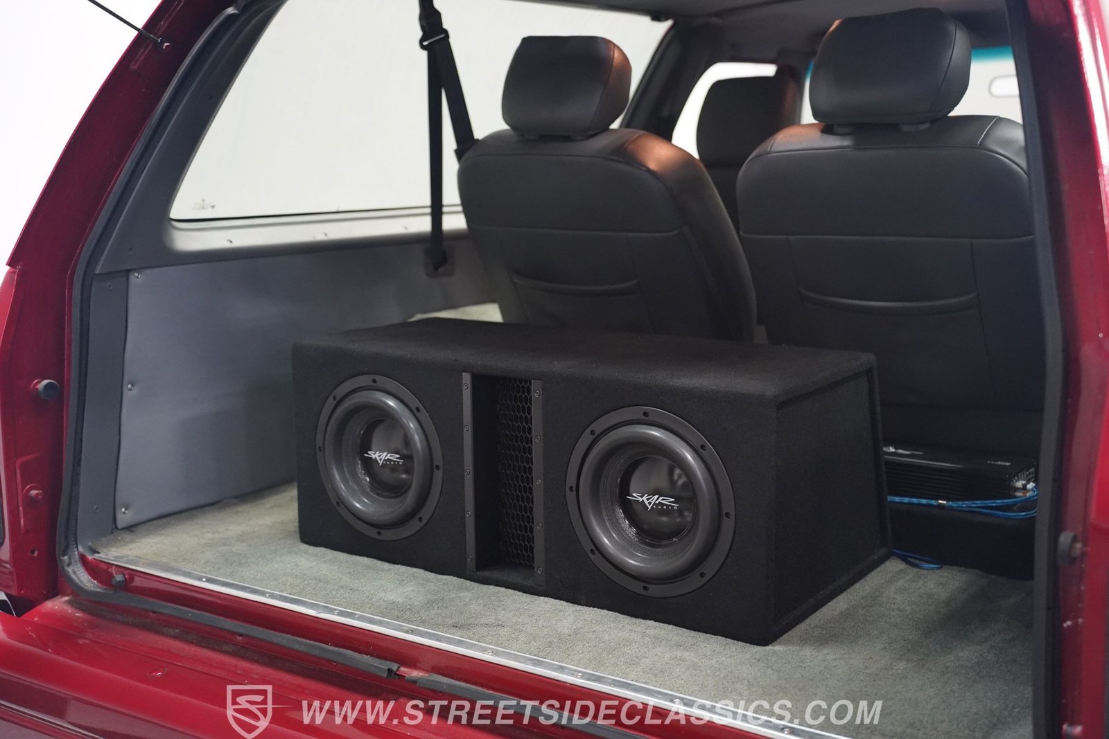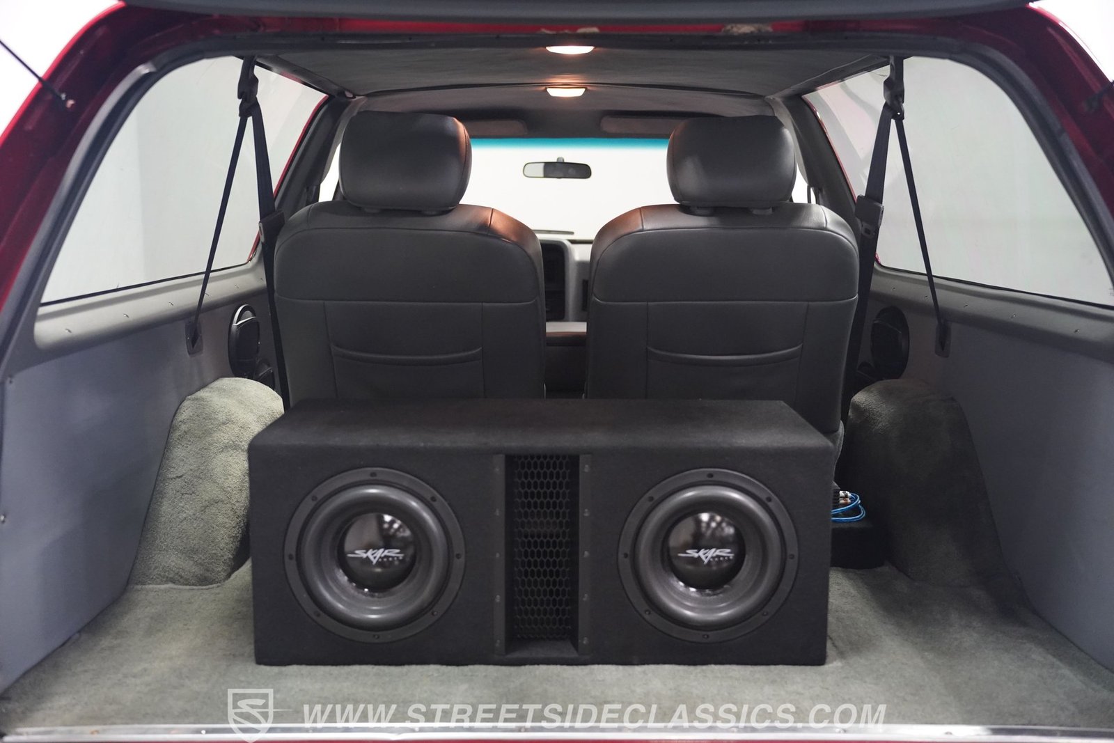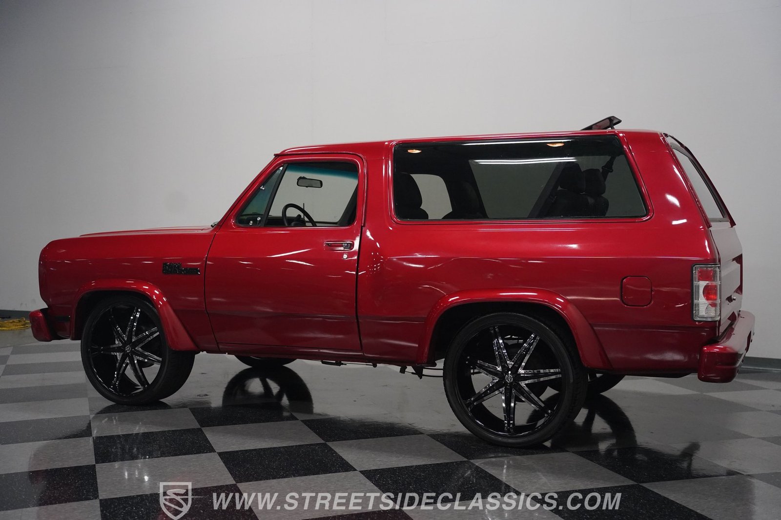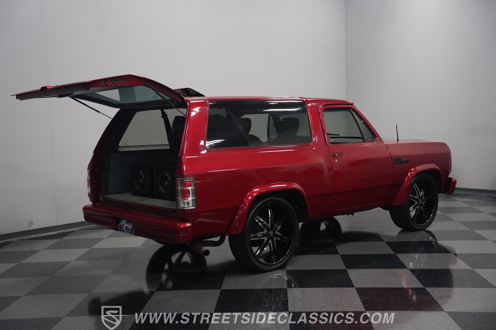 Equipada com enormes rodas de 24 polegadas, esta Dodge Ramcharger de 1992, na cor vermelha, agarra-se ao asfalto com pneus 295/30ZR24. Os vidros escurecidos emolduram o SUV de duas portas, enquanto os alargadores de para-lamas aumentam a largura para acomodar as rodas de grandes dimensões. Para-choques e grade na mesma cor da carroceria criam um visual harmonioso, enquanto faróis e lanternas traseiras personalizados modernizam a iluminação dianteira e traseira. Os emblemas pintados se integram perfeitamente ao acabamento vermelho desta Ramcharger totalmente repintada.