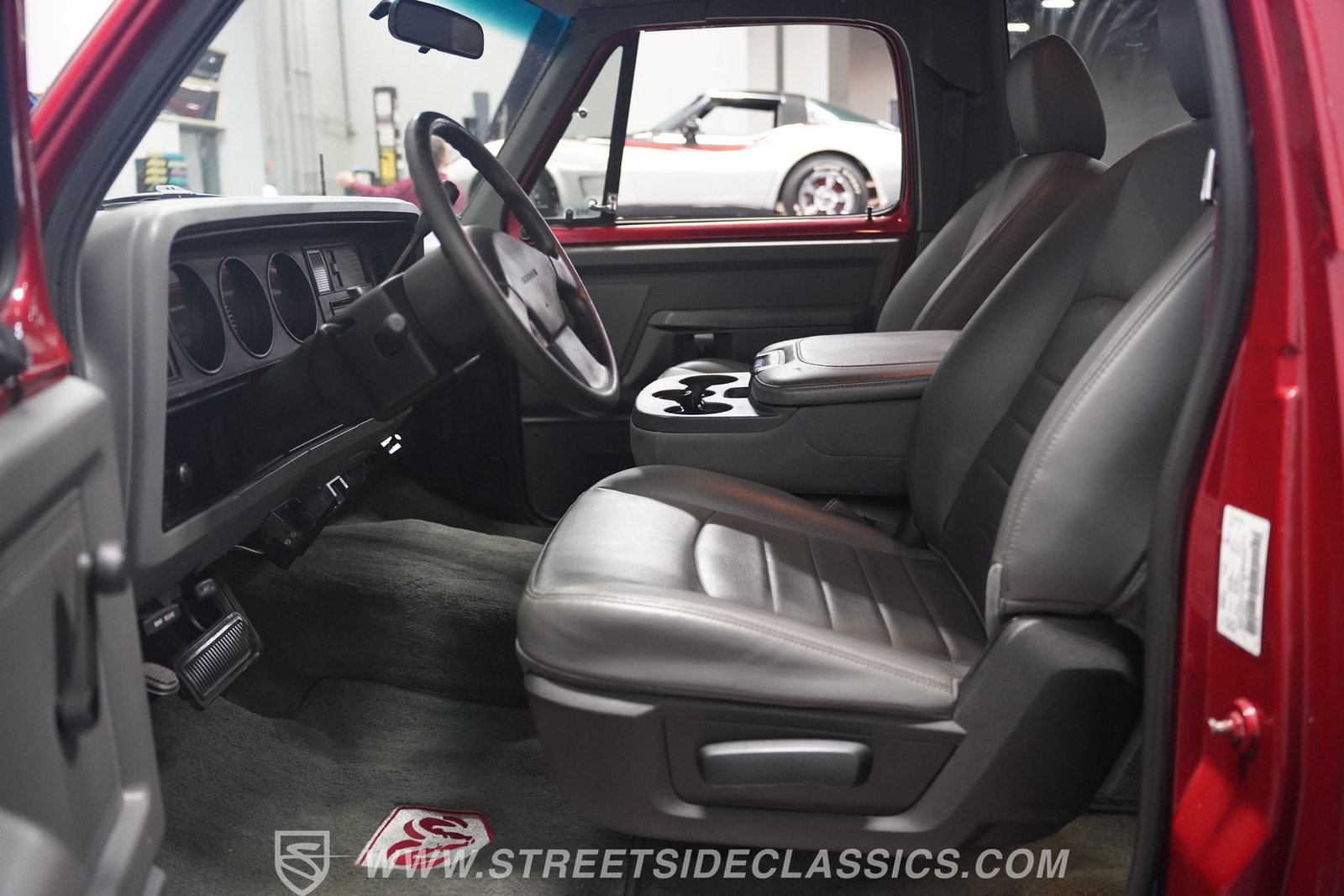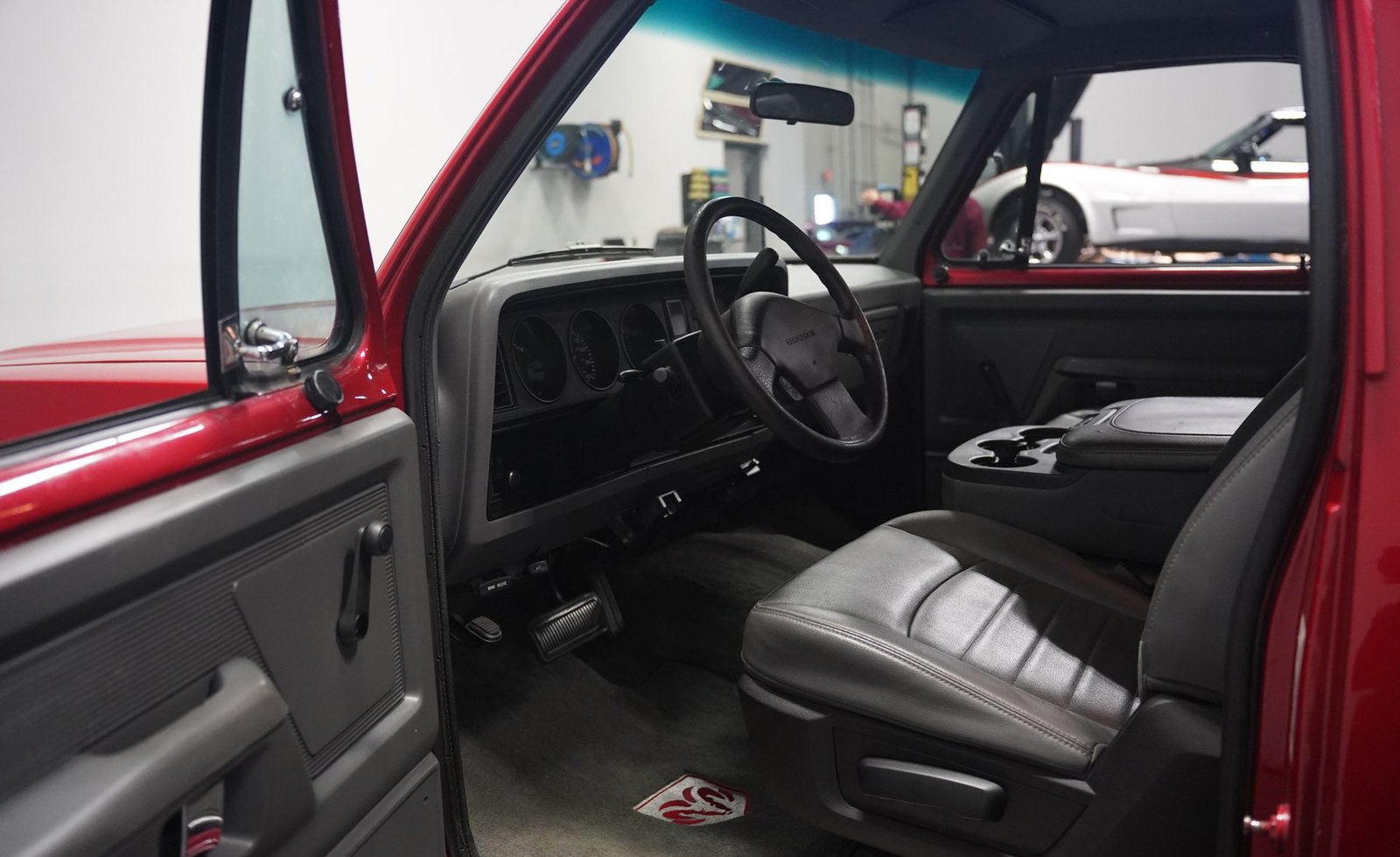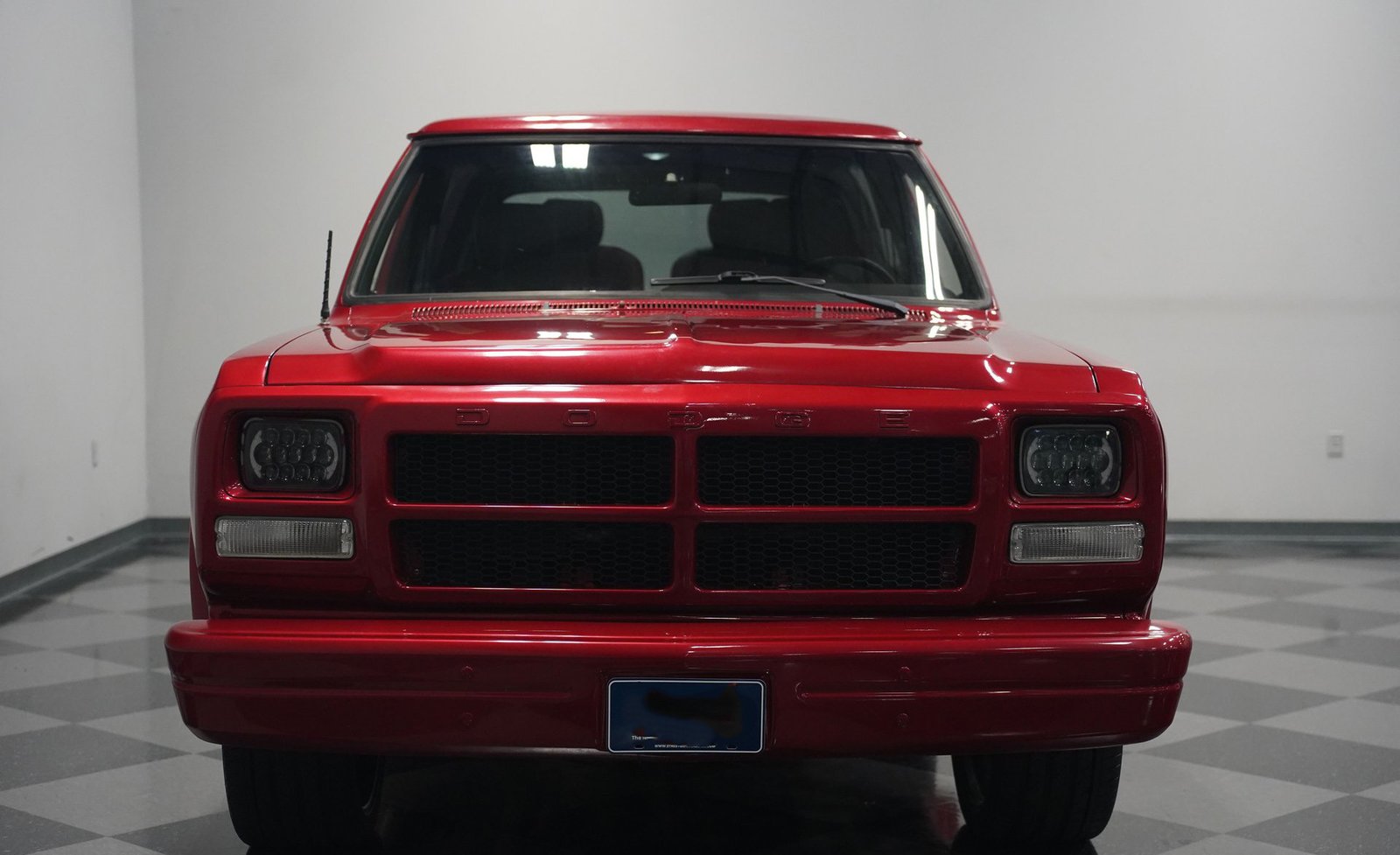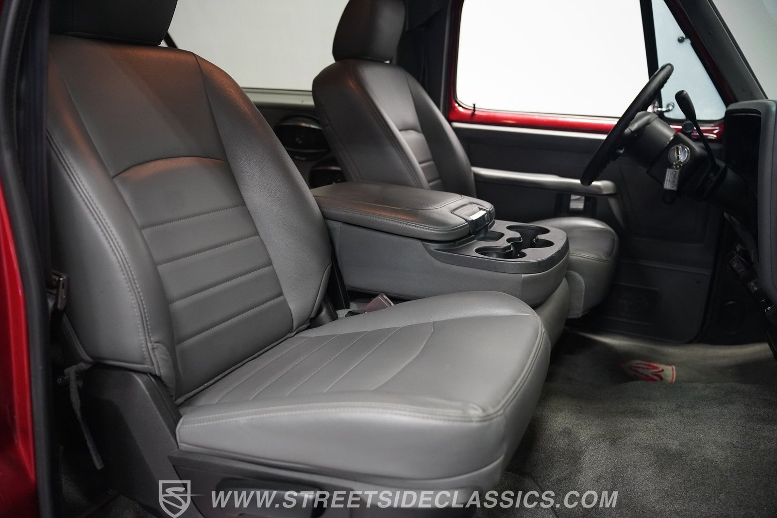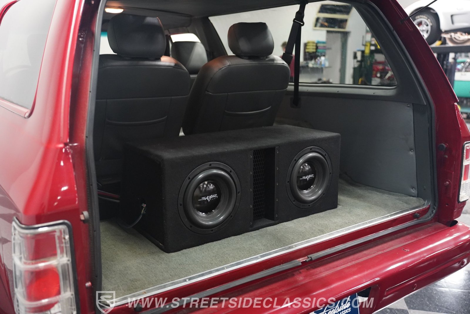 Equipada com enormes rodas de 24 polegadas, esta Dodge Ramcharger de 1992, na cor vermelha, agarra-se ao asfalto com pneus 295/30ZR24. Os vidros escurecidos emolduram o SUV de duas portas, enquanto os alargadores de para-lamas aumentam a largura para acomodar as rodas de grandes dimensões. Para-choques e grade na mesma cor da carroceria criam um visual harmonioso, enquanto faróis e lanternas traseiras personalizados modernizam a iluminação dianteira e traseira. Os emblemas pintados se integram perfeitamente ao acabamento vermelho desta Ramcharger totalmente repintada.