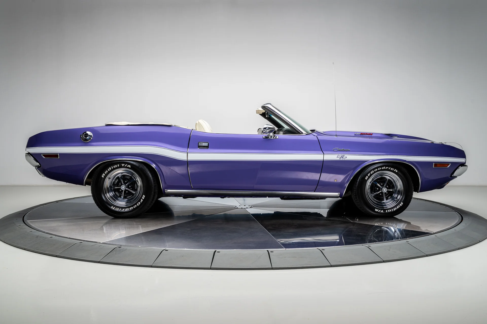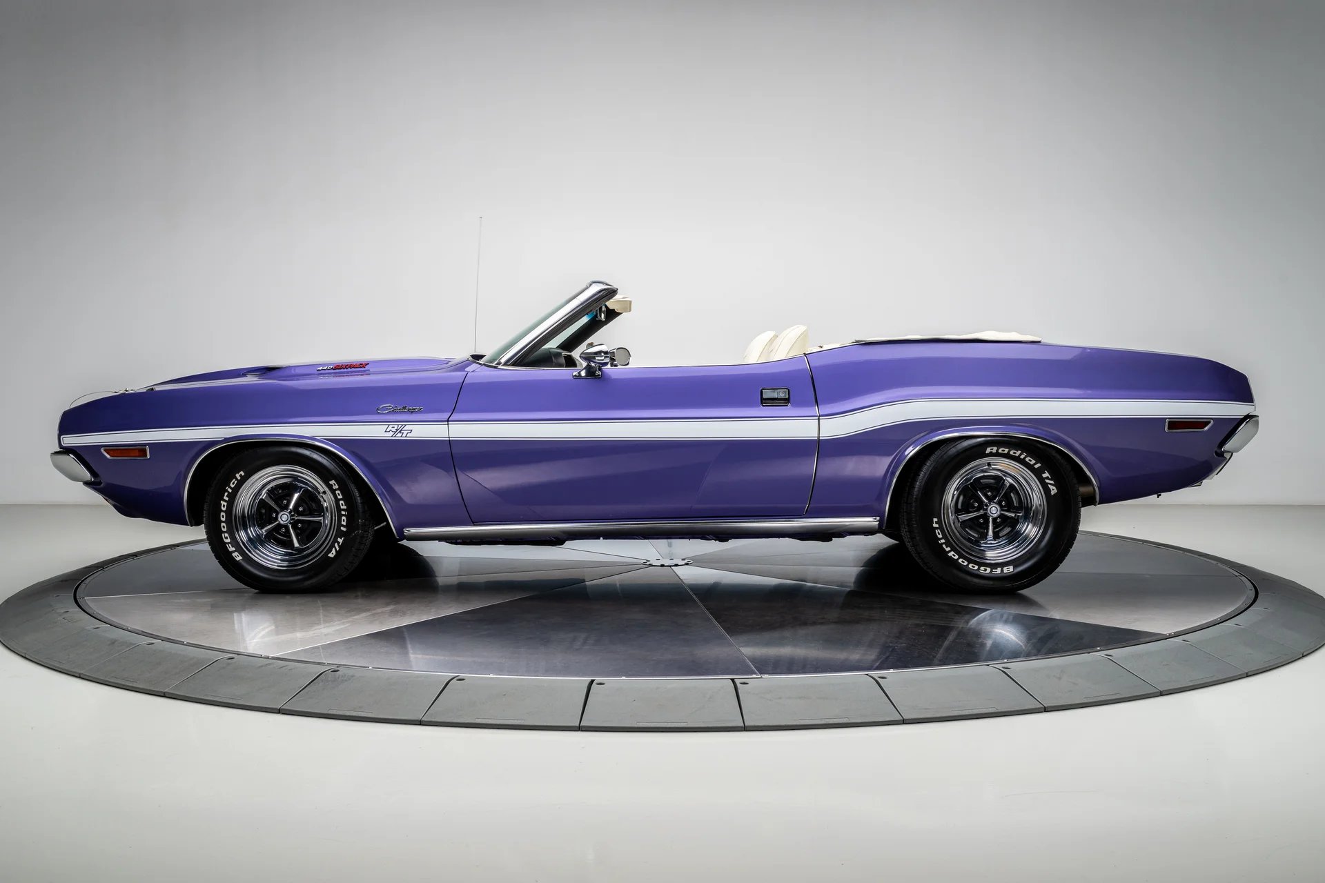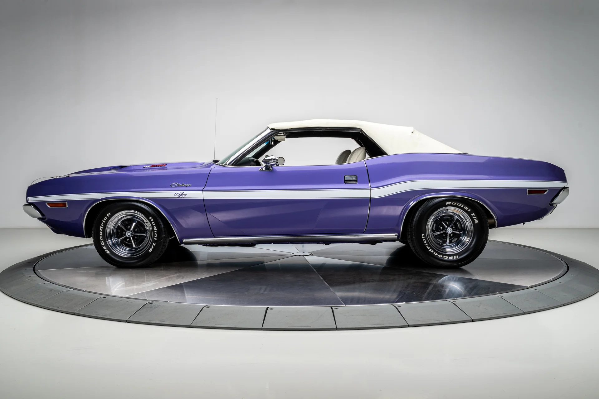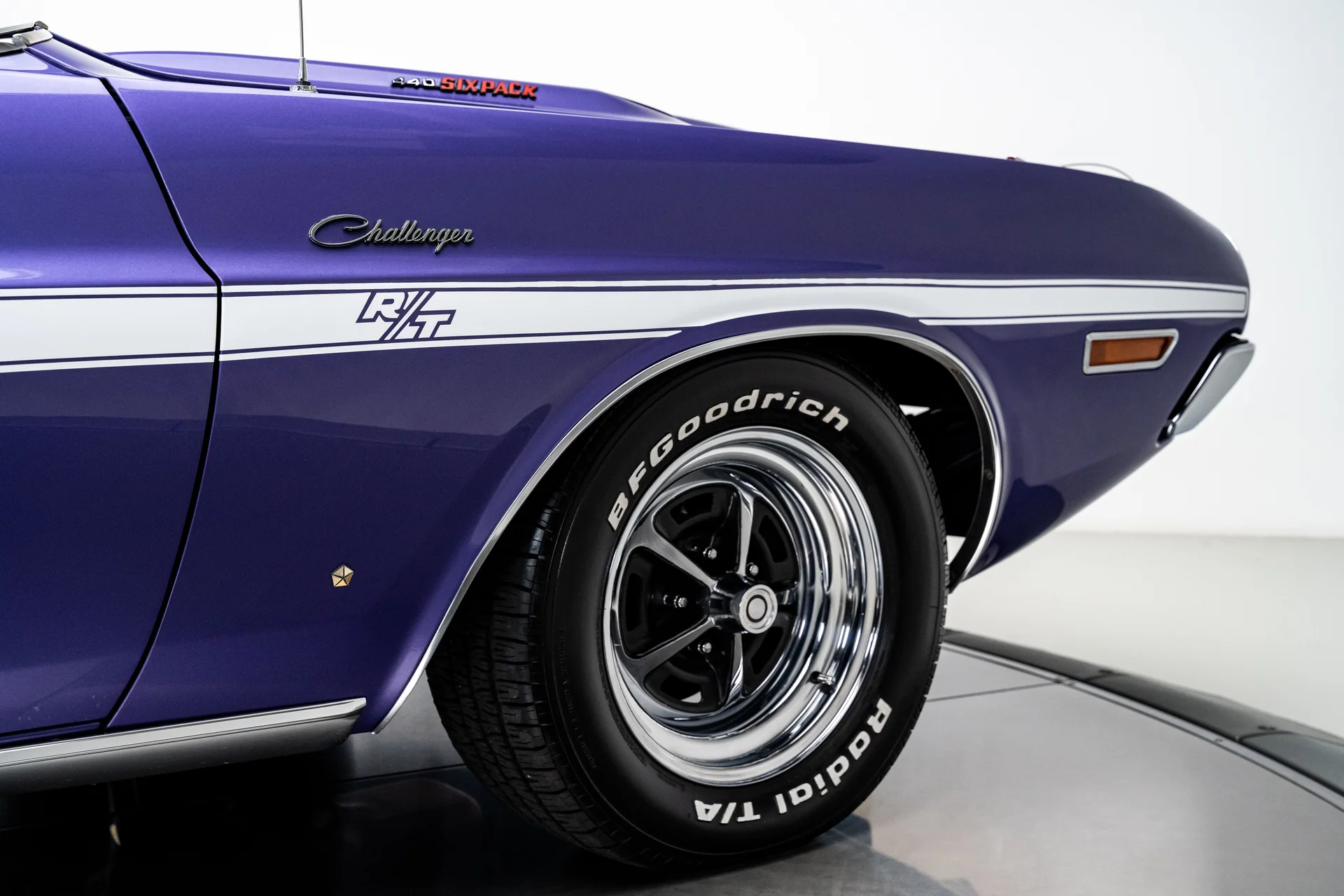 Com um acabamento em um vibrante tom de roxo Plum Crazy de alto impacto e faixas nítidas no estilo R/T, a carroceria apresenta linhas marcantes, proporções confiantes e a inconfundível imponência que define o design do Challenger. O carro passou por uma restauração profissional concluída em 2011 pela Quintin Brothers Auto and Performance. Para-choques cromados, emblemas R/T e acabamentos originais de fábrica permanecem intactos, conferindo ao carro uma aparência sóbria e condizente com a época. Equipado com rodas de 15 polegadas e pneus BFGoodrich Radial T/A, o visual é exatamente o que deveria ser.