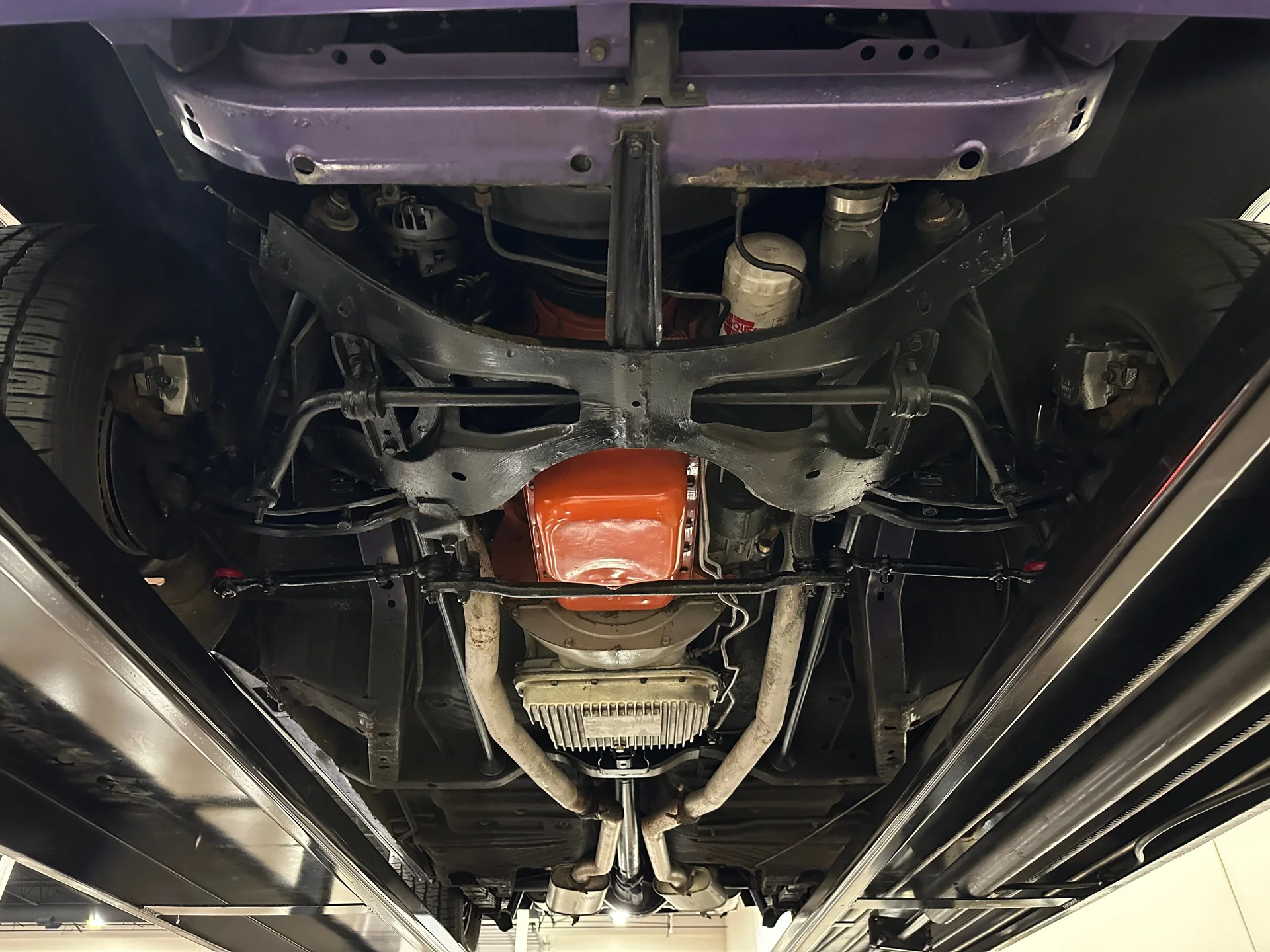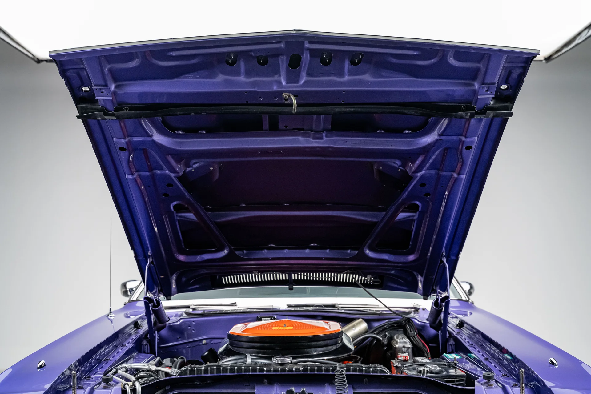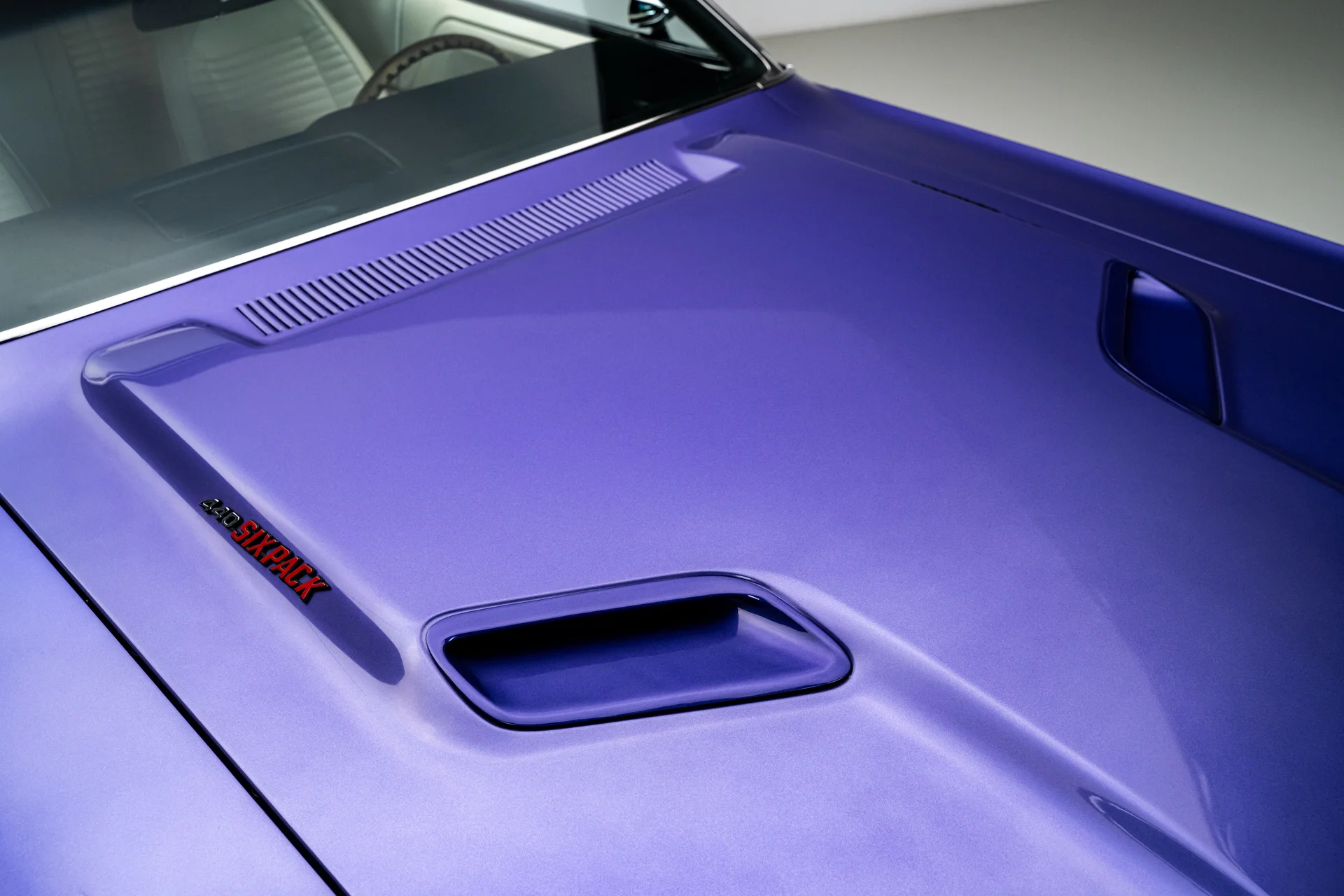 Originalmente encomendado com um motor V8 small-block, o carro agora abriga um V8 de 440 polegadas cúbicas (7,2 litros) com sistema de indução Six Pack. O compartimento do motor apresenta-se limpo e autêntico, com destaque para o icônico filtro de ar laranja Six Pack e acabamentos originais de fábrica. Os novos carburadores Holley, instalados em 2025, aprimoram a resposta do acelerador e a dirigibilidade, mantendo o caráter mecânico que define o desempenho dos motores V8 big-block da Mopar. A potência é transmitida por uma comprovada transmissão automática Torqueflite A727 de 3 velocidades, enquanto o sistema de escapamento duplo, também original de fábrica, proporciona um ronco grave e imponente. O chassi permanece fiel às raízes muscle da Mopar, com suspensão dianteira de barra de torção e feixes de molas na traseira, apoiado por um eixo traseiro de 8 3/4″ com relação de 3,23. A direção hidráulica e os freios a disco dianteiros com assistência hidráulica melhoram significativamente o comportamento na estrada, tornando o carro muito mais acessível do que seu tamanho poderia sugerir.