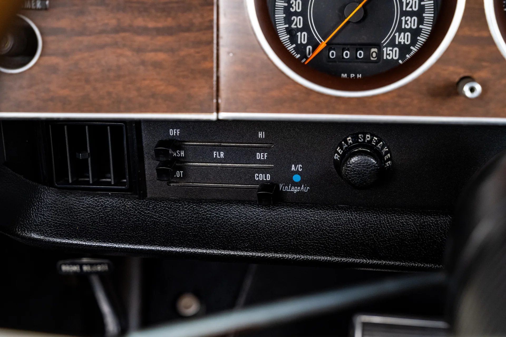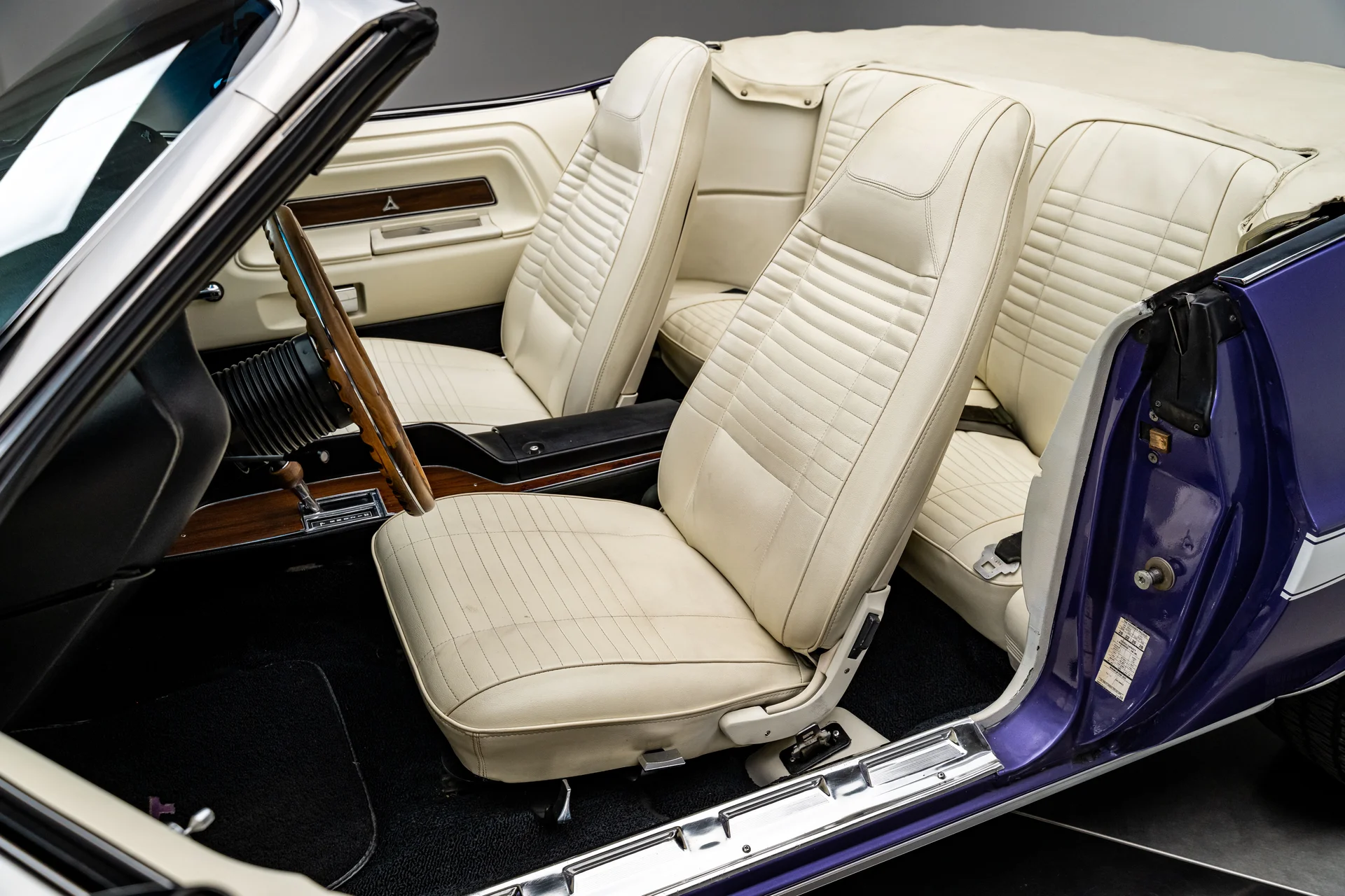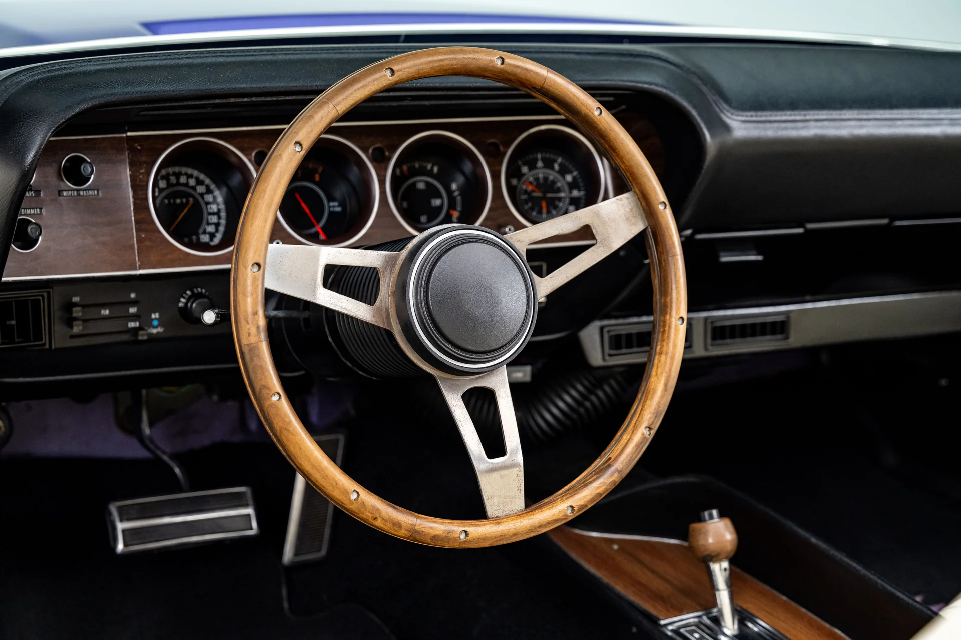 Por dentro, o interior claro proporciona um contraste marcante com a cor externa vibrante, conferindo à cabine uma sensação surpreendentemente refinada. Os bancos individuais e o banco traseiro mantêm o padrão e o perfil originais. O painel permanece original, apresentando um conjunto completo de instrumentos Rallye emoldurado em acabamento amadeirado, rádio no estilo de fábrica e comandos originais. Um volante com aro de madeira adiciona um toque de aconchego e personalidade, combinando naturalmente com o console em madeira e a alavanca de câmbio automática com estilo “slap stick”, que definem os interiores de alto desempenho da Mopar da época. O sistema de ar condicionado Vintage Air está discretamente integrado, oferecendo climatização moderna sem comprometer a estética original de fábrica.