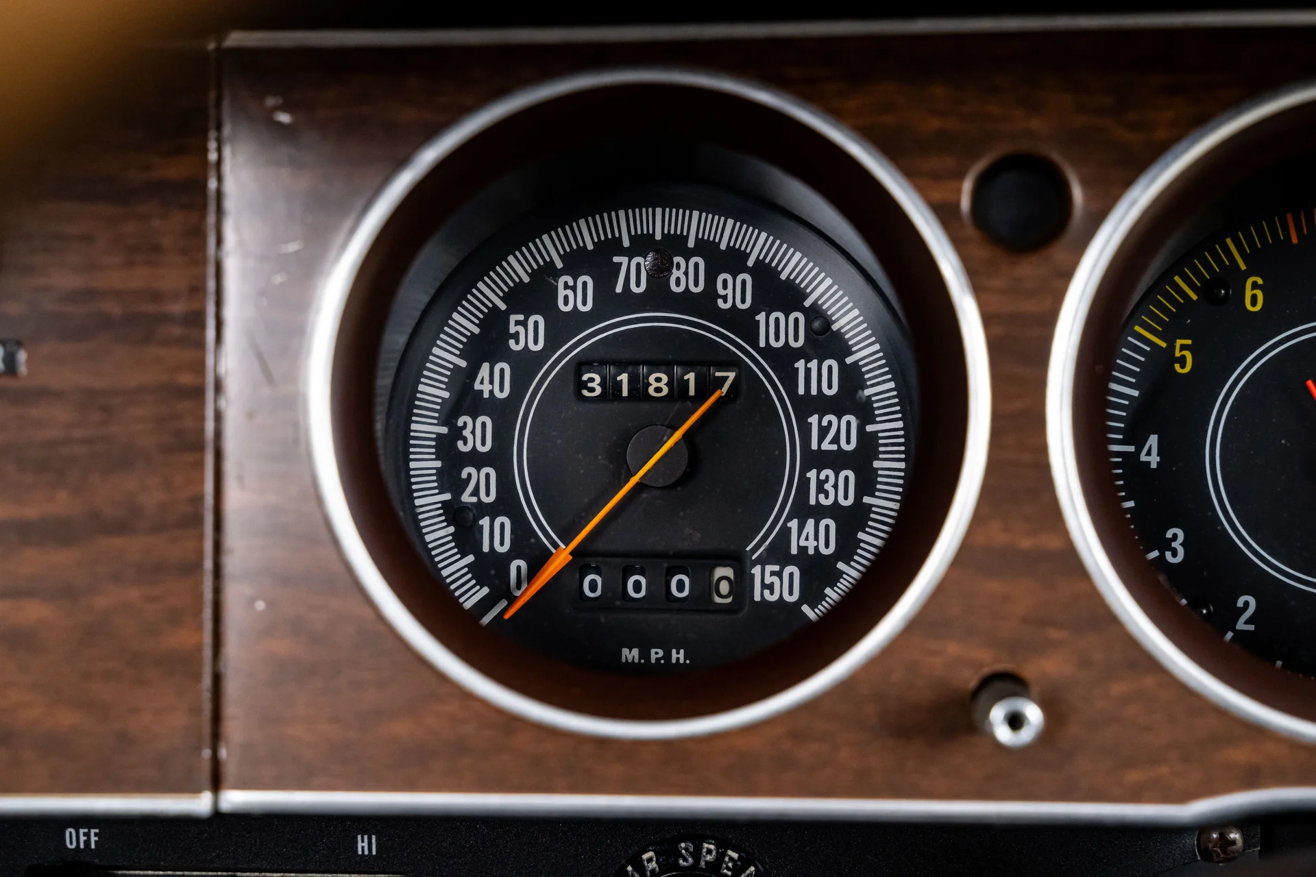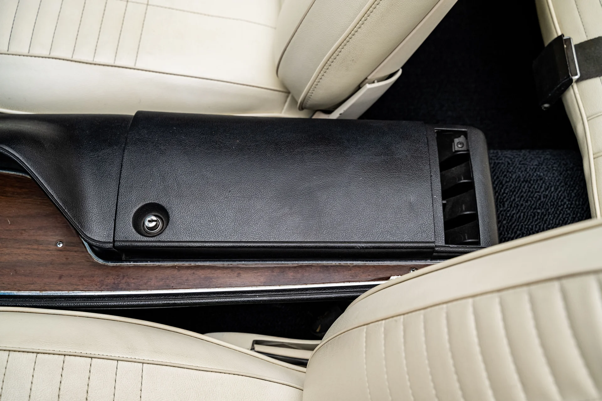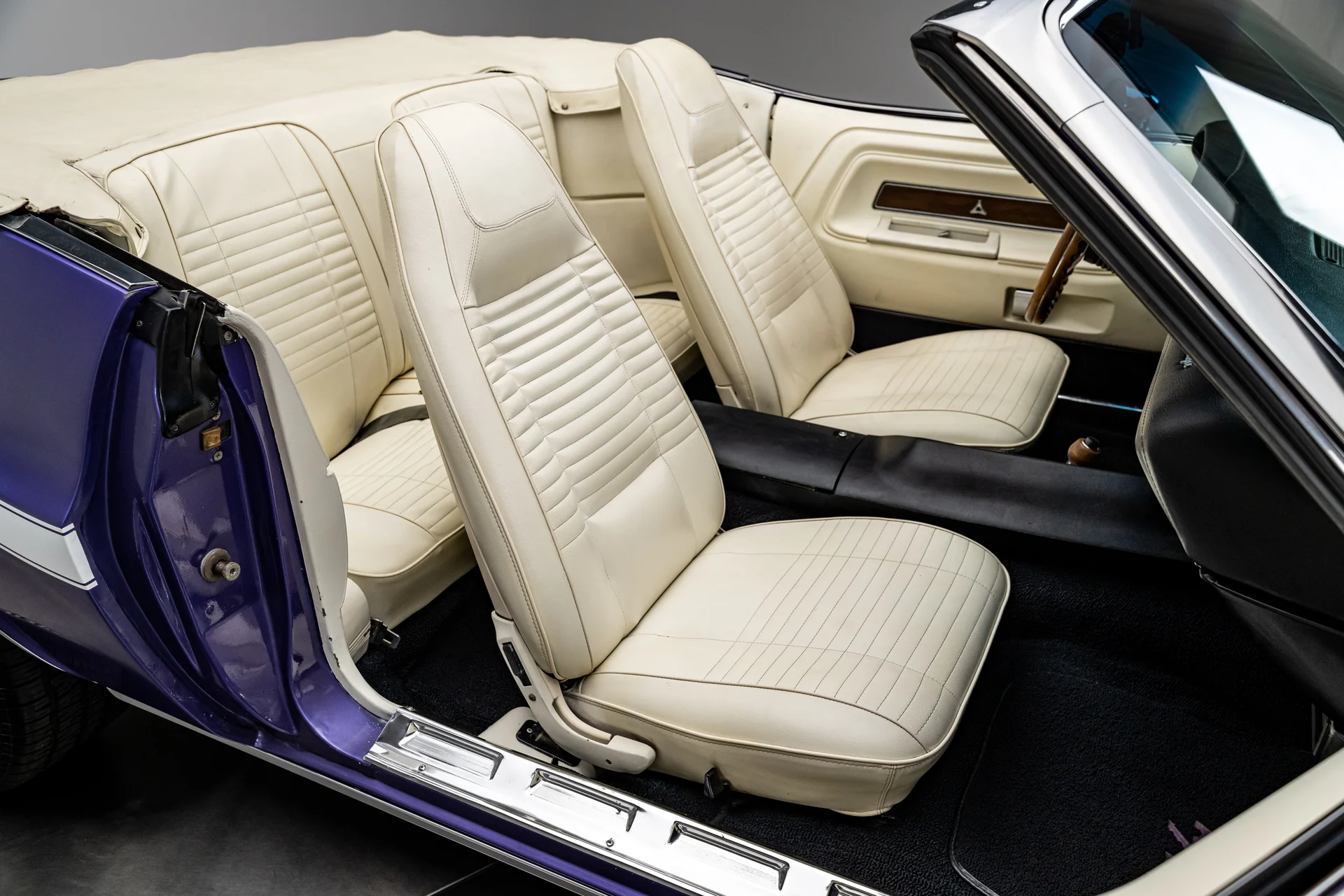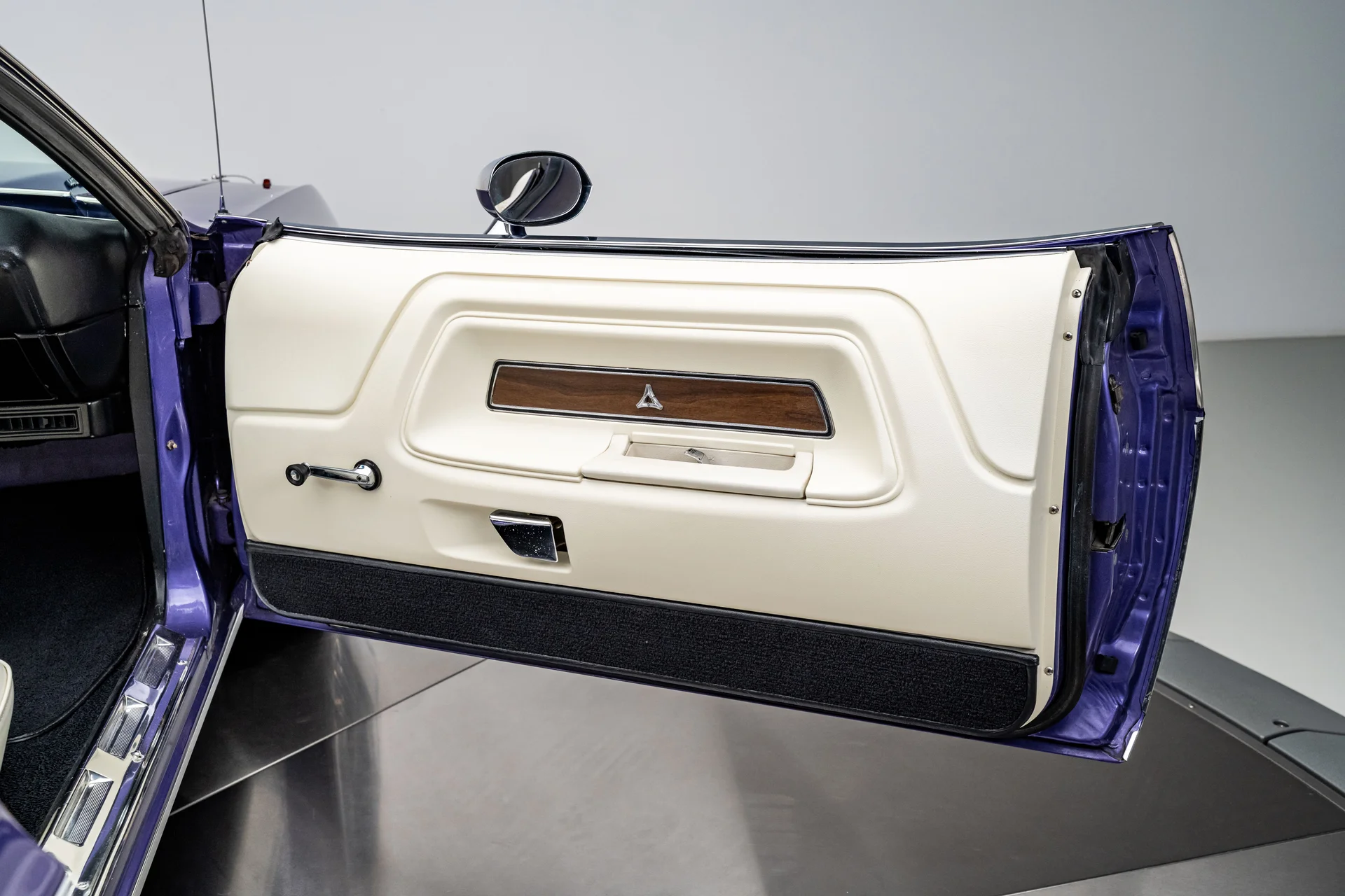 Por dentro, o interior claro proporciona um contraste marcante com a cor externa vibrante, conferindo à cabine uma sensação surpreendentemente refinada. Os bancos individuais e o banco traseiro mantêm o padrão e o perfil originais. O painel permanece original, apresentando um conjunto completo de instrumentos Rallye emoldurado em acabamento amadeirado, rádio no estilo de fábrica e comandos originais. Um volante com aro de madeira adiciona um toque de aconchego e personalidade, combinando naturalmente com o console em madeira e a alavanca de câmbio automática com estilo “slap stick”, que definem os interiores de alto desempenho da Mopar da época. O sistema de ar condicionado Vintage Air está discretamente integrado, oferecendo climatização moderna sem comprometer a estética original de fábrica.