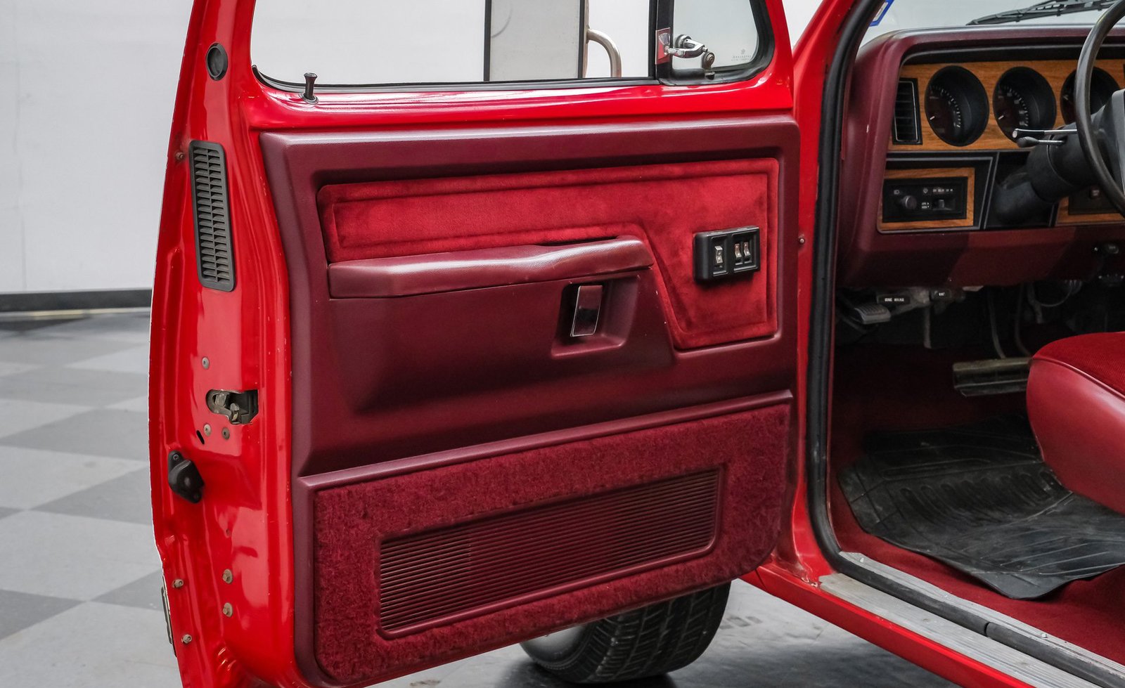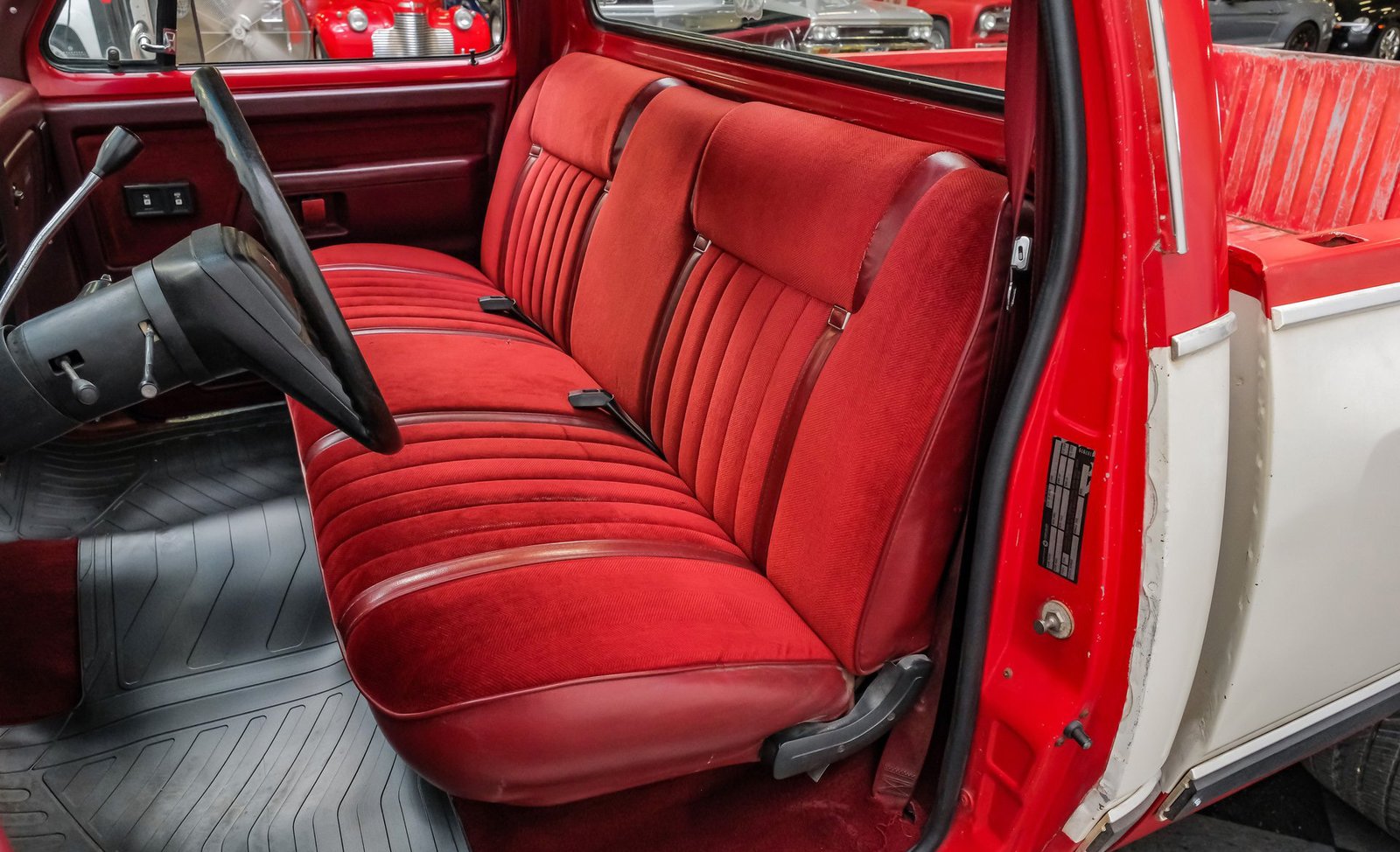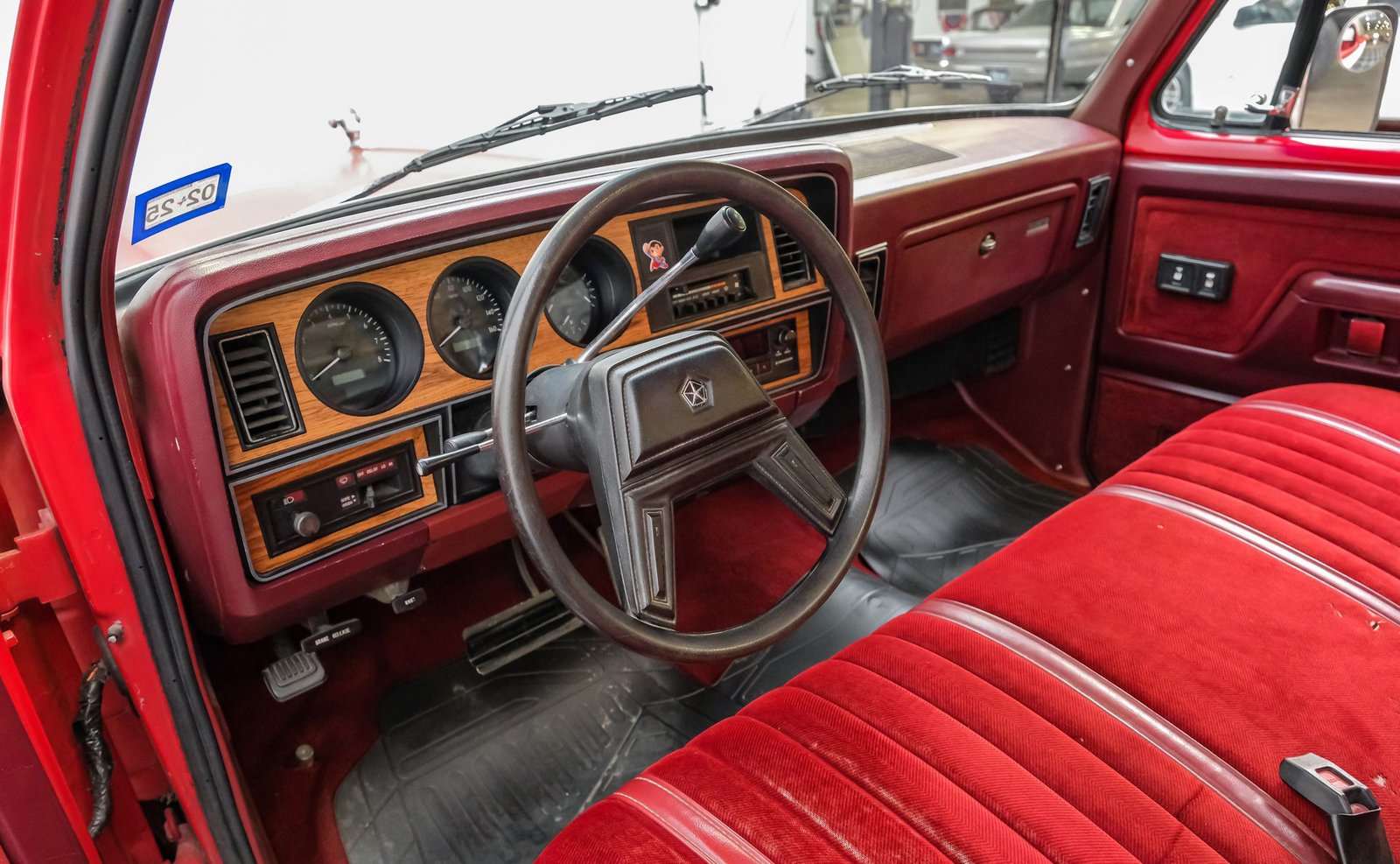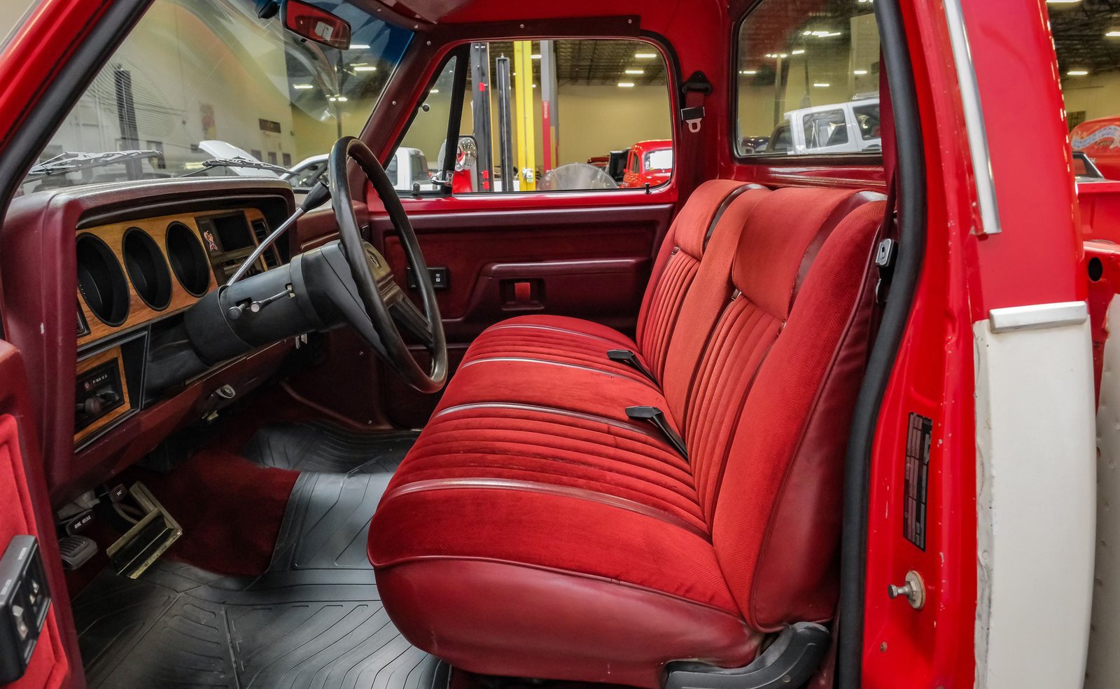 Ao entrar, você encontrará um banco inteiriço em tecido e vinil bordô bem conservado, que oferece conforto e estilo vintage. O interior conta com volante com ajuste de inclinação, vidros e travas elétricas, e painéis de porta impecáveis que complementam o visual geral. Detalhes modernos, como os instrumentos digitais Dakota, se integram perfeitamente ao rádio AM/FM clássico. Os detalhes em madeira ao redor do painel adicionam um toque refinado, enquanto o carpete limpo e o tapete de vinil emborrachado mantêm a cabine com aparência impecável.