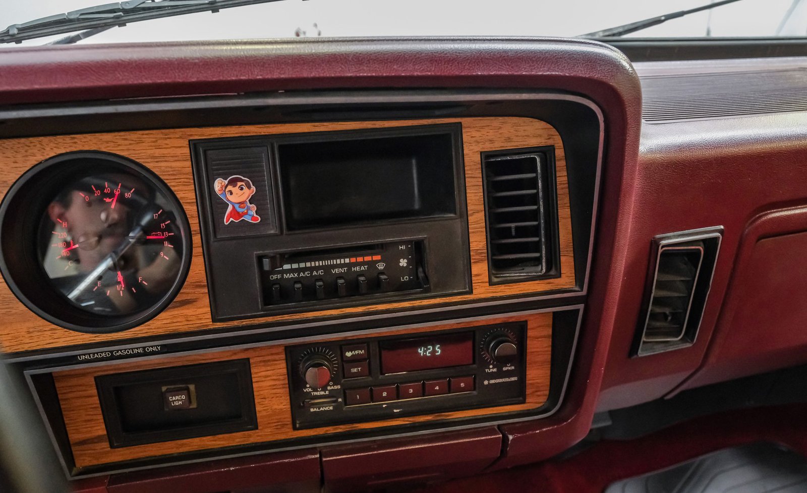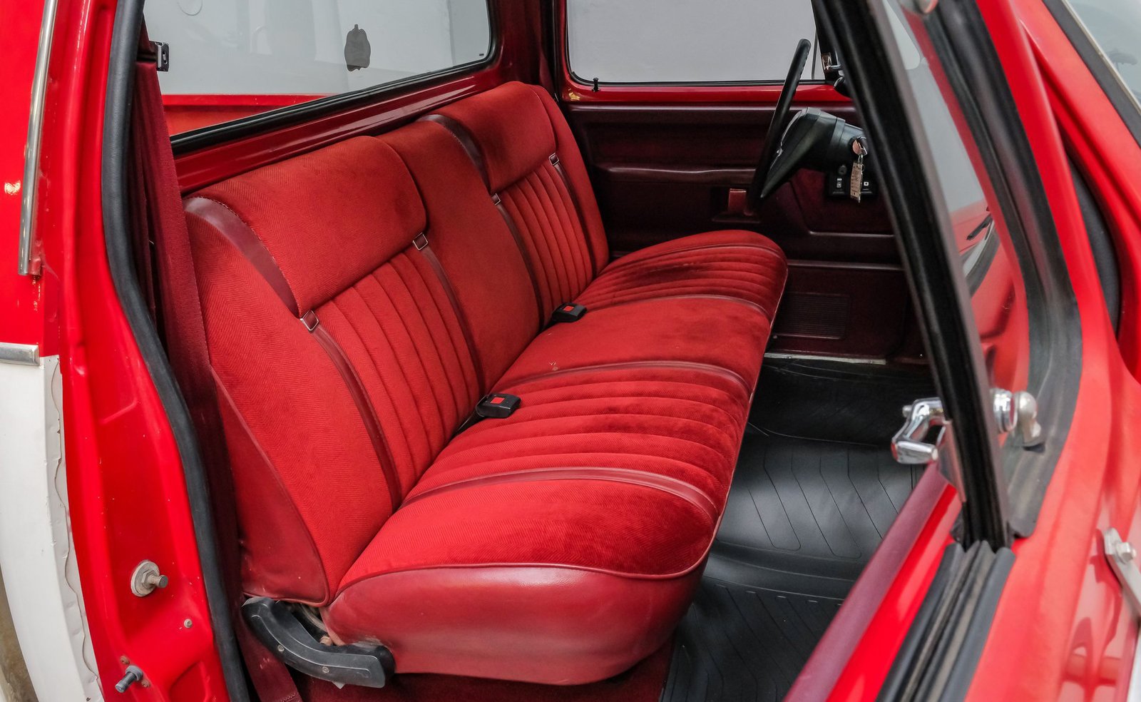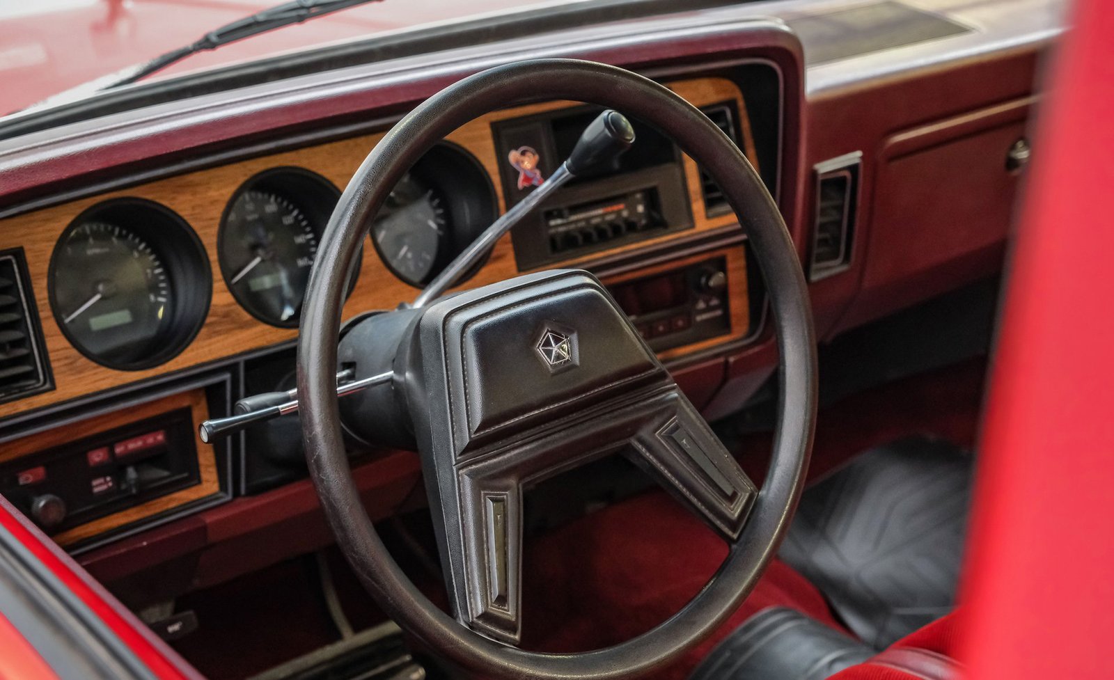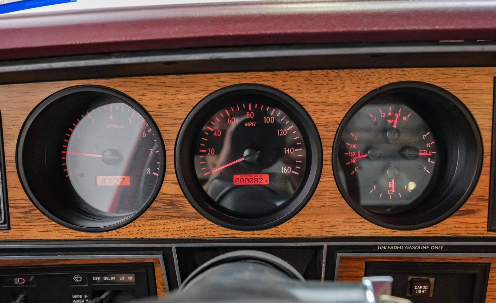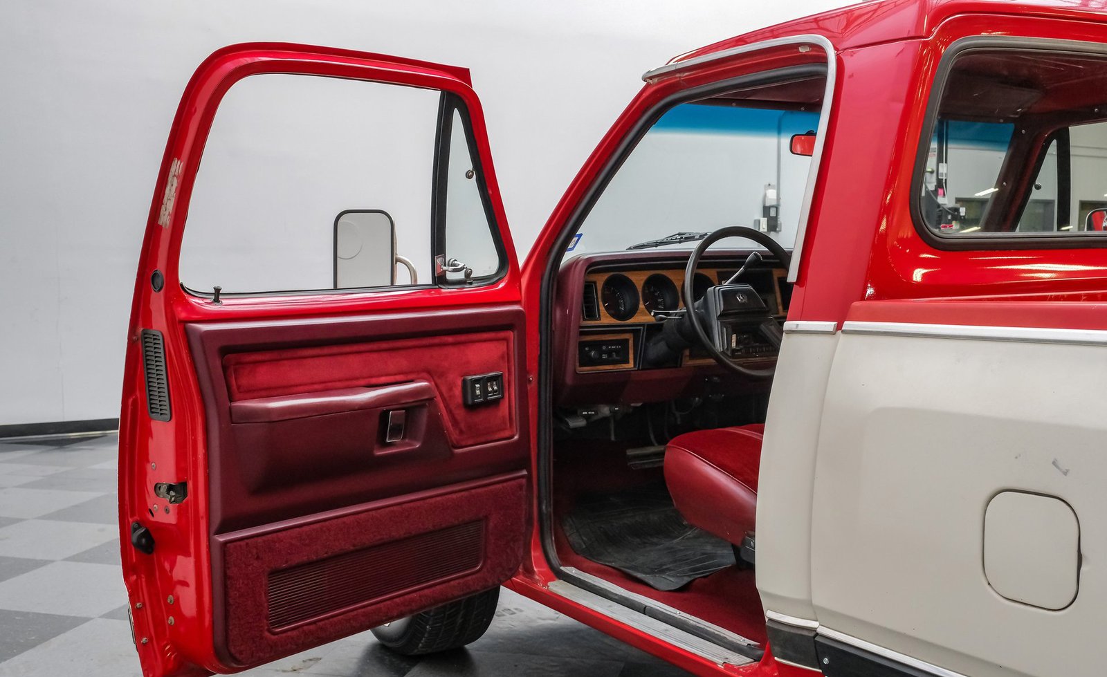 Ao entrar, você encontrará um banco inteiriço em tecido e vinil bordô bem conservado, que oferece conforto e estilo vintage. O interior conta com volante com ajuste de inclinação, vidros e travas elétricas, e painéis de porta impecáveis que complementam o visual geral. Detalhes modernos, como os instrumentos digitais Dakota, se integram perfeitamente ao rádio AM/FM clássico. Os detalhes em madeira ao redor do painel adicionam um toque refinado, enquanto o carpete limpo e o tapete de vinil emborrachado mantêm a cabine com aparência impecável.
