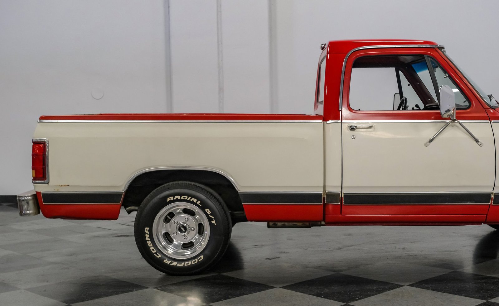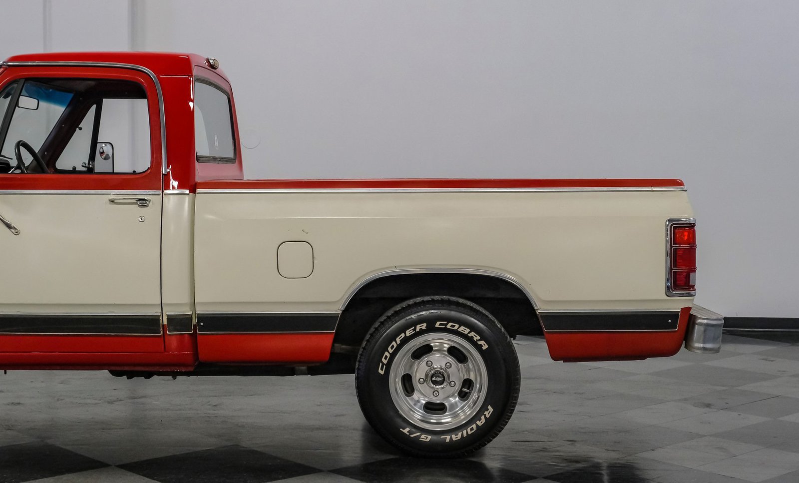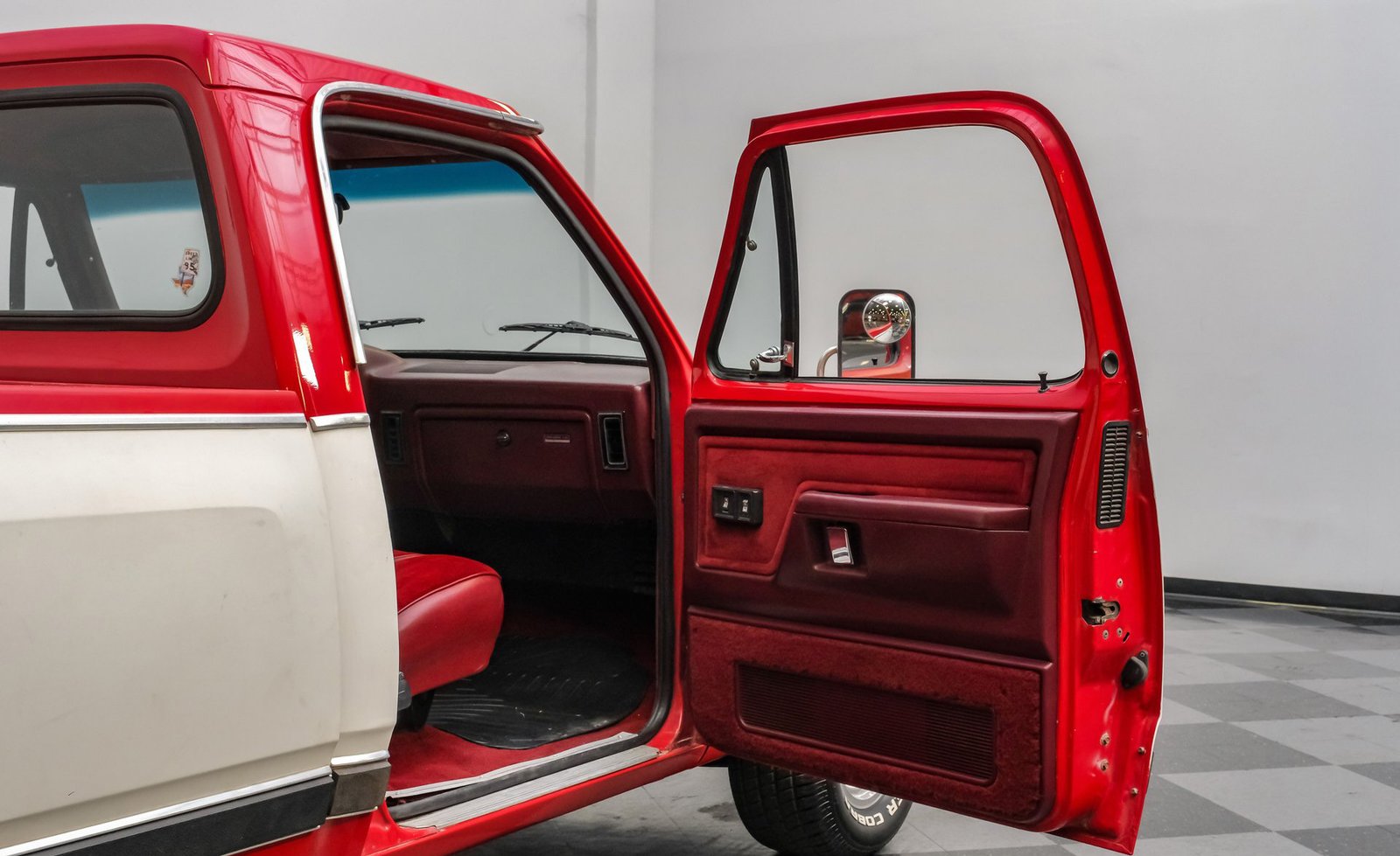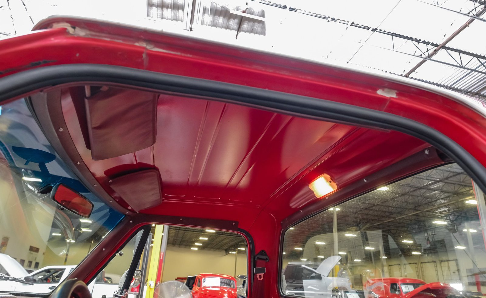 Ao entrar, você encontrará um banco inteiriço em tecido e vinil bordô bem conservado, que oferece conforto e estilo vintage. O interior conta com volante com ajuste de inclinação, vidros e travas elétricas, e painéis de porta impecáveis que complementam o visual geral. Detalhes modernos, como os instrumentos digitais Dakota, se integram perfeitamente ao rádio AM/FM clássico. Os detalhes em madeira ao redor do painel adicionam um toque refinado, enquanto o carpete limpo e o tapete de vinil emborrachado mantêm a cabine com aparência impecável.