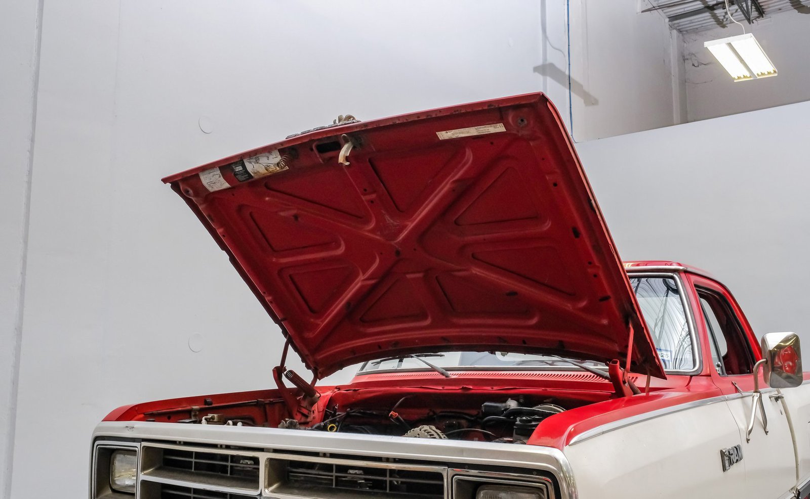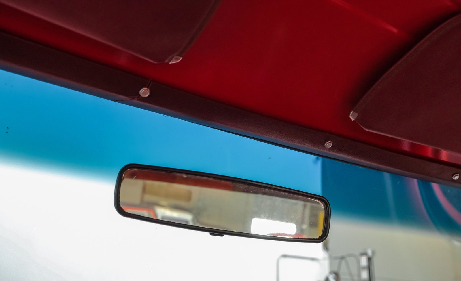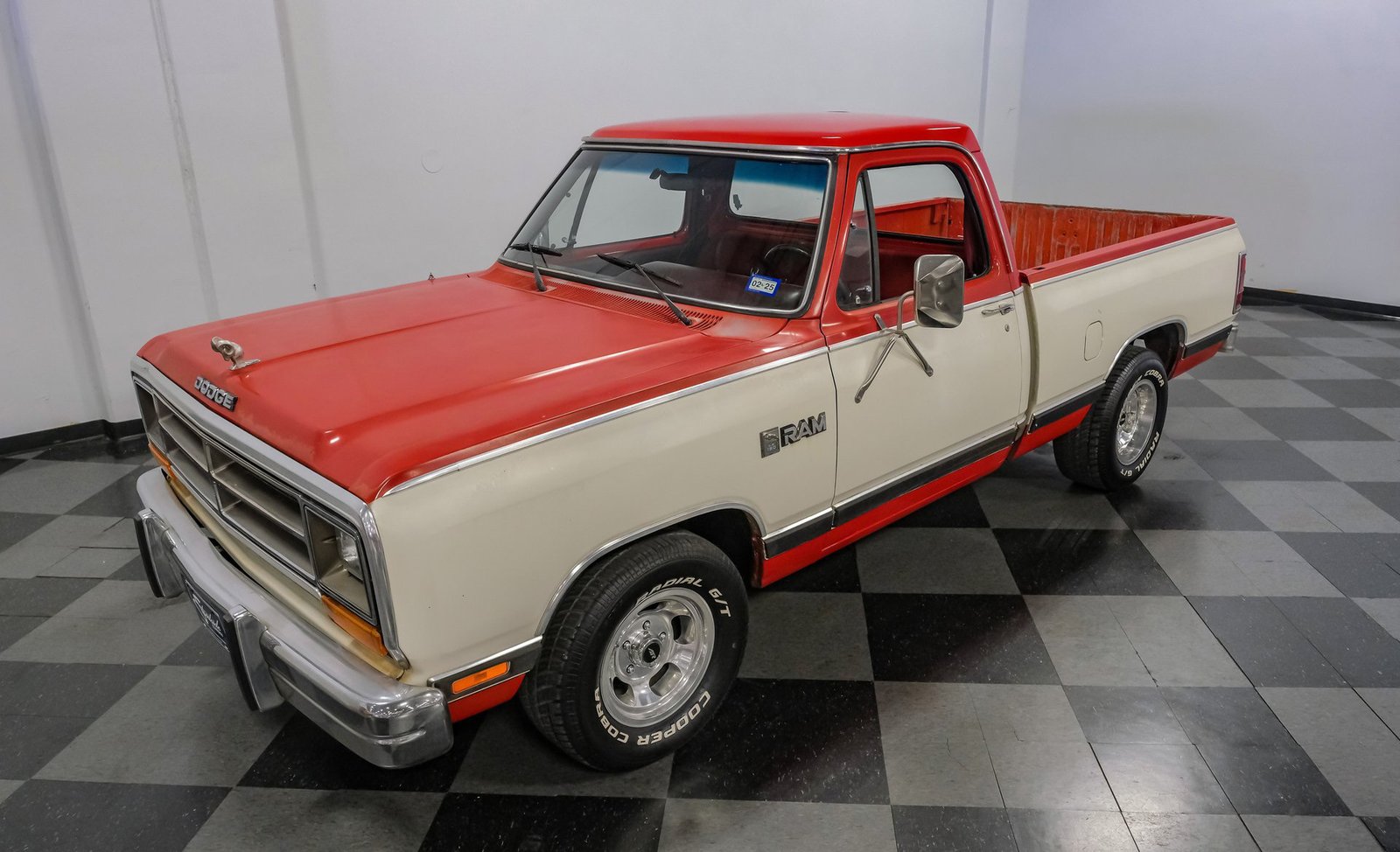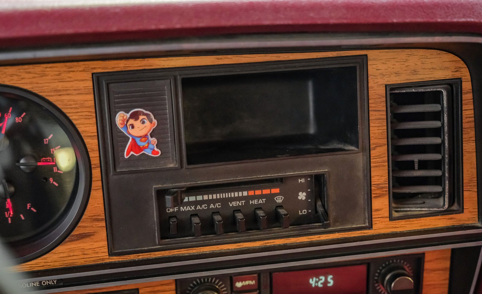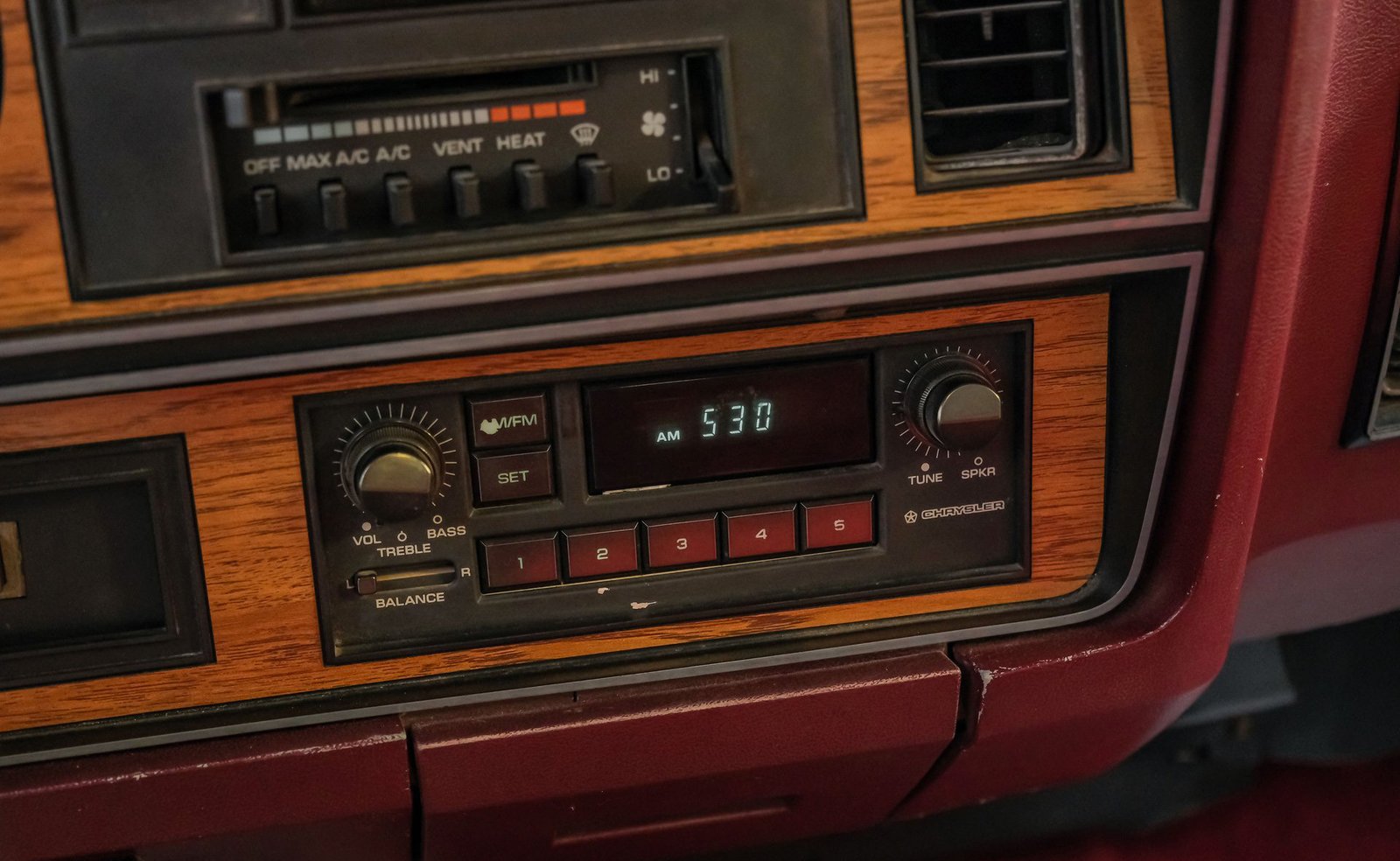 Ao entrar, você encontrará um banco inteiriço em tecido e vinil bordô bem conservado, que oferece conforto e estilo vintage. O interior conta com volante com ajuste de inclinação, vidros e travas elétricas, e painéis de porta impecáveis que complementam o visual geral. Detalhes modernos, como os instrumentos digitais Dakota, se integram perfeitamente ao rádio AM/FM clássico. Os detalhes em madeira ao redor do painel adicionam um toque refinado, enquanto o carpete limpo e o tapete de vinil emborrachado mantêm a cabine com aparência impecável.