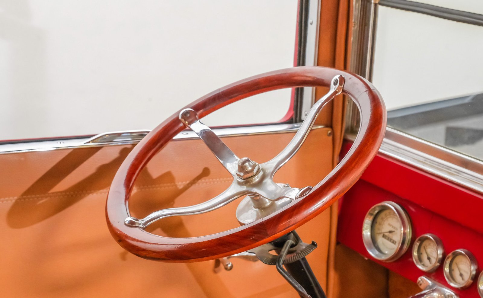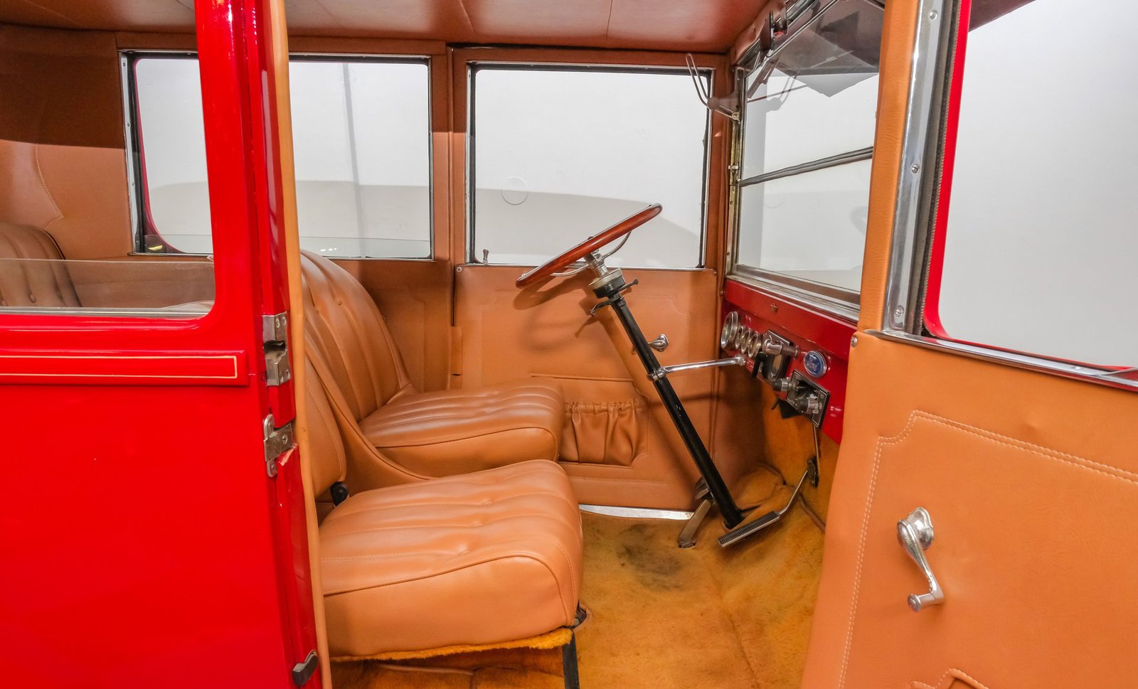 Por dentro, a cabine recebe você com um interior em tons de bege, convidativo e atemporal. Os bancos individuais e o banco traseiro em couro bege complementam os painéis das portas e o forro do teto, criando um ambiente acolhedor e harmonioso. Os mostradores clássicos do painel de instrumentos e o volante com aro de madeira intensificam o prazer tátil da experiência de dirigir, enquanto o vidro com acabamento fosco adiciona um toque refinado de elegância vintage.