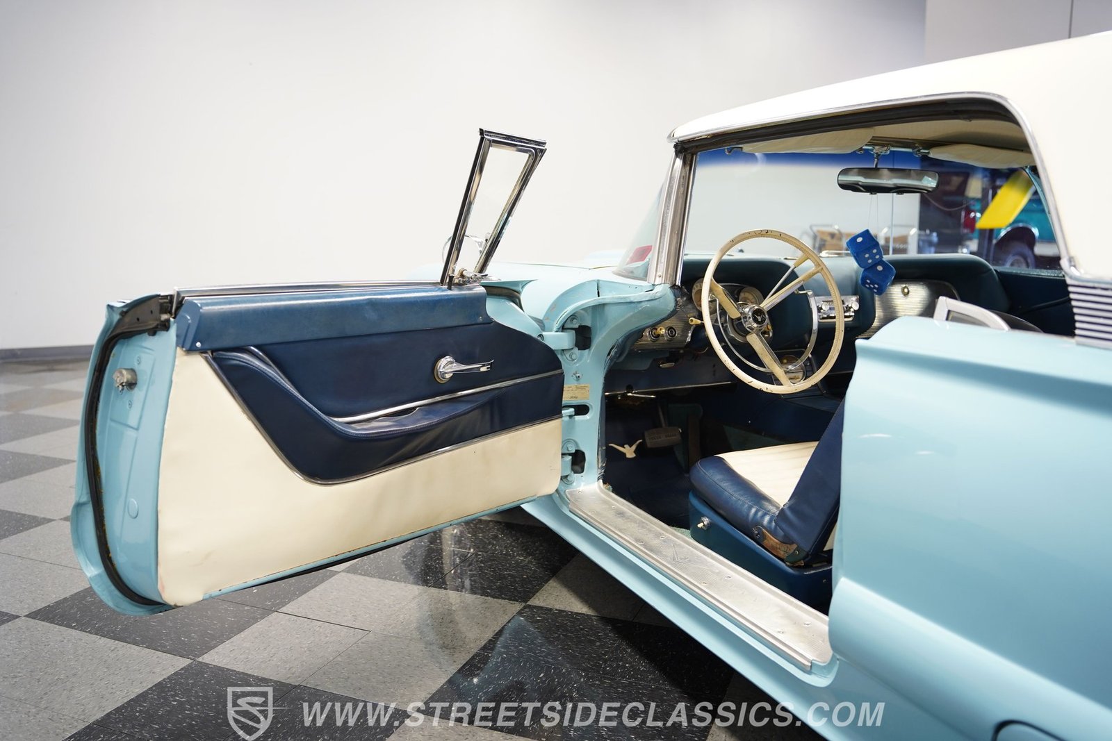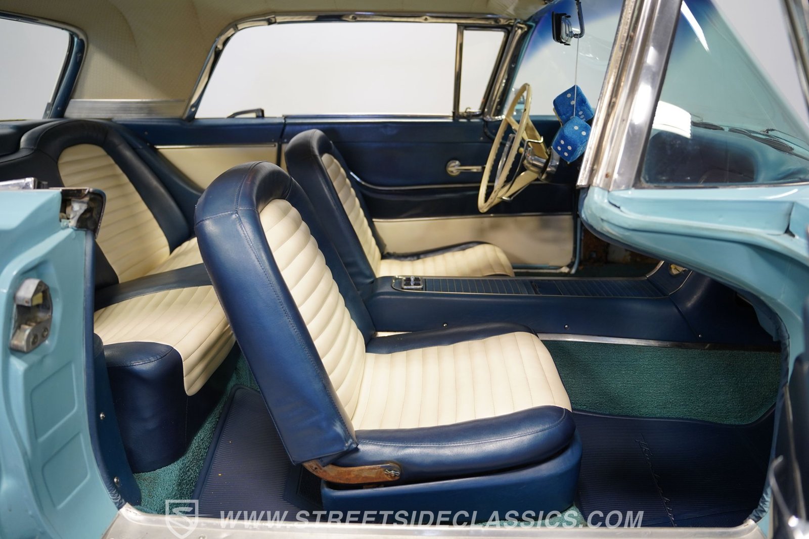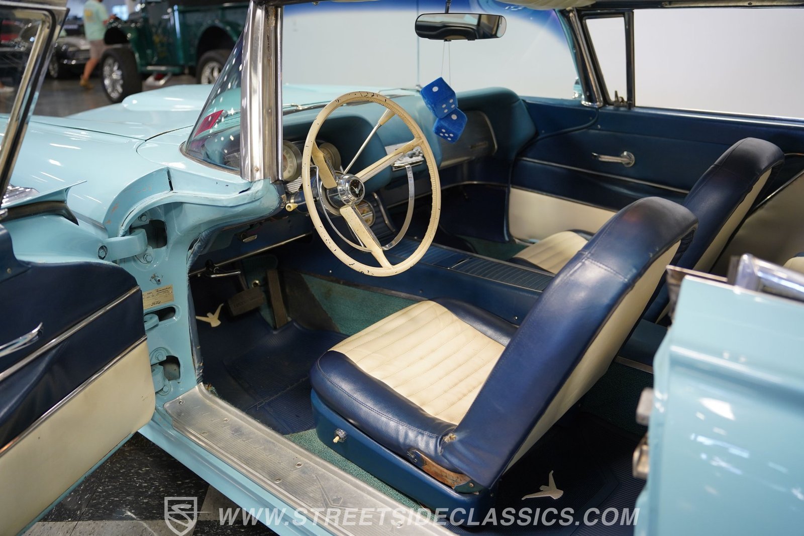 Por dentro, o Thunderbird oferece uma experiência interior simples, porém autêntica, dos anos 1950, com estofamento em vinil branco que carrega o charme da época. O forro do teto está firme e intacto, com o console central de comprimento total. Bancos e vidros elétricos aumentam o conforto e a conveniência, e um tacômetro instalado posteriormente na coluna de direção combina o estilo vintage com um toque de funcionalidade moderna.