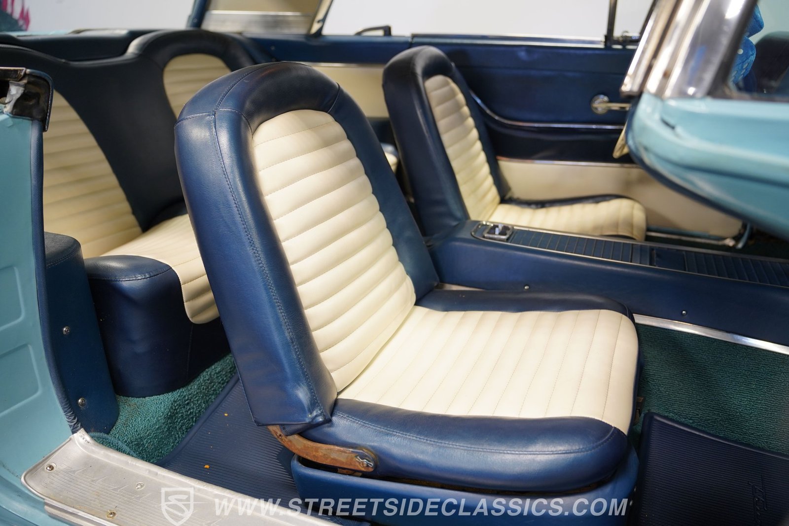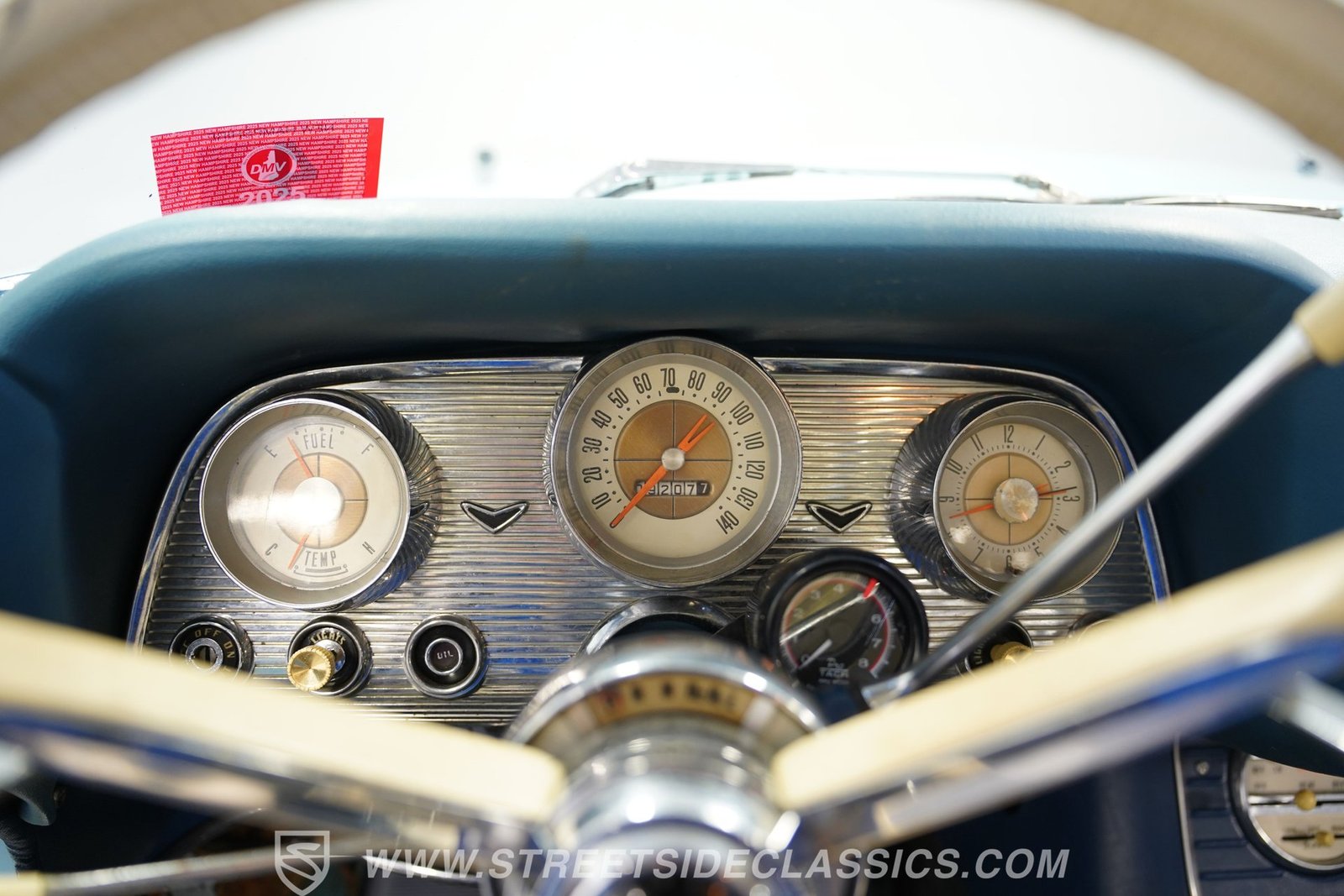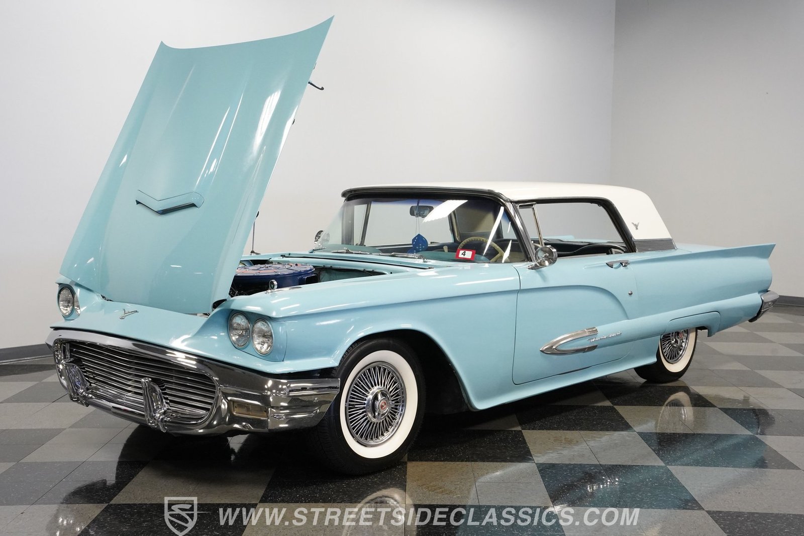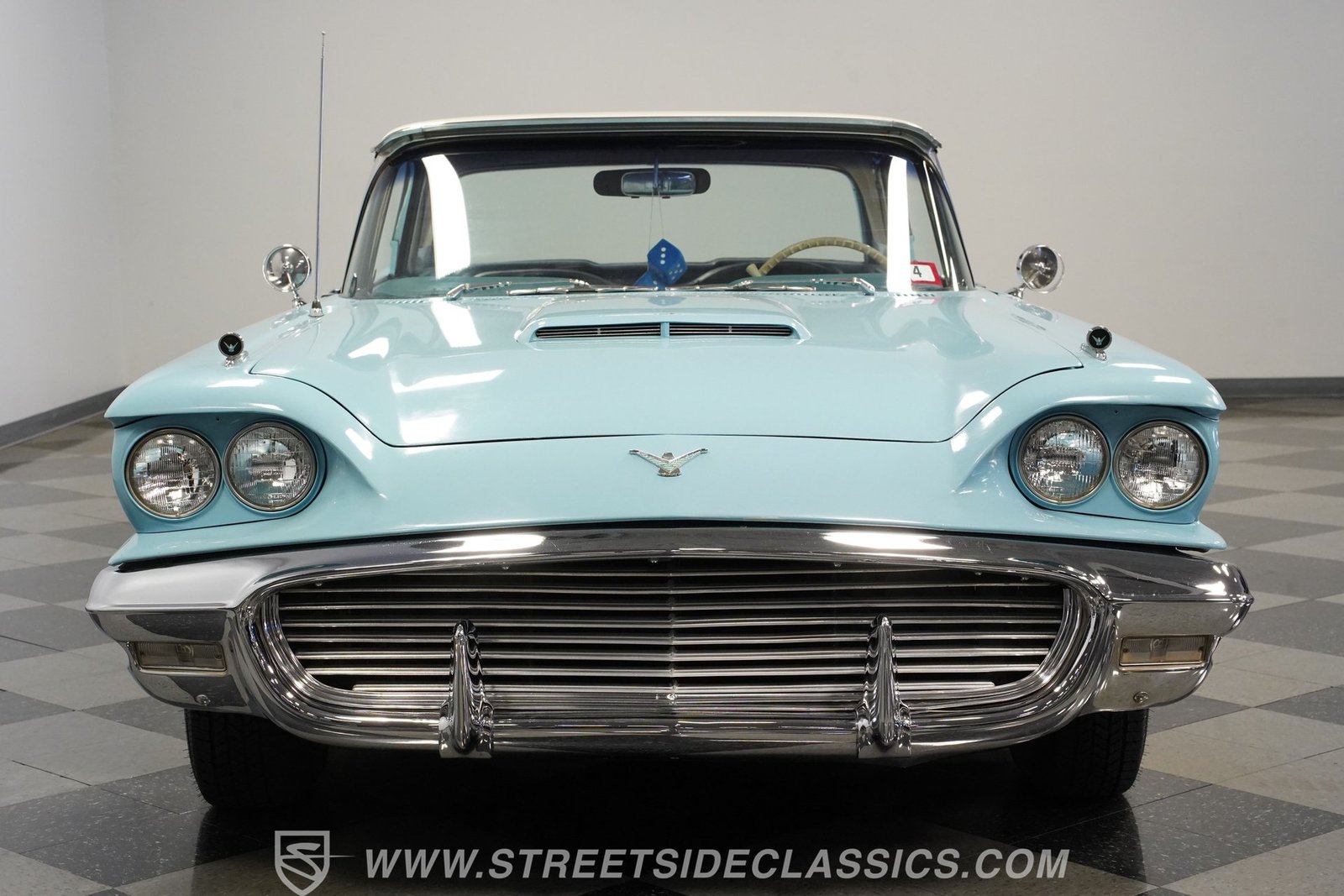 Por dentro, o Thunderbird oferece uma experiência interior simples, porém autêntica, dos anos 1950, com estofamento em vinil branco que carrega o charme da época. O forro do teto está firme e intacto, com o console central de comprimento total. Bancos e vidros elétricos aumentam o conforto e a conveniência, e um tacômetro instalado posteriormente na coluna de direção combina o estilo vintage com um toque de funcionalidade moderna.