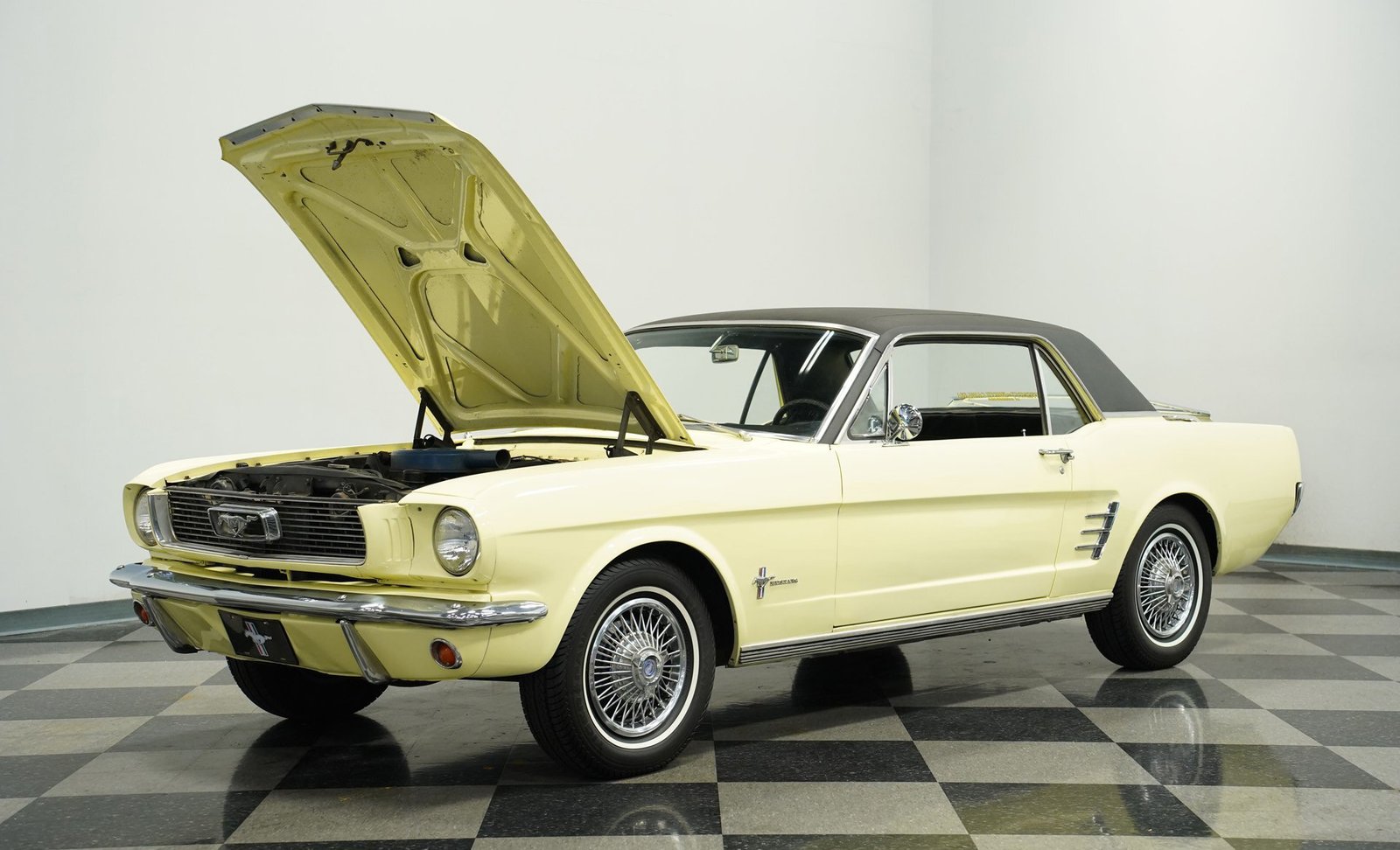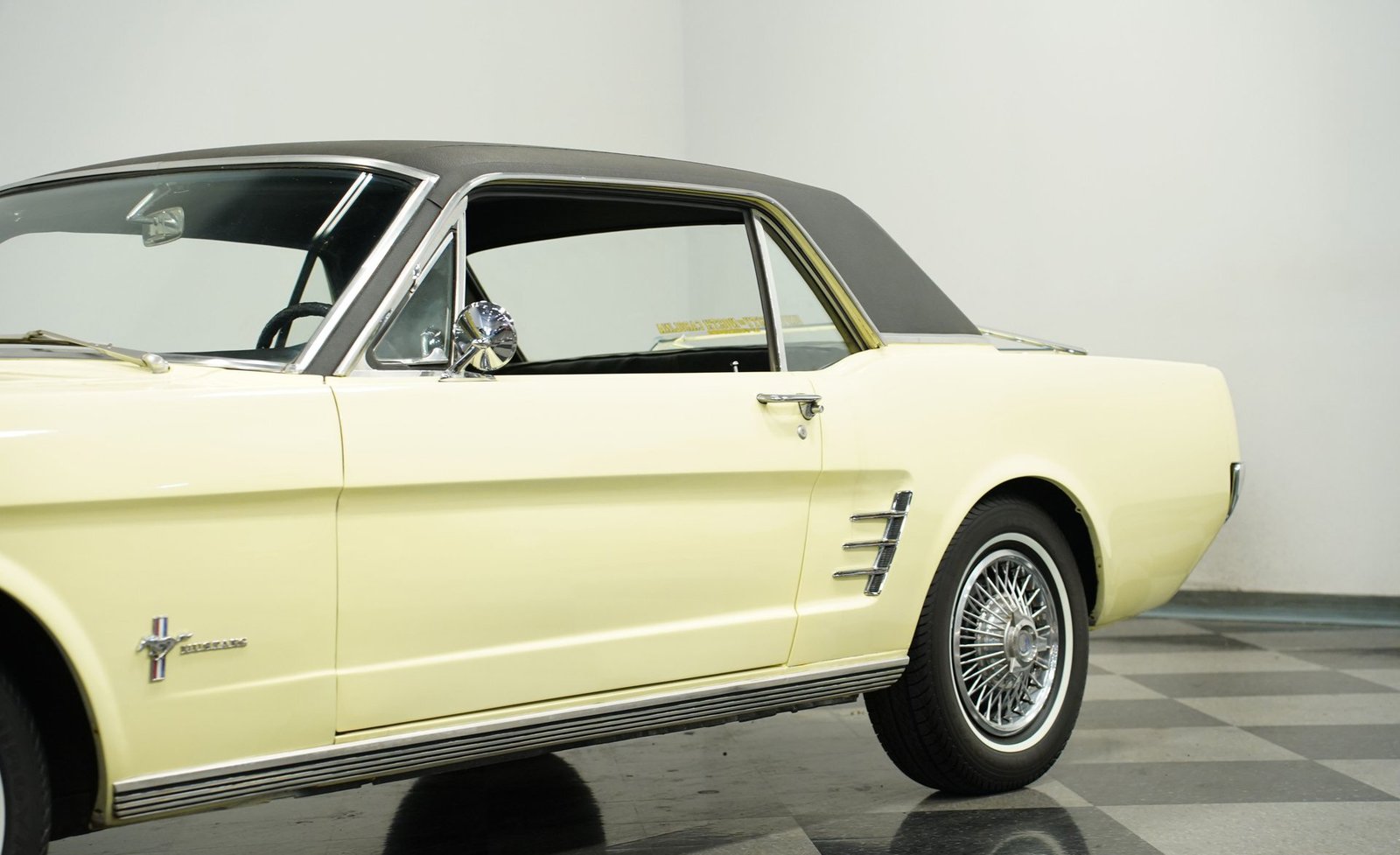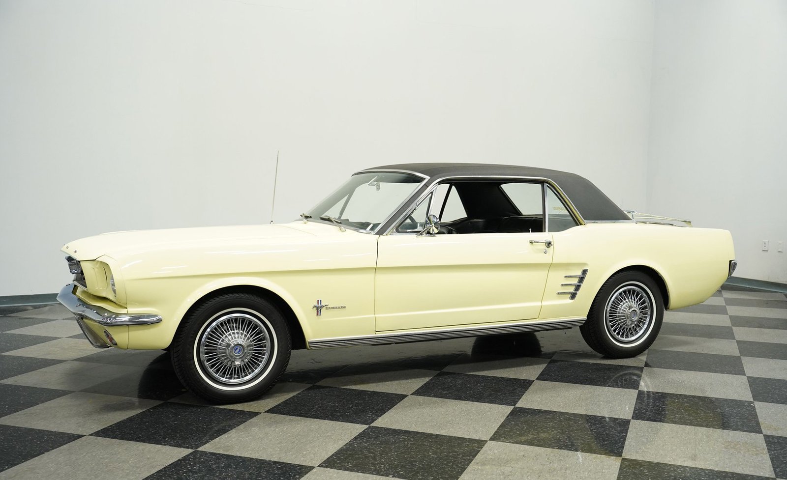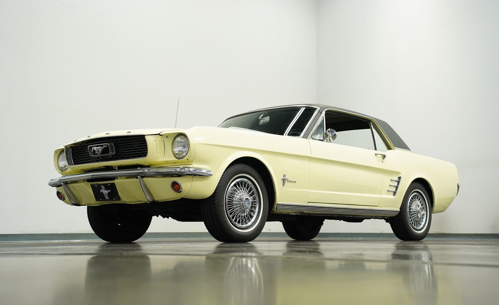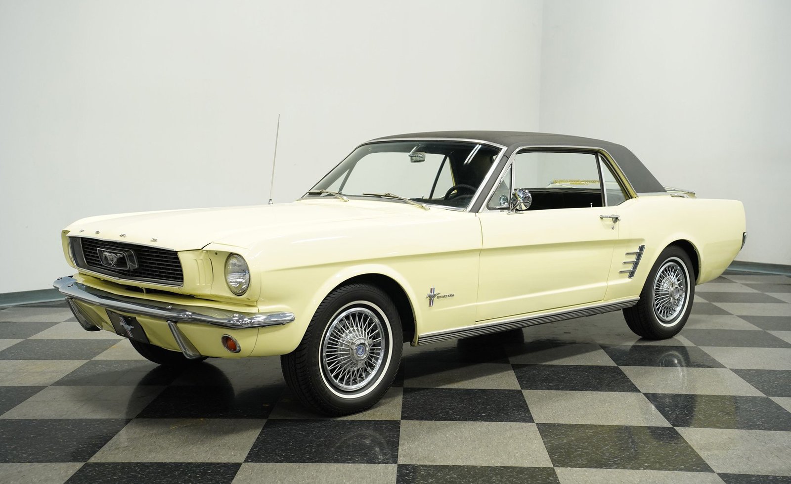 Sem dúvida, dirigir um Mustang de primeira geração pela estrada pode ser uma das melhores coisas que a vida tem a oferecer. Este Ford Mustang de 1966 foi totalmente repintado em amarelo vibrante, com capota rígida preta, exibindo suas linhas retas e postura agressiva de uma forma elegante e sofisticada de todos os ângulos.