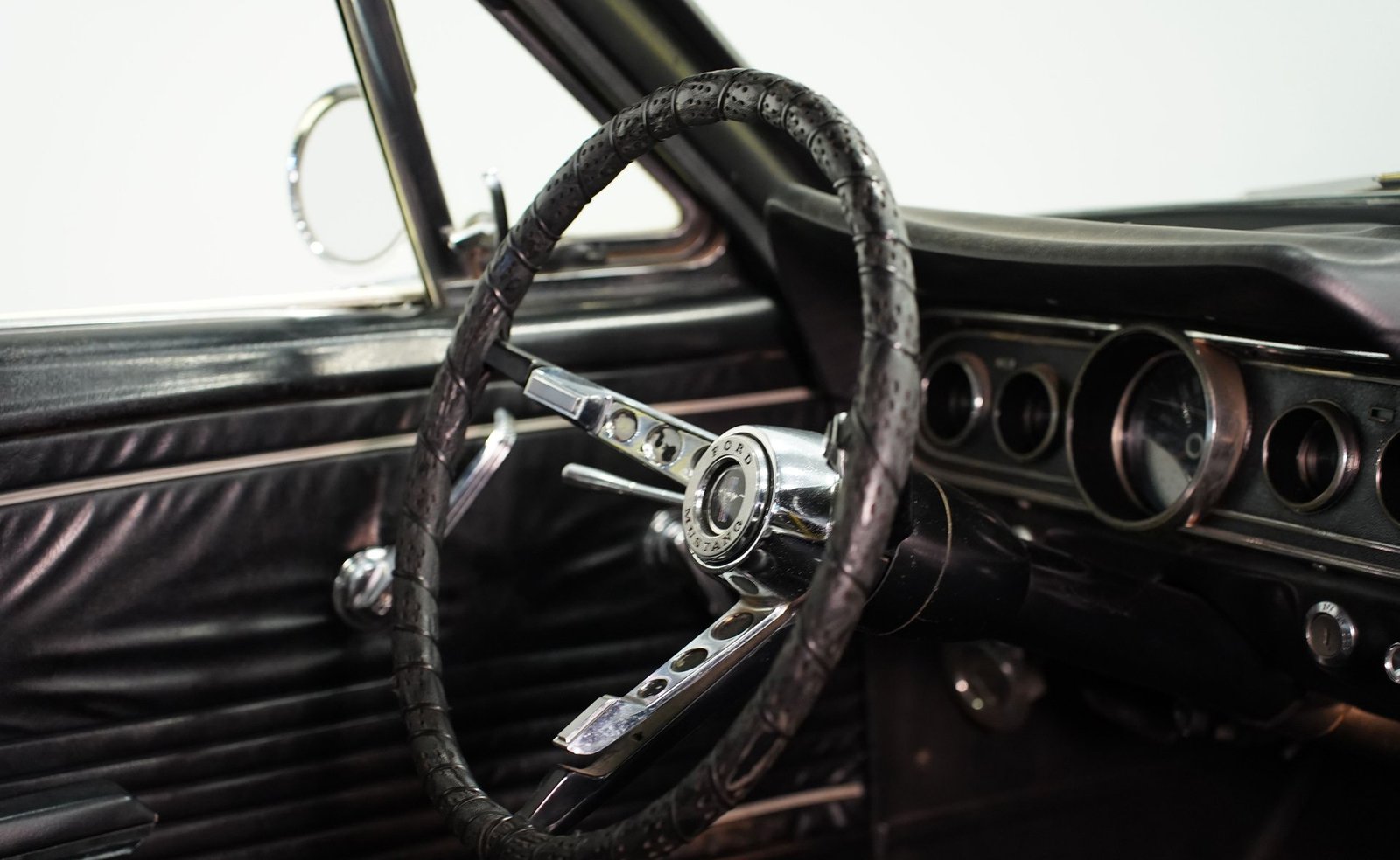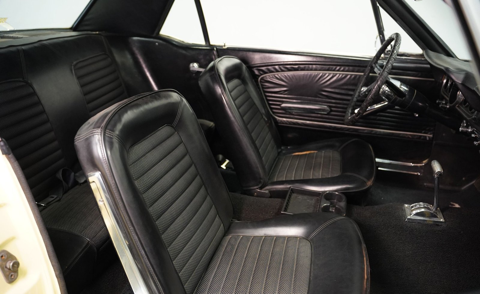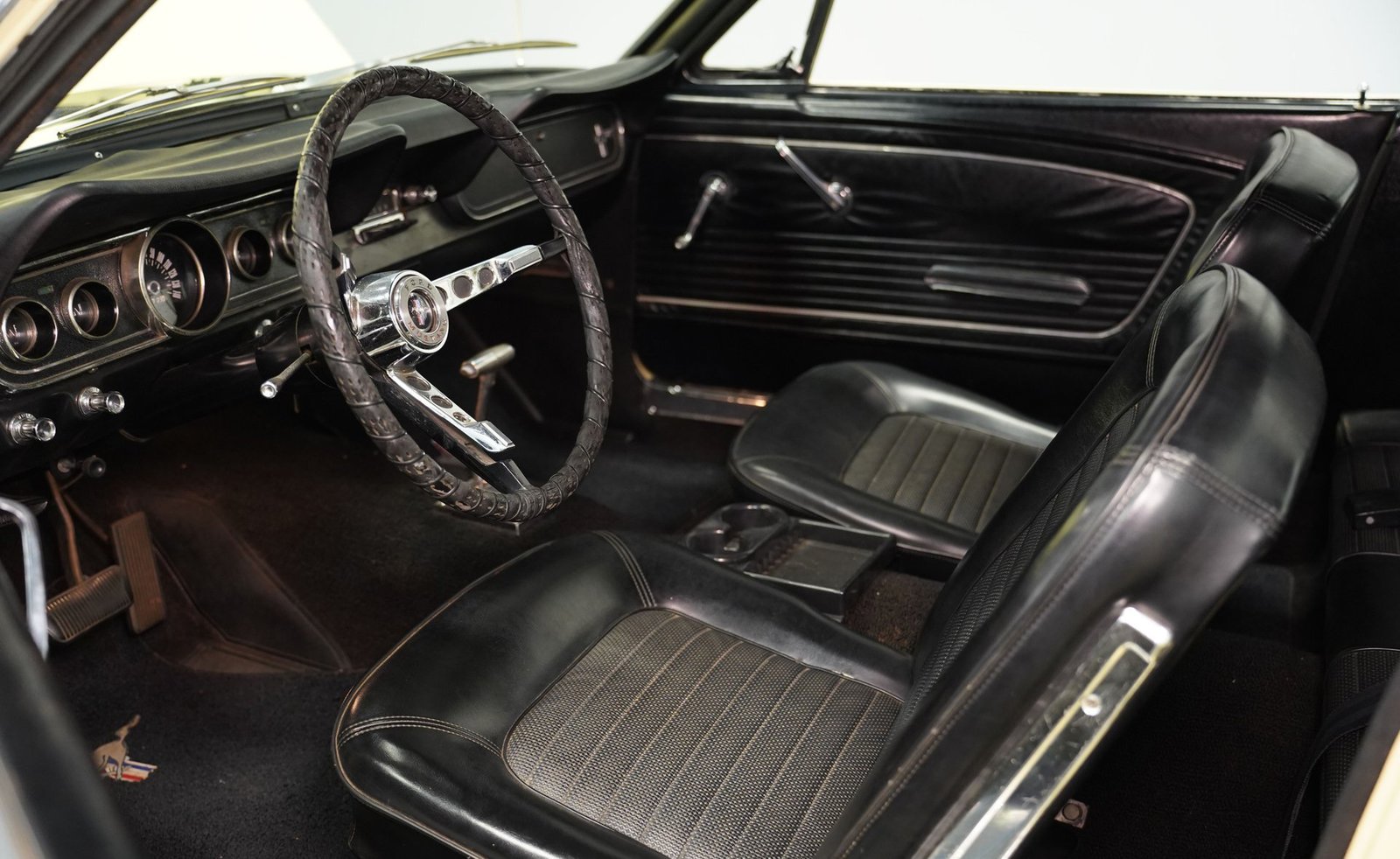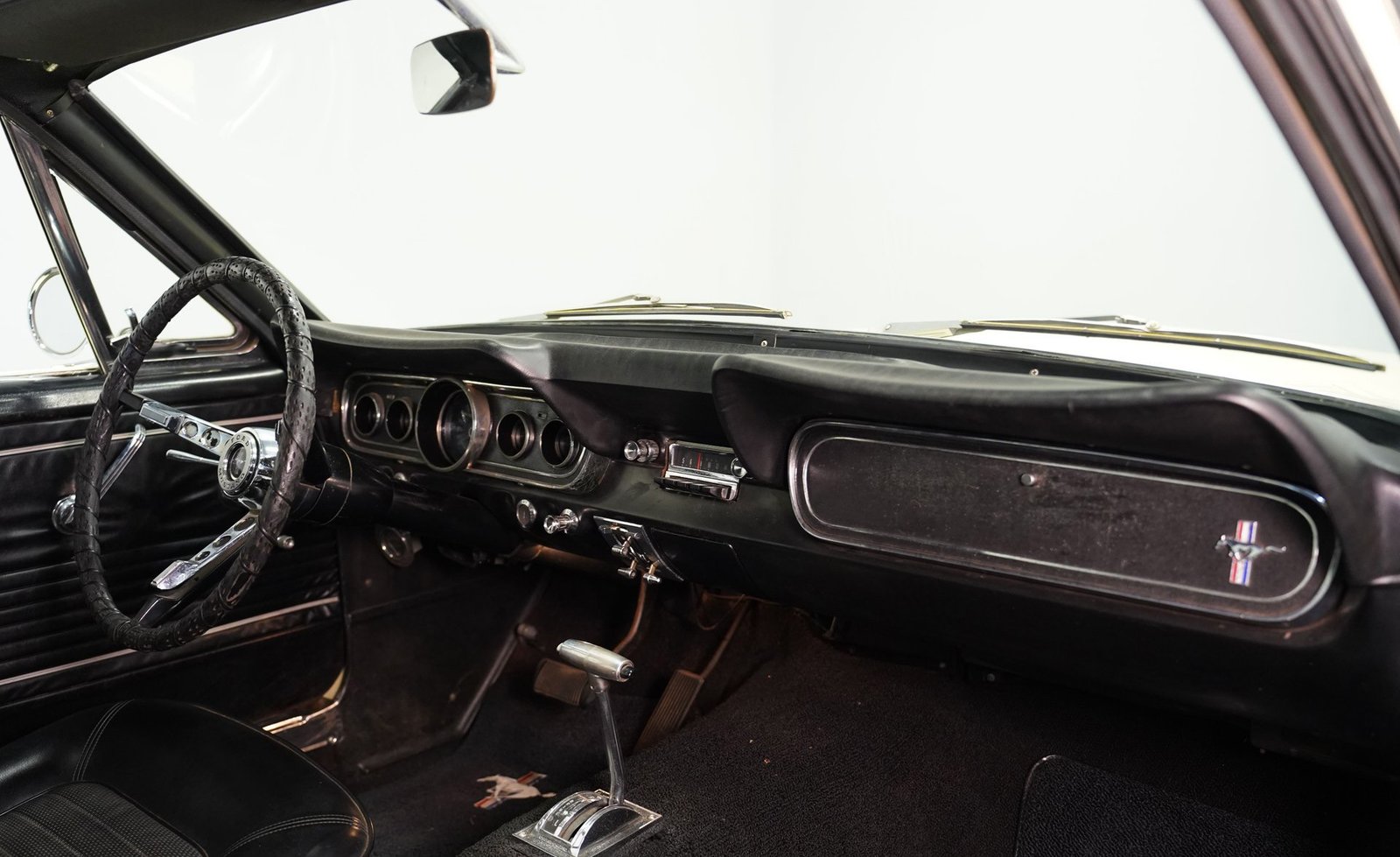 Por dentro, encontramos um interior em vinil preto com aparência original. Um volante de três raios exibe uma calota central com o emblema do Mustang, posicionado logo à frente de um painel de instrumentos com cinco mostradores, incluindo um grande velocímetro central de 140 mph (225 km/h). Os controles deslizantes do ar-condicionado facilitam o uso, enquanto o rádio AM com aparência original ajuda este Pony Car a manter seu charme clássico.