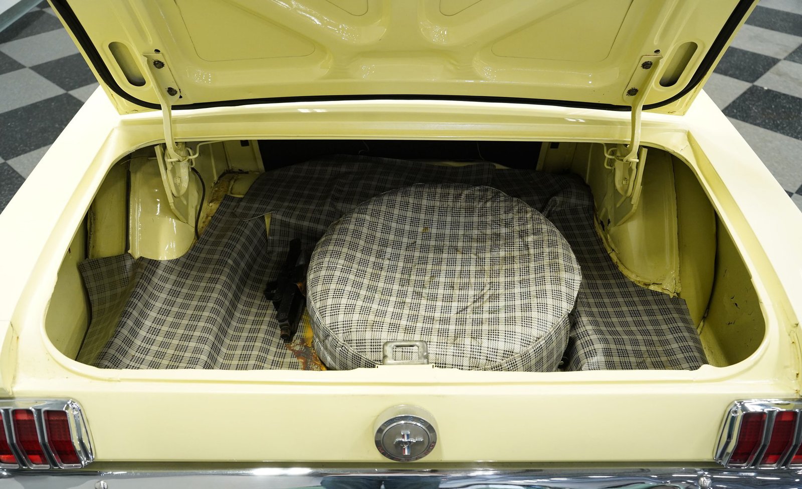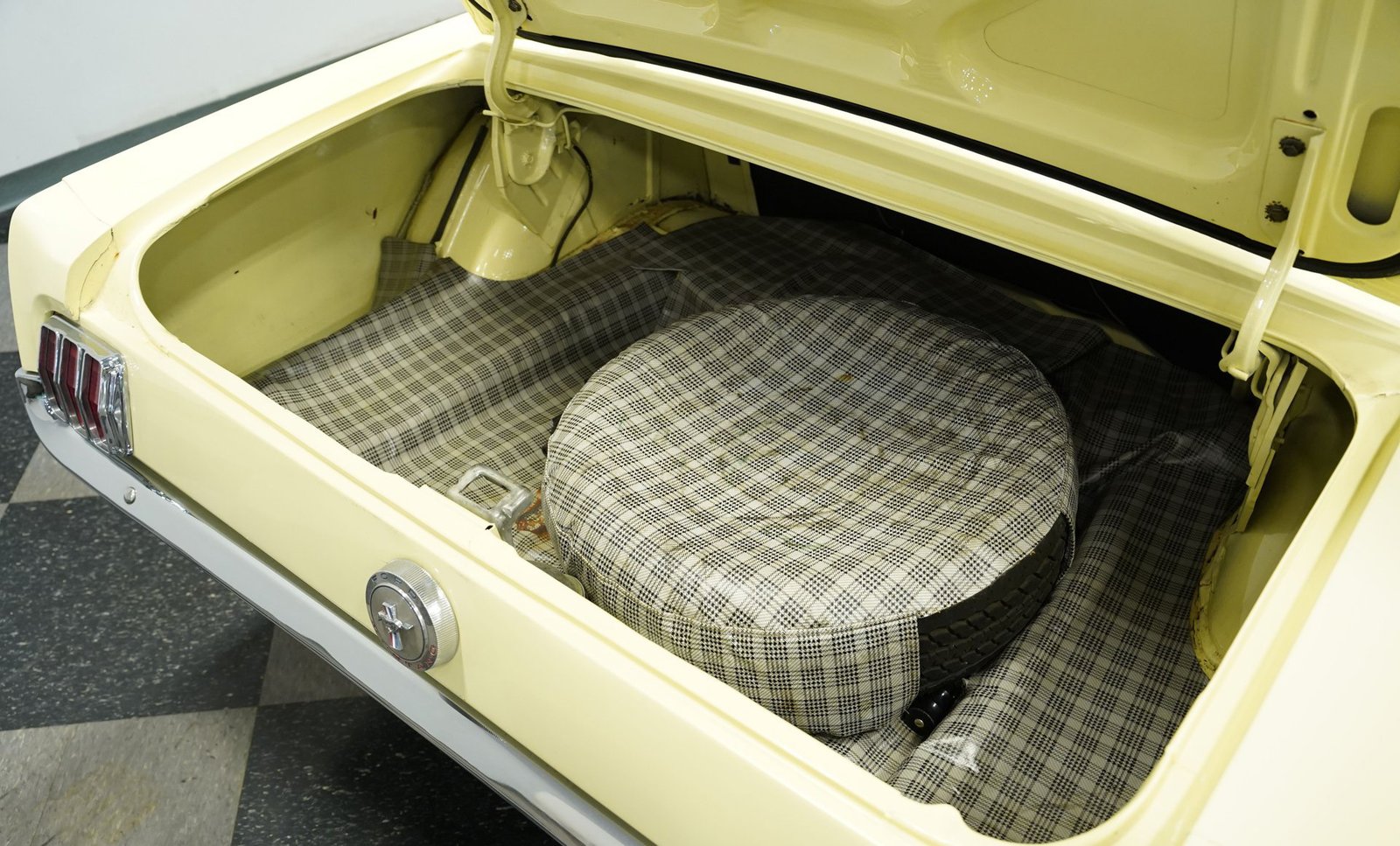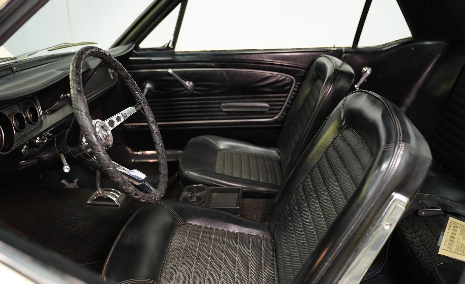 Por dentro, encontramos um interior em vinil preto com aparência original. Um volante de três raios exibe uma calota central com o emblema do Mustang, posicionado logo à frente de um painel de instrumentos com cinco mostradores, incluindo um grande velocímetro central de 140 mph (225 km/h). Os controles deslizantes do ar-condicionado facilitam o uso, enquanto o rádio AM com aparência original ajuda este Pony Car a manter seu charme clássico.