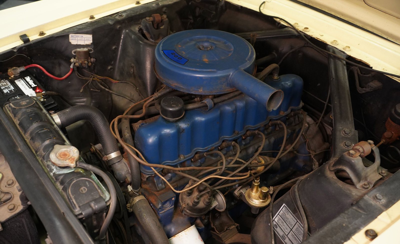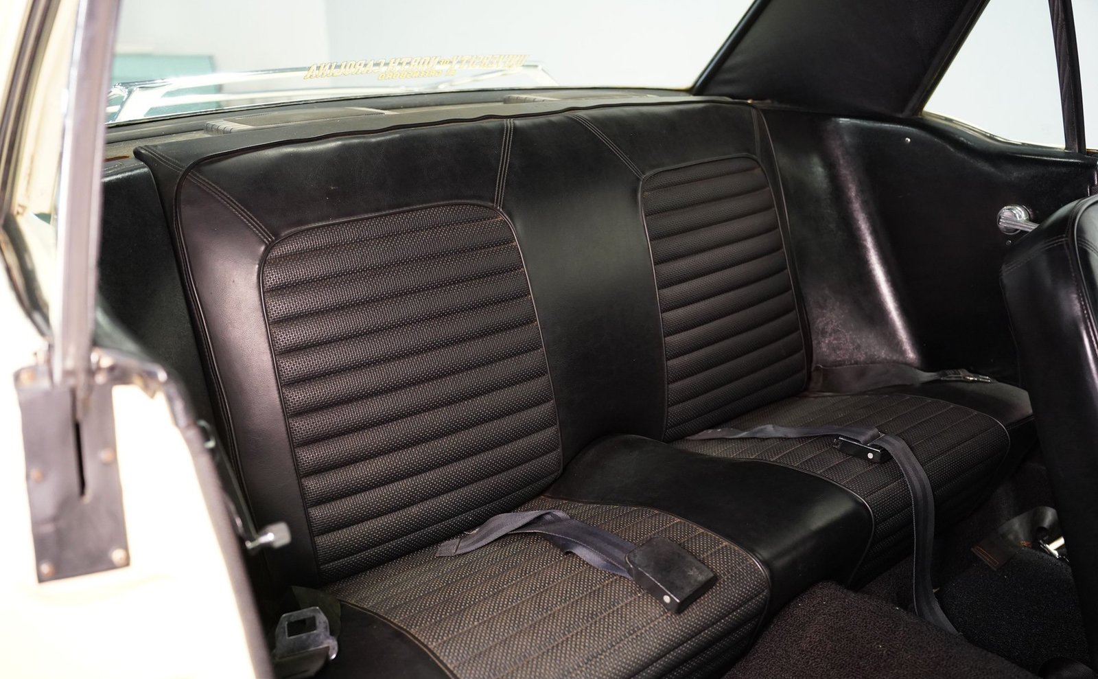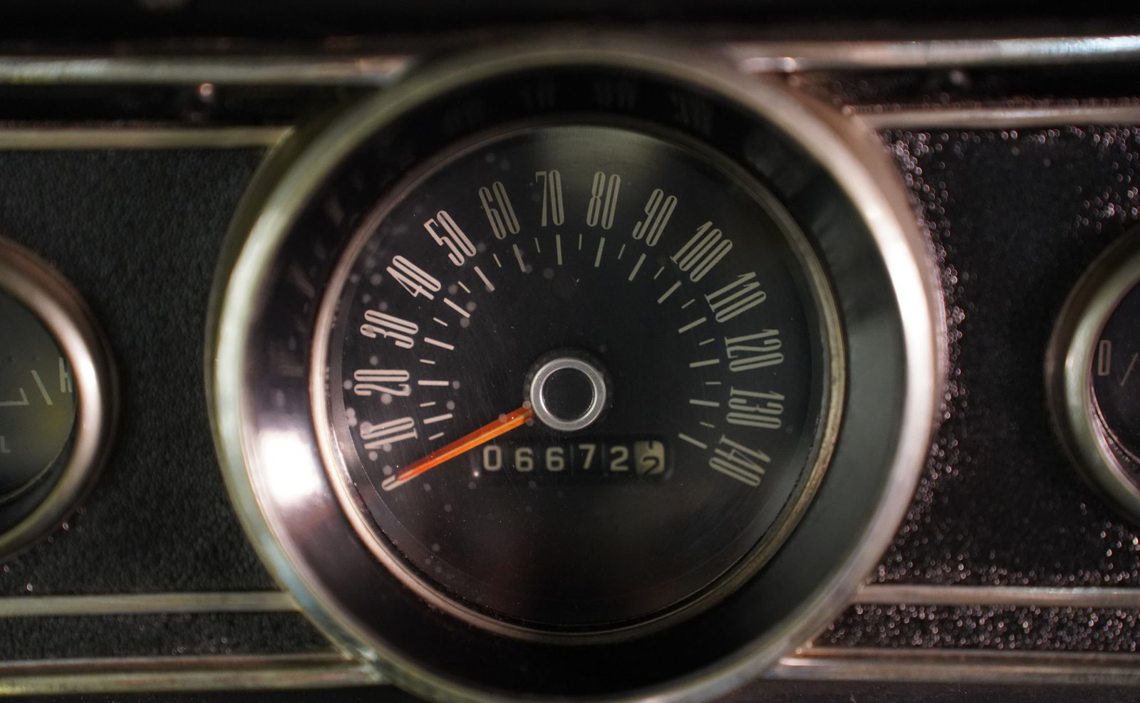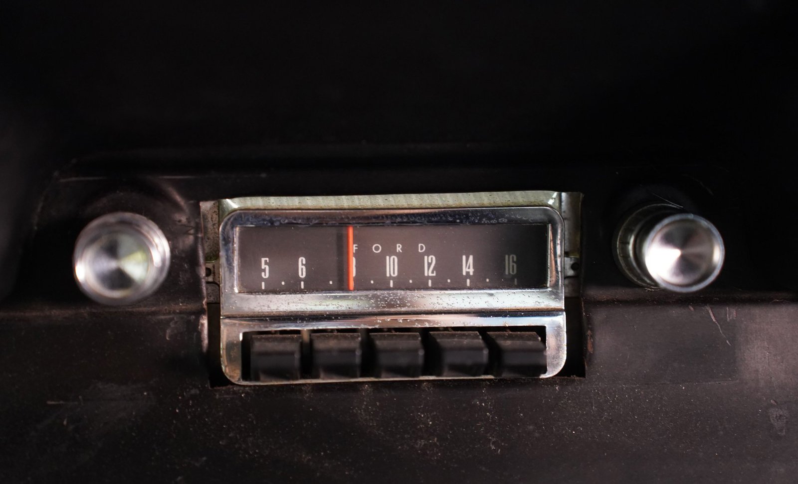Por dentro, encontramos um interior em vinil preto com aparência original. Um volante de três raios exibe uma calota central com o emblema do Mustang, posicionado logo à frente de um painel de instrumentos com cinco mostradores, incluindo um grande velocímetro central de 140 mph (225 km/h). Os controles deslizantes do ar-condicionado facilitam o uso, enquanto o rádio AM com aparência original ajuda este Pony Car a manter seu charme clássico.
