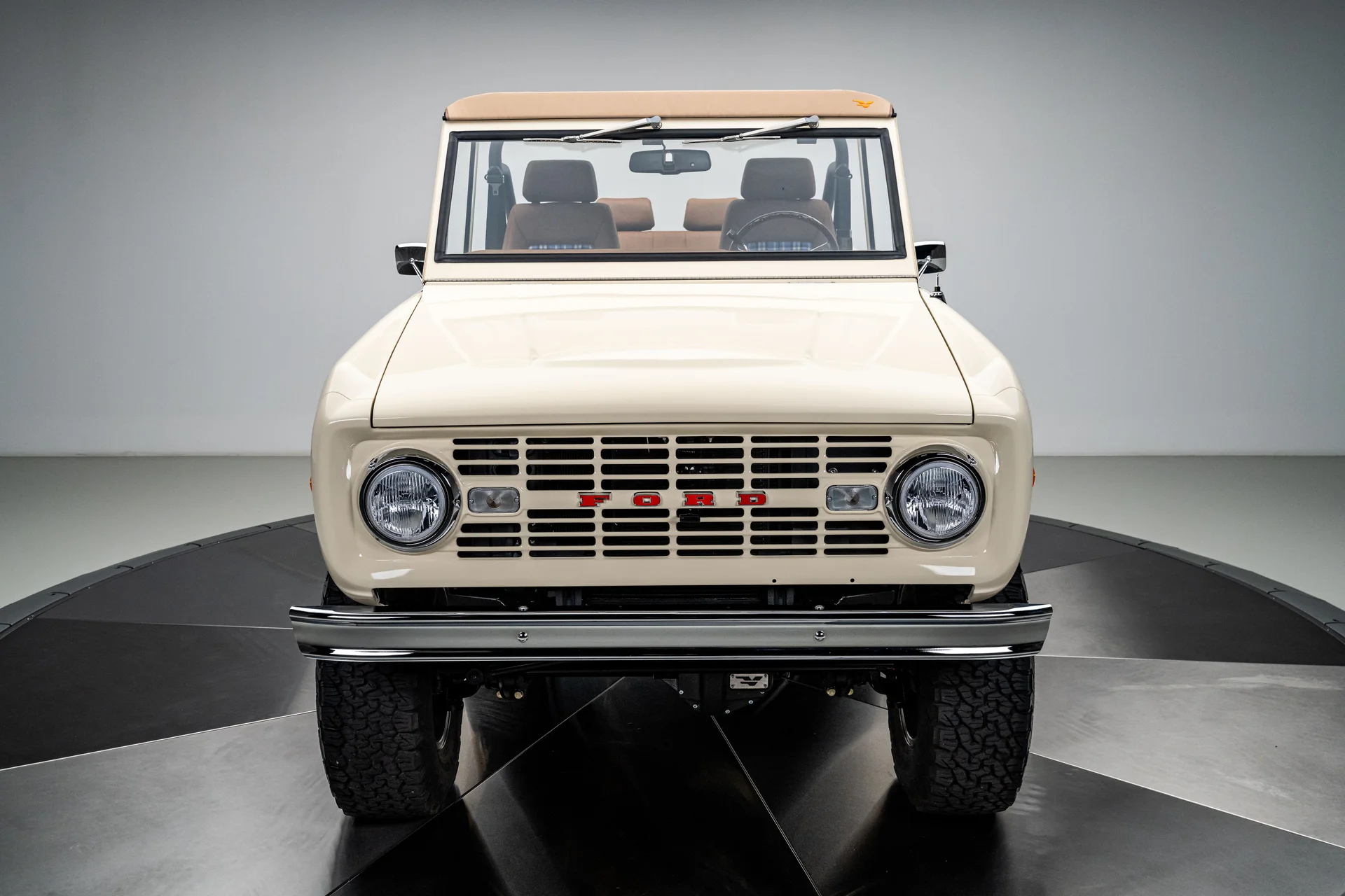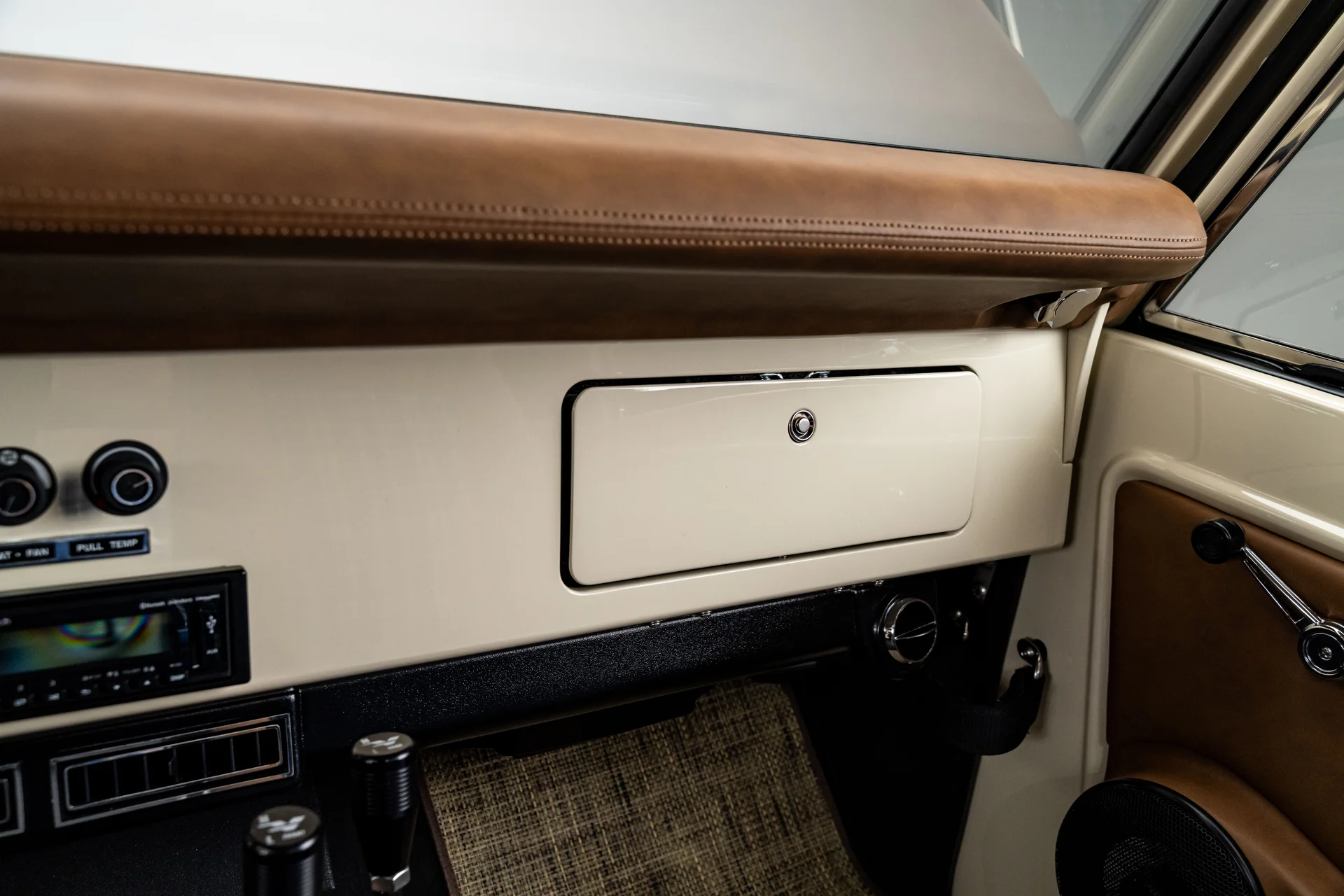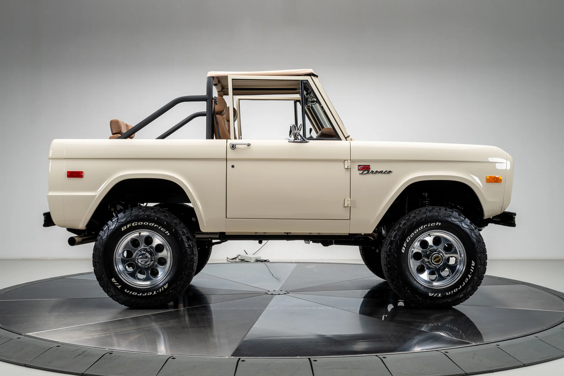 Com acabamento na cor BASF Glasurit Harvest Moon, este Bronco de 1966 apresenta um tom terroso e quente que destaca a simplicidade do design original do Bronco. Os para-lamas traseiros moldados ampliam sutilmente a postura sem sobrecarregar as linhas originais, enquanto os para-choques cromados e os detalhes externos preservam uma apresentação impecável. Equipado com rodas de liga leve de 17 polegadas com furos de bala e pneus BFGoodrich All-Terrain de 33 polegadas, o veículo exibe uma postura confiante e agressiva. Faróis de LED e estribos elétricos adicionam conveniência moderna sem comprometer a estética, e a capota bikini bege completa o visual com um toque descontraído e praiano que combina perfeitamente com a configuração.