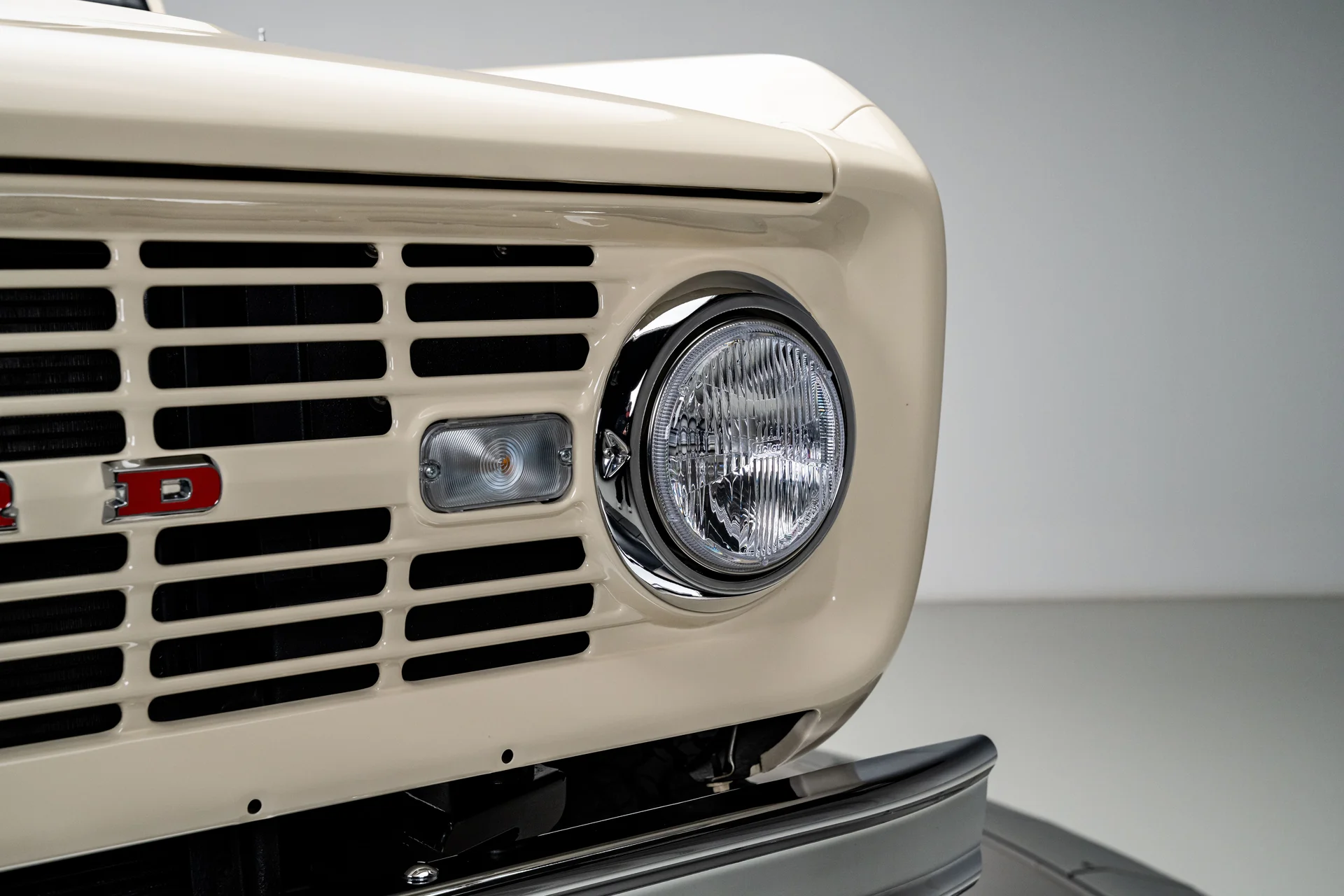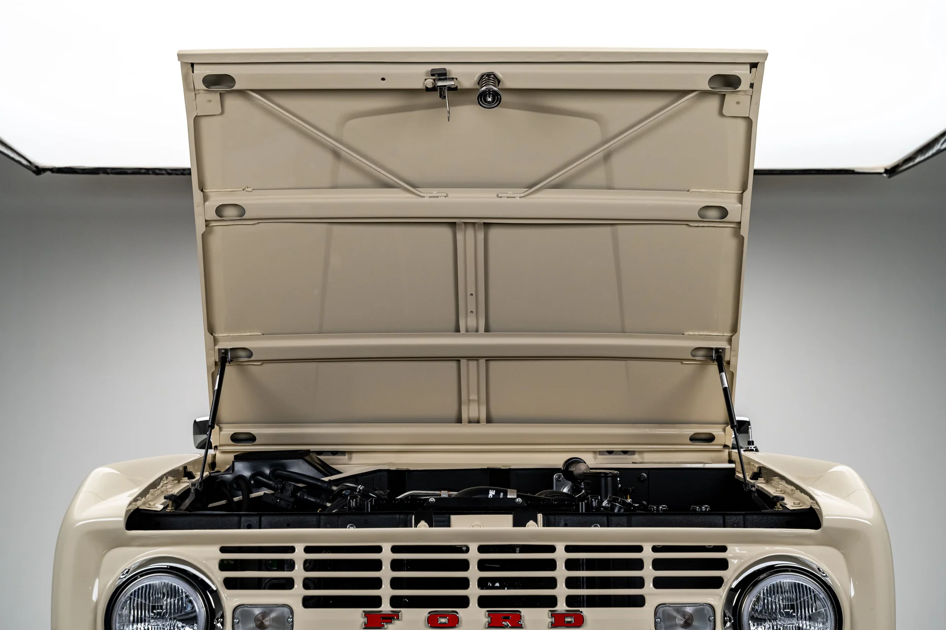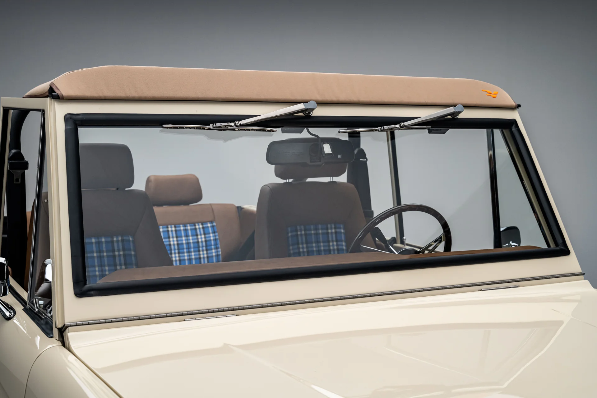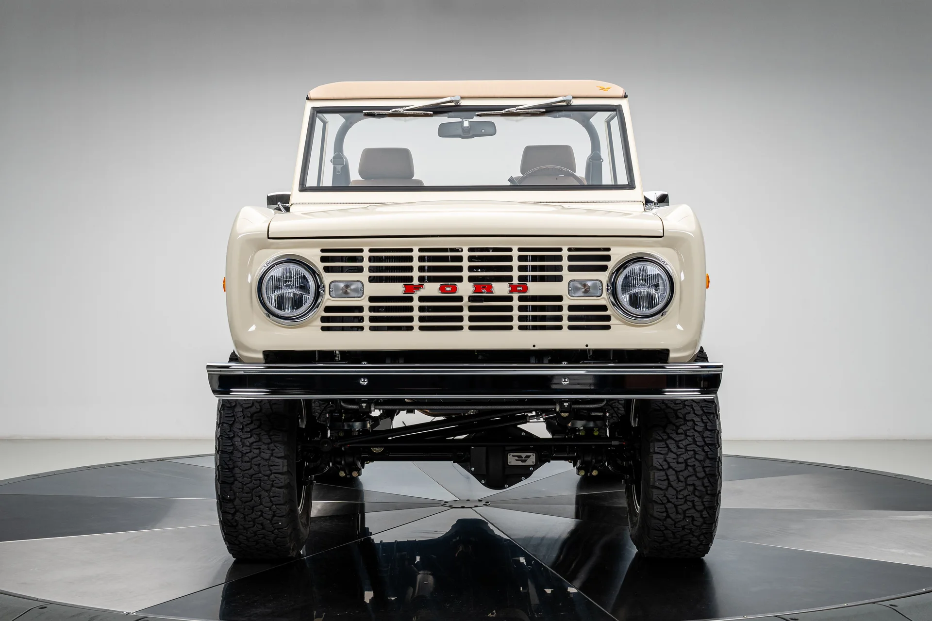 Com acabamento na cor BASF Glasurit Harvest Moon, este Bronco de 1966 apresenta um tom terroso e quente que destaca a simplicidade do design original do Bronco. Os para-lamas traseiros moldados ampliam sutilmente a postura sem sobrecarregar as linhas originais, enquanto os para-choques cromados e os detalhes externos preservam uma apresentação impecável. Equipado com rodas de liga leve de 17 polegadas com furos de bala e pneus BFGoodrich All-Terrain de 33 polegadas, o veículo exibe uma postura confiante e agressiva. Faróis de LED e estribos elétricos adicionam conveniência moderna sem comprometer a estética, e a capota bikini bege completa o visual com um toque descontraído e praiano que combina perfeitamente com a configuração.