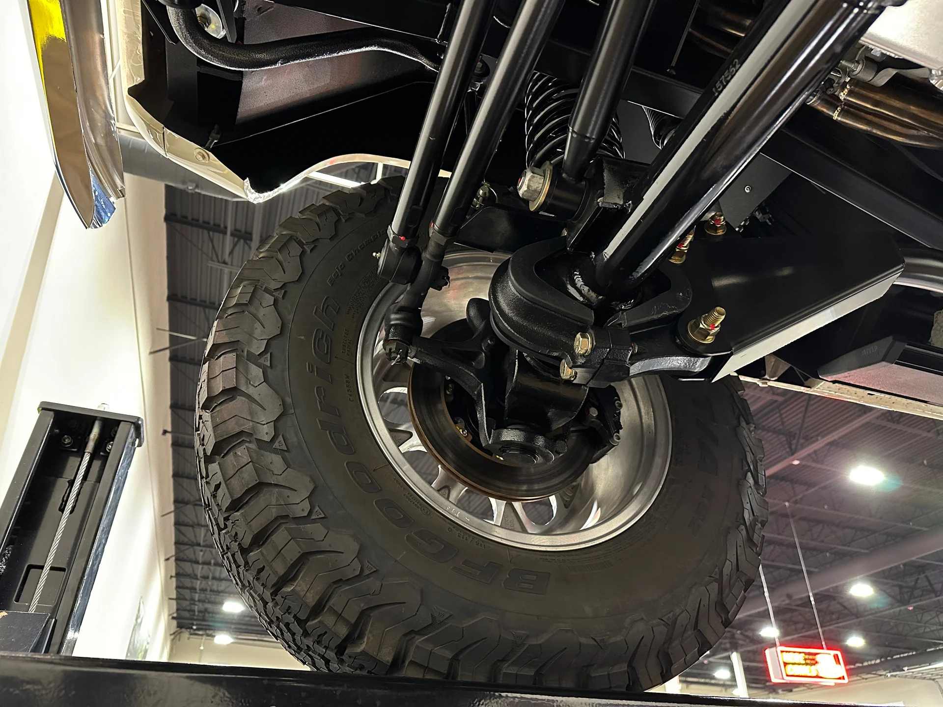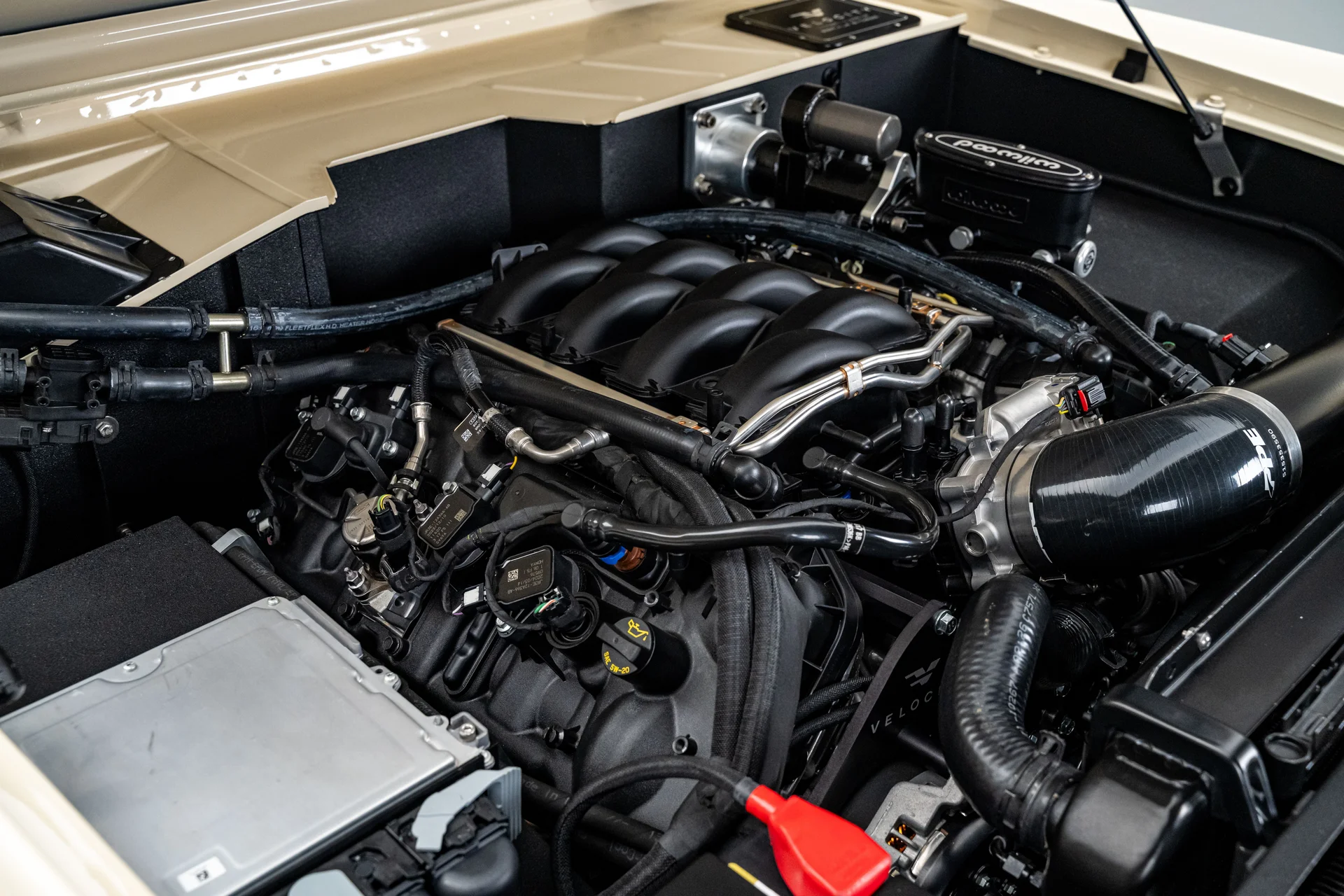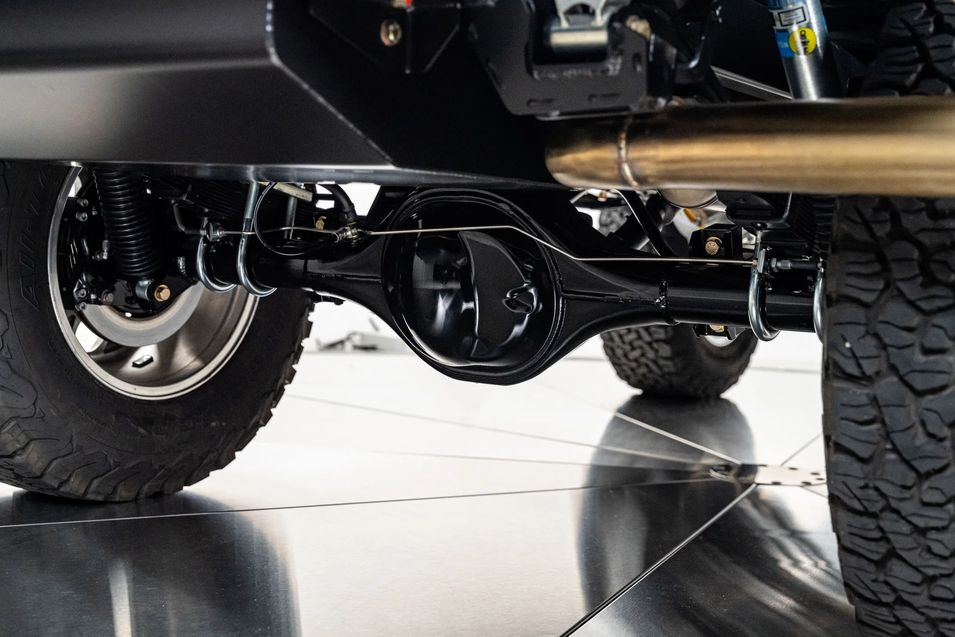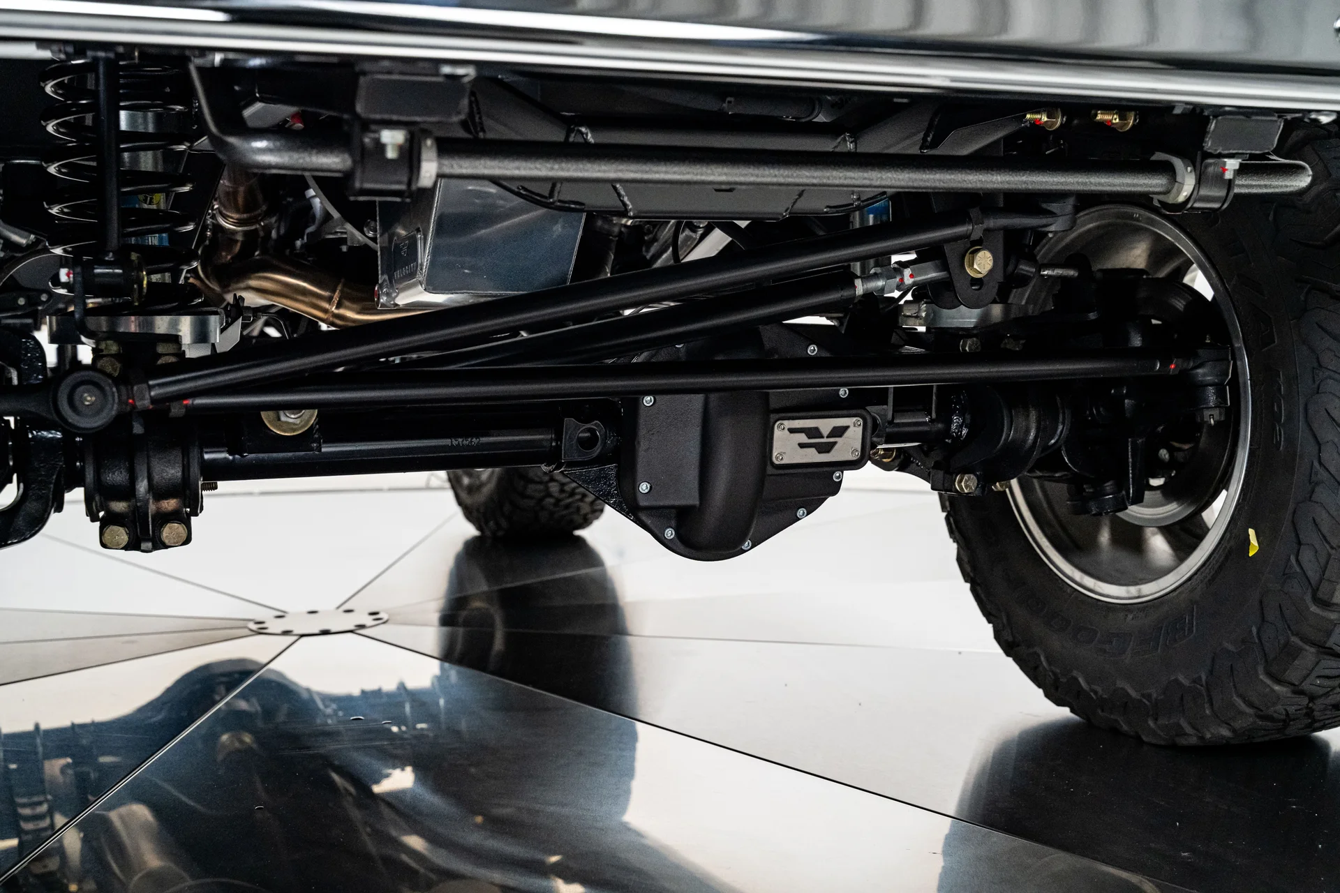 A potência vem de um motor V8 Coyote 5.0L de terceira geração, acoplado a uma transmissão automática de 10 velocidades 10R80E, que oferece desempenho moderno com uma condução suave e sem esforço. Essa potência é suportada por um chassi opcional Roadster Shop com especificações Velocity, que proporciona uma base rígida e confiável tanto para estabilidade em estradas pavimentadas quanto para capacidade off-road. O conjunto mecânico inclui uma caixa de transferência Atlas de dupla faixa, um eixo traseiro Ford 9″ com relação 3.70 e diferencial de deslizamento limitado, e um eixo dianteiro Dana 44 equipado com cubos de roda Warn com travamento. Freios a disco Wilwood nas quatro rodas com assistência Hydraboost cuidam da frenagem, enquanto amortecedores Bilstein da série 5100 e barras estabilizadoras dianteira e traseira mantêm a picape firme no chão. Um escapamento personalizado em aço inoxidável com silenciadores MagnaFlow com especificações Velocity completa o pacote e produz um ronco encorpado.