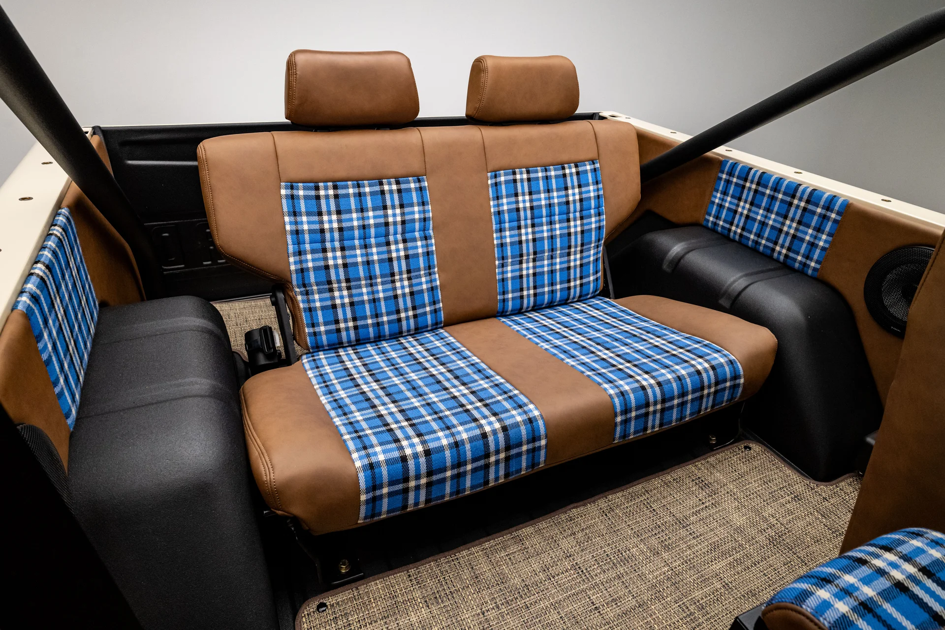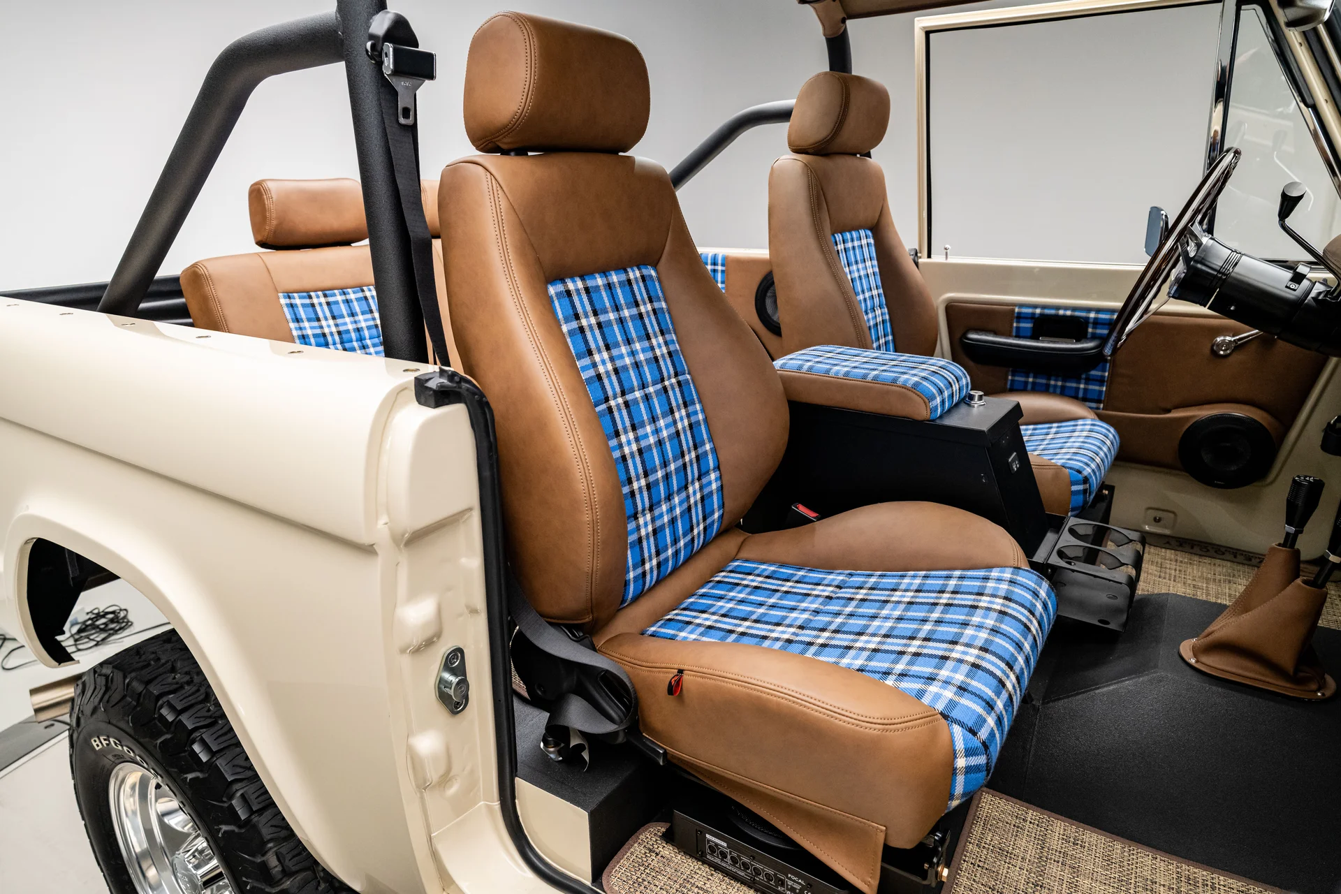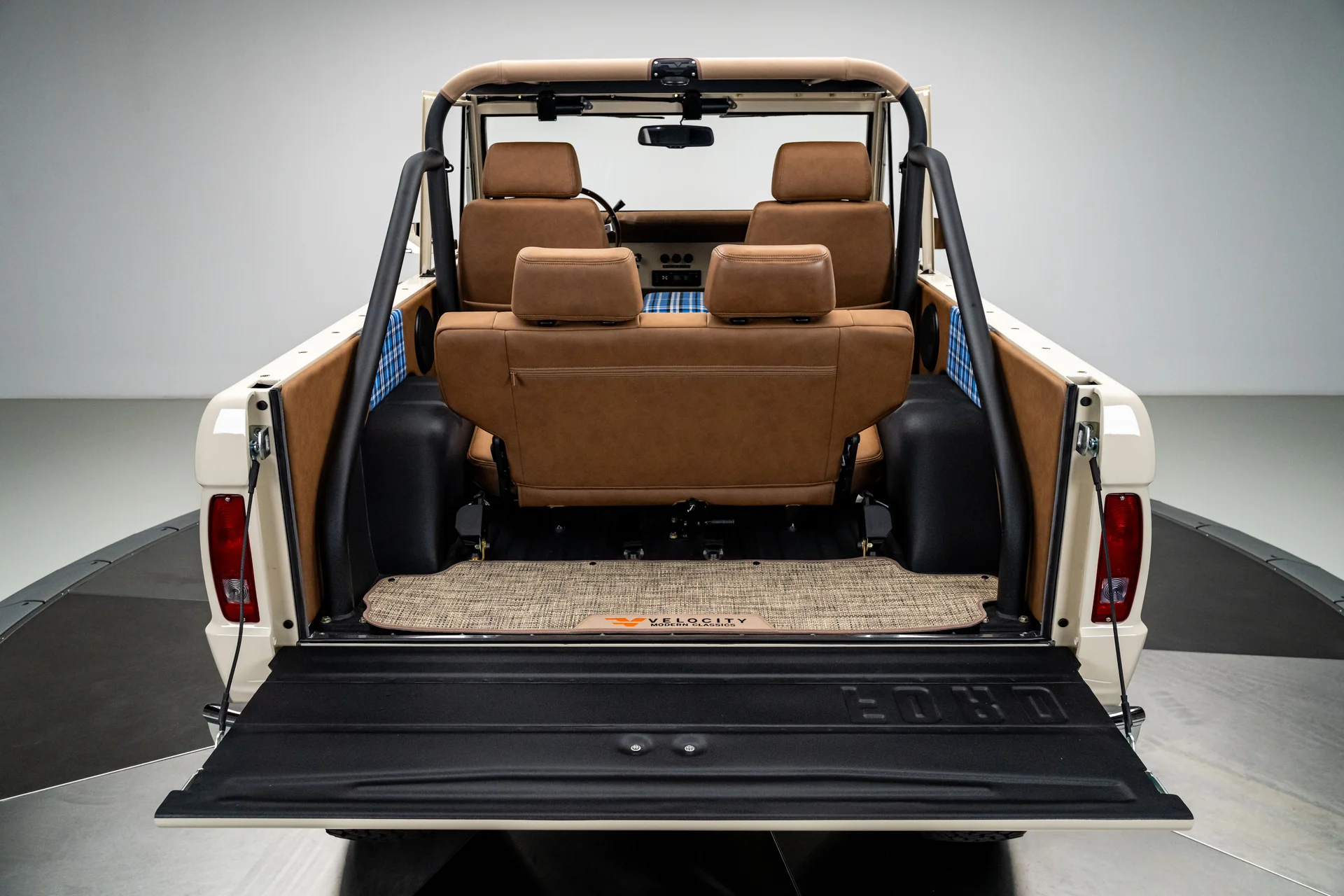 Por dentro, o interior Velocity Signature aprimorado é revestido em vinil bege de alta qualidade com detalhes em xadrez azul costurados à mão, oferecendo uma versão refinada do estilo clássico do interior do Bronco. Os bancos dianteiros reclináveis de encosto alto e o banco traseiro correspondente proporcionam verdadeiro conforto, complementados por instrumentos digitais Dakota, ar-condicionado moderno e um volante clássico com acabamento em madeira montado em uma coluna de direção ididit com ajuste de inclinação. Um console central Tuffy com trava e carregamento USB integrado adiciona praticidade ao dia a dia, enquanto o sistema de áudio é gerenciado por um receptor Clarion com Bluetooth e compatibilidade com SiriusXM, combinado com alto-falantes Focal modernos que oferecem um som nítido e potente.